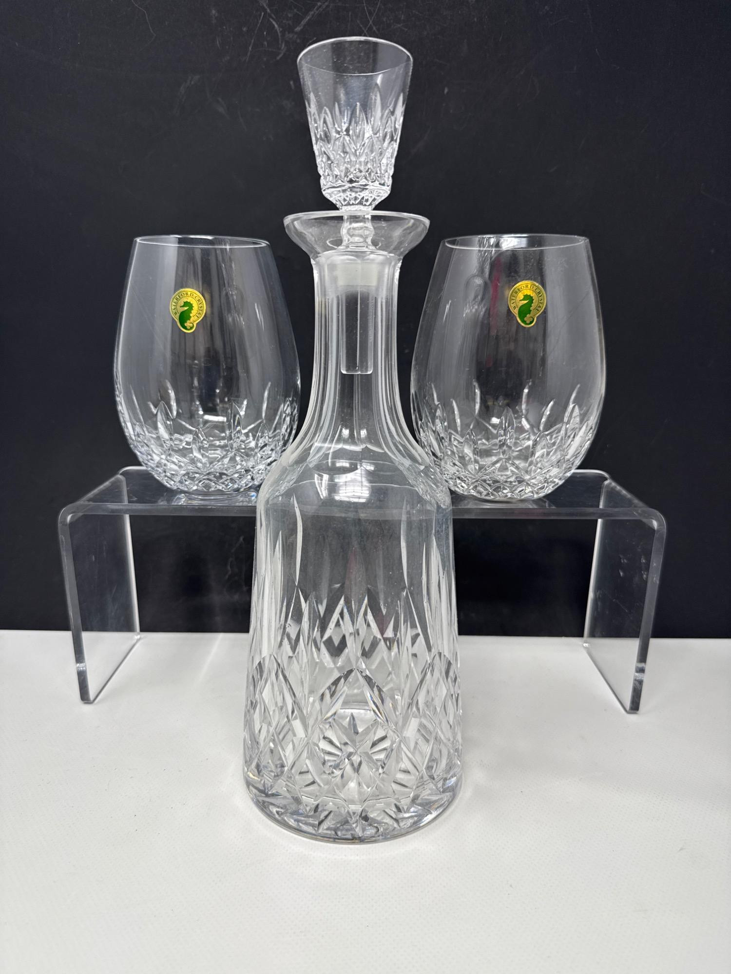 4-piece Waterford Crystal set features a beautifully crafted decanter with a faceted stopper that doubles as a shot glass, and two matching tumblers. Each piece showcases the signature Waterford brilliance and craftsmanship. The classic diamond-cut pattern reflects light beautifully. Details: Brand: Waterford Crystal Set includes: 1 Decanter, 1 Shot Glass (used as stopper), and 2 Tumblers Height of decanter (with stopper): Approx. 12.5" Pattern: Traditional diamond and wedge cuts Condition: Excellent, with original Waterford stickers intact