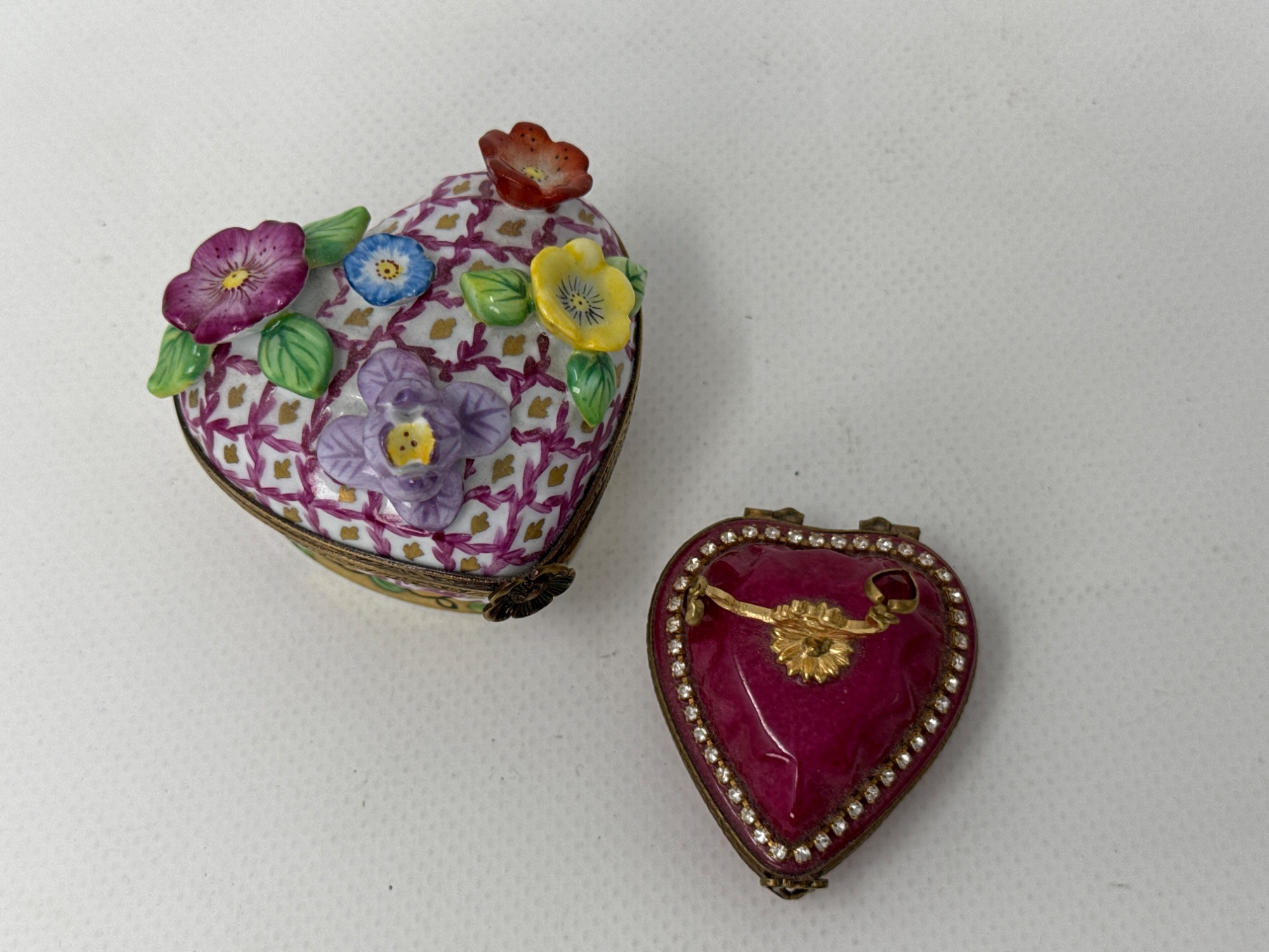 This pair of Limoges trinket boxes is part of the elegant Marquise de Pompadour collection, crafted in Limoges, France. Both are beautifully hand-painted and feature intricate detailing. Floral Footed : A heart-shaped footed box adorned with colorful 3D porcelain flowers on a lattice and gold heart motif background. Inside, a delicate gold floral design graces the base. The lid interior features an image of the Marquise de Pompadour and the mark "Peint Main Limoges France". Measurements: 2.5" x 2.5" Rhinestone Heart: A glossy deep rose heart-shaped box accented with rhinestones and a golden decorative finial featuring two red heart charms. The interior reads “I Love You.” Signed “Limoges France Peint Main C.L.” Measurement: 2" wide/long and 1.5" tall.