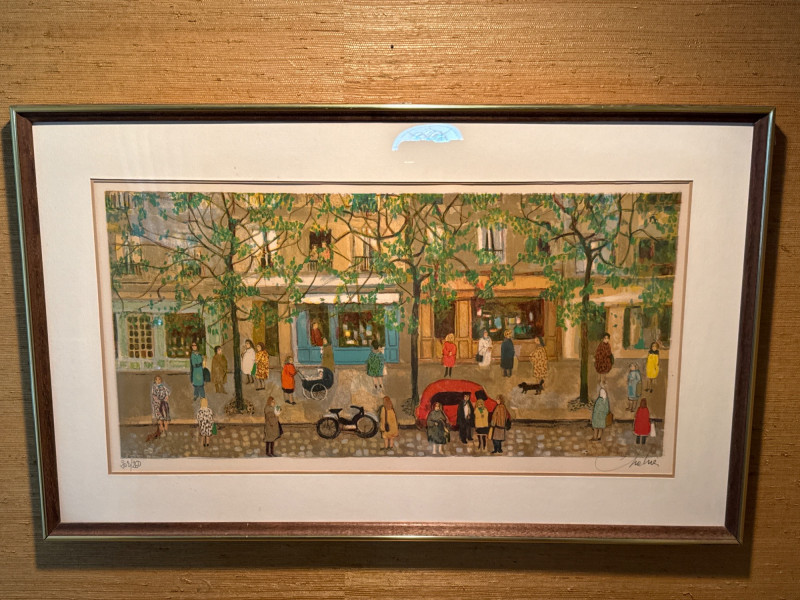 Charming and collectible vintage urban art by French artist Nathalie Chabrier, titled "Rue au Printemps." This signed and numbered lithograph (No. 208/260) captures a colorful, idyllic Parisian street scene in spring. Printed in Paris in 1976 by Arts-Litho, this piece combines the warmth of folk art with contemporary flair, showcasing vibrant details of people, architecture, and foliage. Beautifully framed in vintage wood with a gold-trimmed double mat of ivory and fawn tones by A.P.F., Inc., master frame makers of New York. Details: Artist: Nathalie Chabrier Title: Rue au Printemps Edition: 208/260, signed in pencil Medium: Lithograph Dimensions: 32" long x 19.5" tall (including frame) Frame: Vintage wood with gold accents and matte Printed: 1976, Arts-Litho, Paris