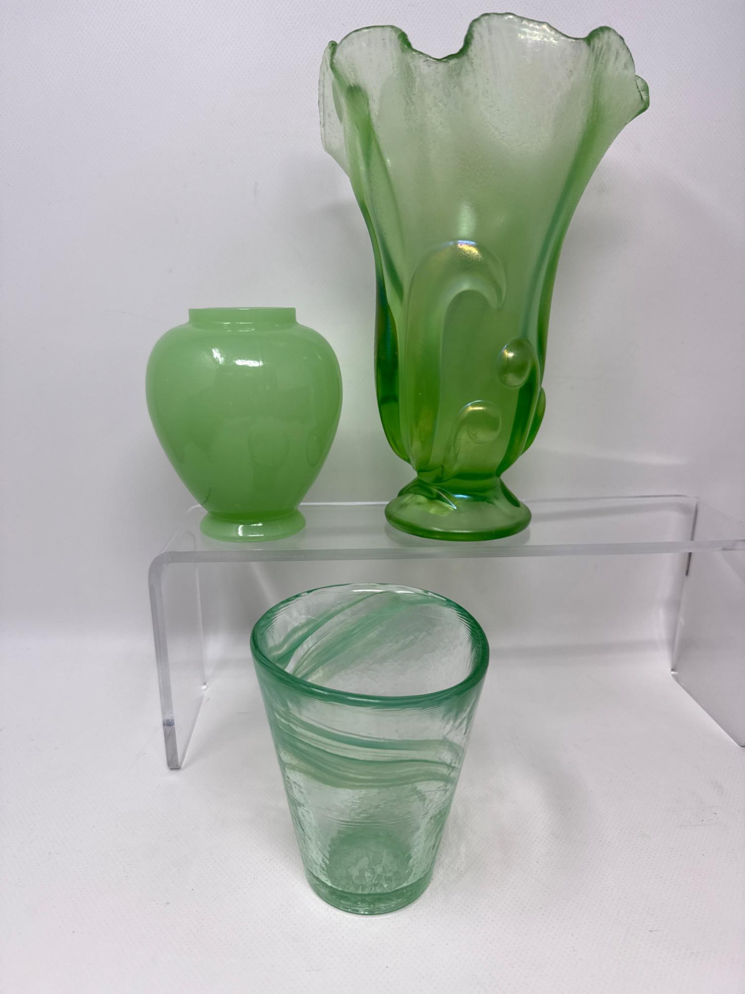 A beautiful collection of three vintage green art glass pieces. Kosta Boda Swirl Glass (Sweden) Fenton Tall Iridized Vase (USA) Fenton Satin Glass Urn/Vase (USA) These pieces are in excellent collectible condition and showcase both American and Scandinavian artistry in glassmaking.