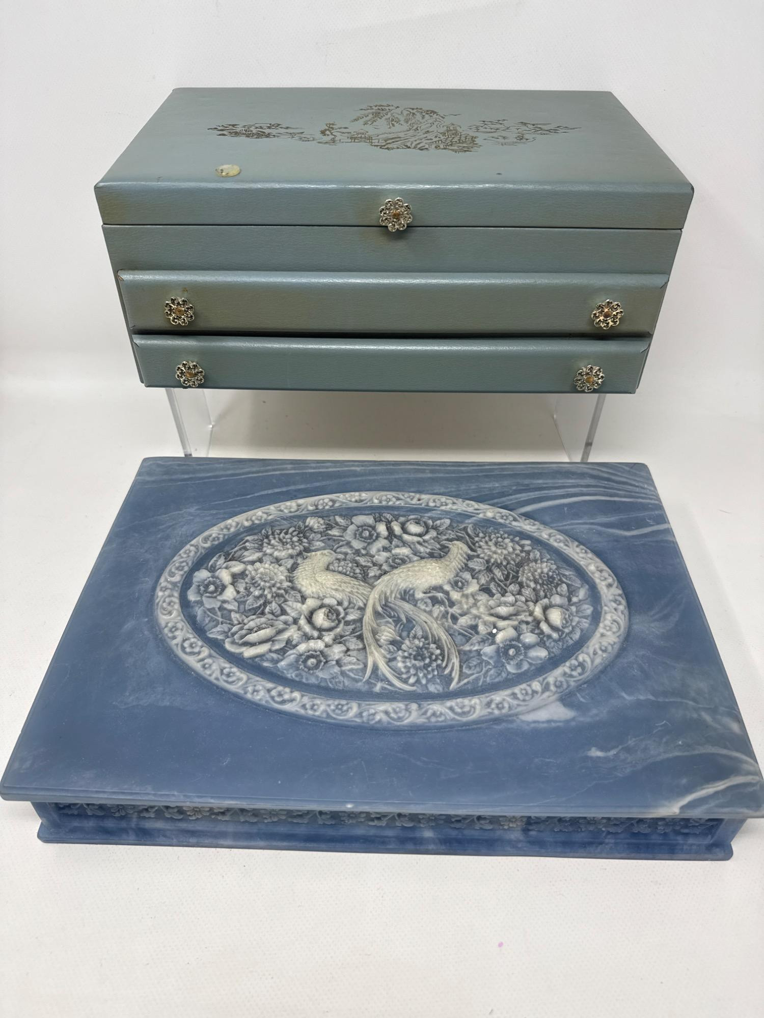 This lot includes two charming vintage jewelry boxes—one handcrafted Incolay Stone box and a lacquered chinoiserie-style chest—both filled with assorted vintage costume jewelry. Box 1: Incolay Stone Jewelry Box (USA) Blue marbled stone with raised bird & floral design Velvet-lined interior with various compartments Includes vintage jewelry: beaded necklaces, faux pearls, agate pieces, clip-on earrings, and more Approx. 65g silver-tone abalone inlay bracelet set included Box 2: Blue Chinoiserie Jewelry Chest Three-drawer design with gold landscape detailing Blue velvet and pink satin interior Filled with vintage costume jewelry: rhinestone brooches, statement earrings, bracelets, watches, and pins Condition: Good vintage condition; some surface wear and fabric discoloration.