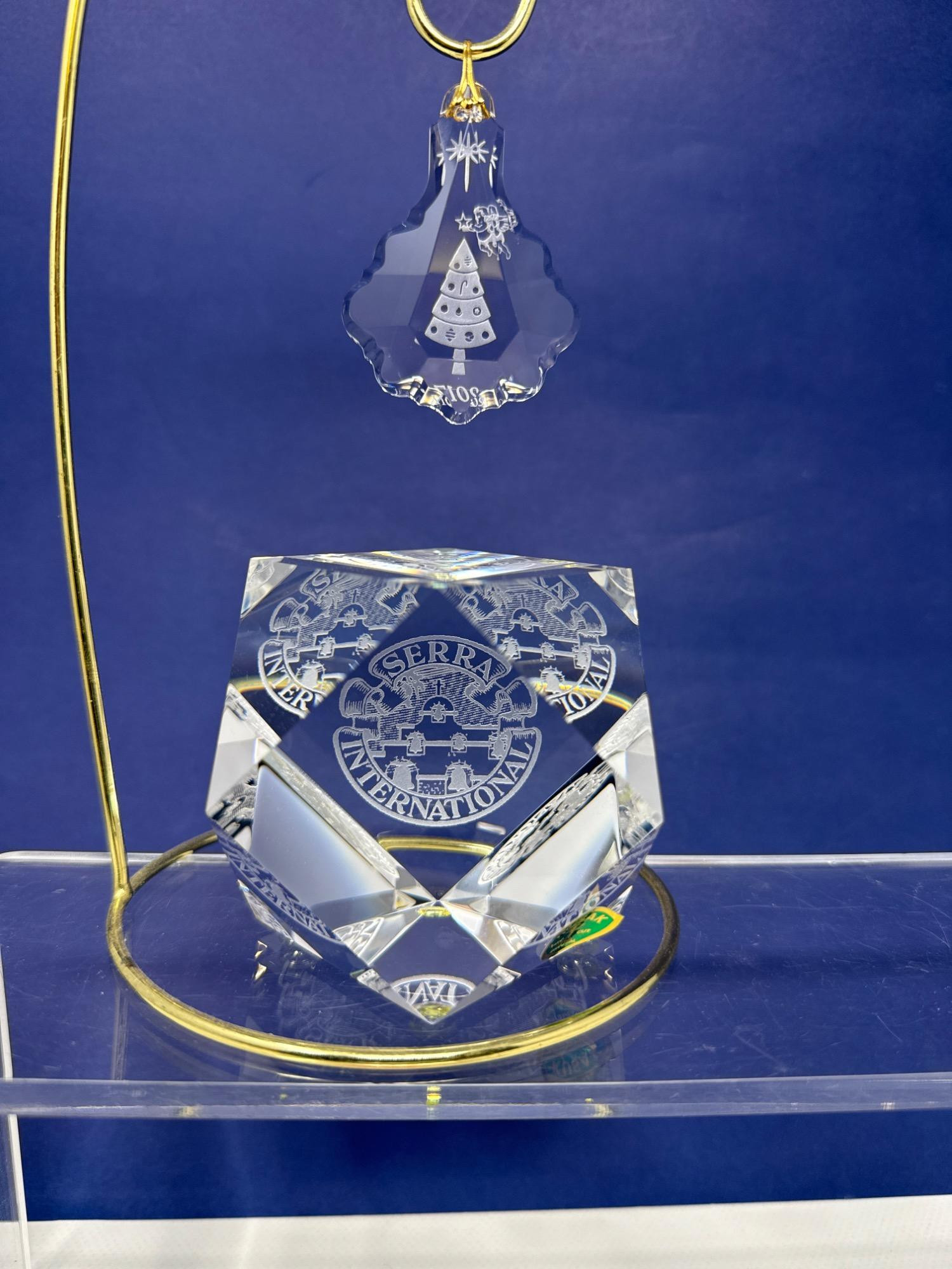 A timeless and elegant Kusak Crystal set featuring both a decorative ornament and a stunning paperweight. Set Includes: Crystal Ornament Design: 2012 holiday-themed Features: Etched Christmas tree, star, and angel Use: Hanging ornament with gold-tone hanger Crystal Paperweight Design: Multi-faceted cube Etching: "Serra International" emblem on multiple faces Creates a beautiful light-reflecting display Product Details: Brand: Kusak Art Cut Crystal Size: Approximately 3" x 3" Material: Premium hand-cut crystal Packaging: Includes original Kusak presentation box and commemorative booklets (96th and 100th Anniversary)