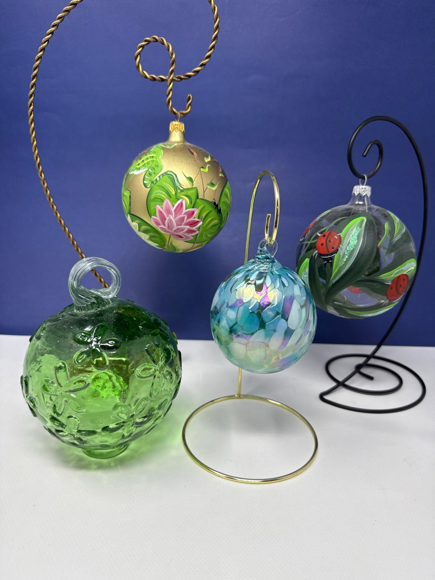 This is a set of four hand-painted glass orbs, each uniquely crafted with vibrant colors, intricate detailing, and traditional mouth-blown glasswork. Details: Material: Mouth-blown glass Finish: Hand-painted designs featuring floral patterns, ladybugs, and frogs among lush leaves Origin: Made in Poland (labels read “Hand Painted · Mouth Blown · Made in Poland”) Size: Approx. 4" x 4" (some marked 4.5"T x 6.5”W) Designs Include: Iridescent mosaic-style orb with soft blue, green, and purple tones Translucent green orb with raised floral pattern Gold orb with frog and lotus flower motif Clear orb with painted red ladybugs and green foliage