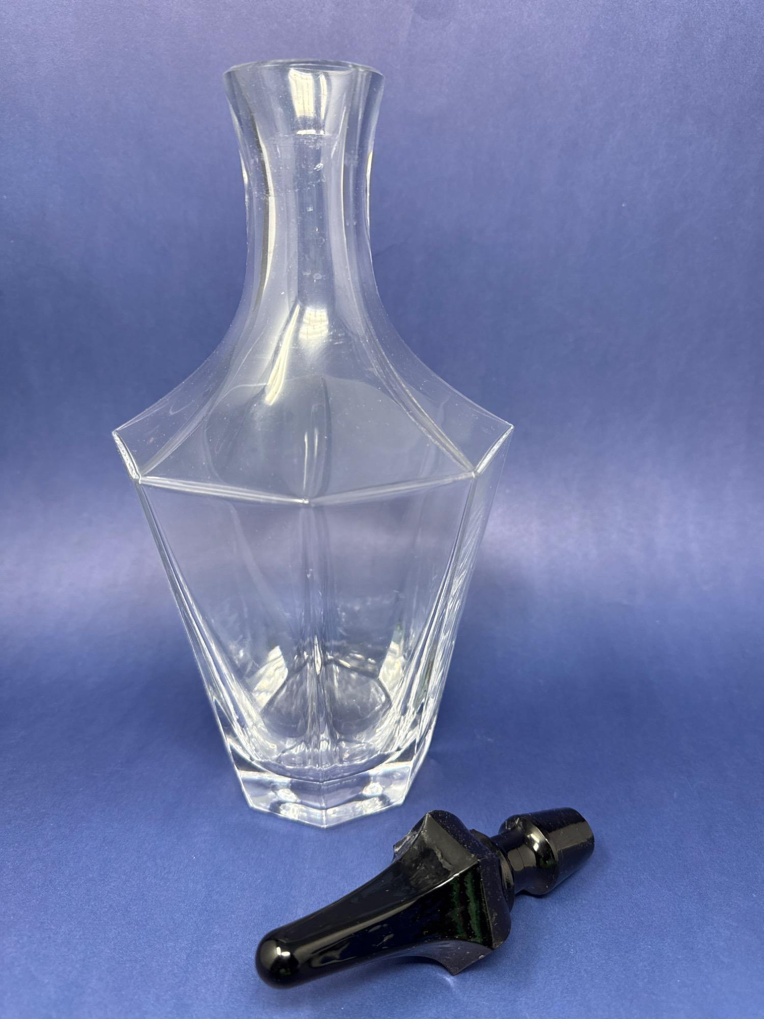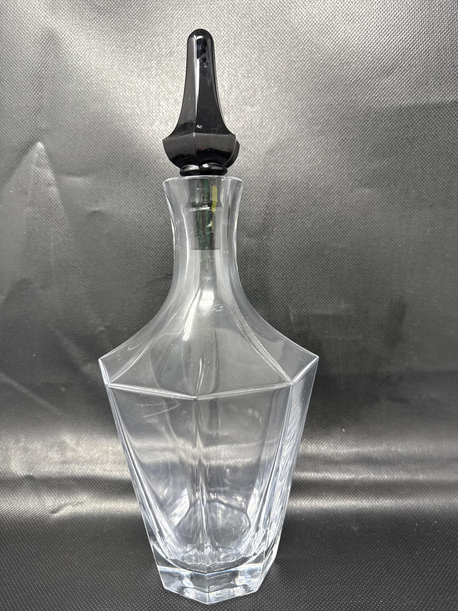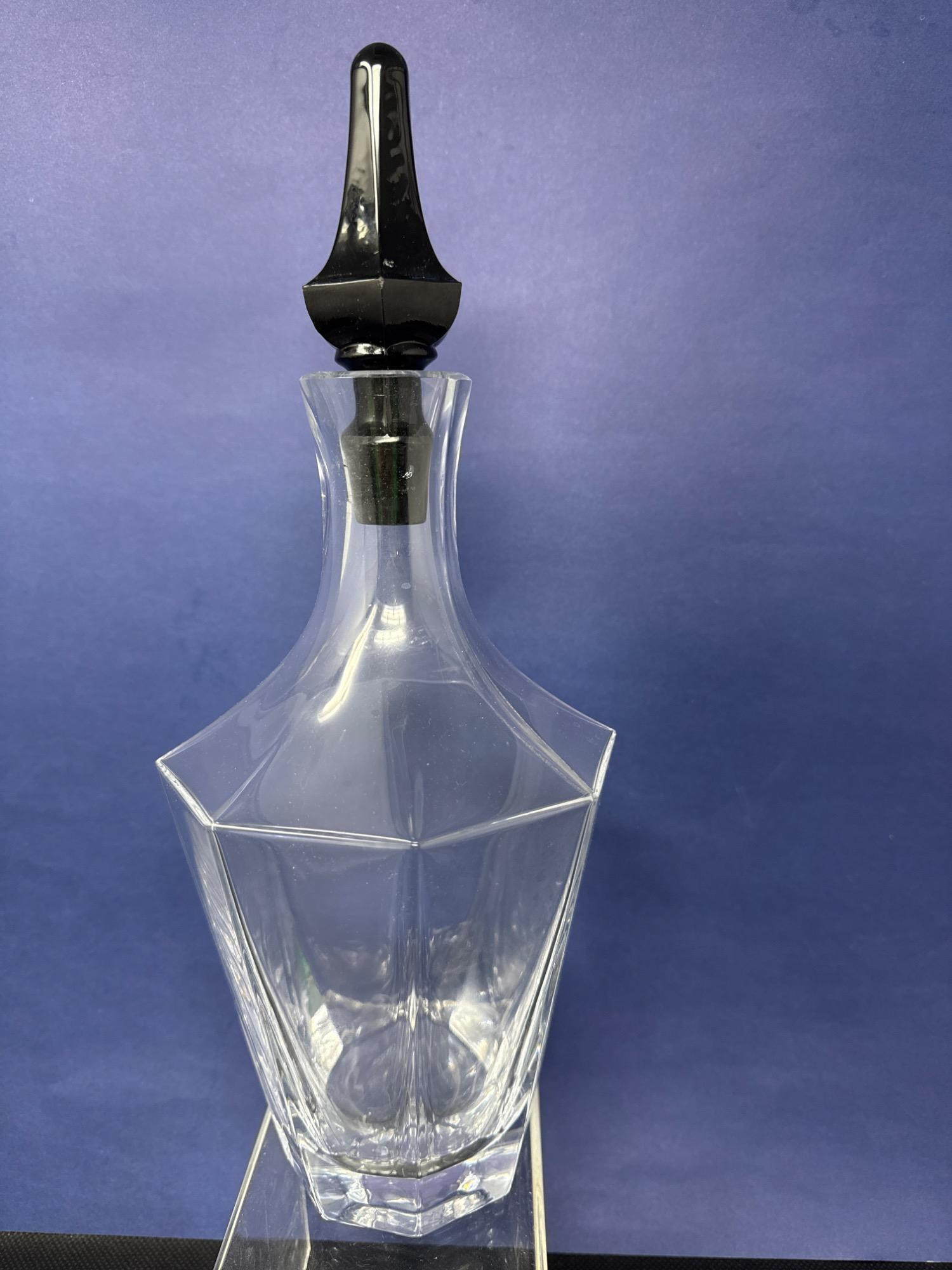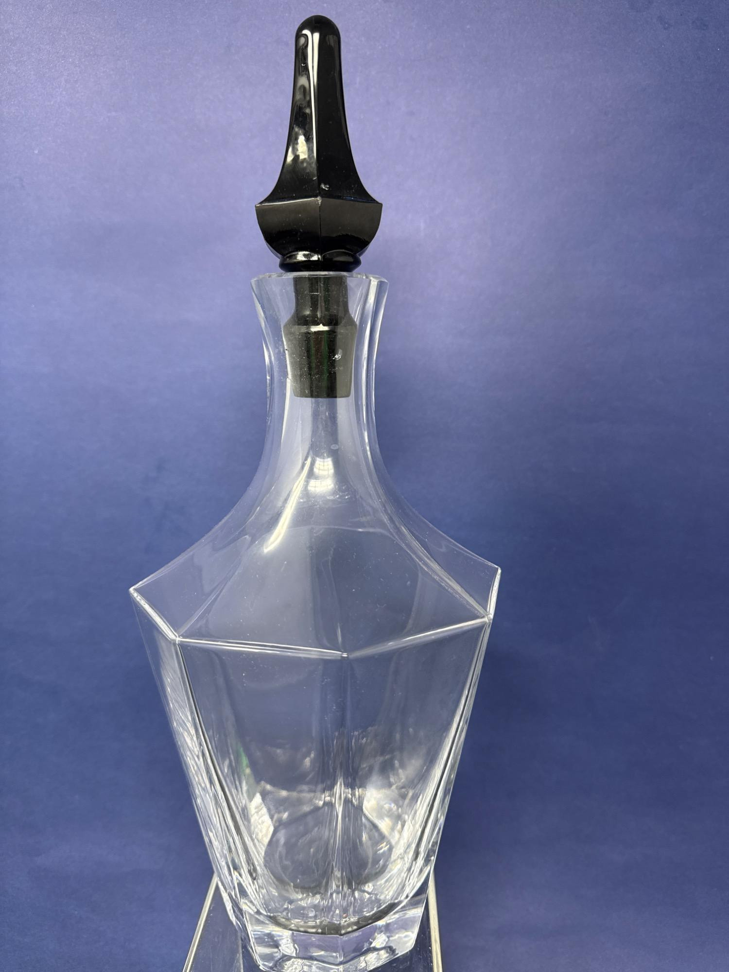 This elegant Cartier crystal decanter is a striking blend of luxury and craftsmanship. Featuring sharp geometric faceting and a tall, graceful silhouette, it’s designed to catch the light and attention in any setting. The decanter is paired with its original glossy black stopper, adding bold contrast and a refined finish. Features: Brand: Cartier Material: Fine crystal Stopper: Original black glass stopper Design: Geometric faceted body Color: Clear with black accent stopper Measurements: 13.5" tall x 5.5" wide