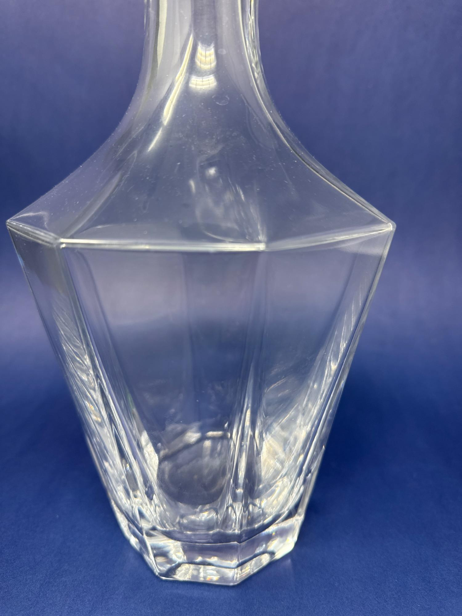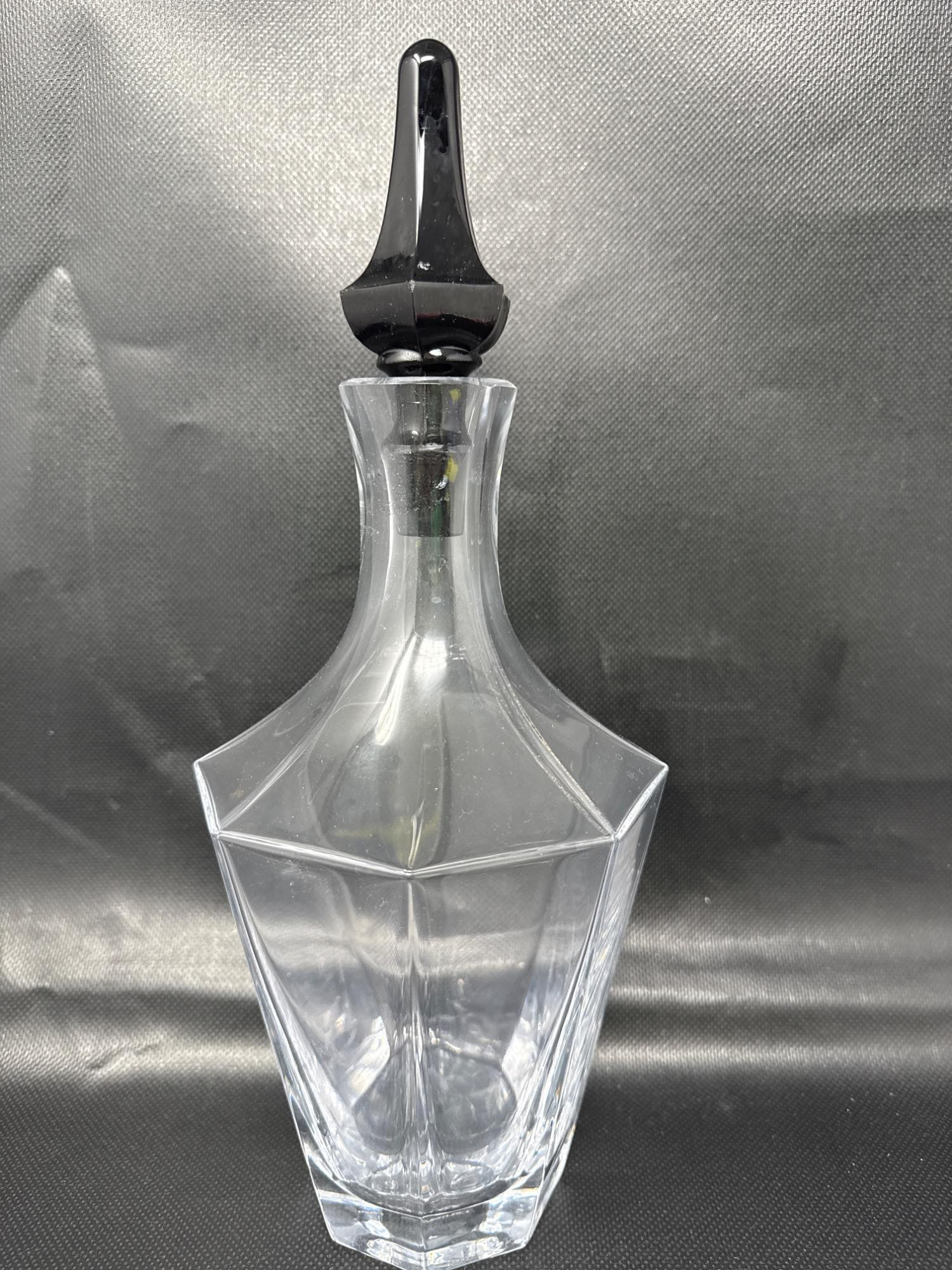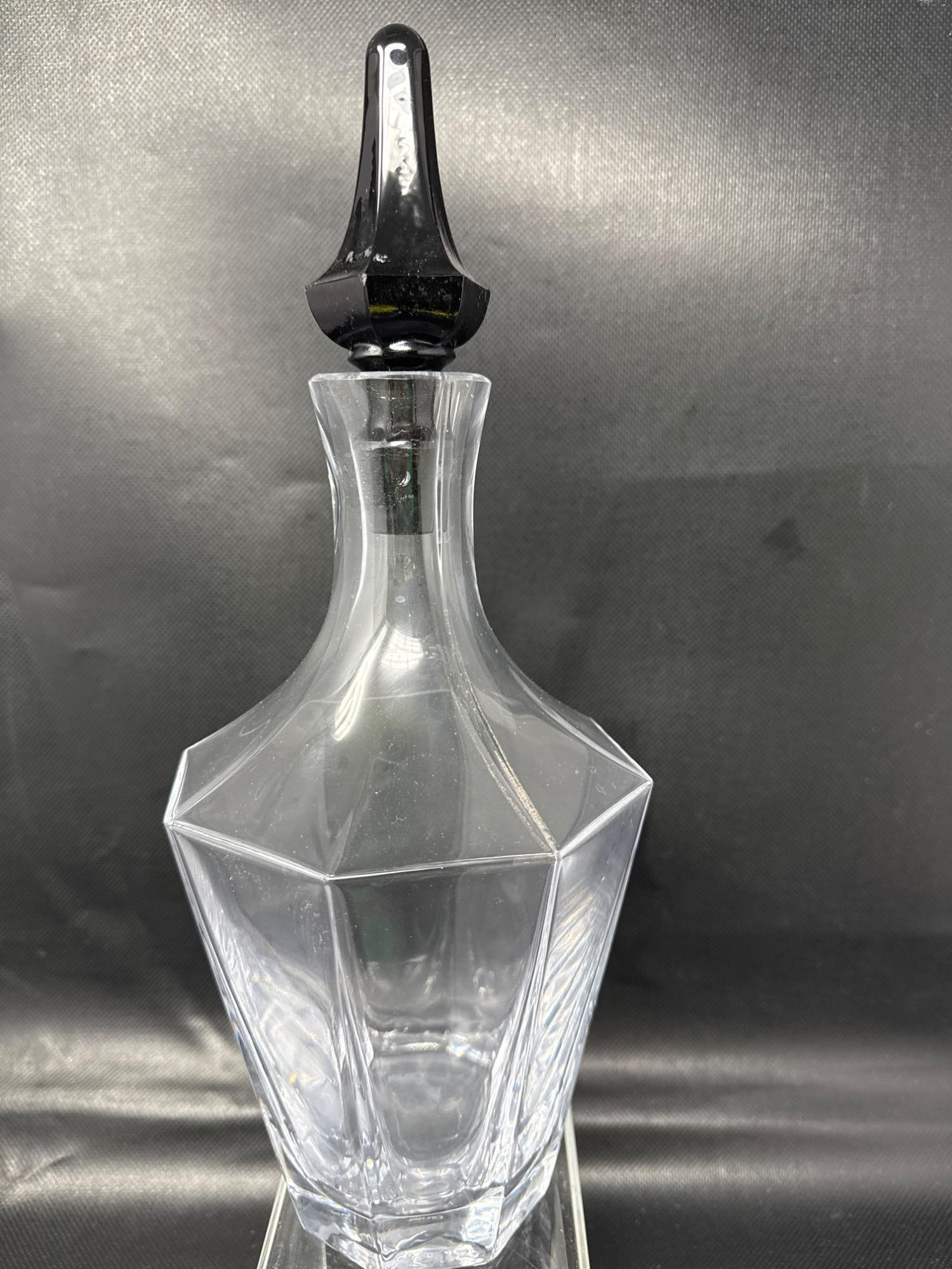 This elegant Cartier crystal decanter is a striking blend of luxury and craftsmanship. Featuring sharp geometric faceting and a tall, graceful silhouette, it’s designed to catch the light and attention in any setting. The decanter is paired with its original glossy black stopper, adding bold contrast and a refined finish. Features: Brand: Cartier Material: Fine crystal Stopper: Original black glass stopper Design: Geometric faceted body Color: Clear with black accent stopper Measurements: 13.5" tall x 5.5" wide
