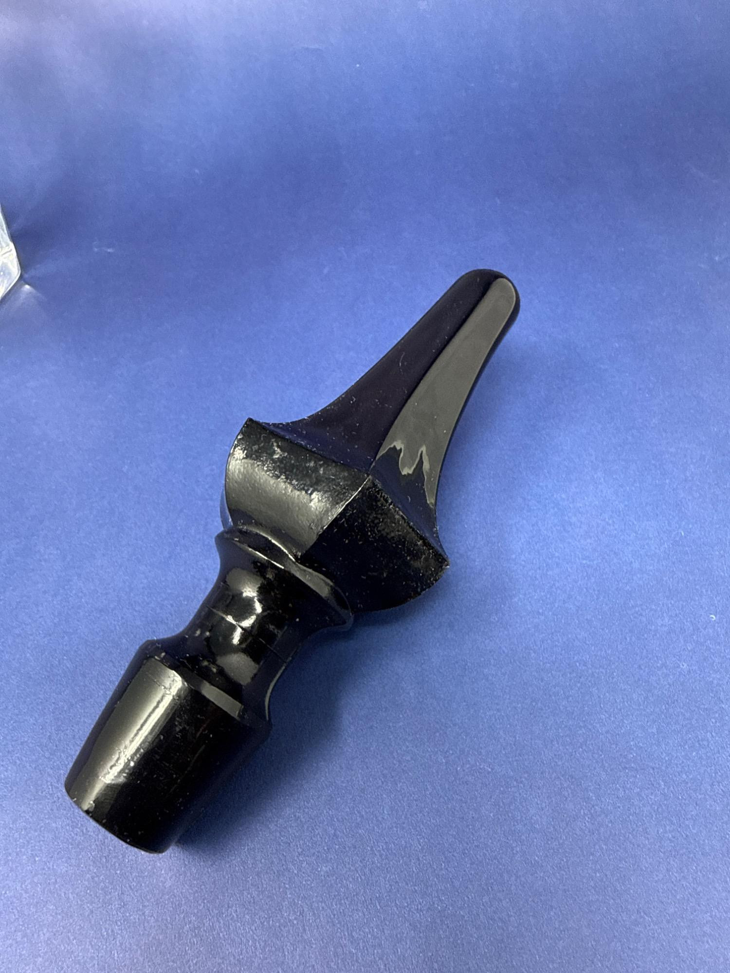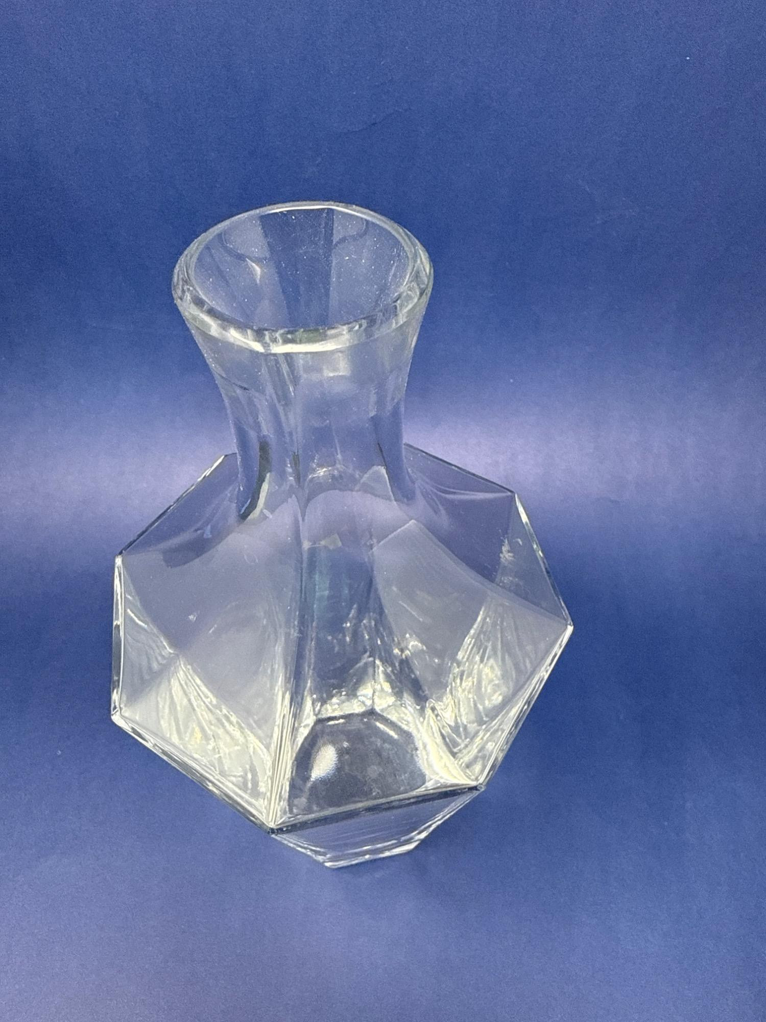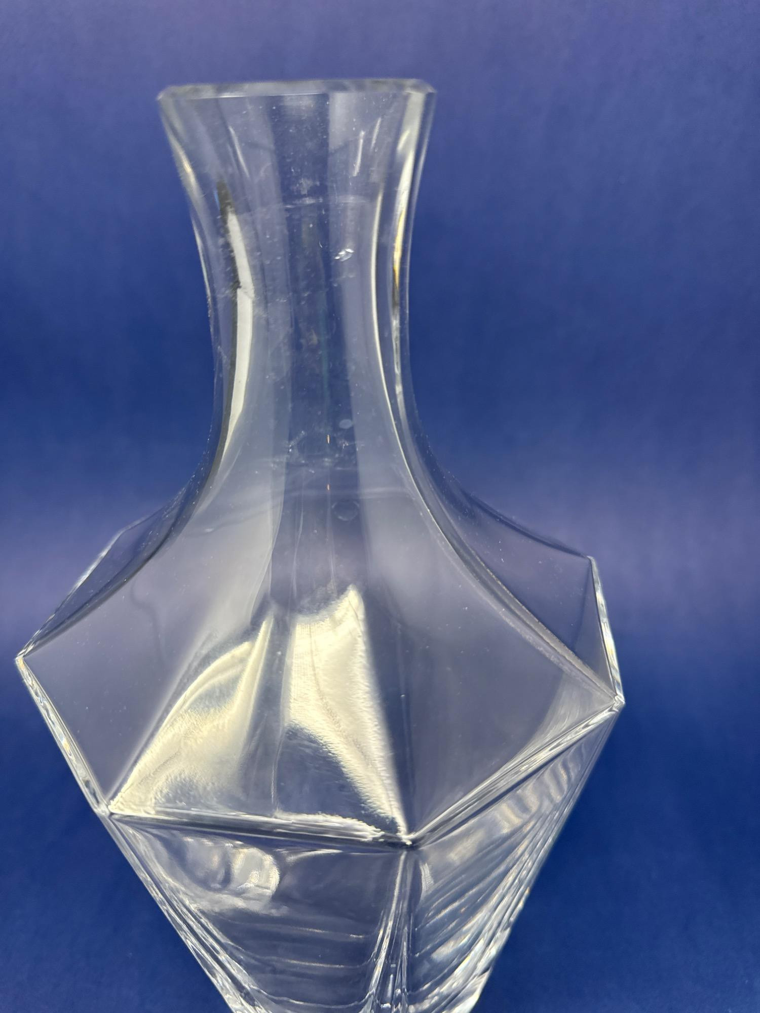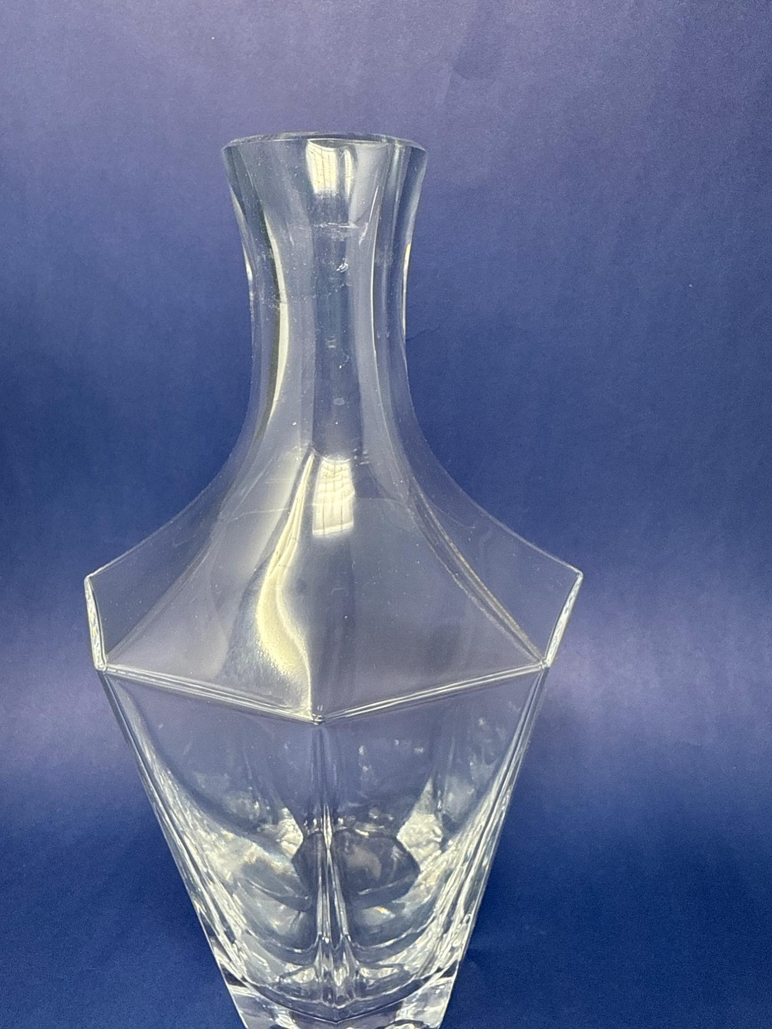This elegant Cartier crystal decanter is a striking blend of luxury and craftsmanship. Featuring sharp geometric faceting and a tall, graceful silhouette, it’s designed to catch the light and attention in any setting. The decanter is paired with its original glossy black stopper, adding bold contrast and a refined finish. Features: Brand: Cartier Material: Fine crystal Stopper: Original black glass stopper Design: Geometric faceted body Color: Clear with black accent stopper Measurements: 13.5" tall x 5.5" wide