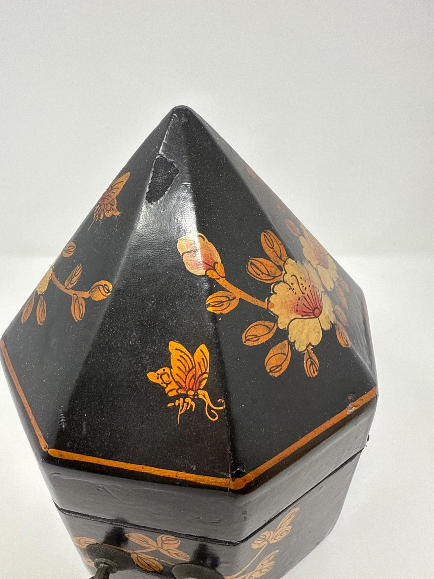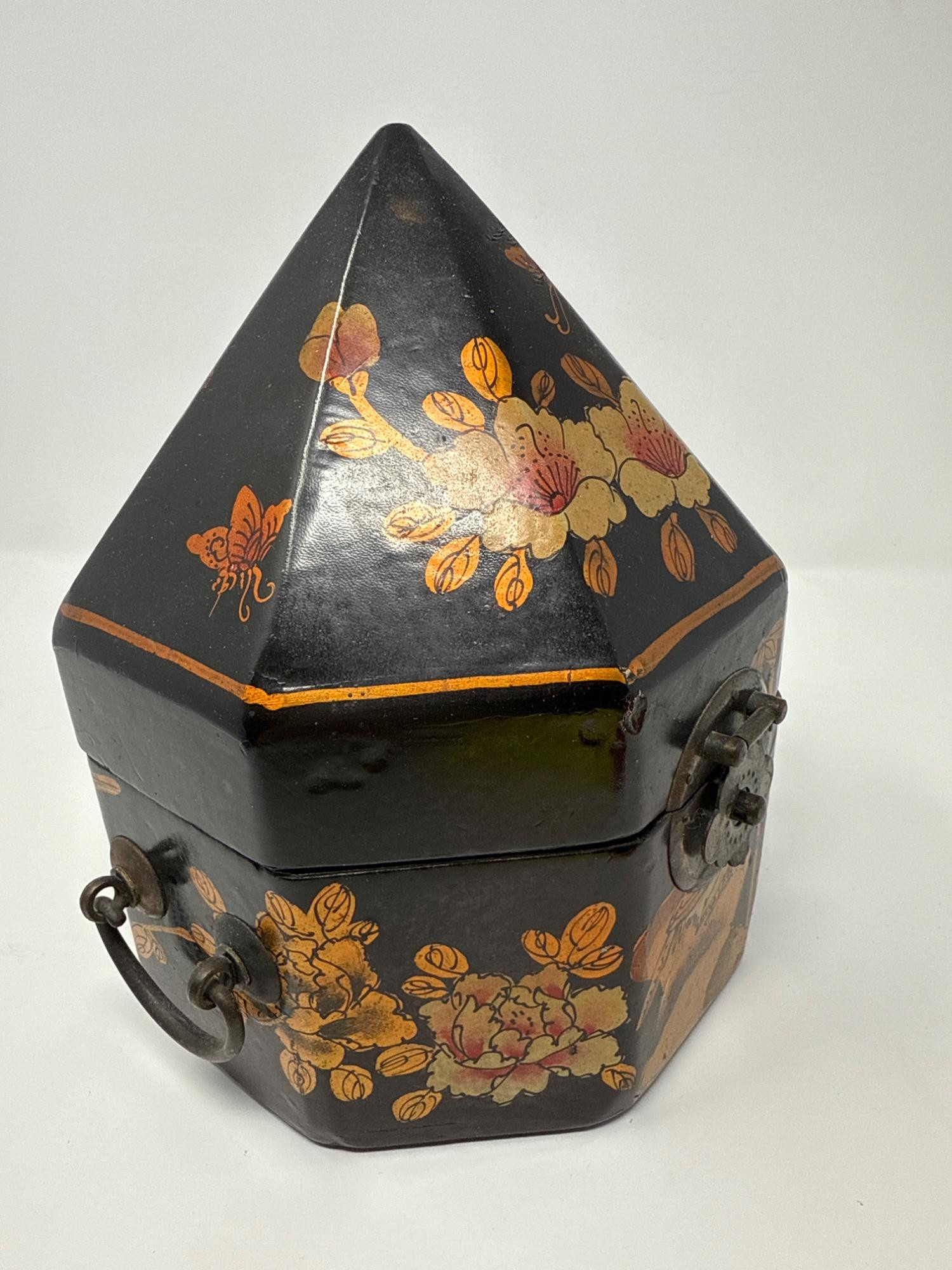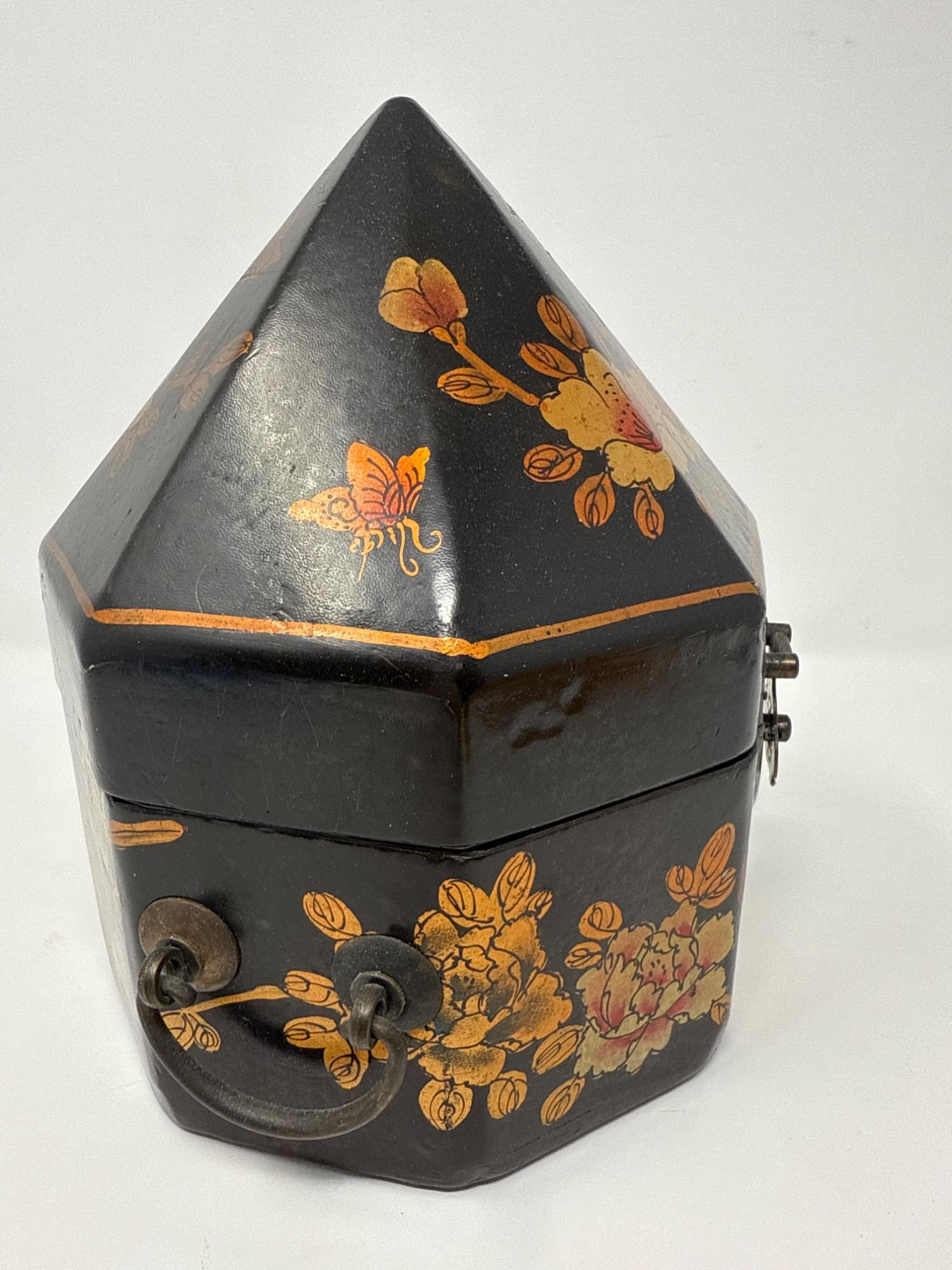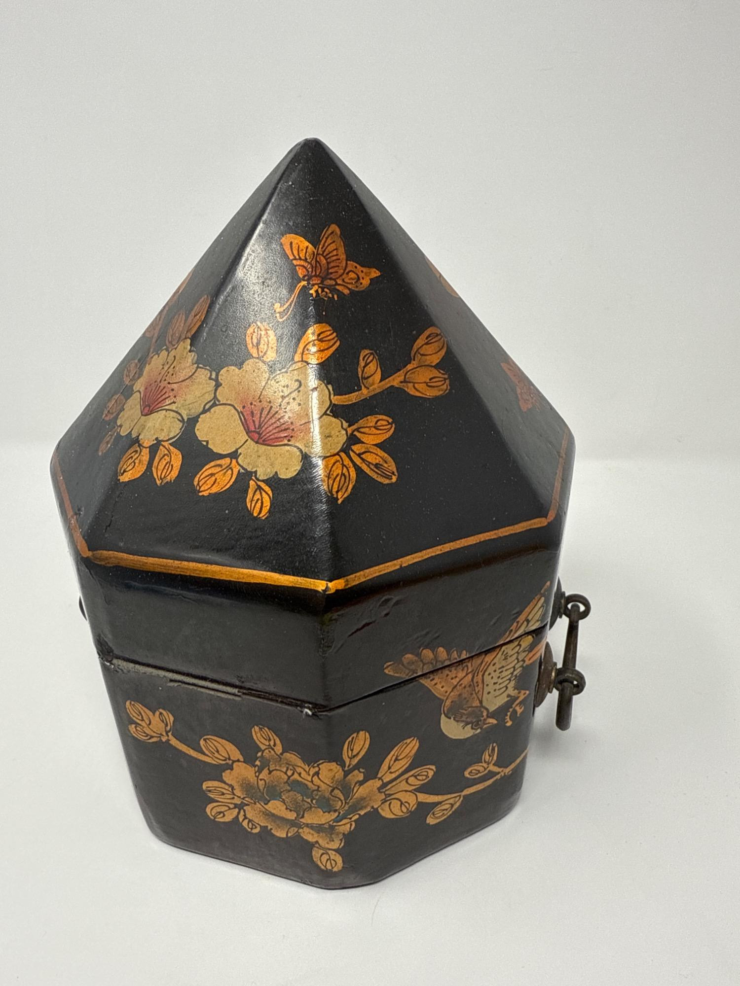 This eye-catching vintage box features an unusual octagonal shape with a steep, pointed lid, wrapped in a sleek vinyl-like material. The exterior is hand-painted with golden floral motifs and delicate butterflies, reminiscent of Mughal Indian art. Dimensions: 9.5" Tall × 7.5" Wide