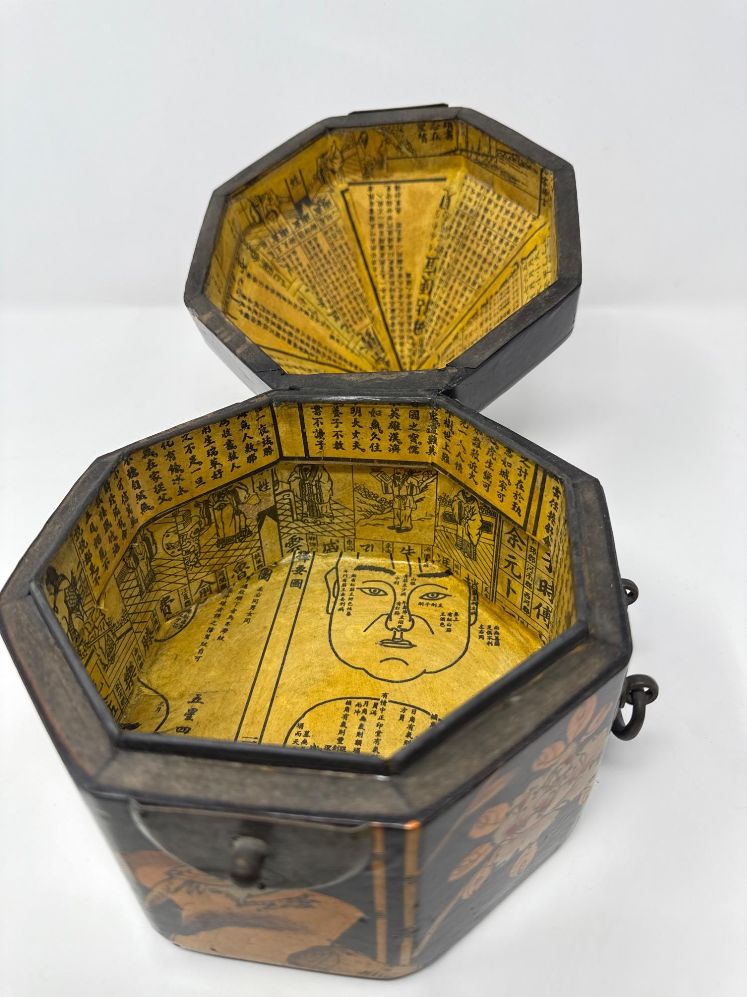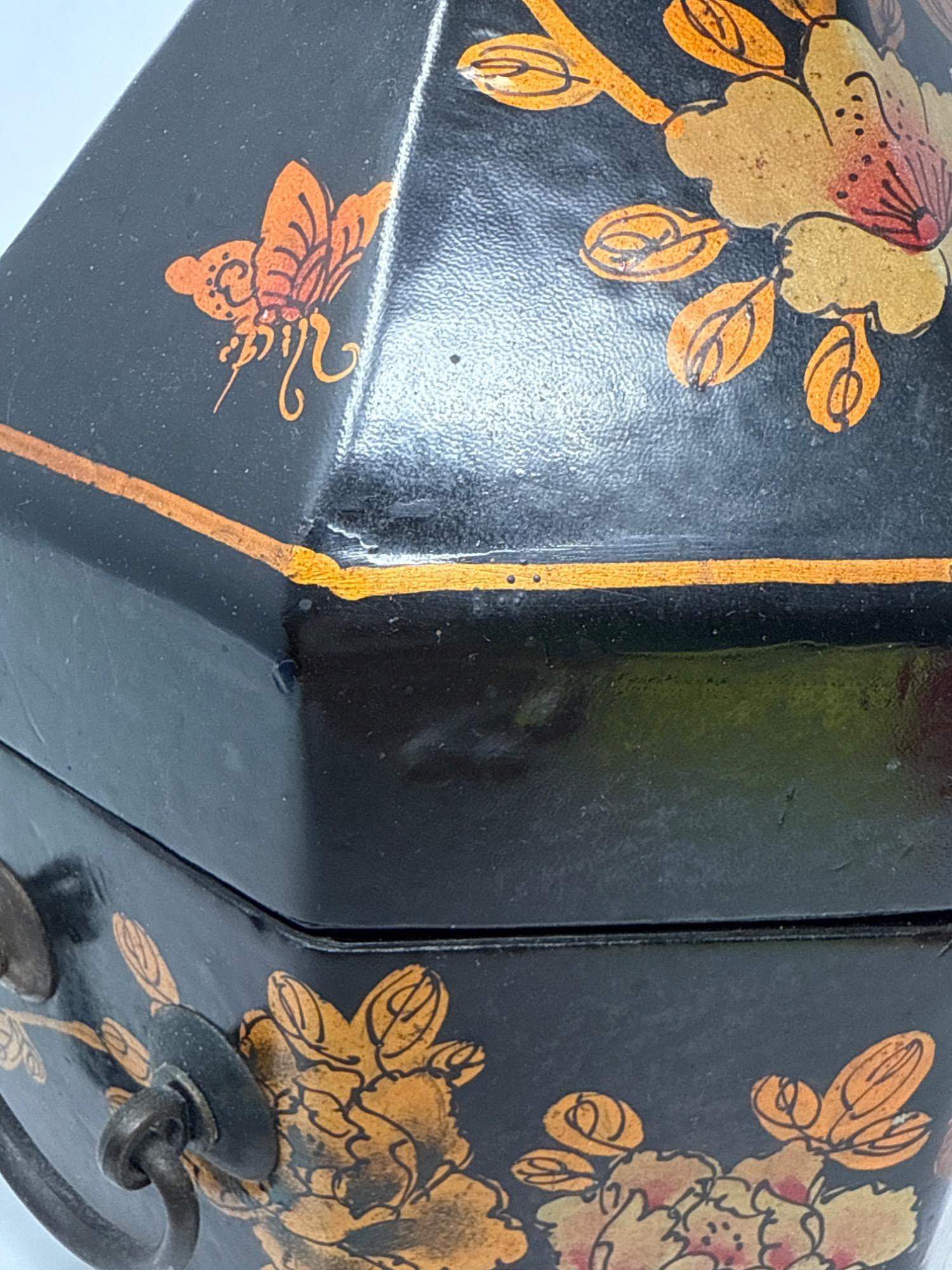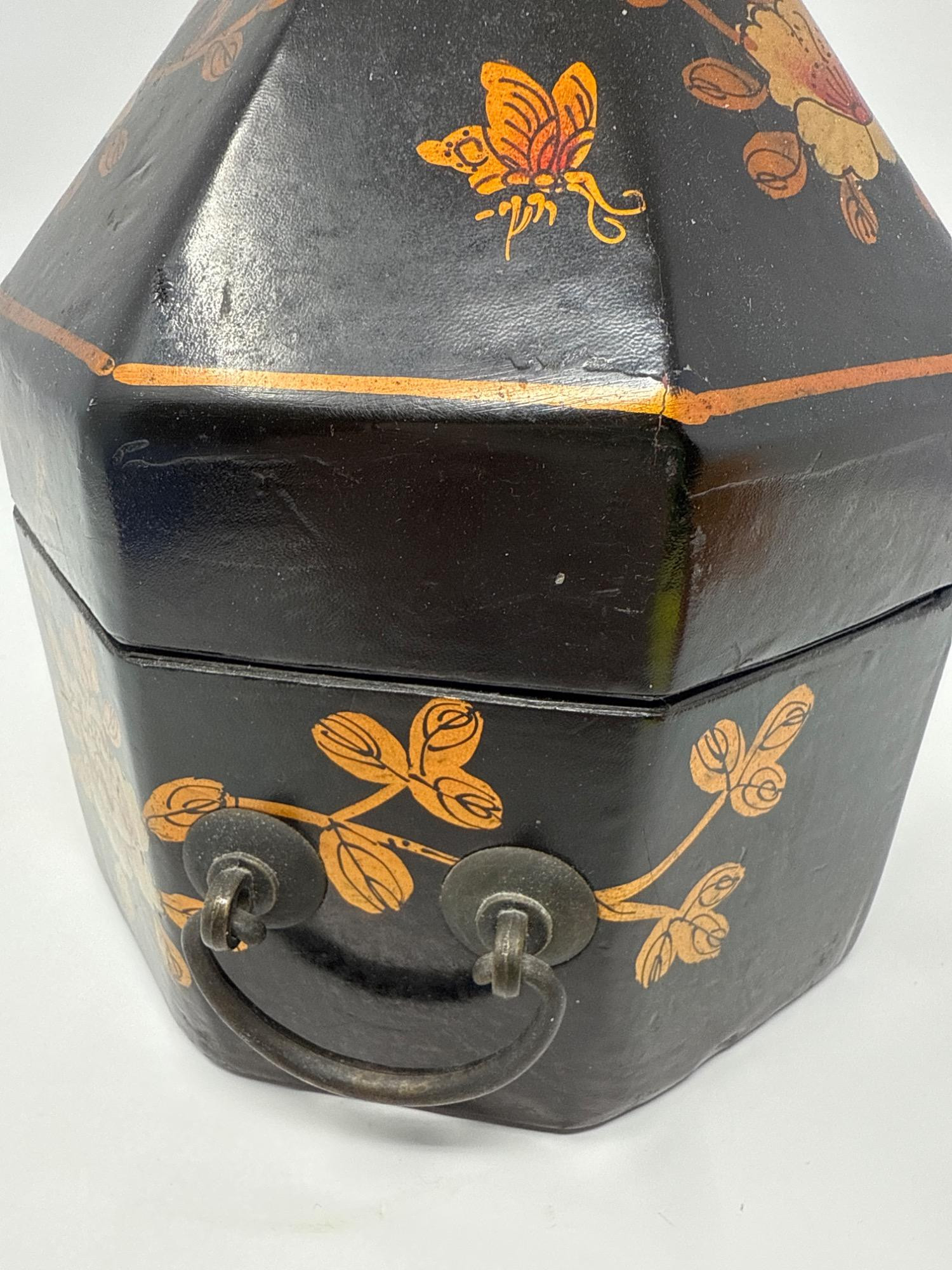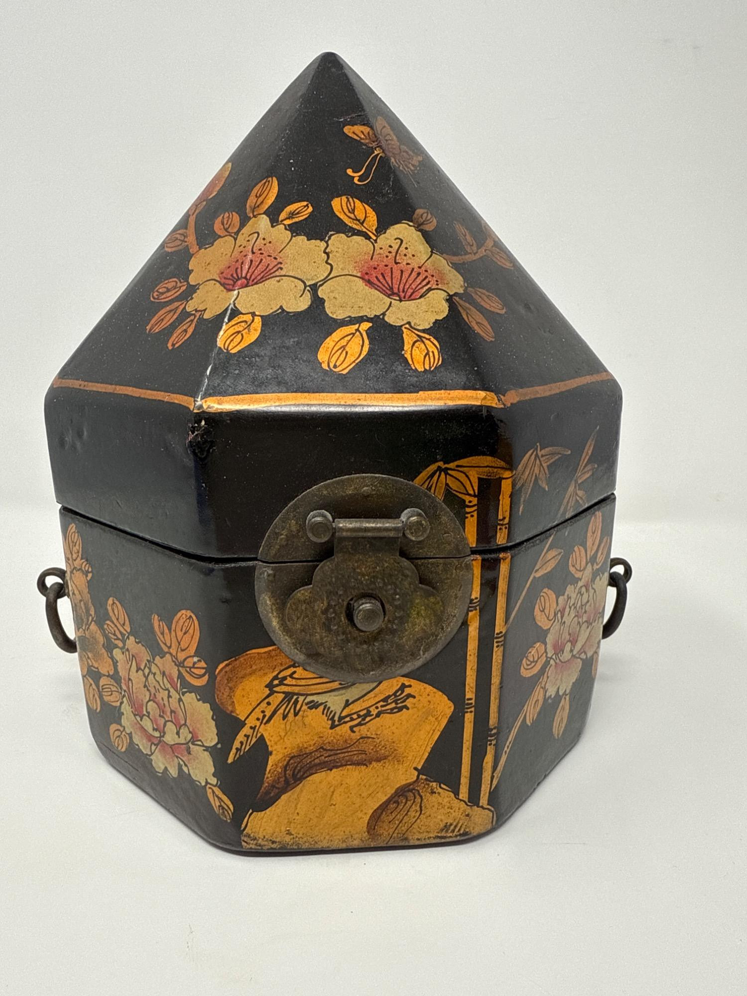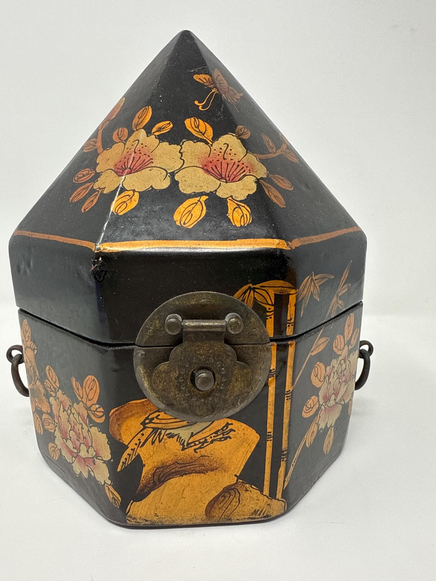 This eye-catching vintage box features an unusual octagonal shape with a steep, pointed lid, wrapped in a sleek vinyl-like material. The exterior is hand-painted with golden floral motifs and delicate butterflies, reminiscent of Mughal Indian art. Dimensions: 9.5" Tall × 7.5" Wide