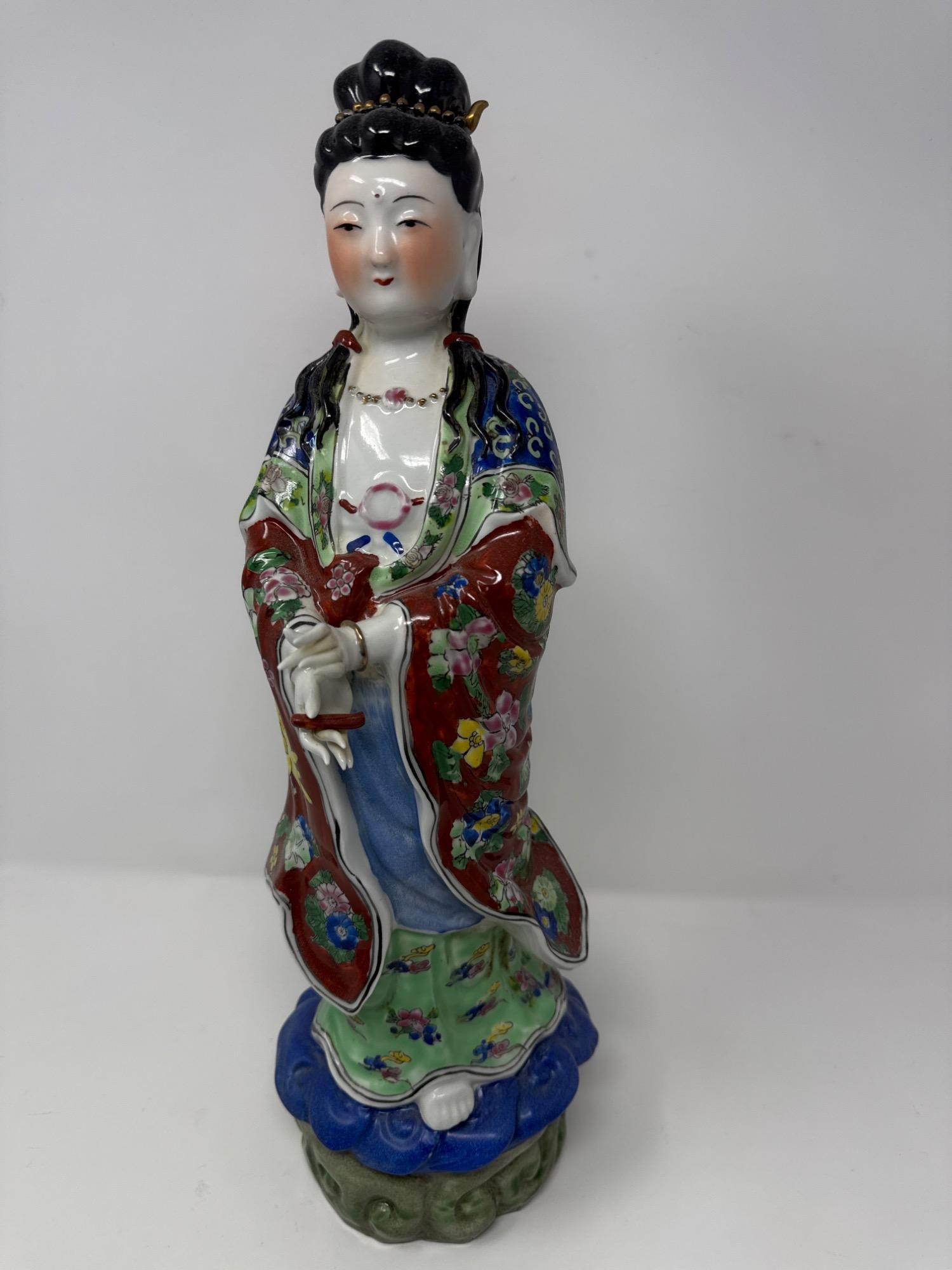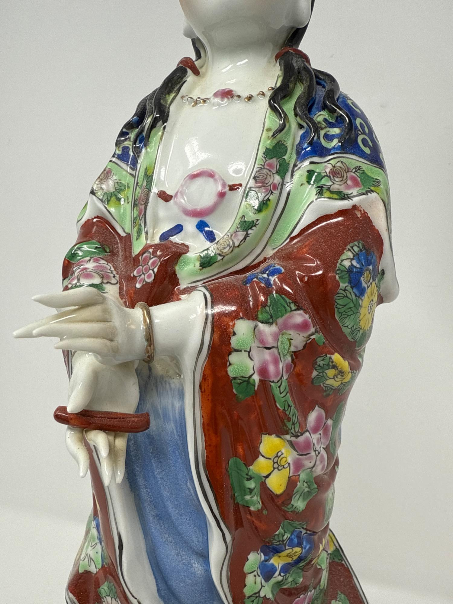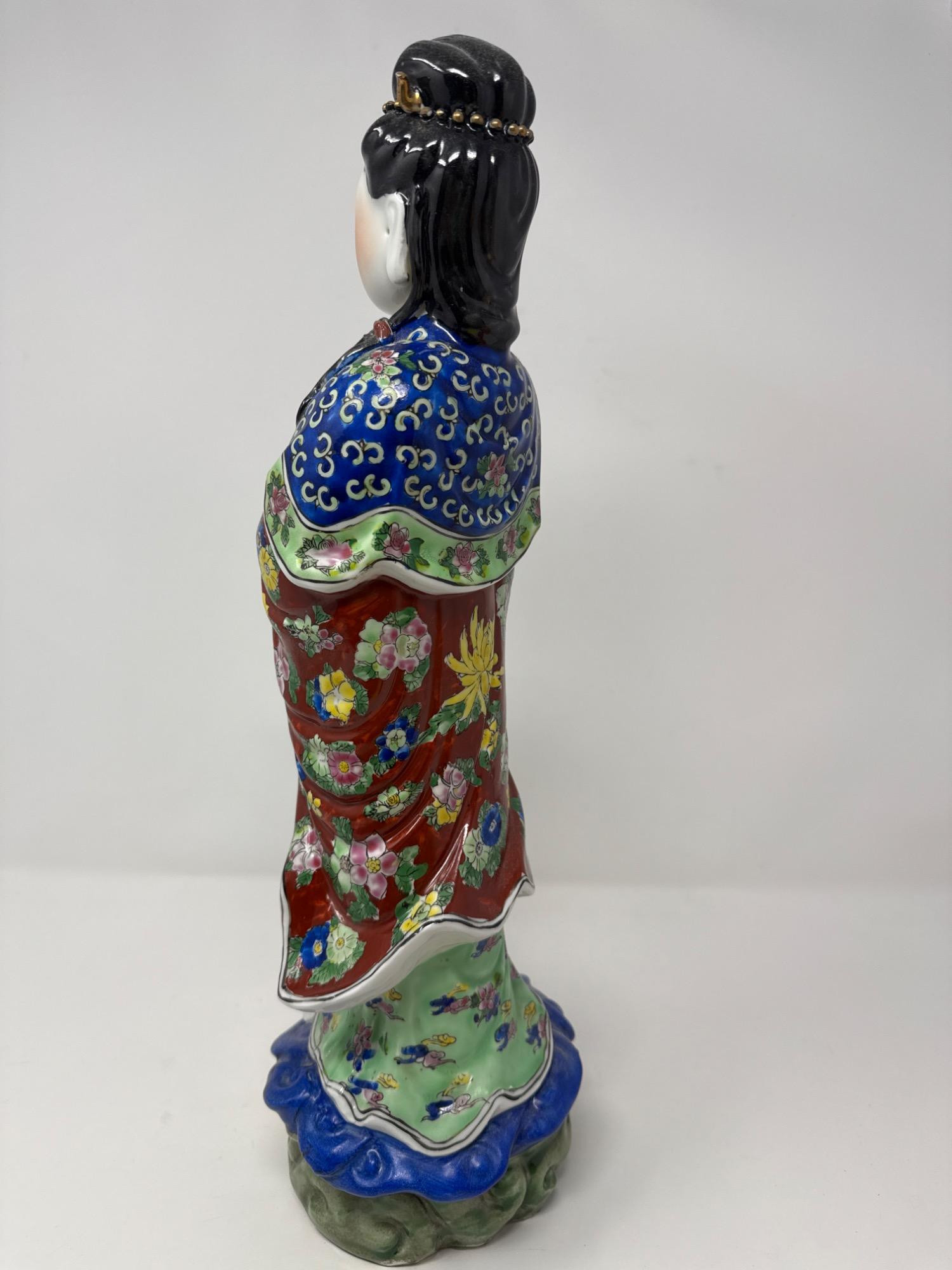 Beautiful antique Chinese Famille Rose porcelain statue featuring a finely detailed female figure in traditional attire. Material: Porcelain Style: Hand-painted in vivid Famille Rose enamels with floral motifs and intricate patterns Features: Delicately sculpted hands, serene facial expression, and ornate robe designs Dimensions: 17" tall × 4" wide
