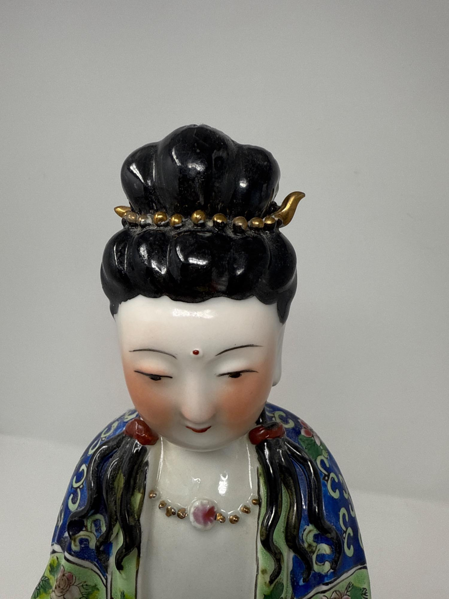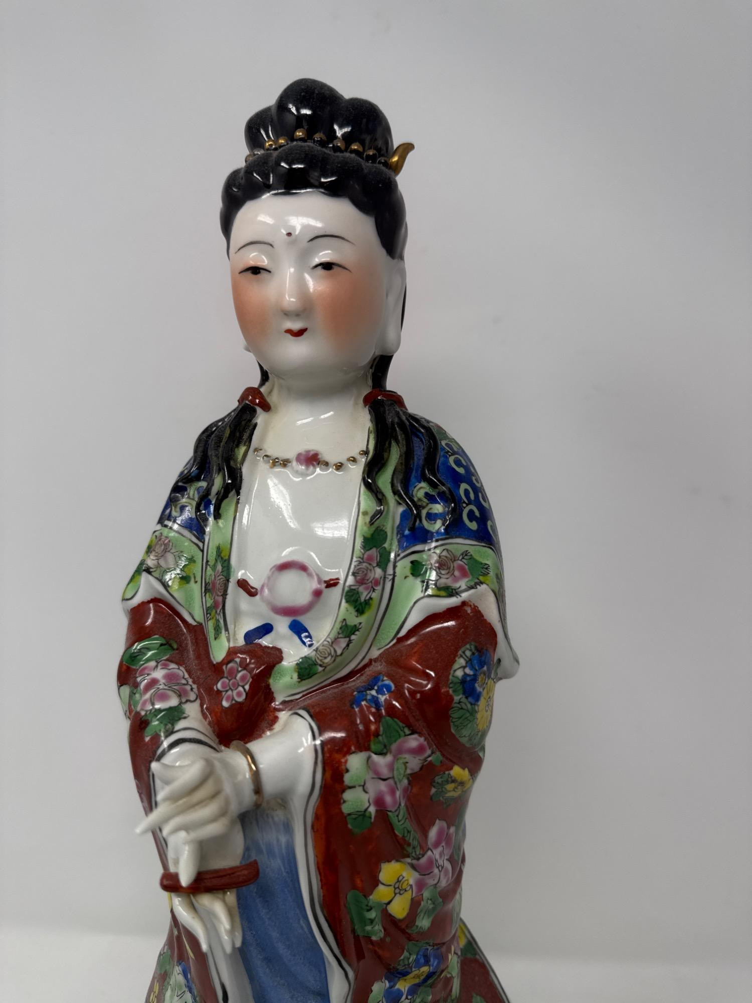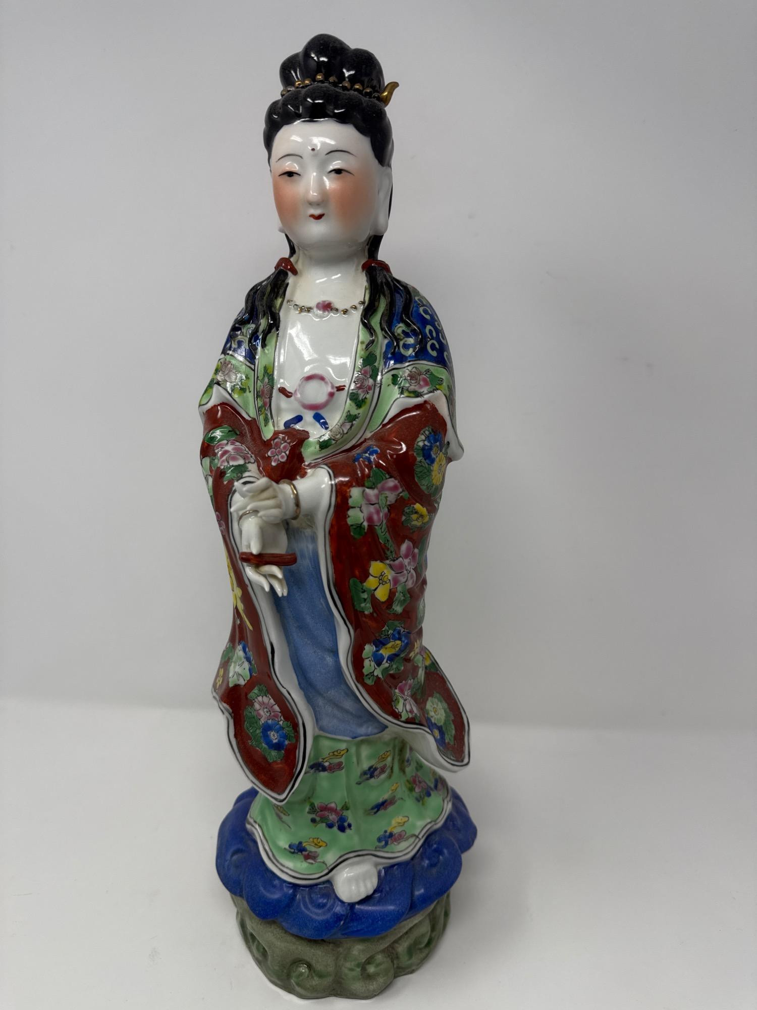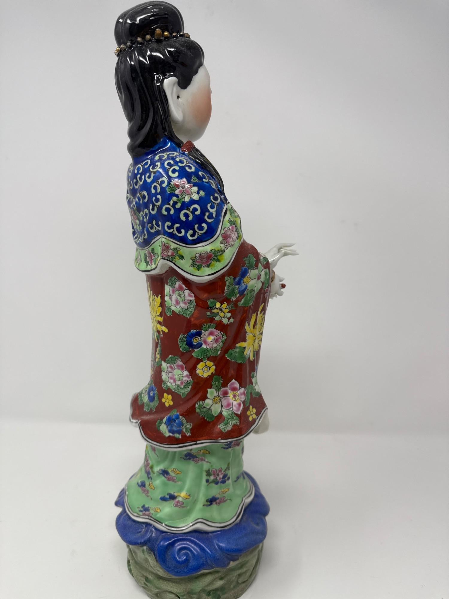Beautiful antique Chinese Famille Rose porcelain statue featuring a finely detailed female figure in traditional attire. Material: Porcelain Style: Hand-painted in vivid Famille Rose enamels with floral motifs and intricate patterns Features: Delicately sculpted hands, serene facial expression, and ornate robe designs Dimensions: 17" tall × 4" wide