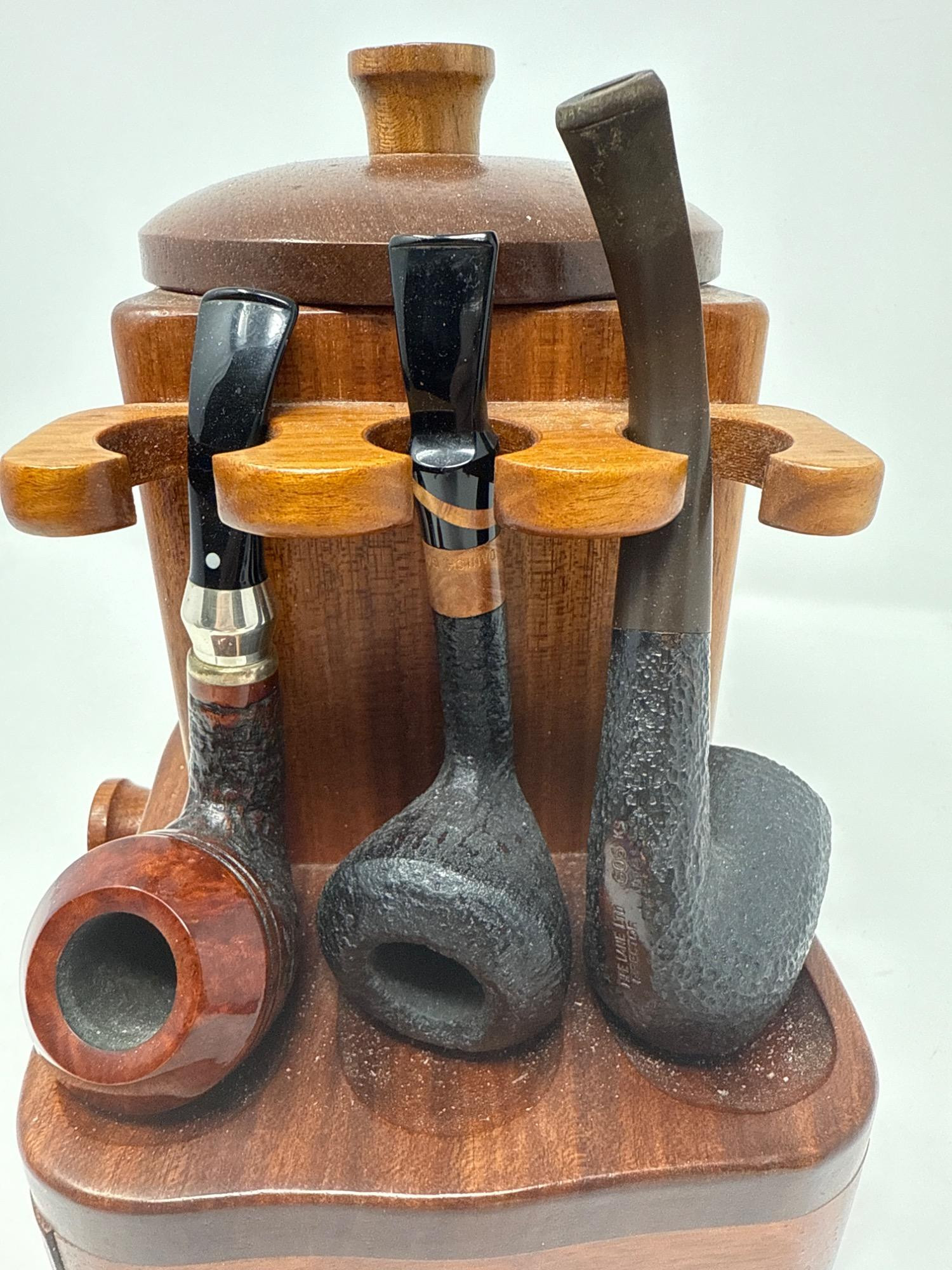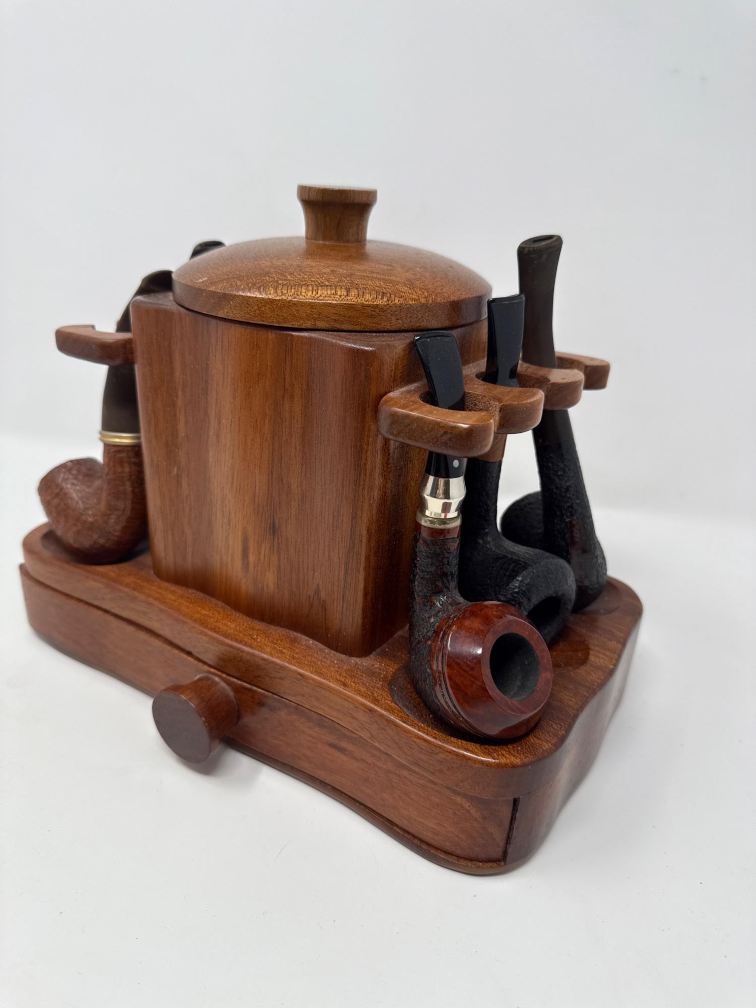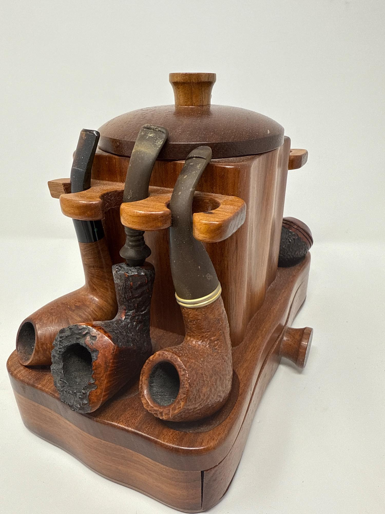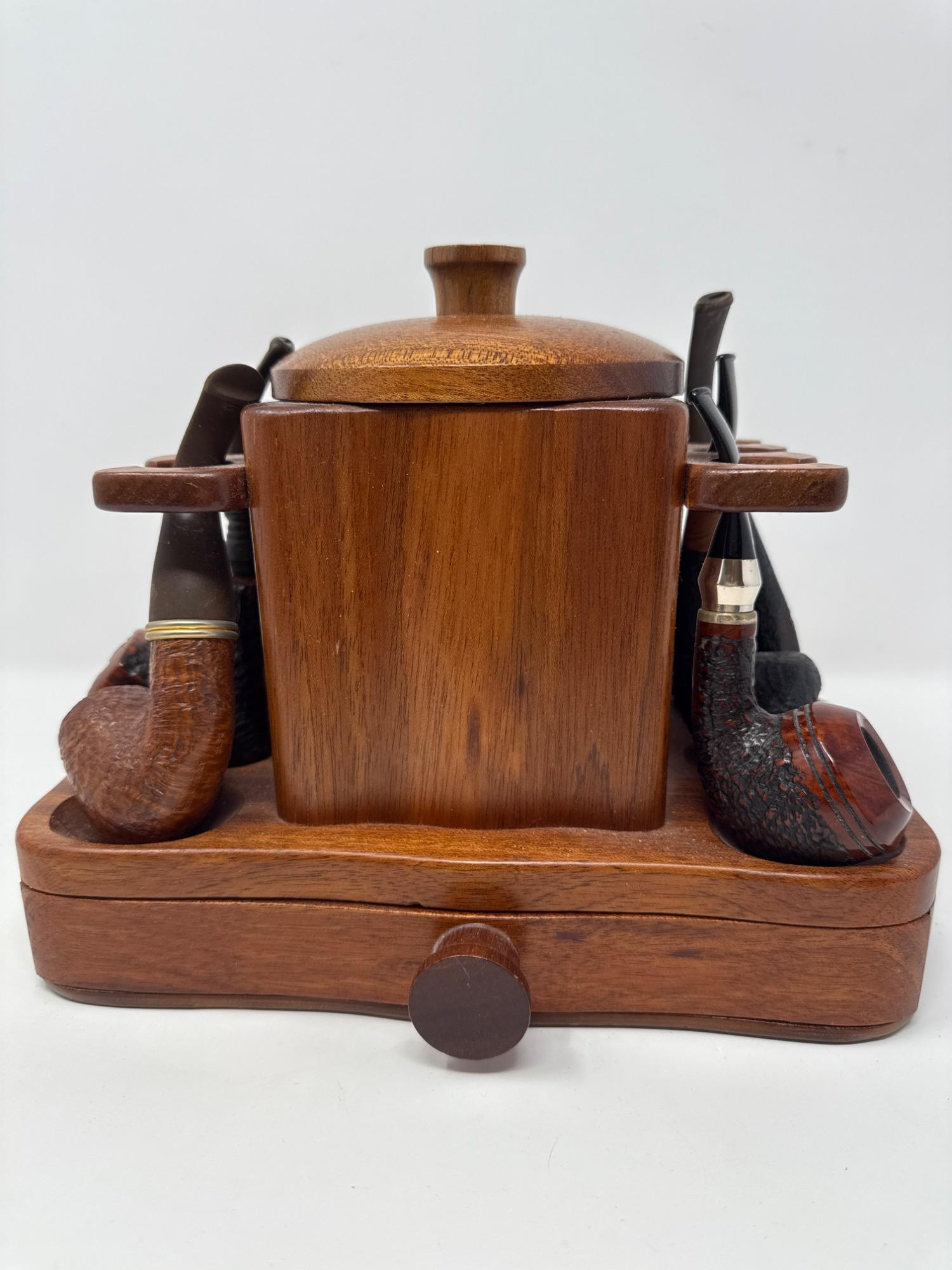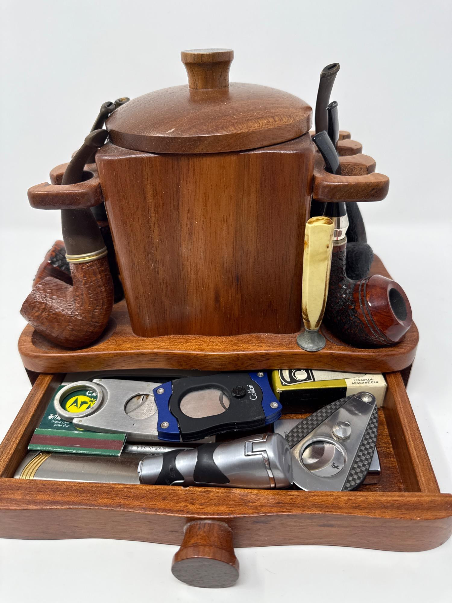 This is a beautifully crafted vintage wooden tobacco humidor with an integrated pipes rack. The piece features a rich wood grain finish and a classic design, making it both functional and decorative for any tobacco pipe enthusiast. Central Humidor: The ceramic-lined humidor sits at the center with a wooden lid featuring a built-in humidifier on the underside. It’s perfect for storing pipe tobacco and maintaining freshness. Pipe Rack: Surrounding the humidor are 10 slots to securely hold standard-size smoking pipes. Accessory Drawer: The bottom portion includes a pull-out drawer ideal for storing cutters, lighters, matches, filters, or other pipe and cigar accessories. Dimensions: 10" Wide x 8" Tall