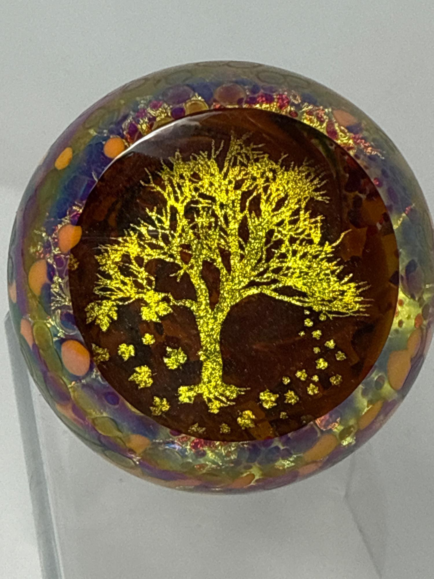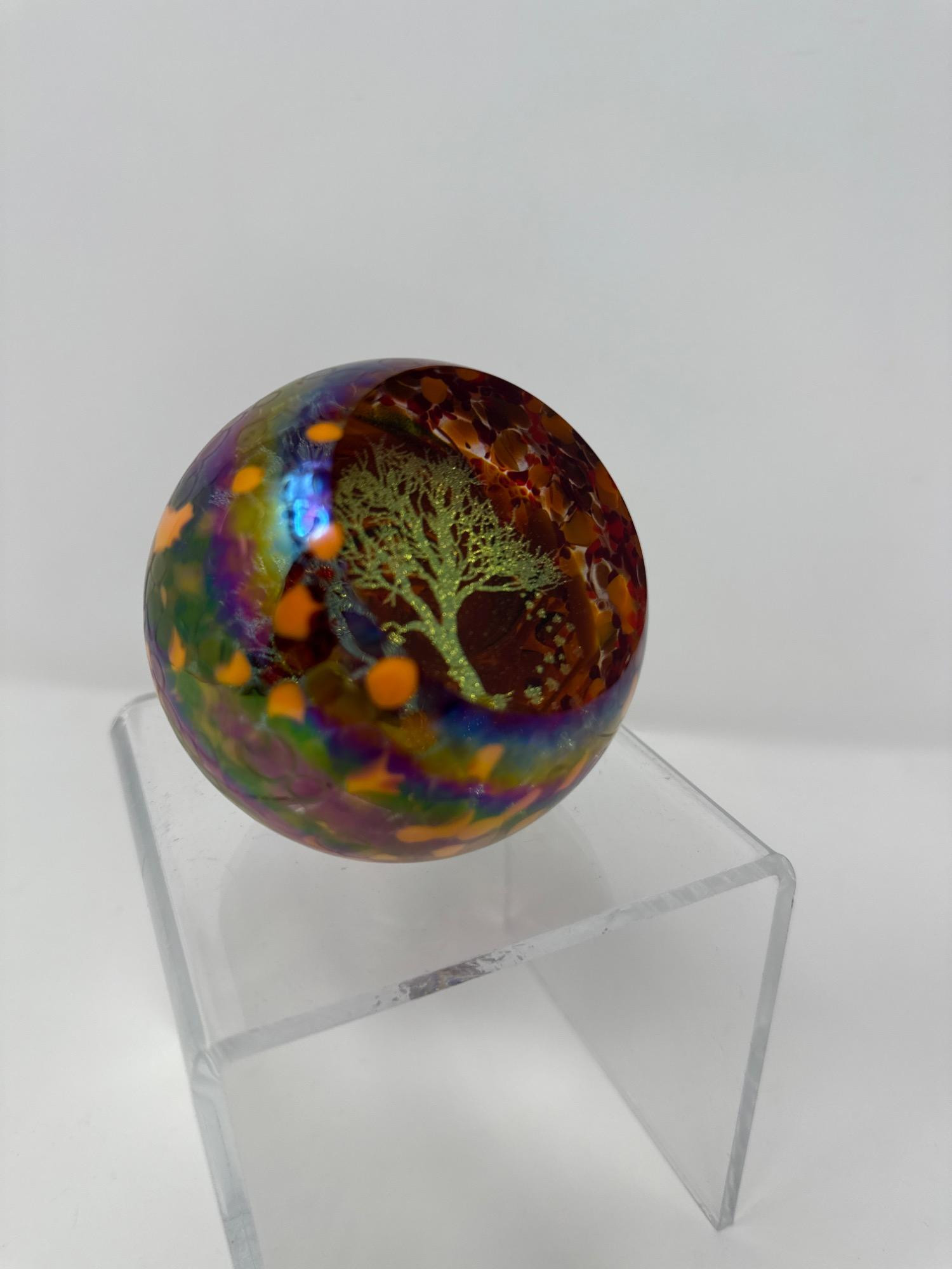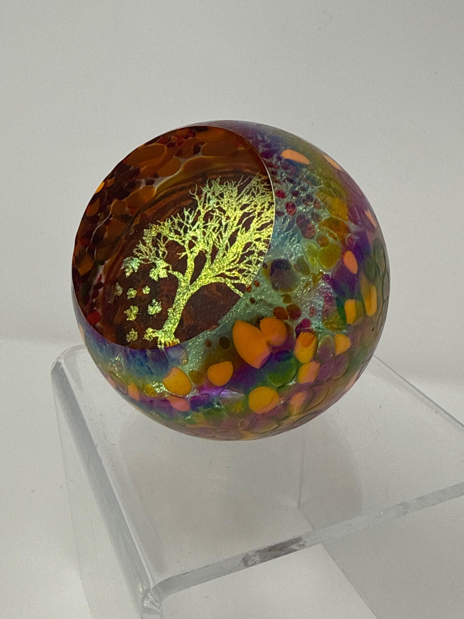 A beautiful set of collectible art glass pieces, perfect for display or gifting. This duo includes a signed Glass Eye Studio paperweight with vibrant color and dichroic tree design. Set Includes: Glass Eye Studio Paperweight Approx. 3" diameter Signed on base Iridescent tree motif with multicolor confetti glass