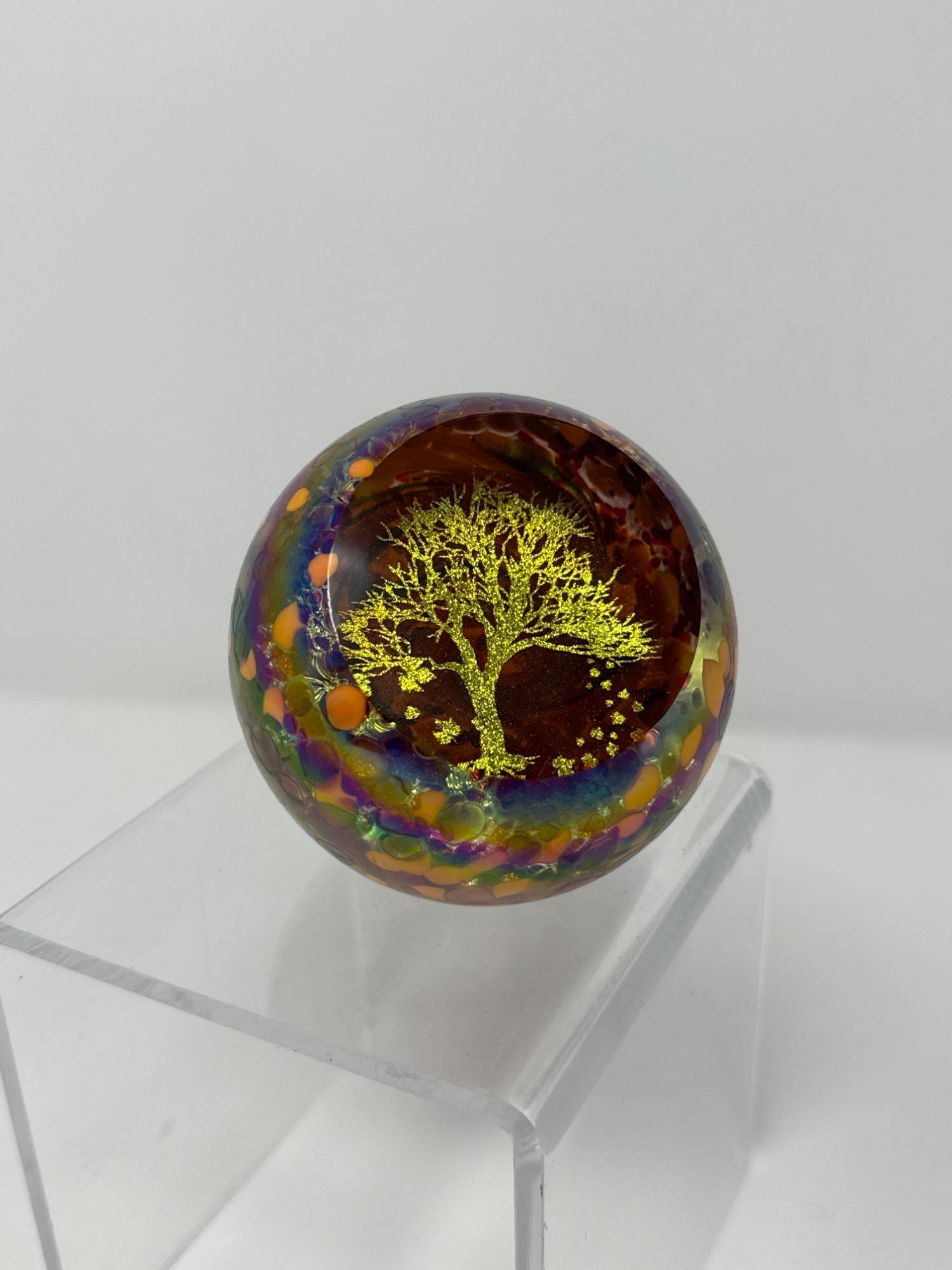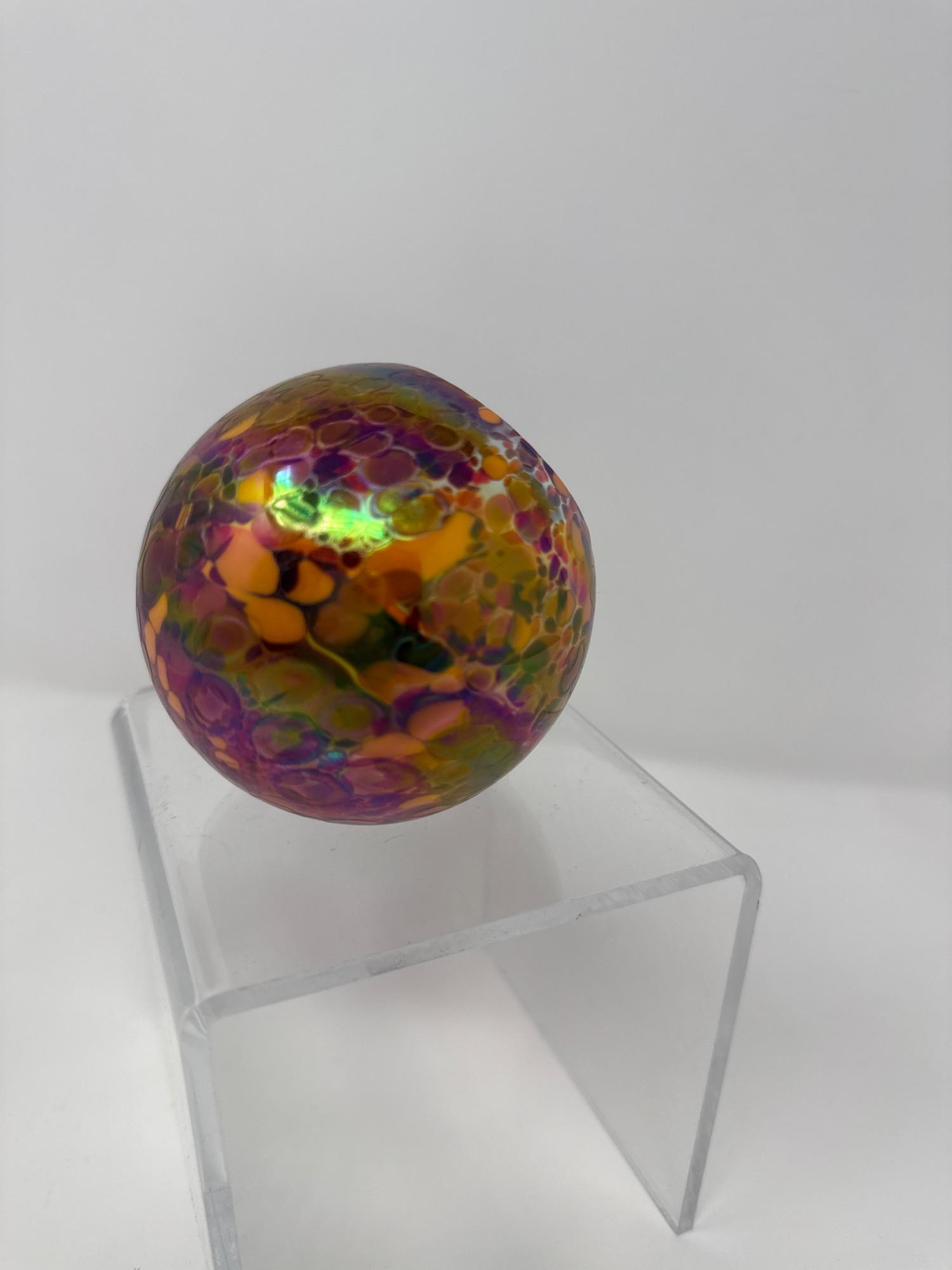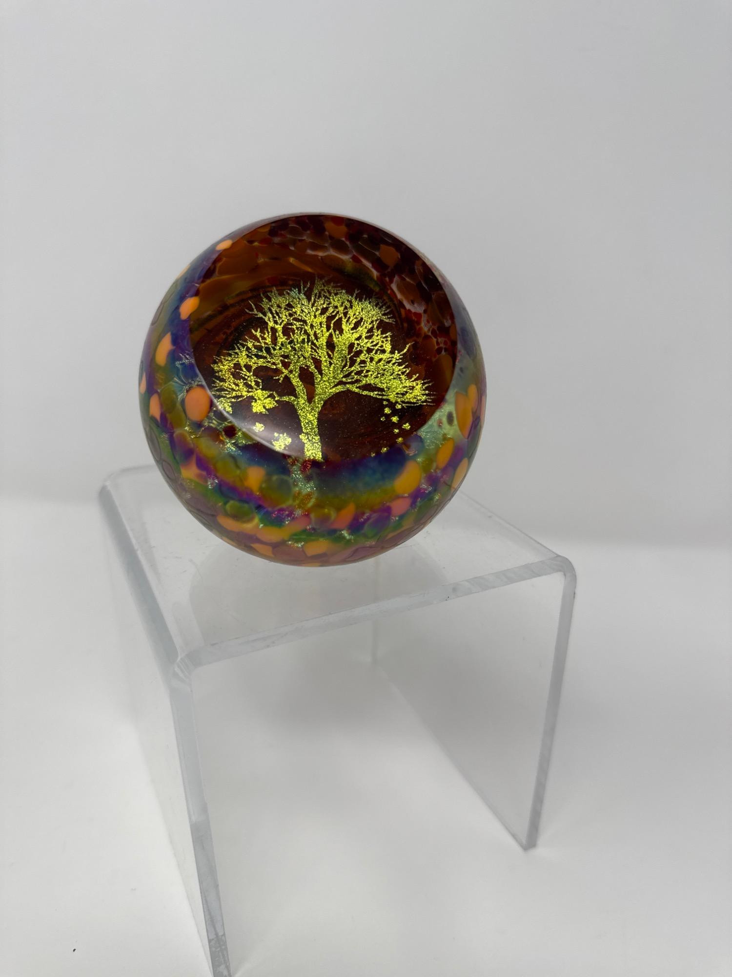 A beautiful set of collectible art glass pieces, perfect for display or gifting. This duo includes a signed Glass Eye Studio paperweight with vibrant color and dichroic tree design. Set Includes: Glass Eye Studio Paperweight Approx. 3" diameter Signed on base Iridescent tree motif with multicolor confetti glass
