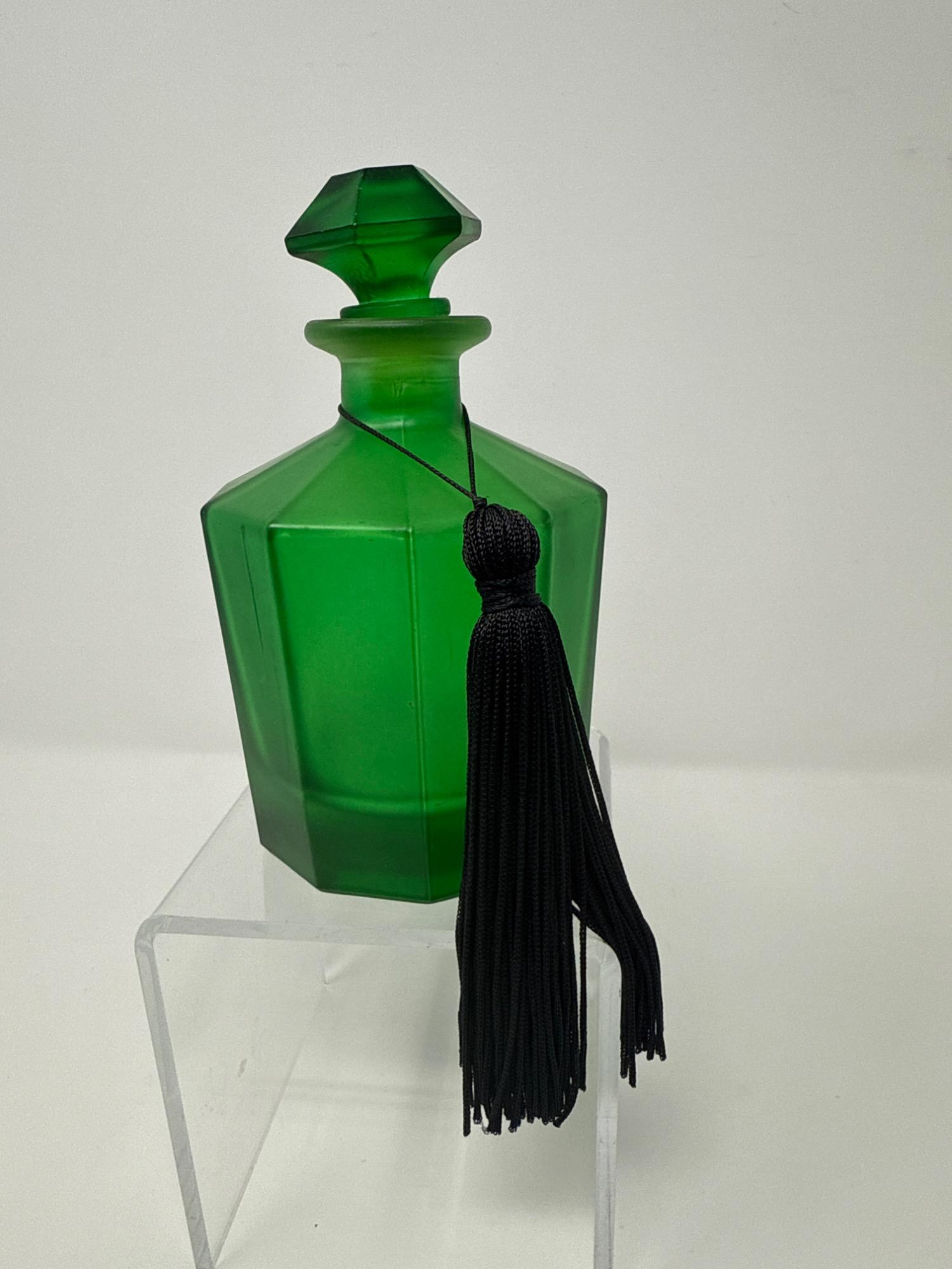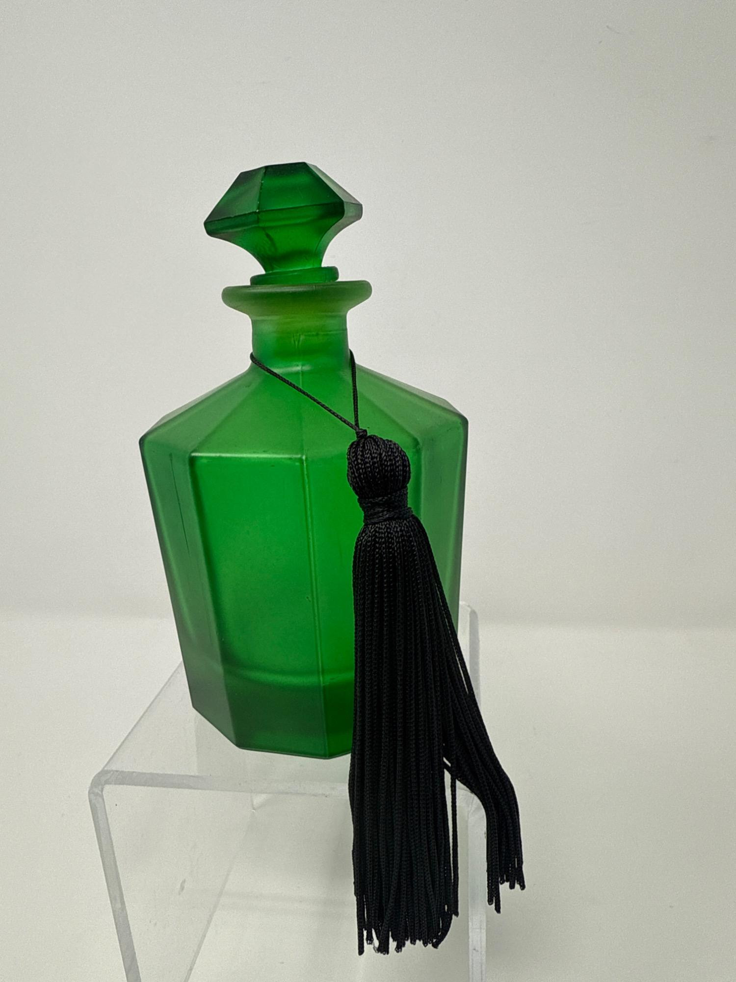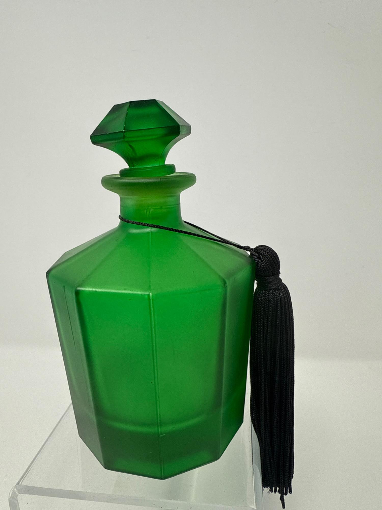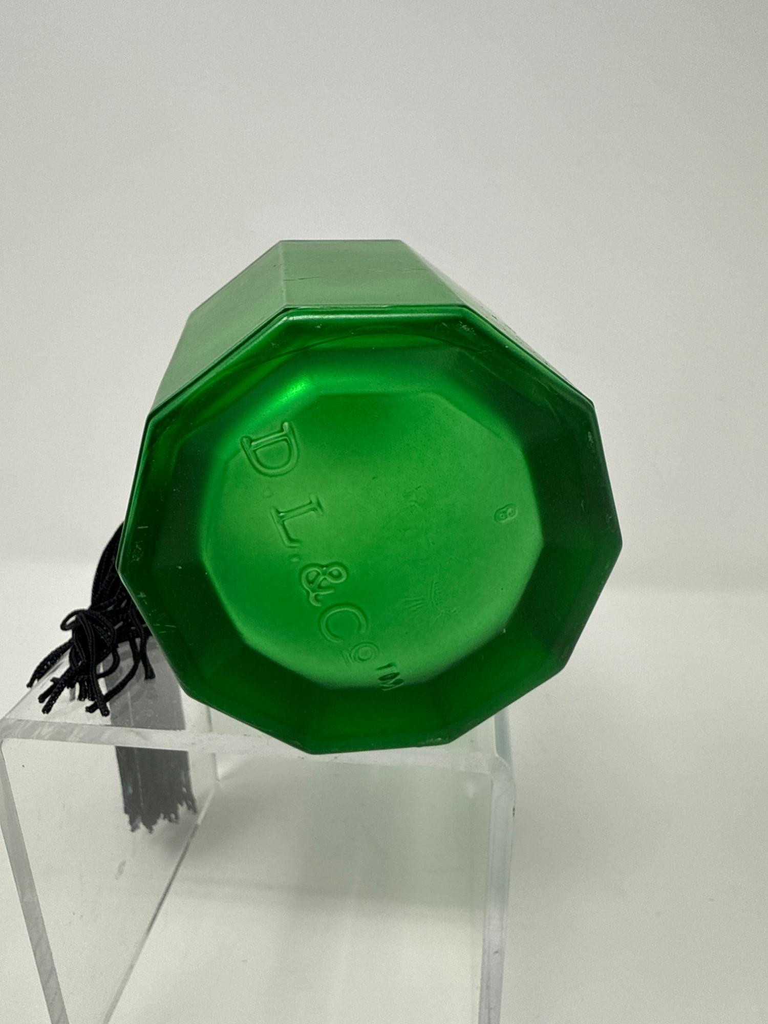 This emerald green glass bottle by DL & Co. features a bold faceted silhouette and a matching geometric stopper. A sleek black tassel adds a dramatic, elegant touch. Brand: DL & Co. (embossed on base) Color: Emerald green Material: Glass Features: Faceted design, matching stopper, long black tassel Dimensions: 6 inches tall x 3 inches wide