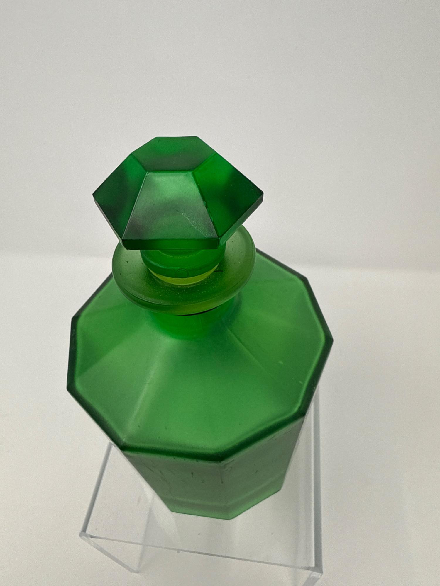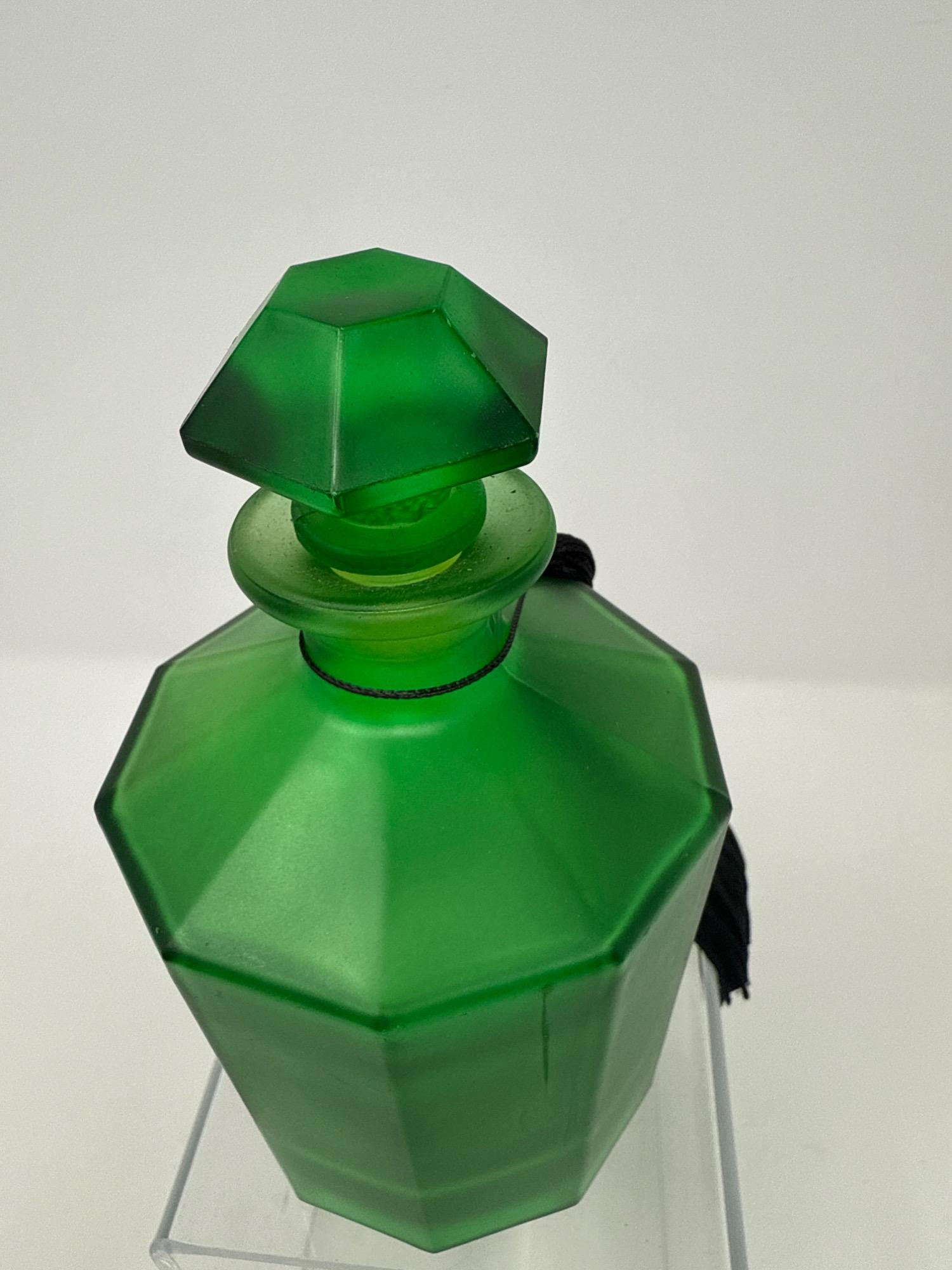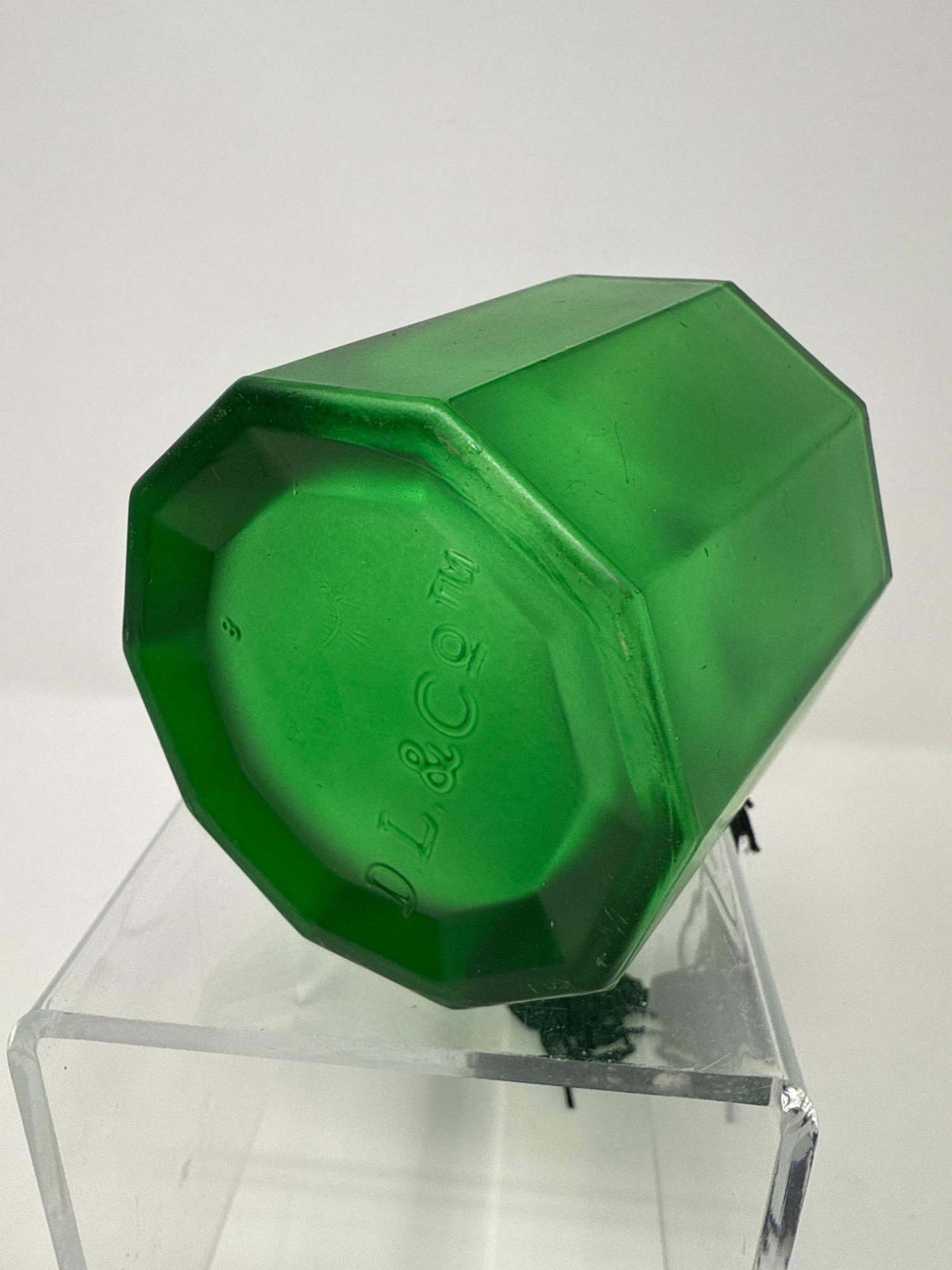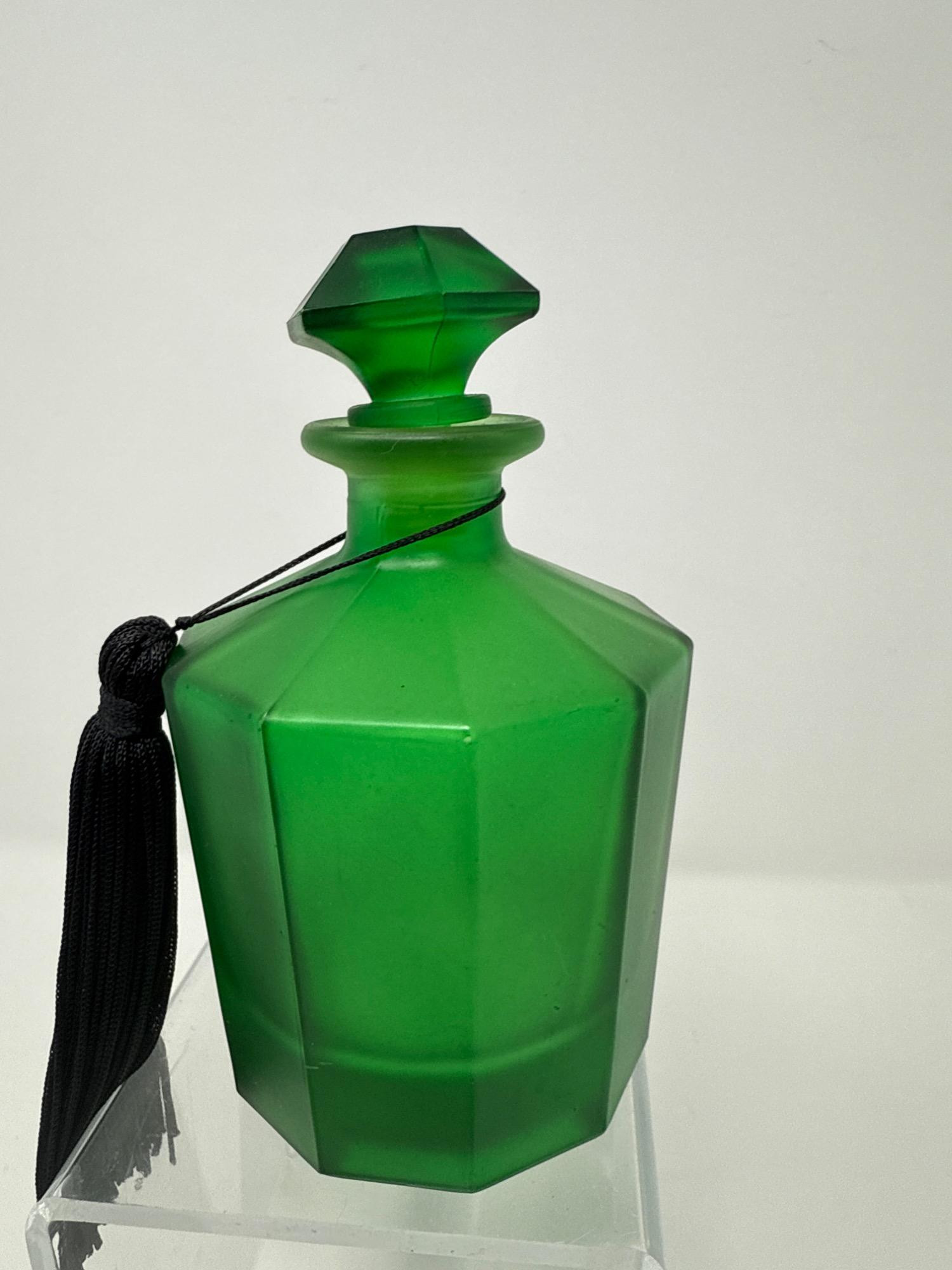 This emerald green glass bottle by DL & Co. features a bold faceted silhouette and a matching geometric stopper. A sleek black tassel adds a dramatic, elegant touch. Brand: DL & Co. (embossed on base) Color: Emerald green Material: Glass Features: Faceted design, matching stopper, long black tassel Dimensions: 6 inches tall x 3 inches wide