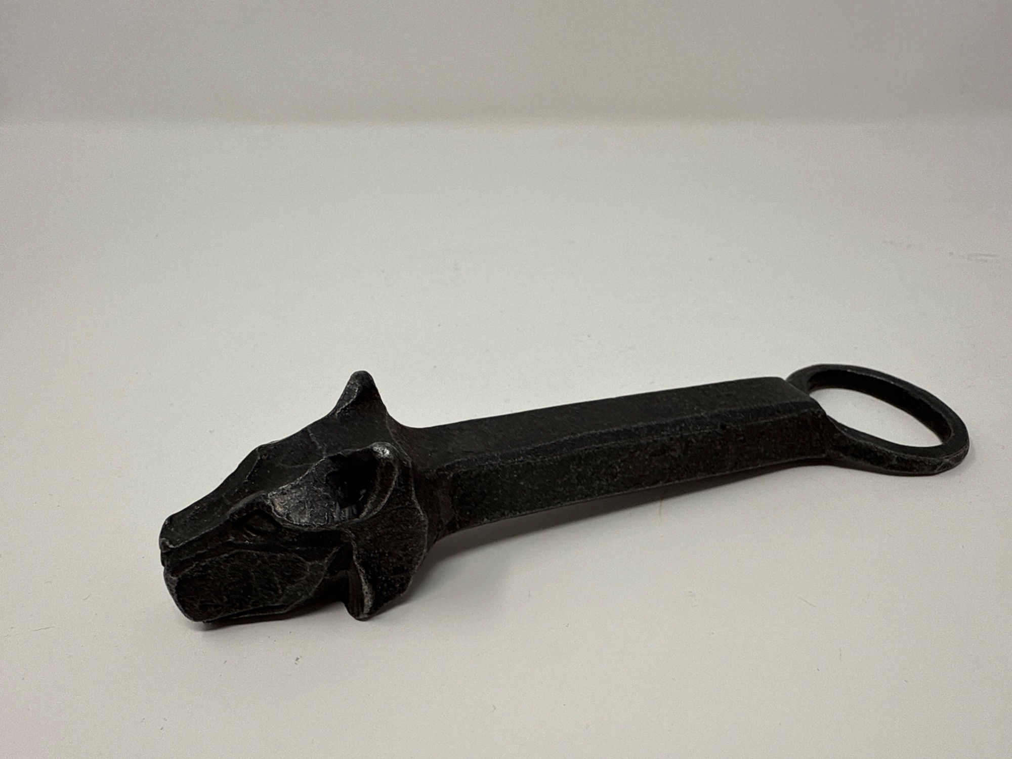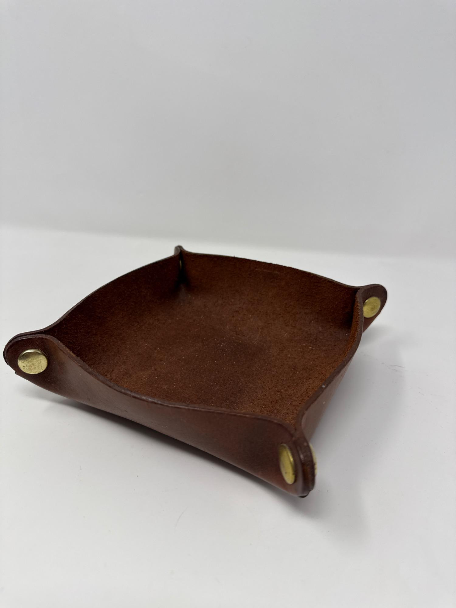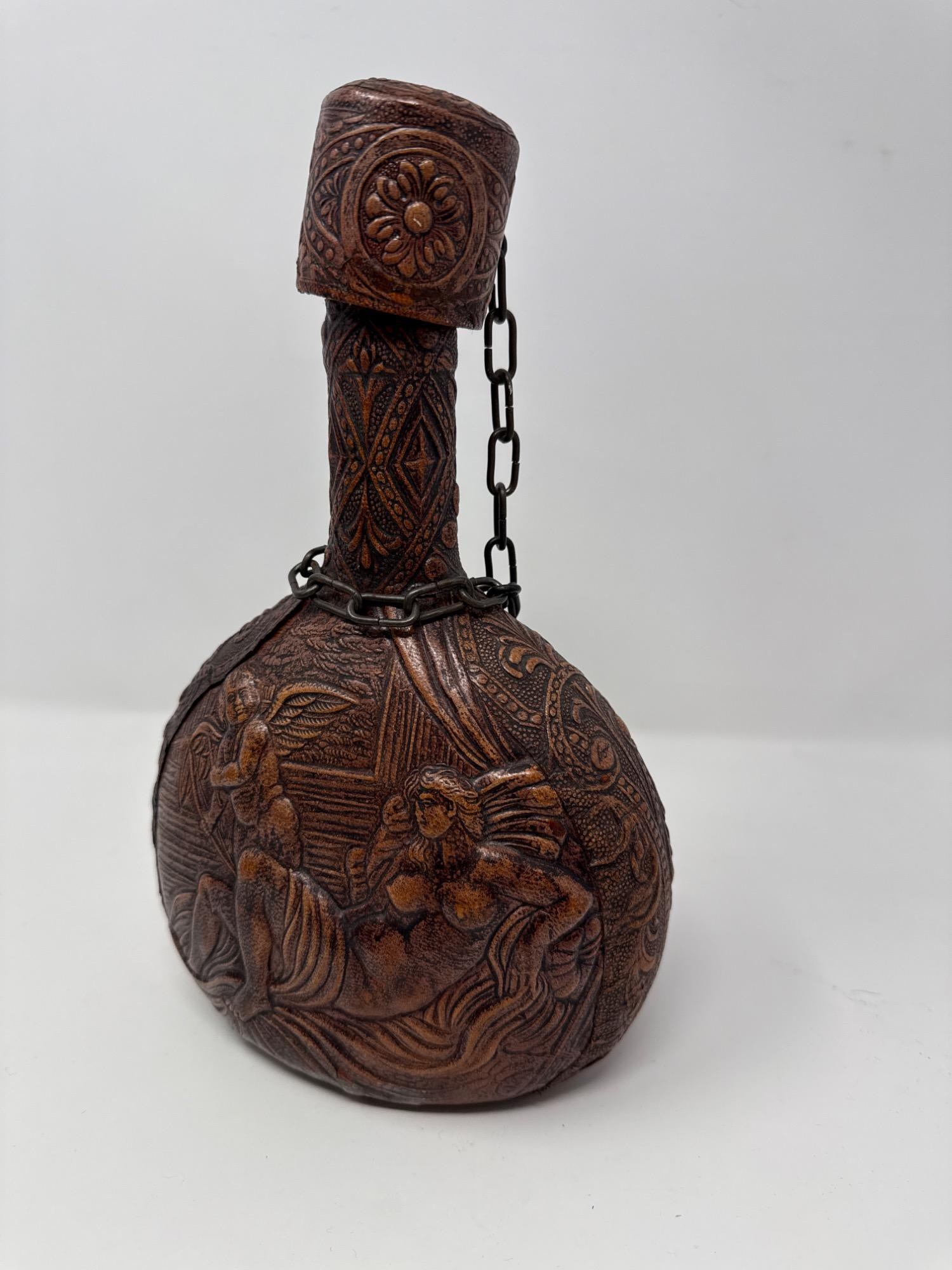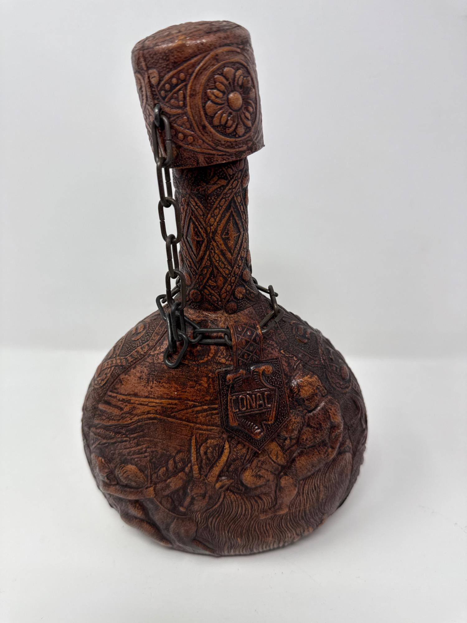 A rugged and unique curated set perfect for the collector or gentleman's study, bar, or desk: Vintage Leather-Wrapped Whisky Bottle: Intricately embossed with floral and scenic motifs, this bottle has a rustic charm and comes with a decorative chain and “CONAC” medallion detail. Measurement: 6" tall Genuine Leather Valet Tray: Crafted with brass snap corners, this rich brown tray is great for organizing keys, coins, or accessories. Measurements: 6.5" x 6.5". Polished Agate Trinket Bowl: Features deep earthy tones with a smooth, glossy finish and natural rugged edges—a beautiful blend of function and form. Measurements: 6" x 5" x 2". Cast Iron Panther Head Bottle Opener: Hefty and solid, this unique bottle opener adds a bold touch to the collection.