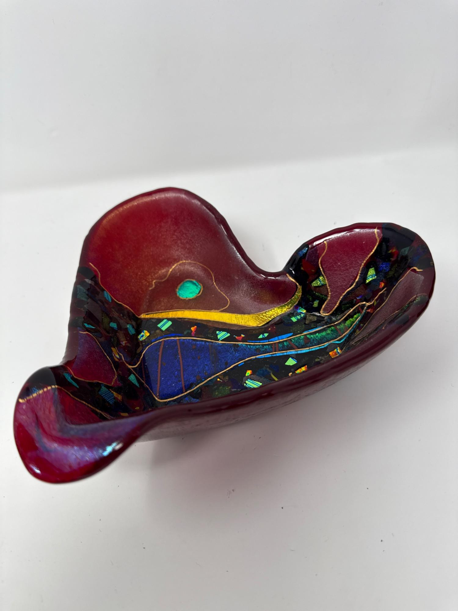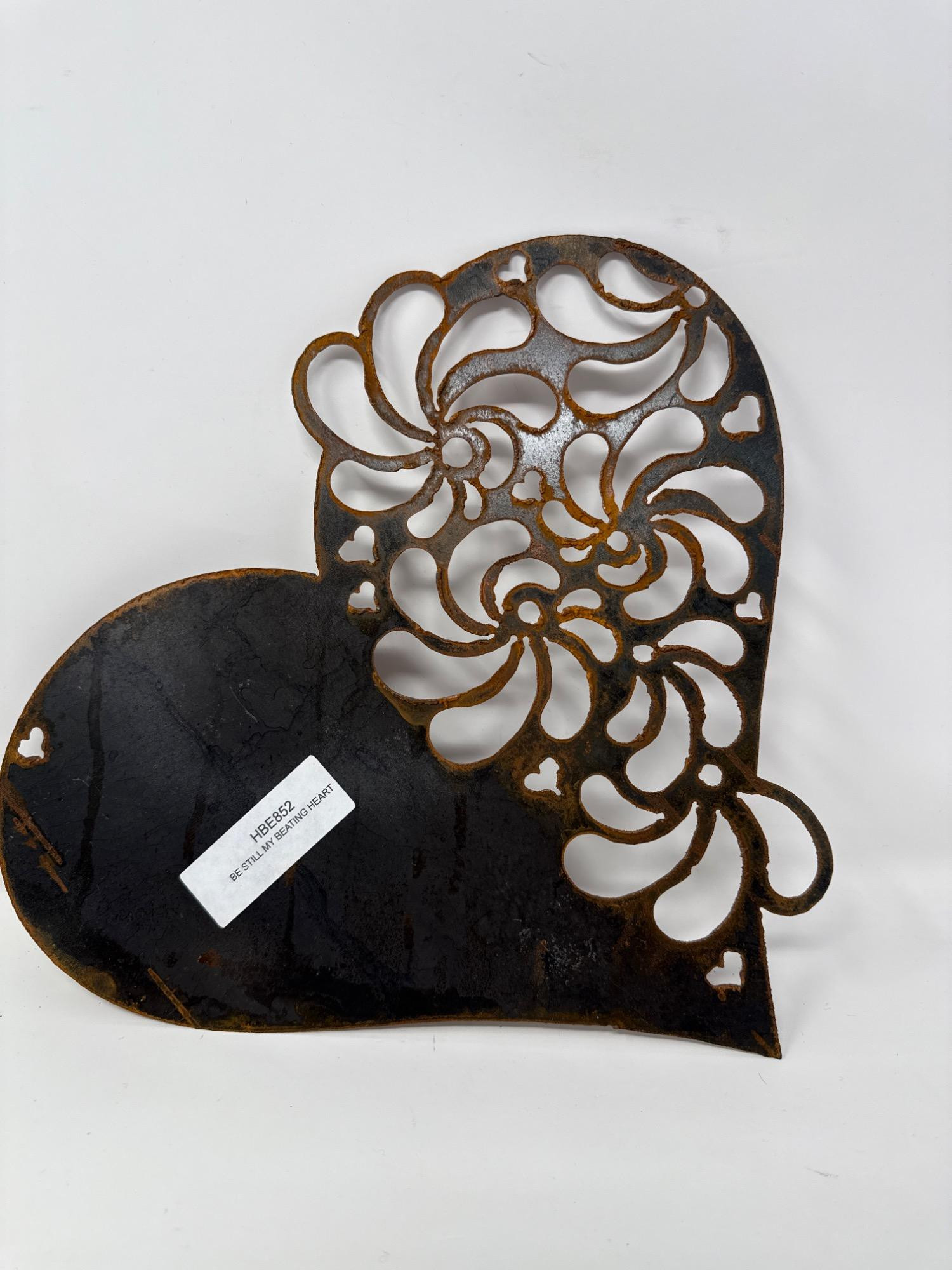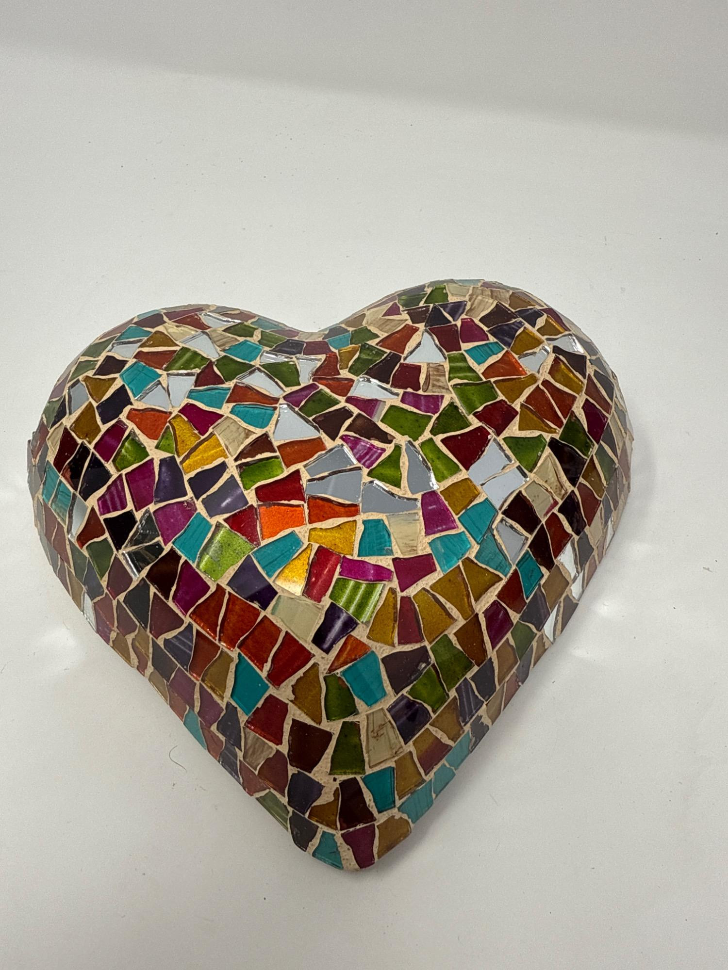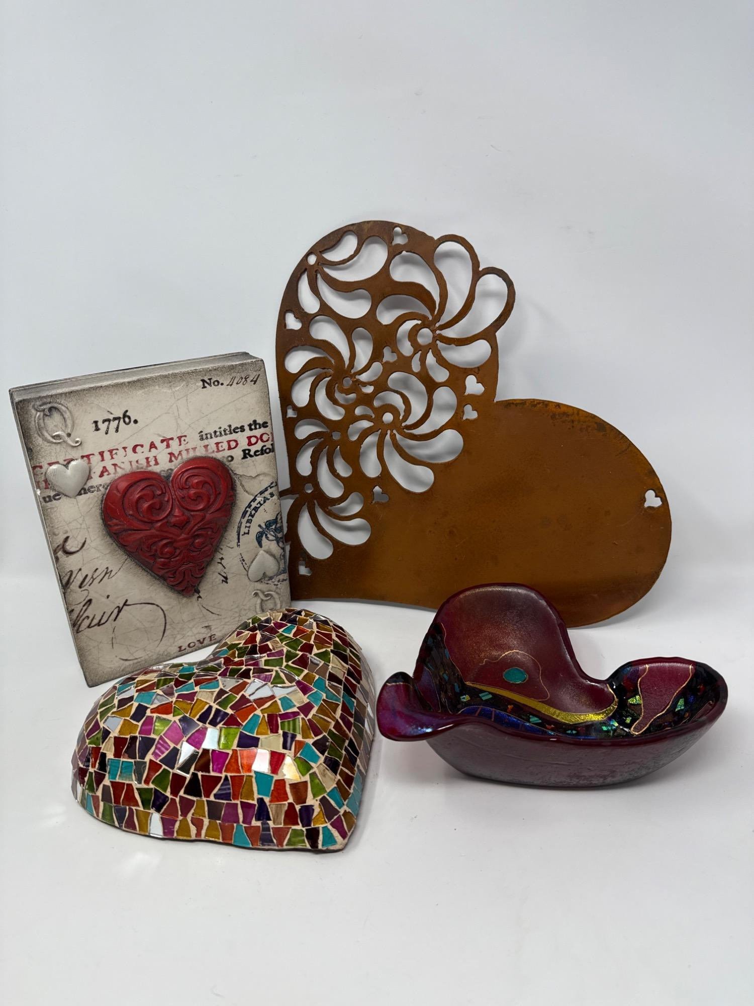 This 4-piece collection features a unique blend of materials, colors, and artistic expressions centered around heart-themed designs: Metal Heart Wall Art (Copper Color) – Measures 13" x 10". Features a swirling cutout design and rich rustic patina perfect for a warm, vintage touch. Sid Dickens Wall Hanging (T-488 “Imperial”) – Measures 8" x 6". This collectible memory block features a raised red heart with the inscription: Mosaic Heart Wall Hanging – Measures 8" x 7.5" x 2". A vibrant display of multi-colored glass tiles arranged in a mosaic heart pattern. Includes wall hook on the back for easy hanging. Art Glass Heart Bowl – Measures 7" x 7" x 3". A rich, deep burgundy with swirls of iridescent color and abstract accents. Artist-signed.