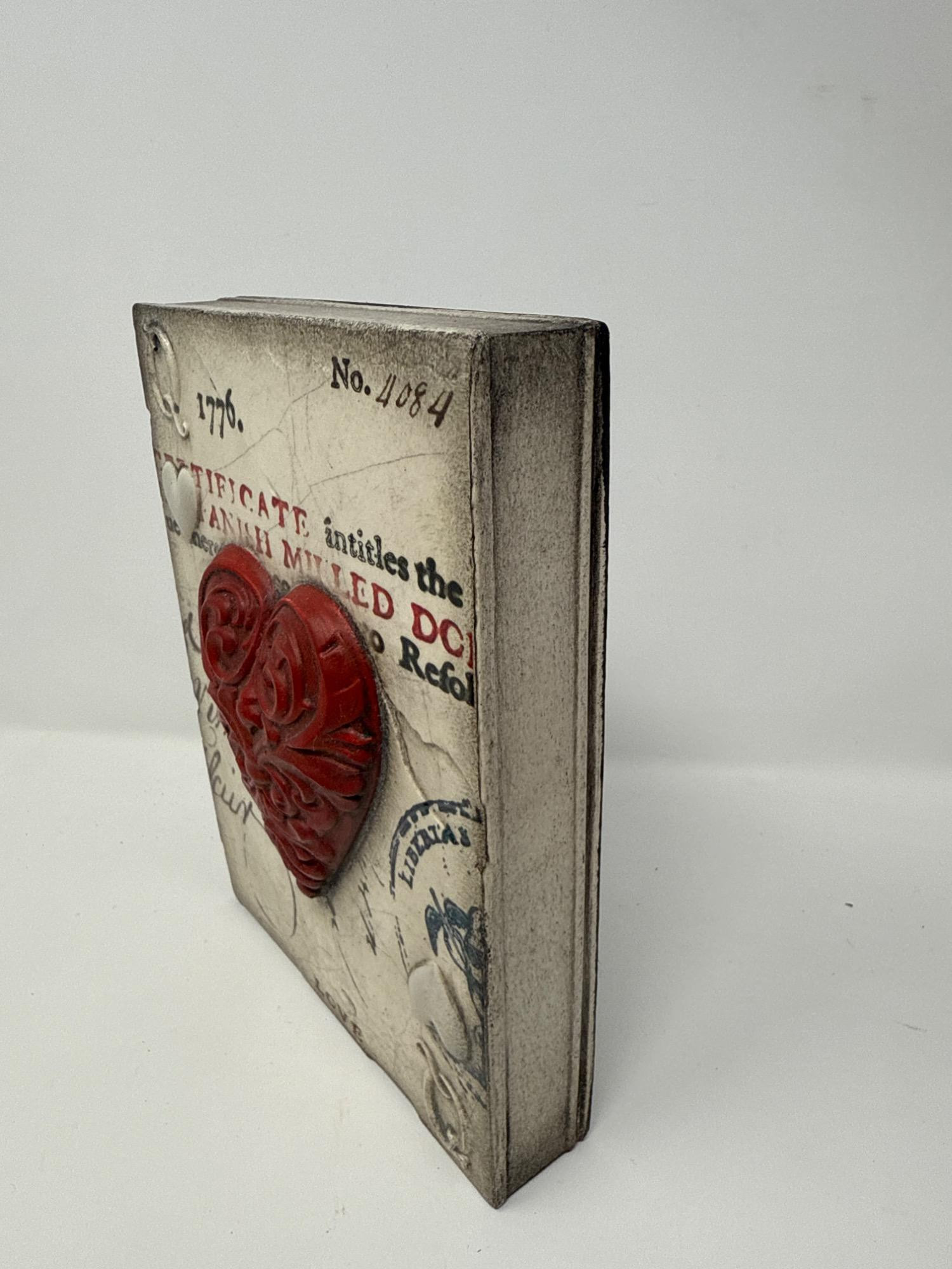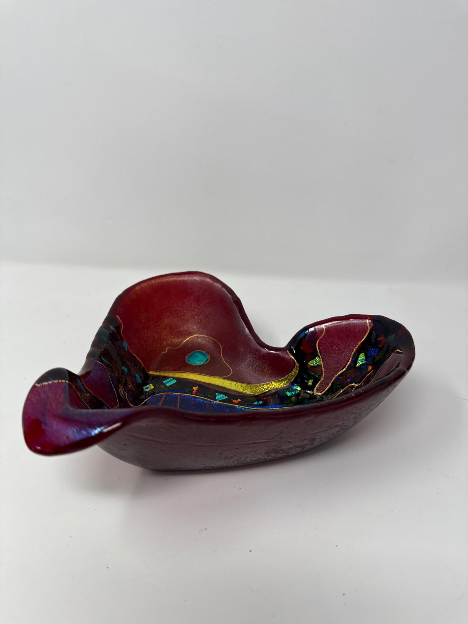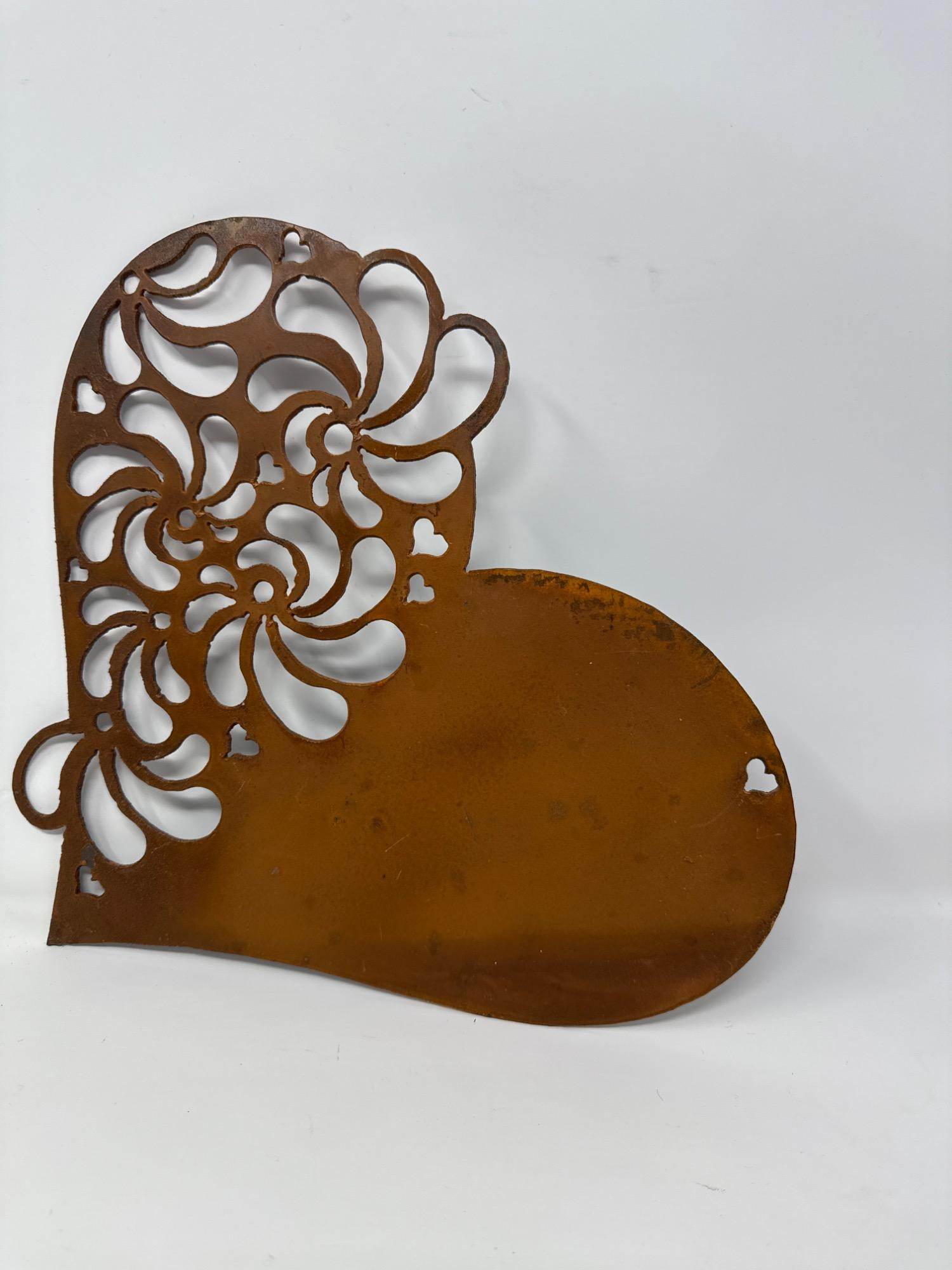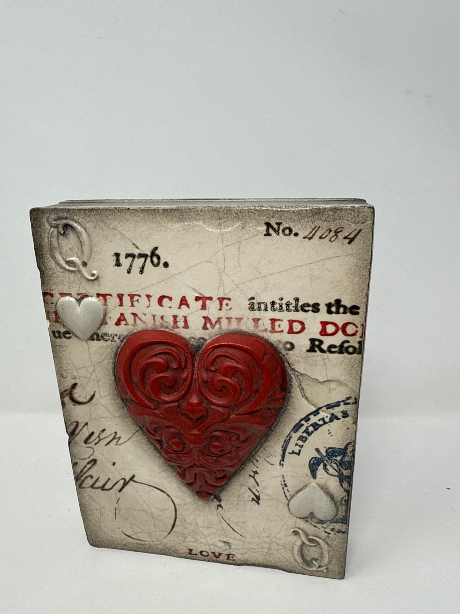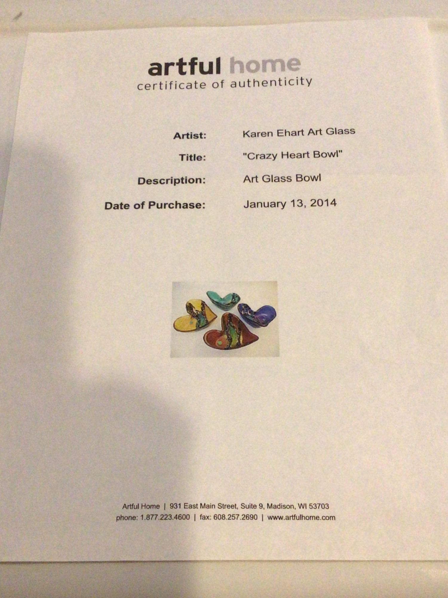 This 4-piece collection features a unique blend of materials, colors, and artistic expressions centered around heart-themed designs: Metal Heart Wall Art (Copper Color) – Measures 13" x 10". Features a swirling cutout design and rich rustic patina perfect for a warm, vintage touch. Sid Dickens Wall Hanging (T-488 “Imperial”) – Measures 8" x 6". This collectible memory block features a raised red heart with the inscription: Mosaic Heart Wall Hanging – Measures 8" x 7.5" x 2". A vibrant display of multi-colored glass tiles arranged in a mosaic heart pattern. Includes wall hook on the back for easy hanging. Art Glass Heart Bowl – Measures 7" x 7" x 3". A rich, deep burgundy with swirls of iridescent color and abstract accents. Artist-signed.