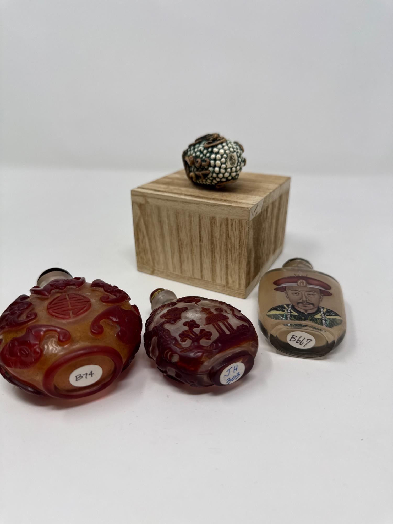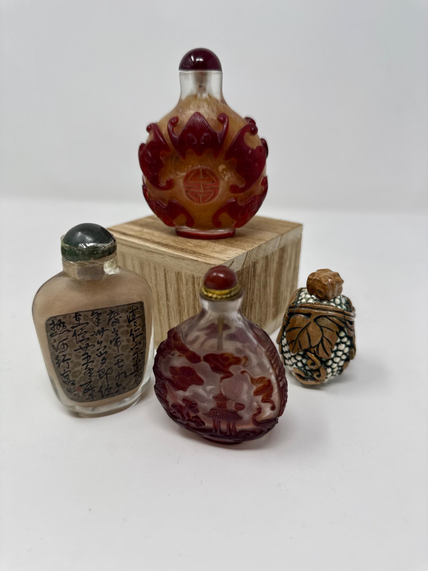 Touch of timeless elegance for your collection with this exquisite set of four vintage Chinese snuff bottles. Each bottle showcases intricate artistry, reflecting traditional Chinese craftsmanship: Carved Overlay Glass Bottles (2 pcs) – Beautiful red overlay designs on frosted glass, featuring traditional symbols, mythical creatures, and nature scenes. One includes a gold-toned collar and fitted lid. Inside-Painted Bottle (1 pc) – Meticulously painted from the inside with Chinese calligraphy on one side and a Qing Dynasty portrait on the other. Topped with a domed dark stone stopper. Textured Ceramic Bottle (1 pc) – Uniquely sculpted with a grape-cluster design, finished in earthy green and brown tones with raised vines and leaf detail. Measurements: 2 and 3.5 inches tall