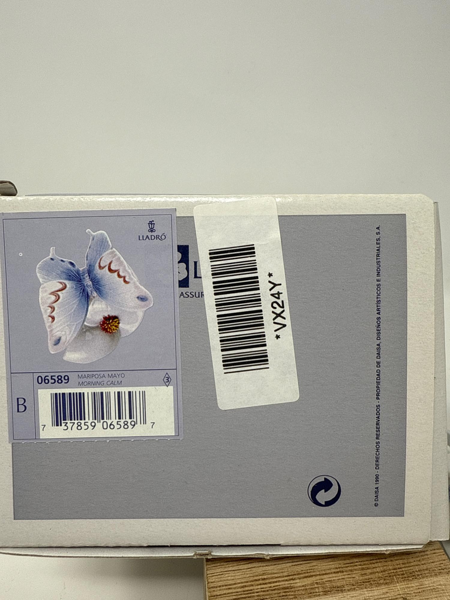 This is a handcrafted porcelain figurine by Lladró, titled "Mariposa Mayo – Morning Calm." It features a butterfly with soft blue and lavender tones, perched on a delicate white flower with a detailed yellow and red center. Item Number: 06589 Title: Mariposa Mayo – Morning Calm Brand: Lladró Material: Fine porcelain Finish: Glossy Made in: Spain Markings: Lladró stamp (V-24Y), model number, and “Hand Made in Spain” Box Label Code: VX24Y Includes: Original box and information leaflet