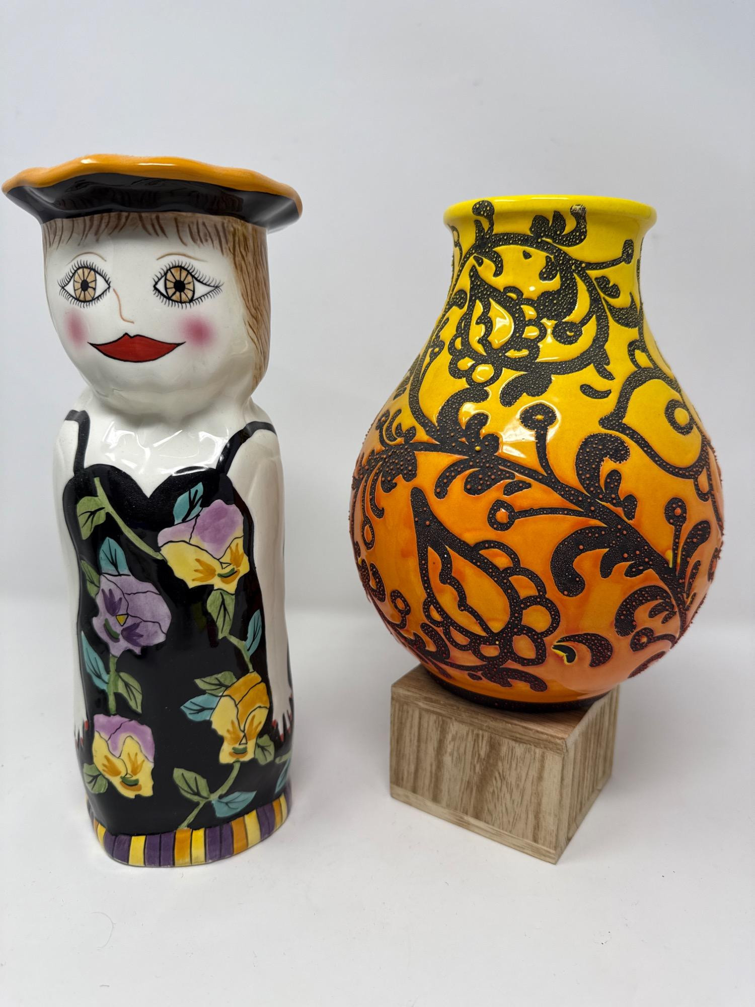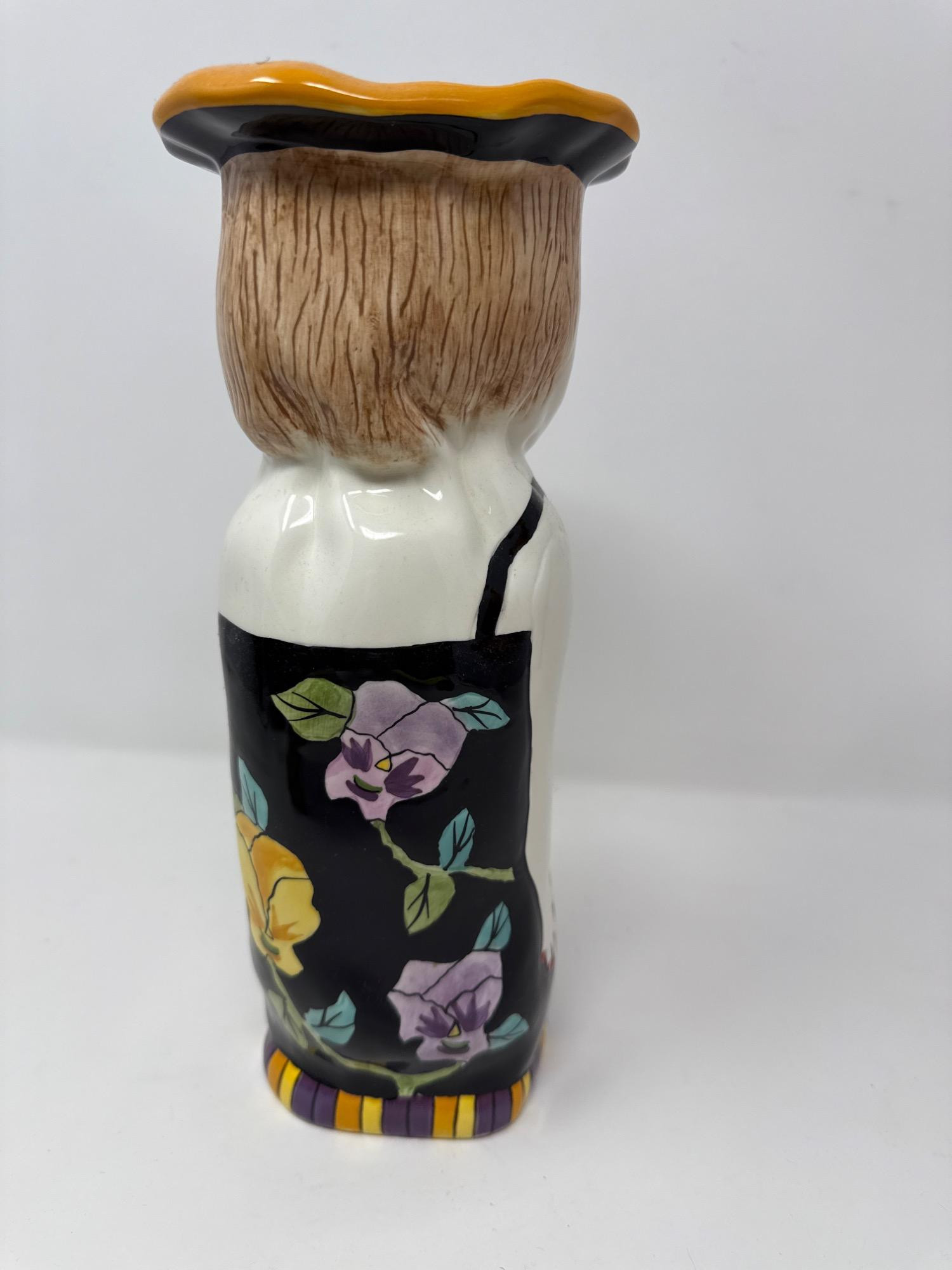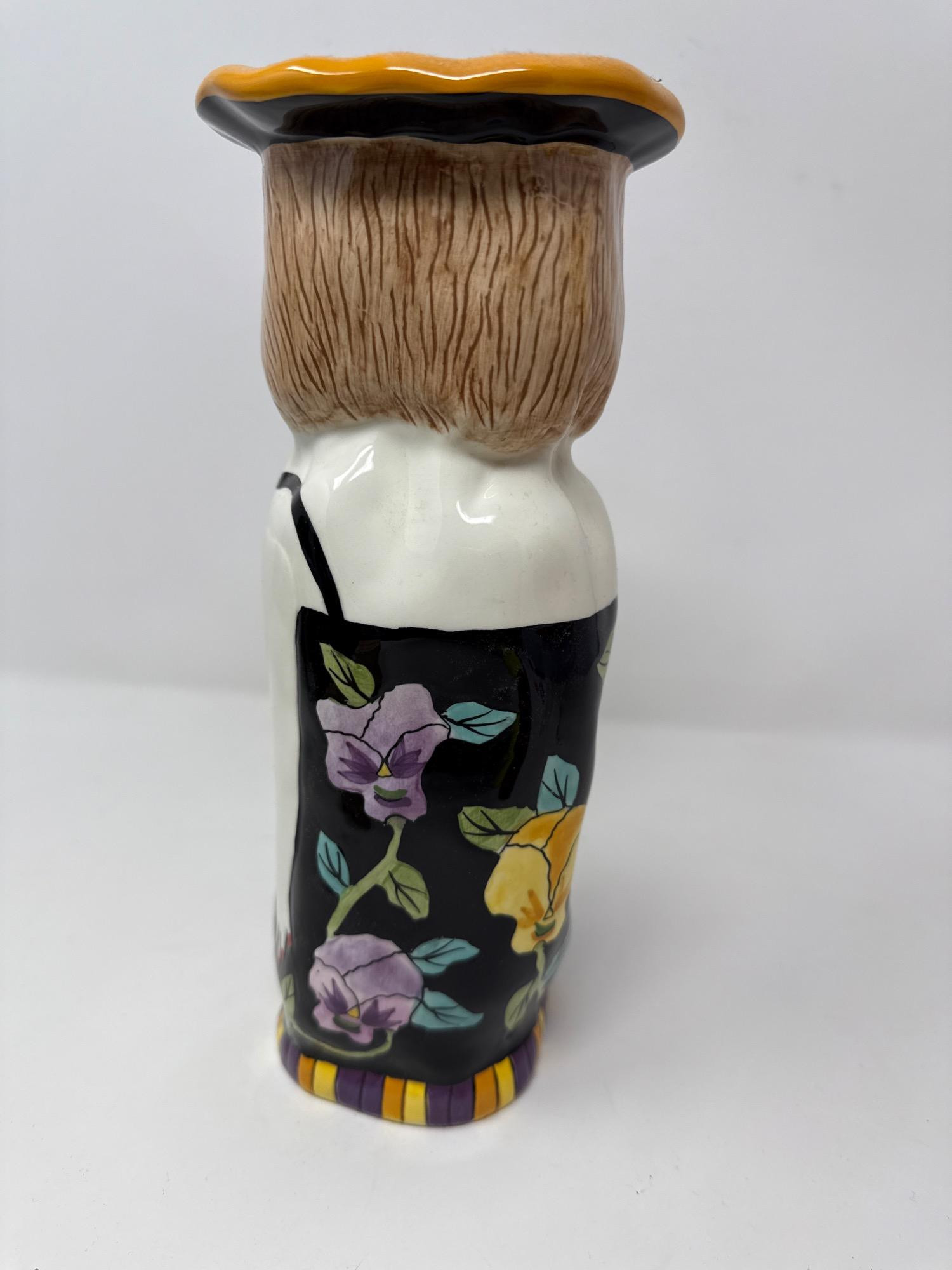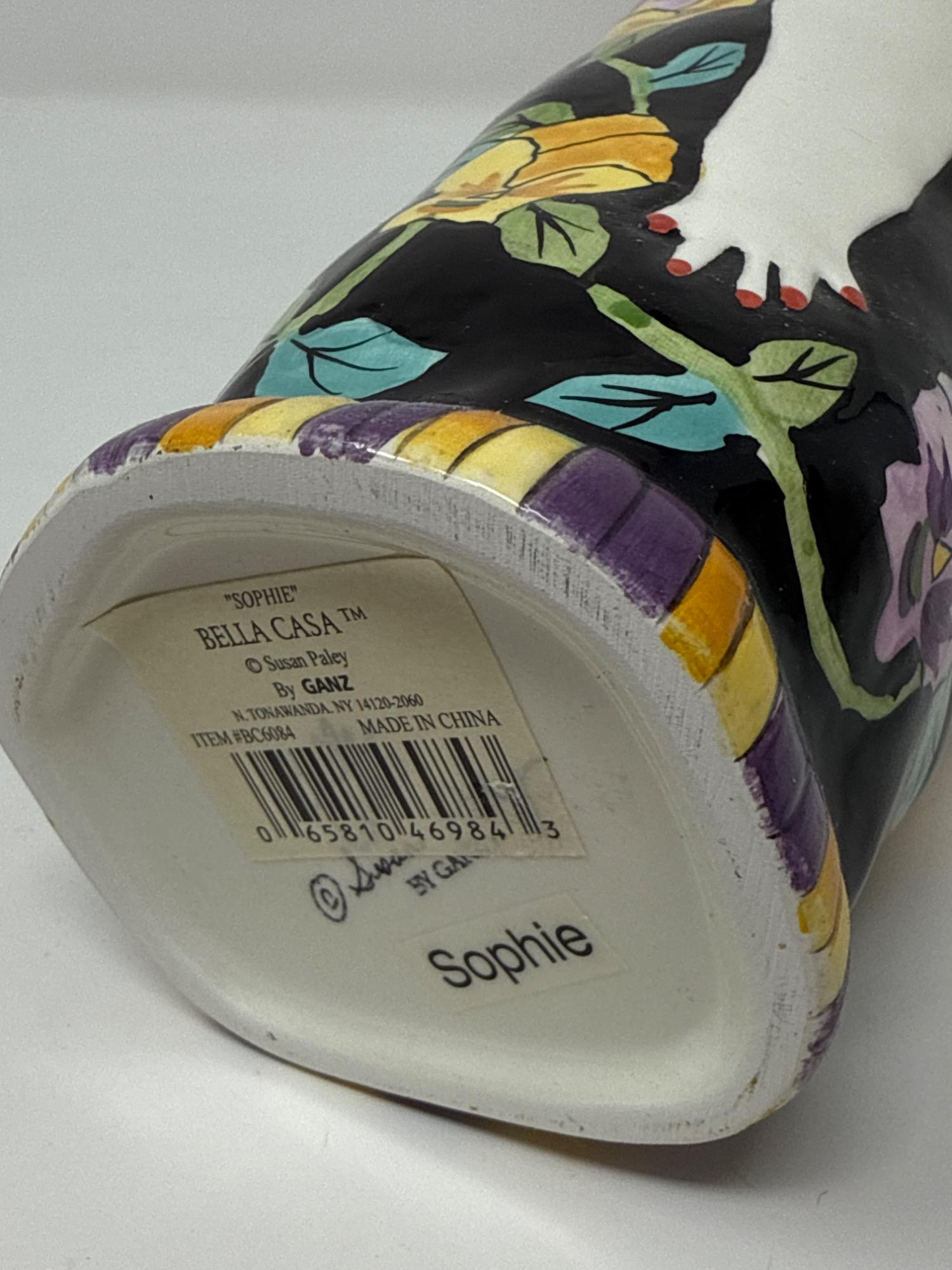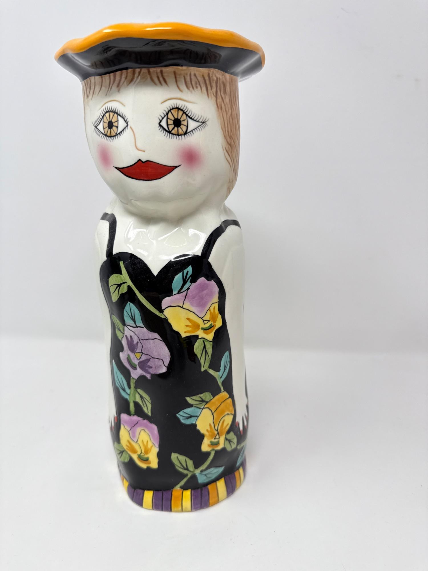 This whimsical ceramic vase designed by Susan Paley for Bella Casa (Ganz) brings an artistic and playful flair. “Sophie” is adorned in a floral dress and wears a cheerful smile, with hand-painted details that give her an irresistible charm. Made in China. Measurements: 10" x 4”