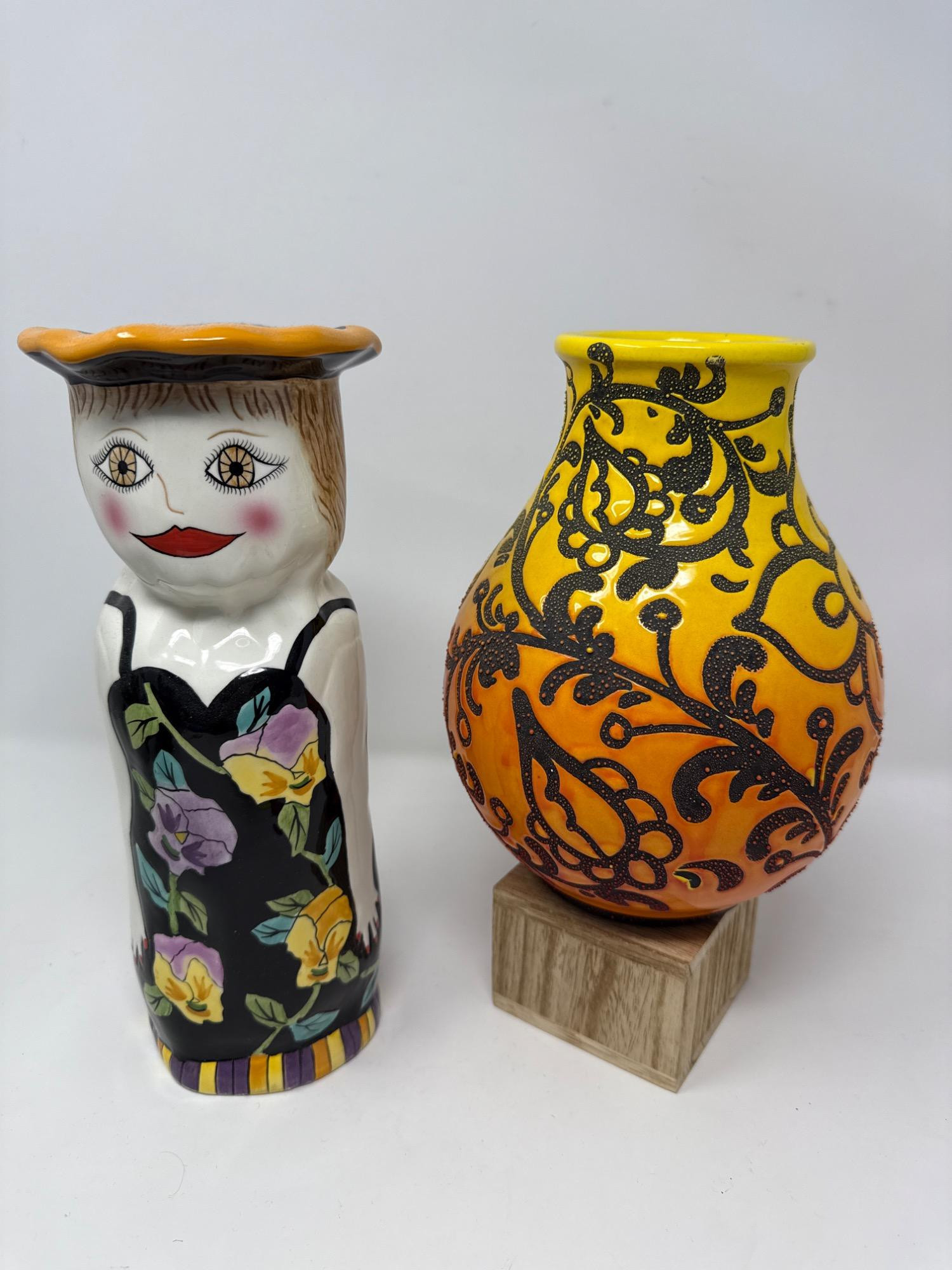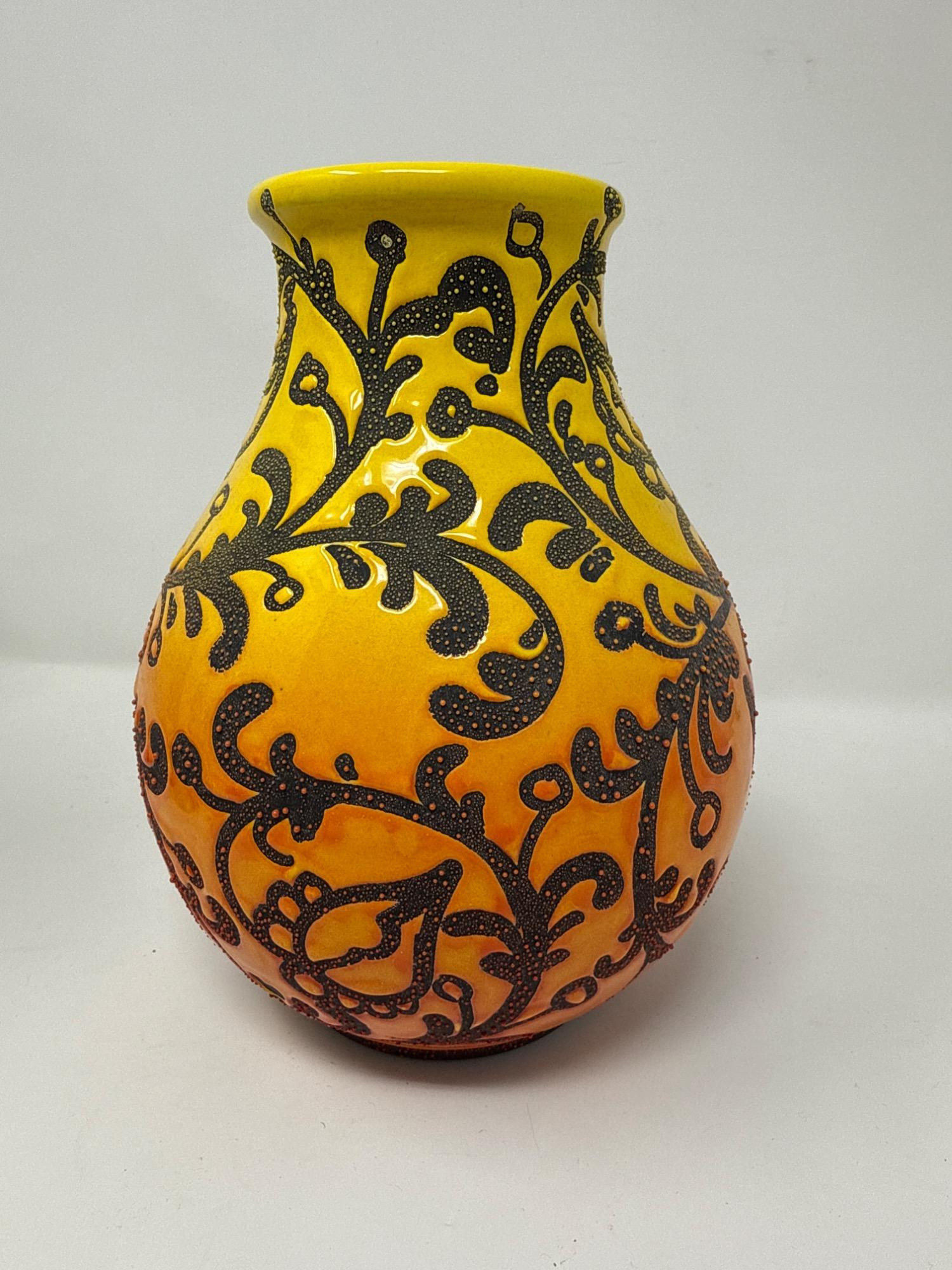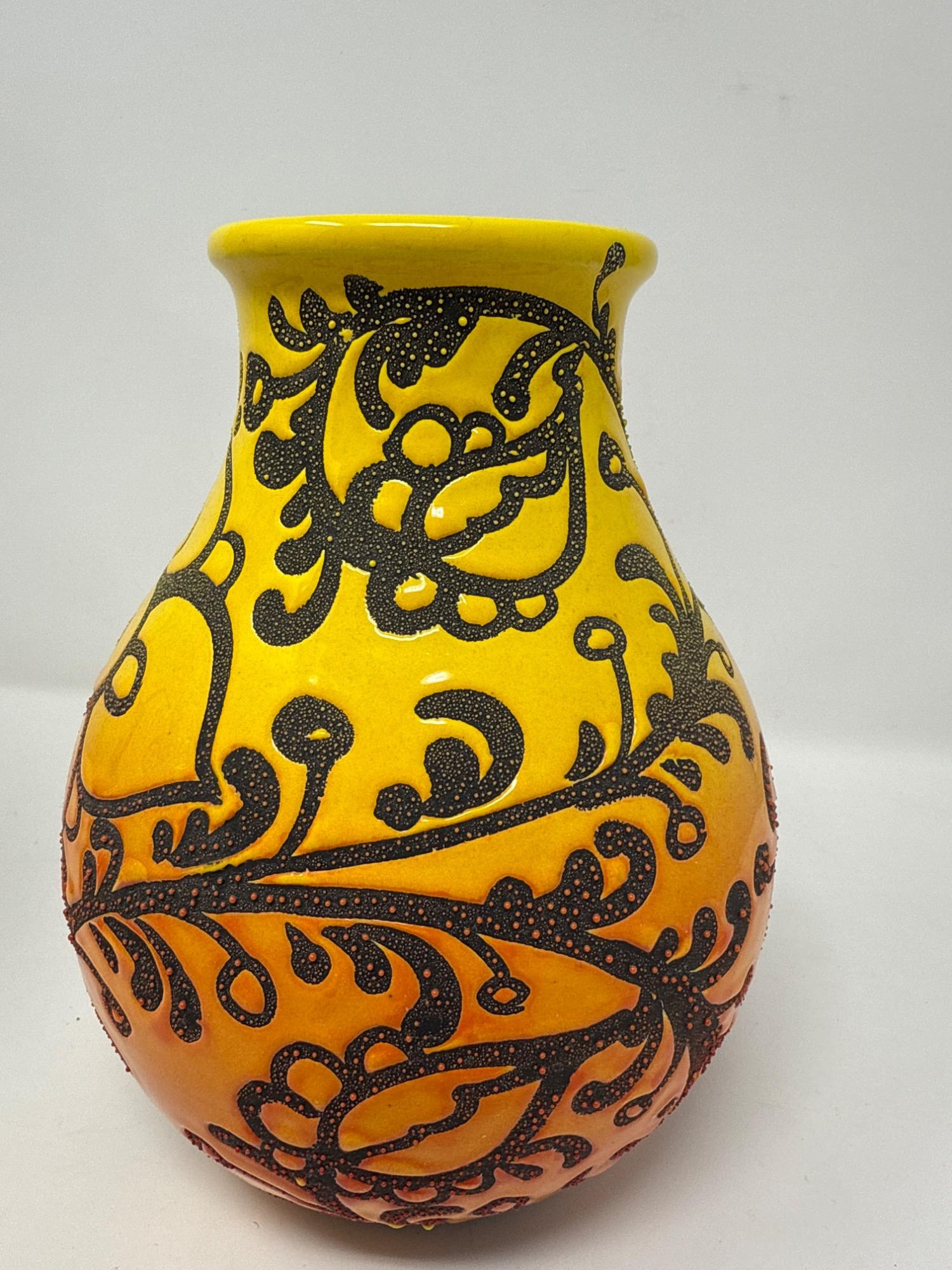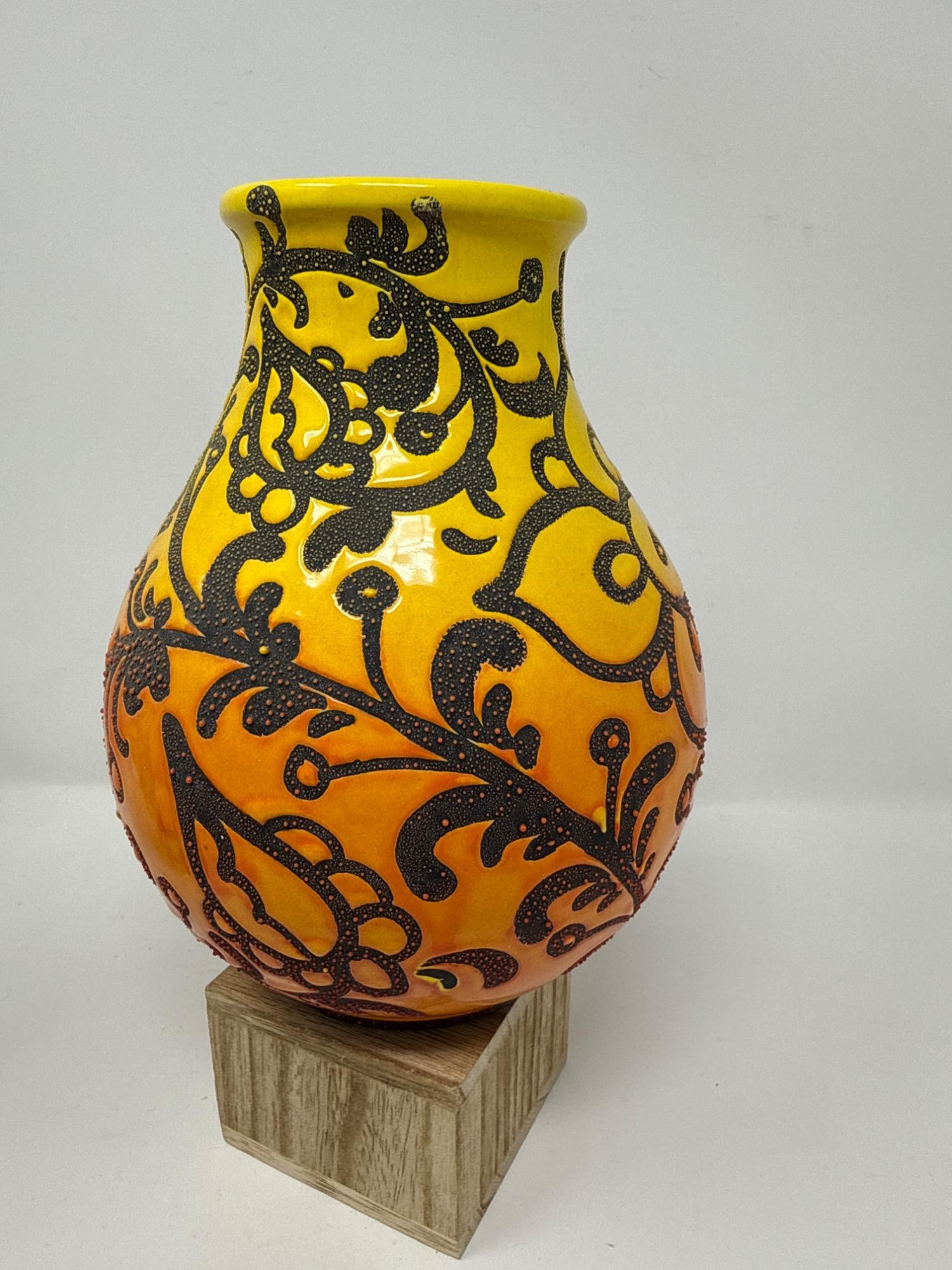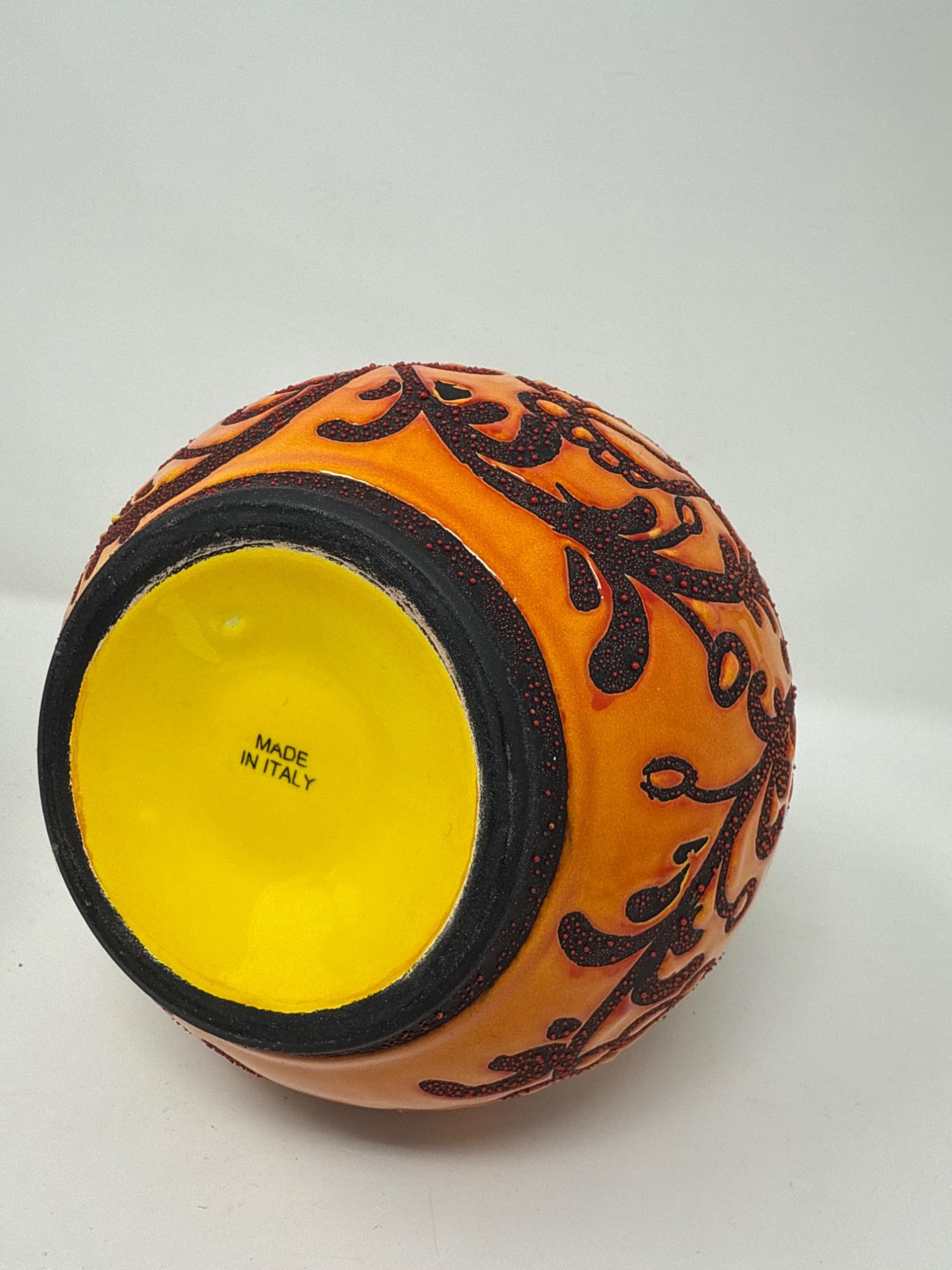 This vase features a stunning swirl pattern in vivid yellow and orange, accented with intricate black raised floral scrollwork. It’s a bold, eye-catching piece. Made in Italy. Measurements: 8" x 5”