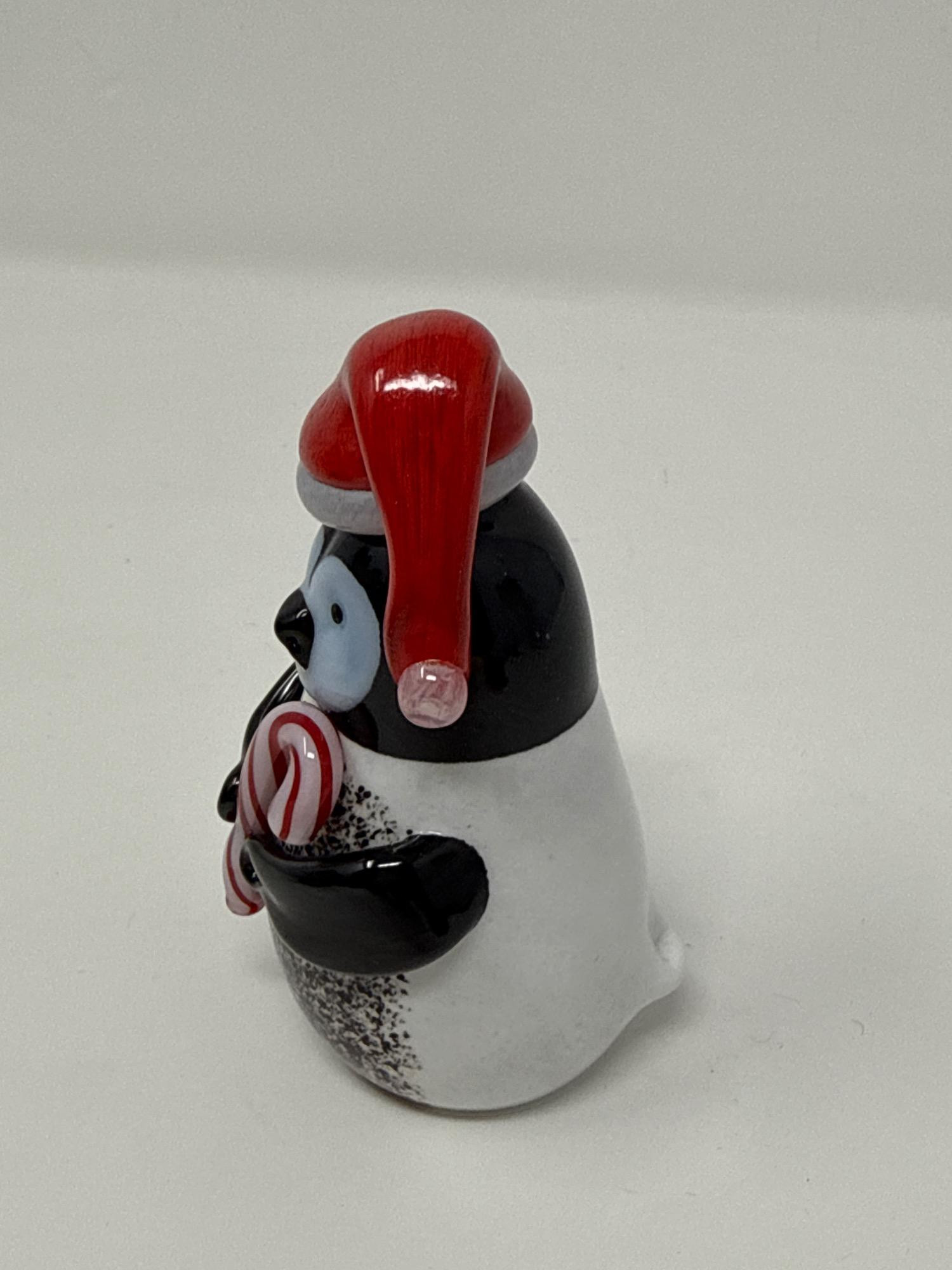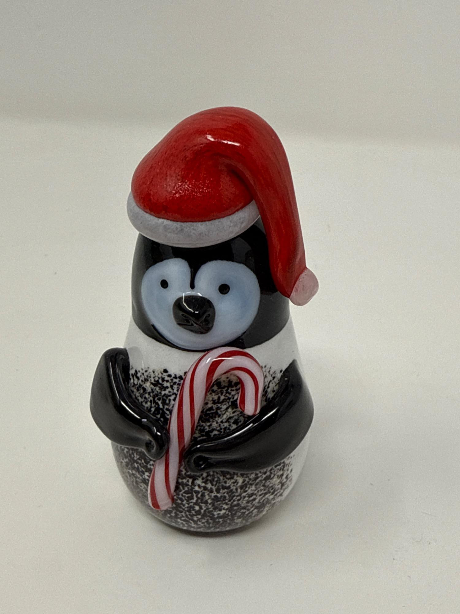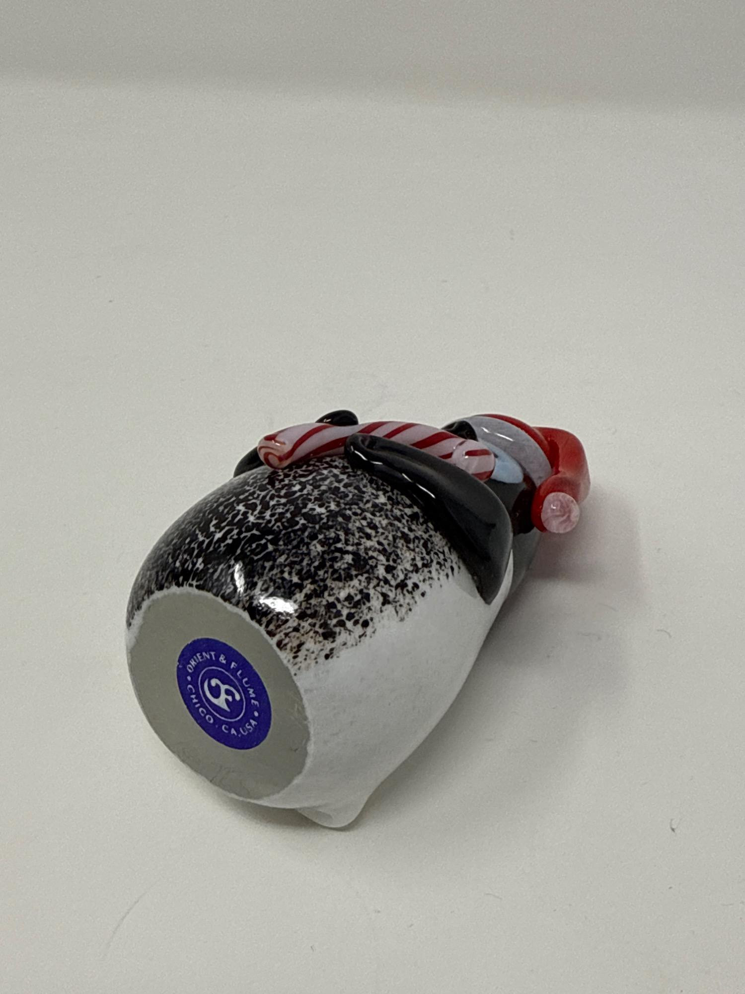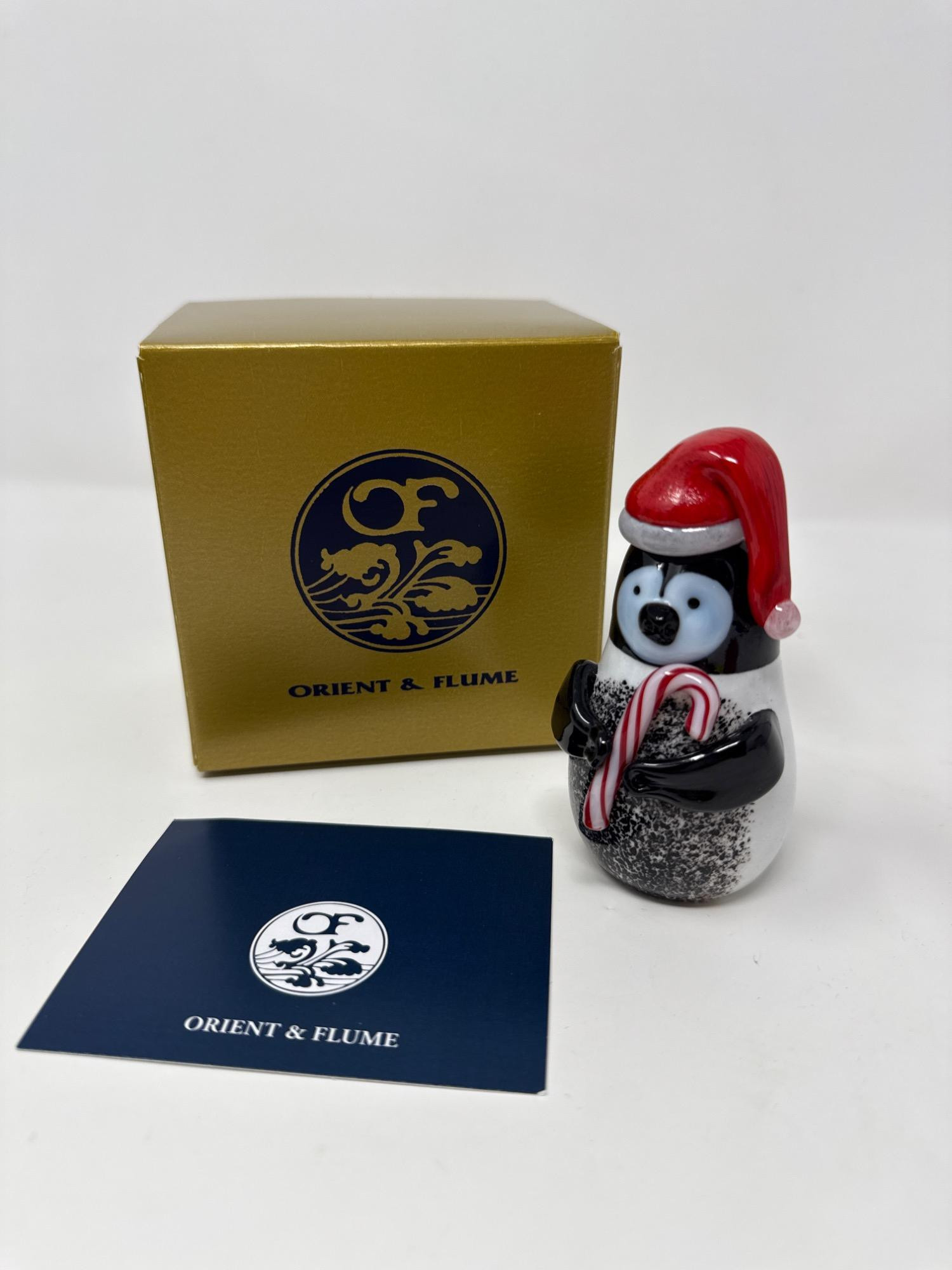 Bring joy and charm to your holiday décor with this delightful hand-crafted penguin figurine by Orient & Flume. Beautifully detailed with a festive red Santa hat and a candy cane. Crafted with precision and artistry, it showcases the signature quality of Orient & Flume glassworks. The penguin's charming features and rich coloring bring personality and warmth. The figurine comes with its original Orient & Flume branded box and paperwork, ensuring authenticity and ease of gifting or storage. Item Details: Maker: Orient & Flume Measurement: 3.5 inches Origin: Chico, California, USA