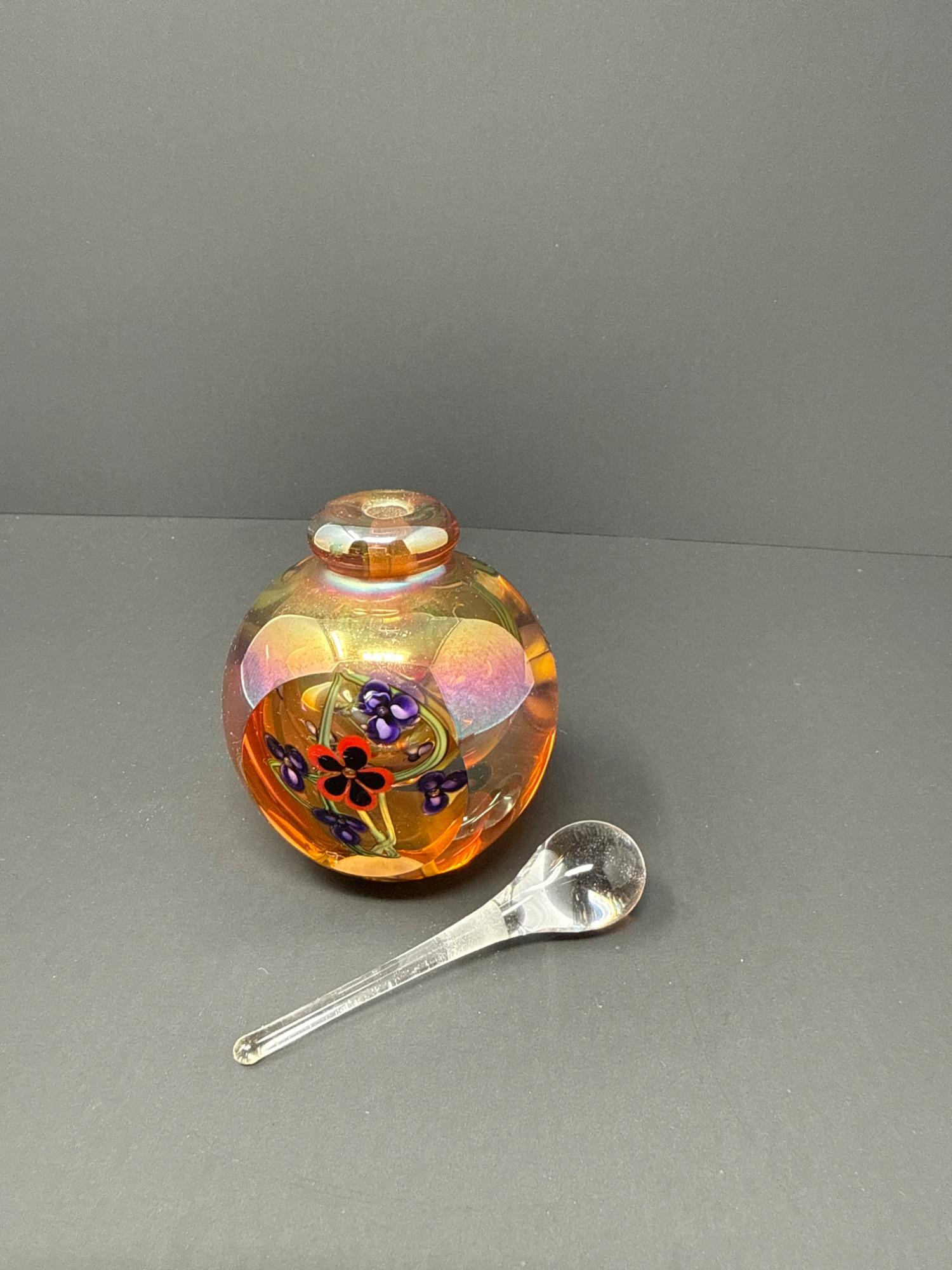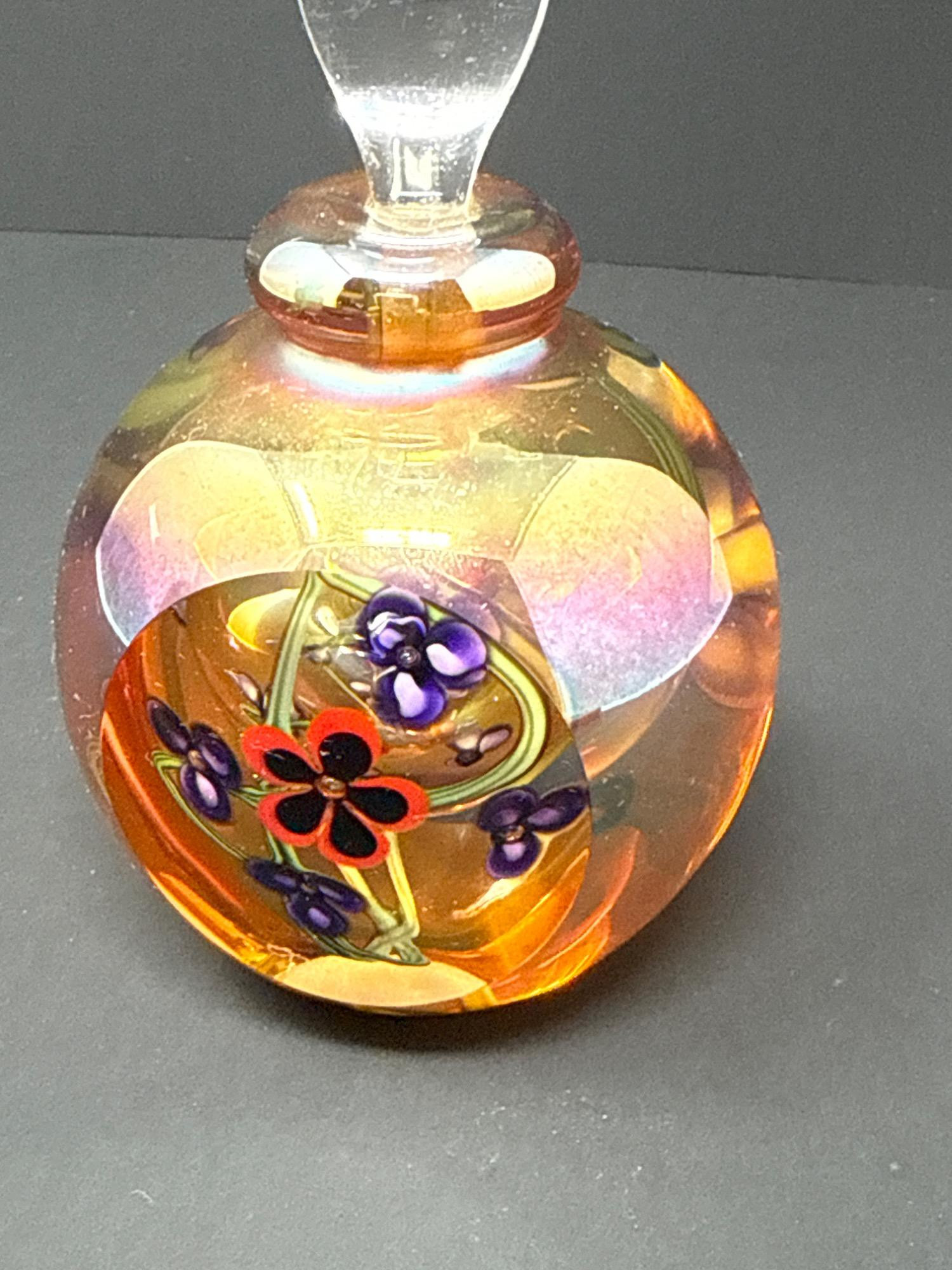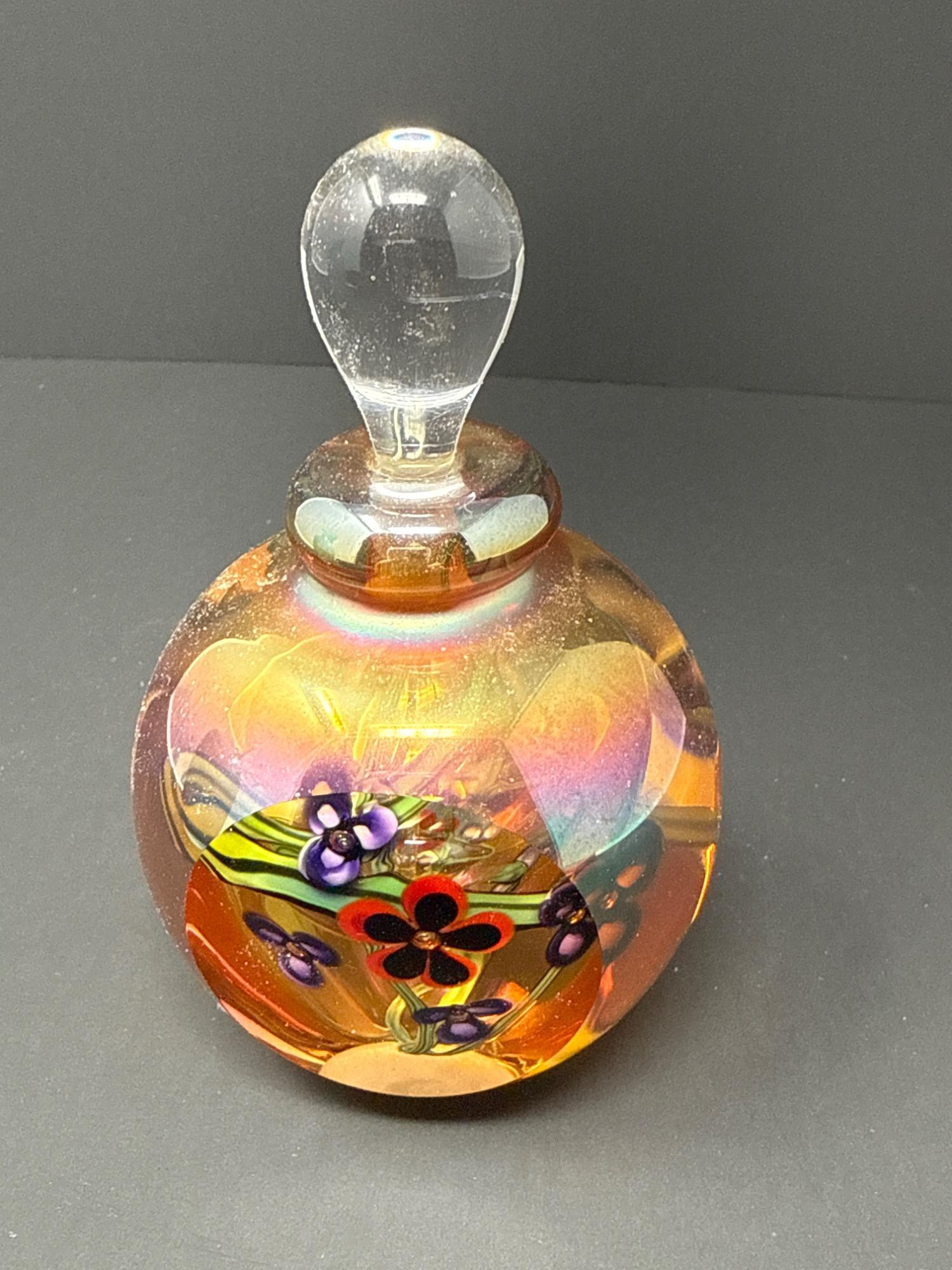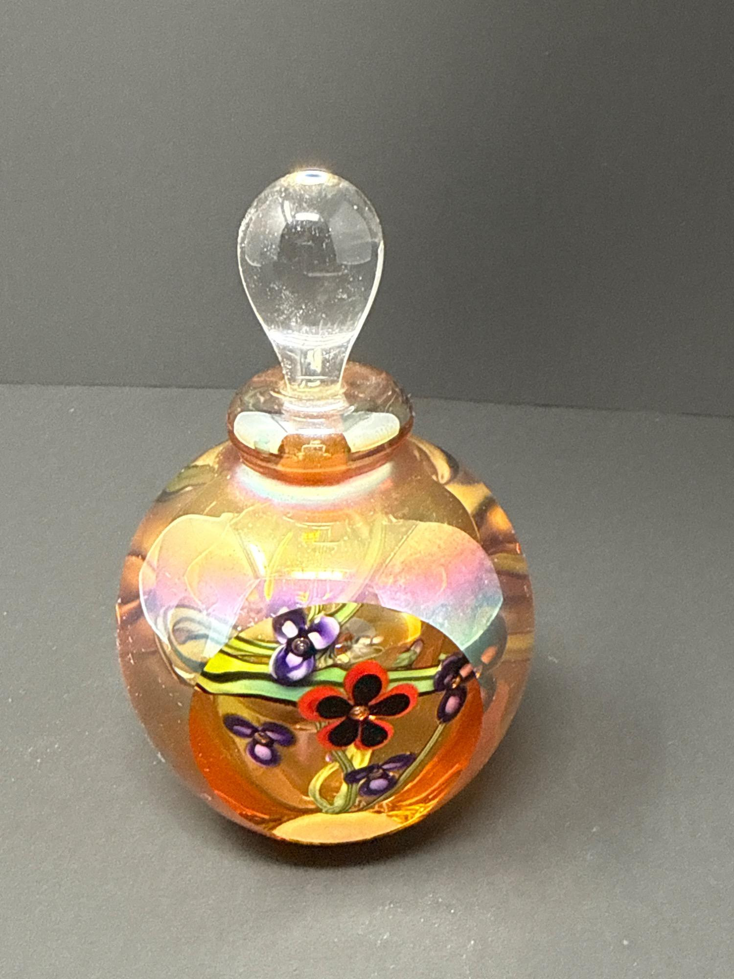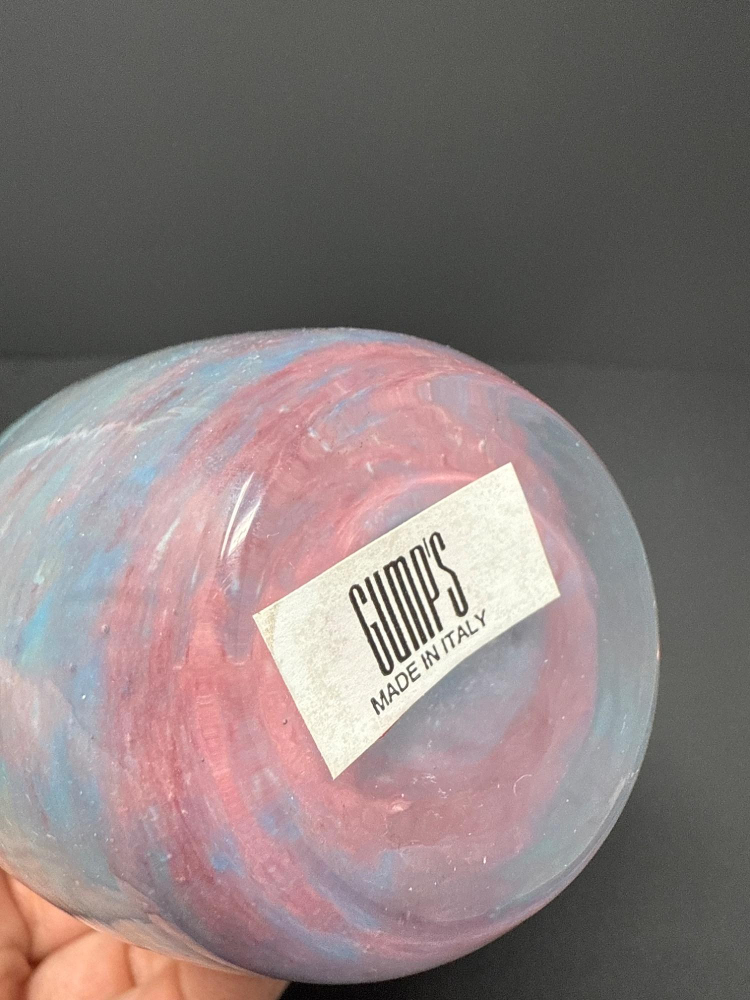 This lovely duo features: Italian Art Glass Vase from Gump’s Handcrafted in Italy with beautiful swirls of blue, lavender, and pink hues Original Gump’s label still intact on the base Measurering 5.5 inches tall and 3 inches wide Elegant and collectible piece with a soft, cloudy finish Handblown Signed Art Glass Perfume Bottle Vivid, iridescent colors with embedded floral millefiori-style designs Signed on the base (see photo for detail) Measuring 4.5 inches tall (including stopper) and 2.25 inches wide