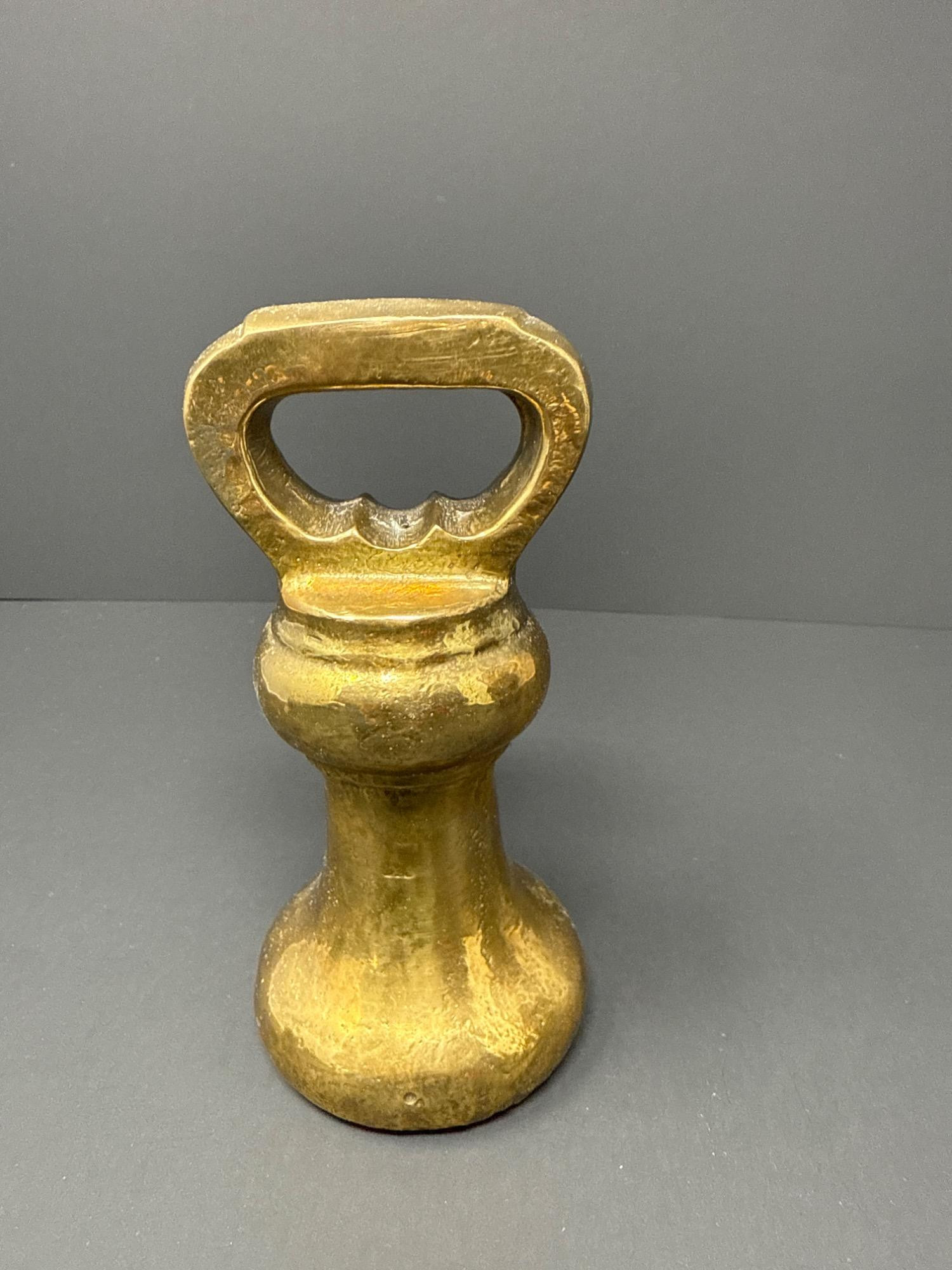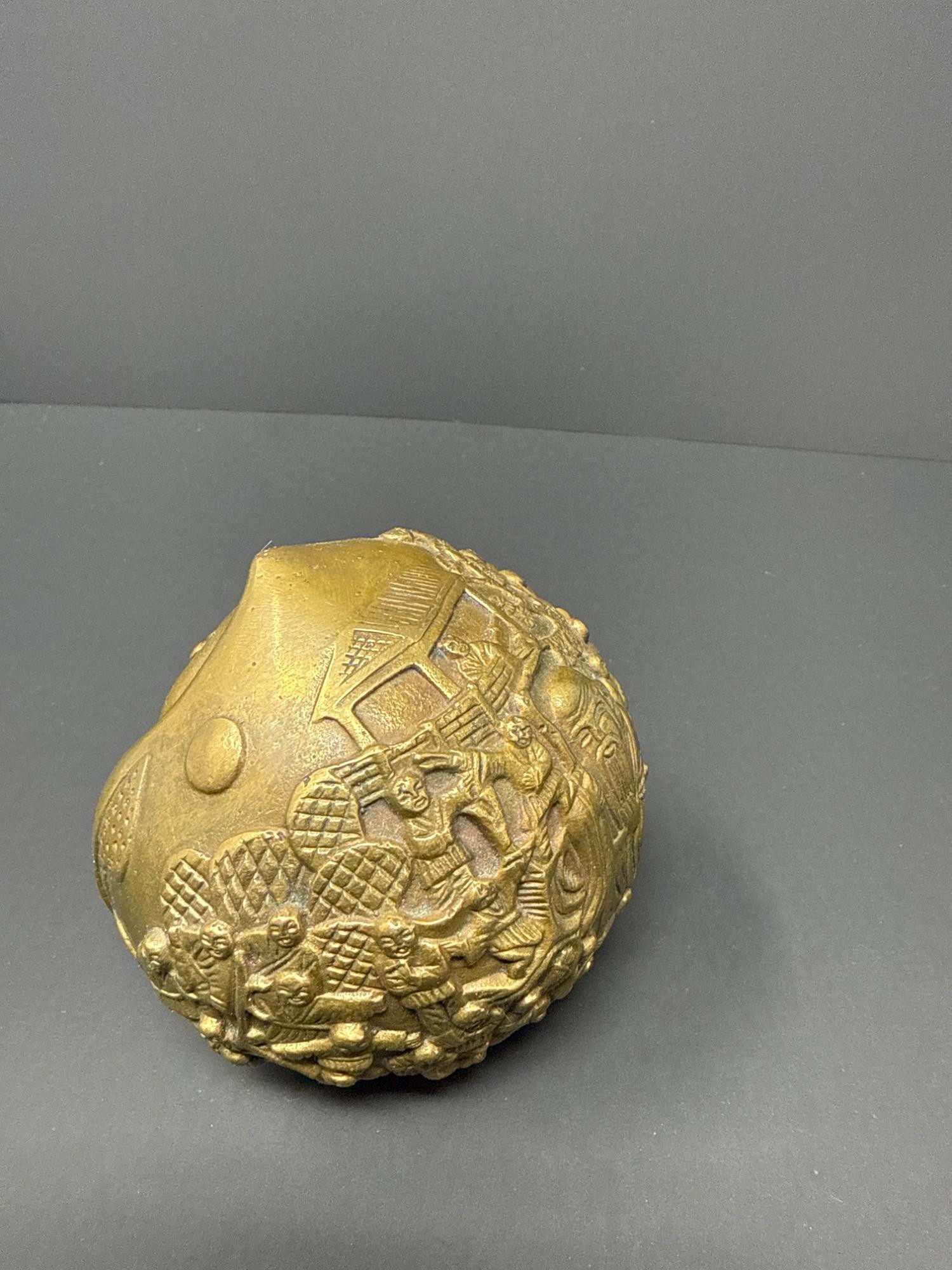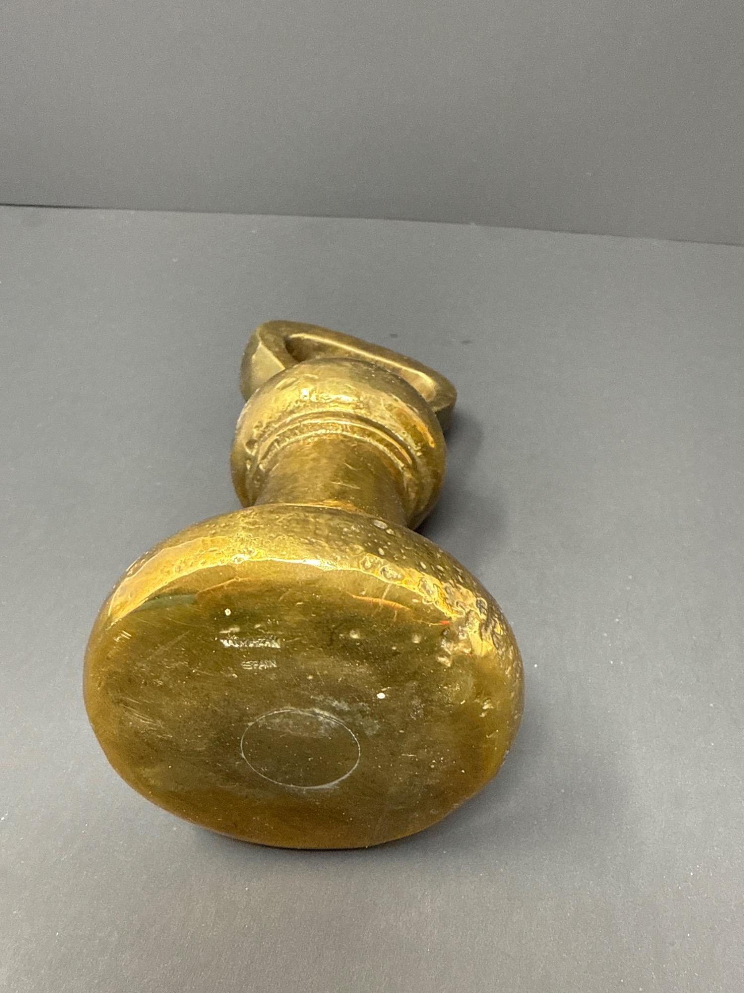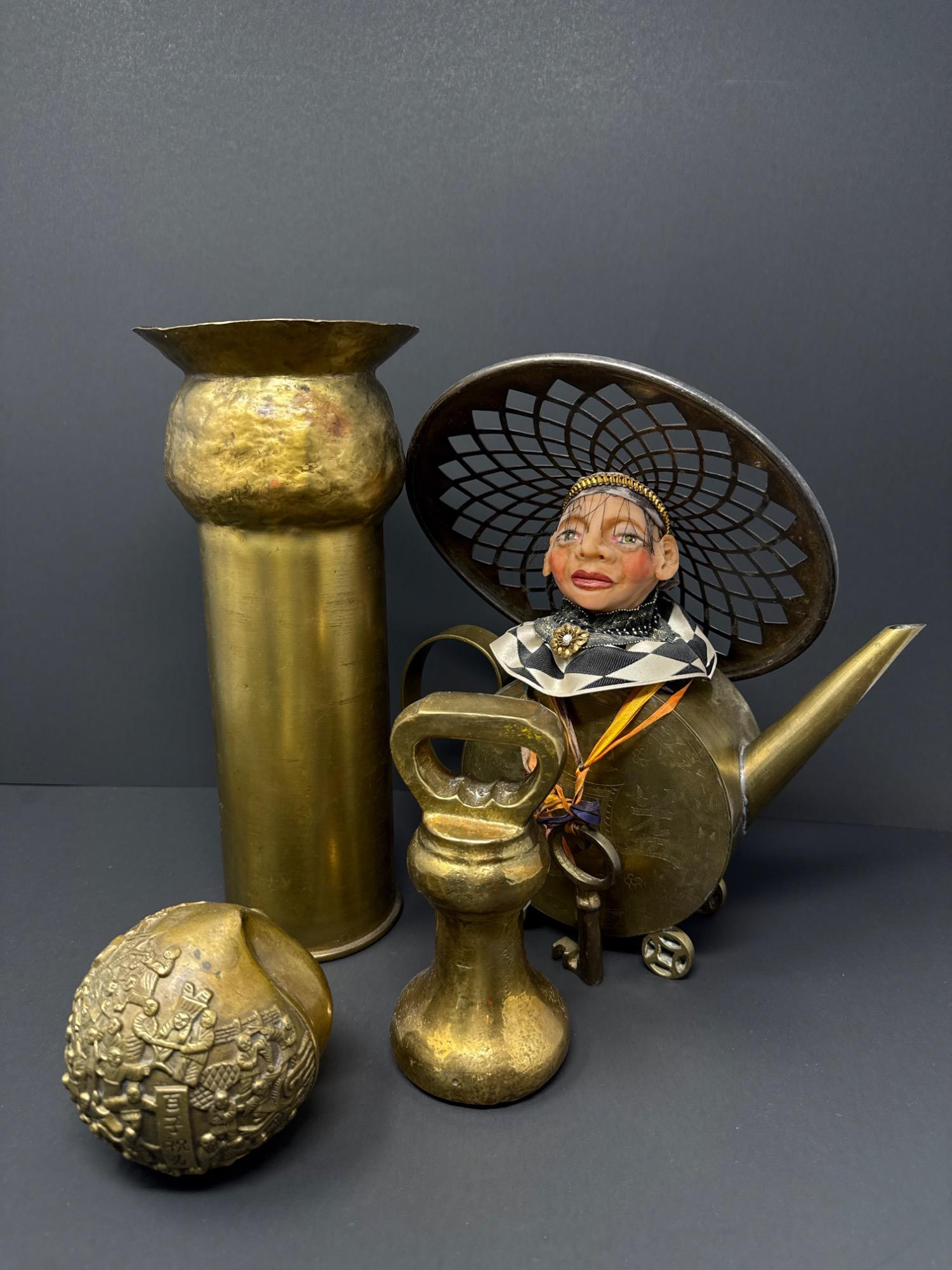 A charming and diverse collection of vintage brass items, including: WWI Trench Art Vase – Repurposed from a 1916 artillery shell casing, featuring beautifully hand-hammered details. Measuring 10.5” H x 5.5” W Solid Brass Grocer’s Weight – Heavy 5.5" tall and 7lb weight with classic handled design. Marked “Warranted / Staffs” on base. Bronze Buddha Paperweight – Ornately detailed with raised relief figures and cultural motifs. Measuring 3.5” diameter. Decorative Brass Kettle – A whimsical piece adorned with a jester/clown head and ribbon collar. Sits on four small wheels and features engraved Asian characters on the body (symbolizing “longevity” and “prosperity”). Topped with an intricate lattice-like dish as a headpiece. Measuring 10” H x 18” W Bonus Items – Includes an oversized vintage key and additional small brass accents.