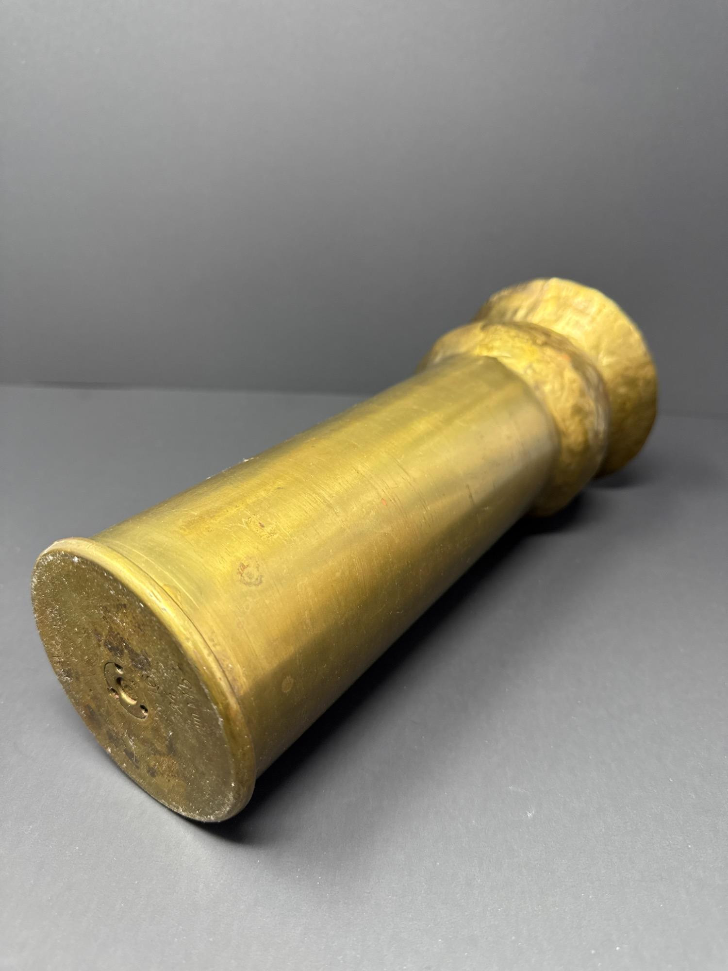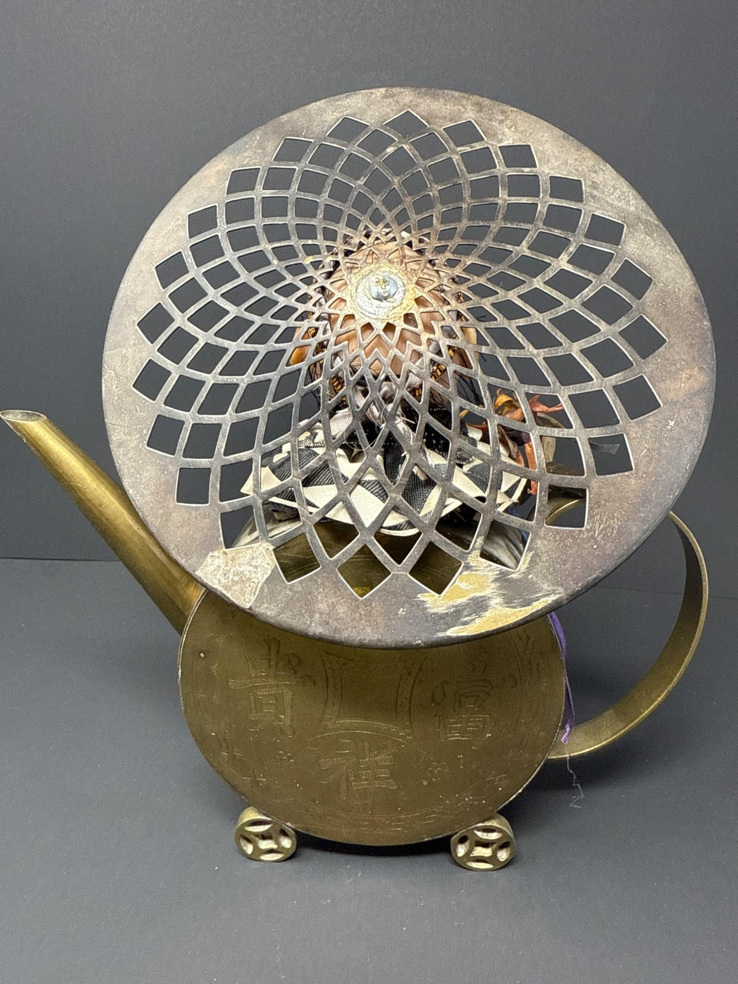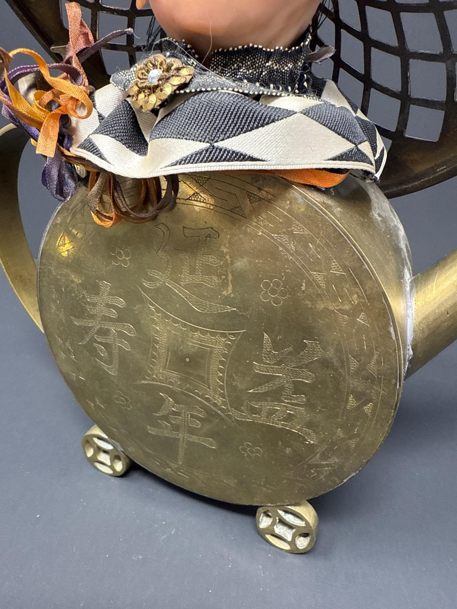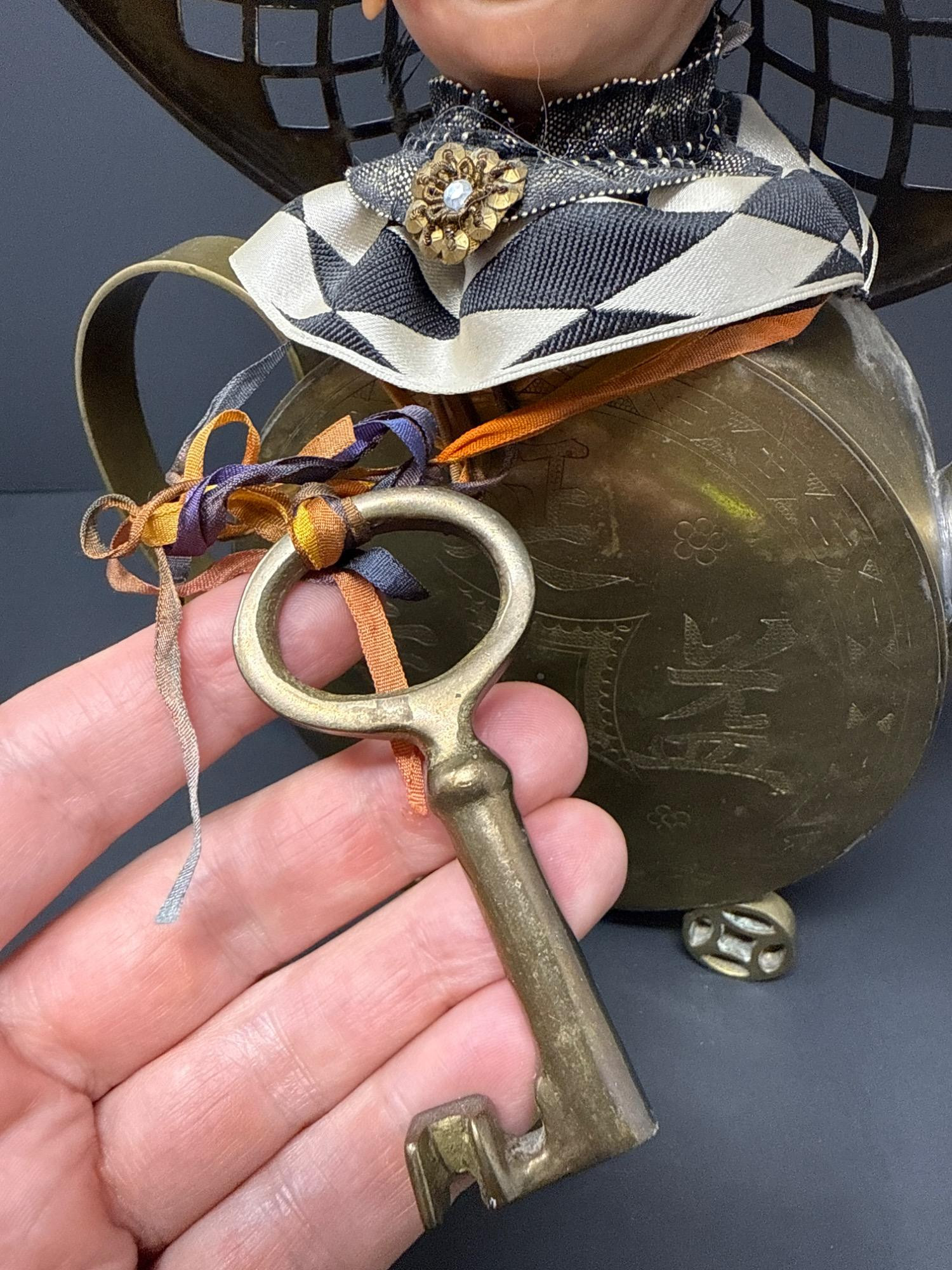 A charming and diverse collection of vintage brass items, including: WWI Trench Art Vase – Repurposed from a 1916 artillery shell casing, featuring beautifully hand-hammered details. Measuring 10.5” H x 5.5” W Solid Brass Grocer’s Weight – Heavy 5.5" tall and 7lb weight with classic handled design. Marked “Warranted / Staffs” on base. Bronze Buddha Paperweight – Ornately detailed with raised relief figures and cultural motifs. Measuring 3.5” diameter. Decorative Brass Kettle – A whimsical piece adorned with a jester/clown head and ribbon collar. Sits on four small wheels and features engraved Asian characters on the body (symbolizing “longevity” and “prosperity”). Topped with an intricate lattice-like dish as a headpiece. Measuring 10” H x 18” W Bonus Items – Includes an oversized vintage key and additional small brass accents.
