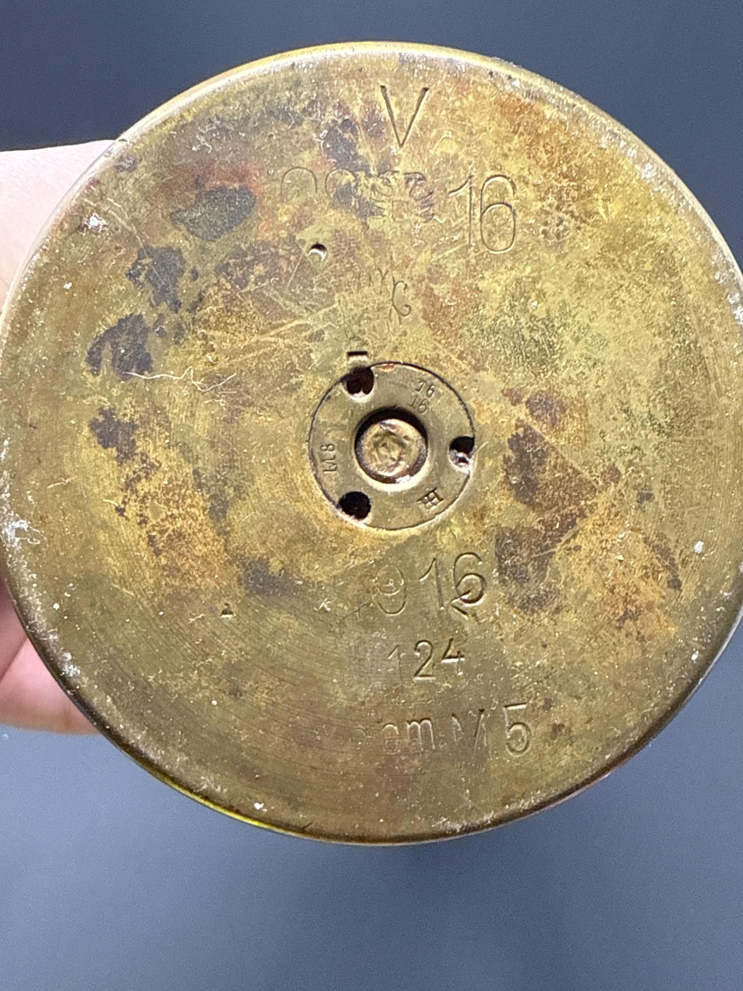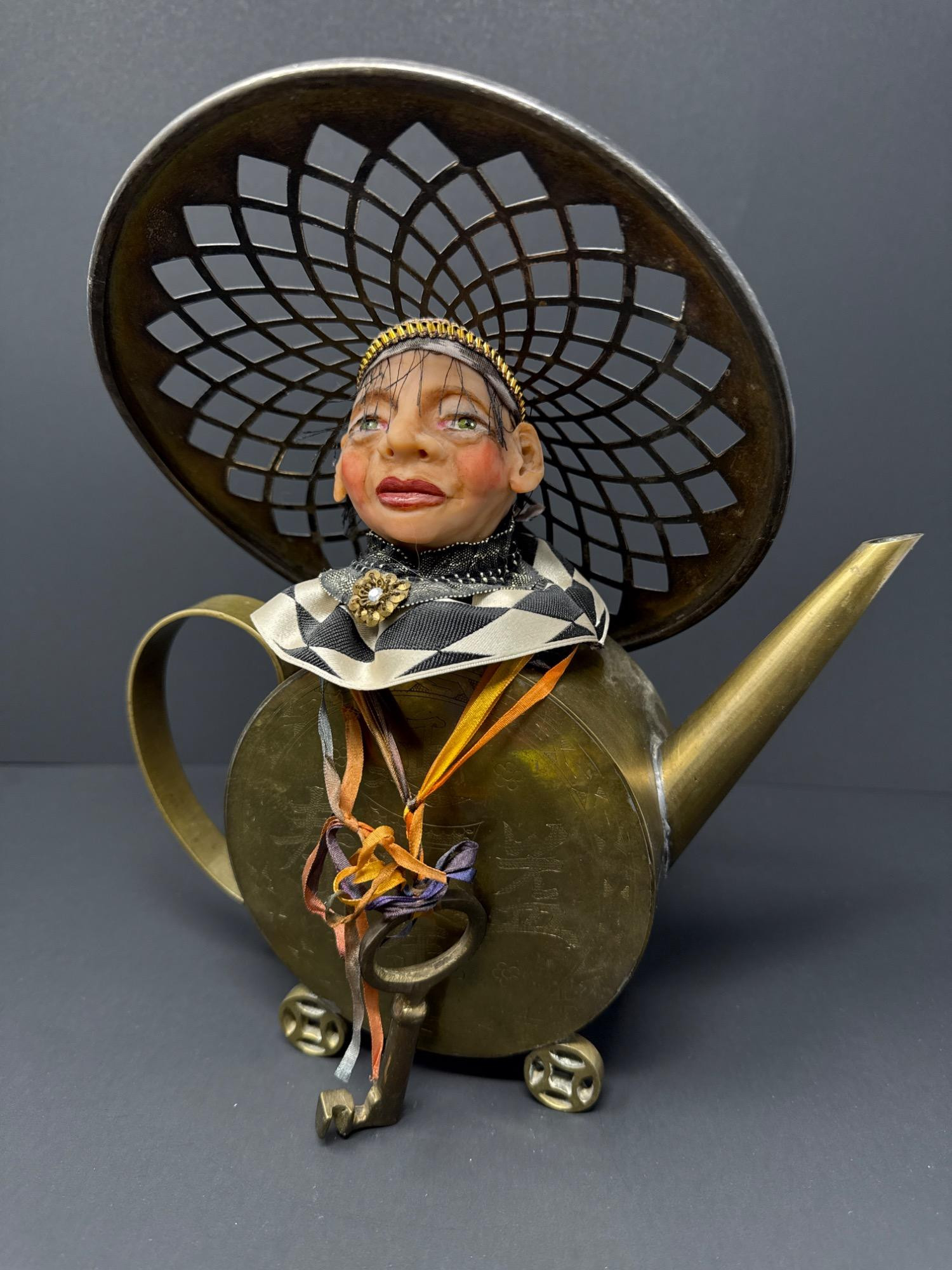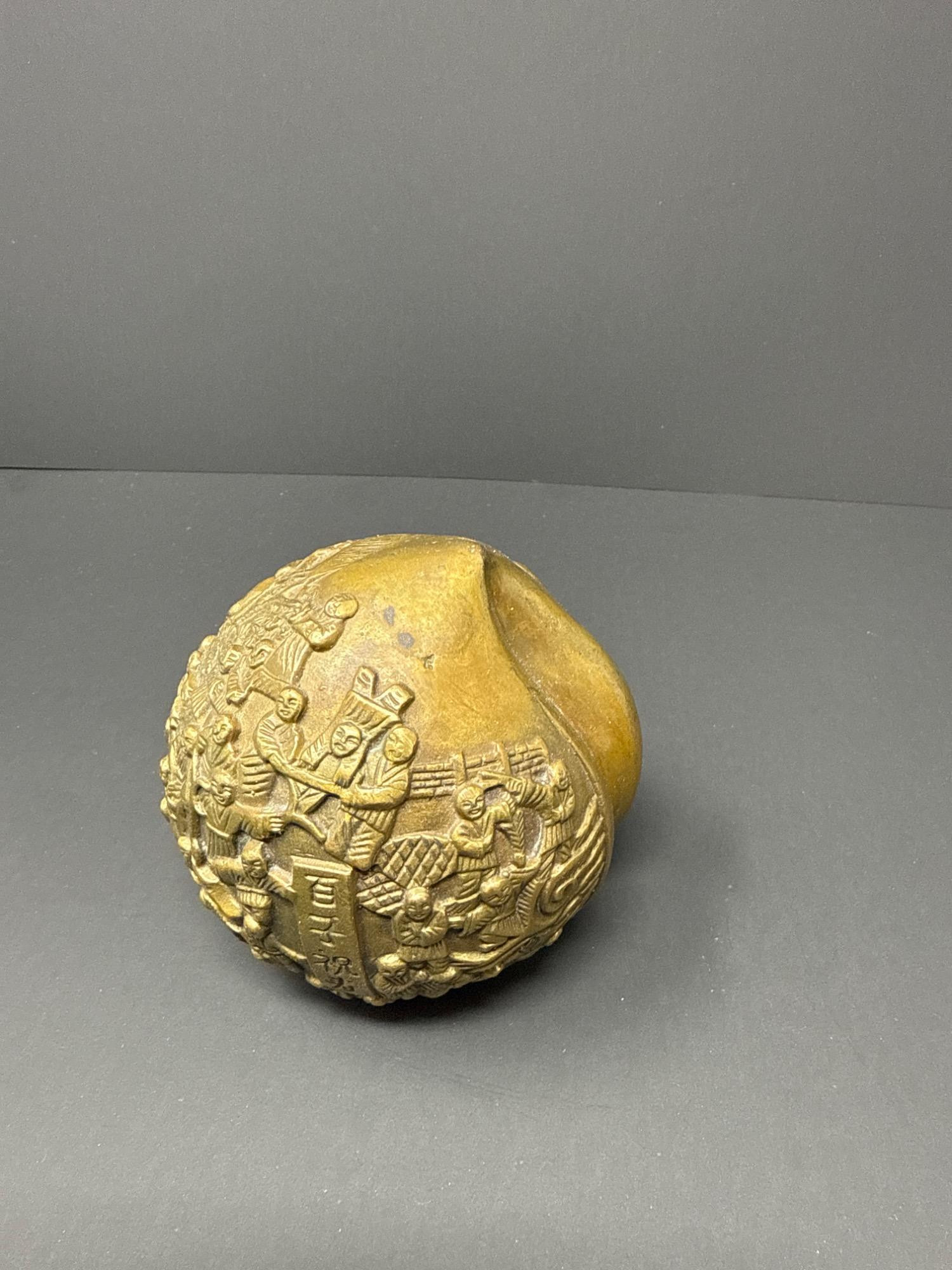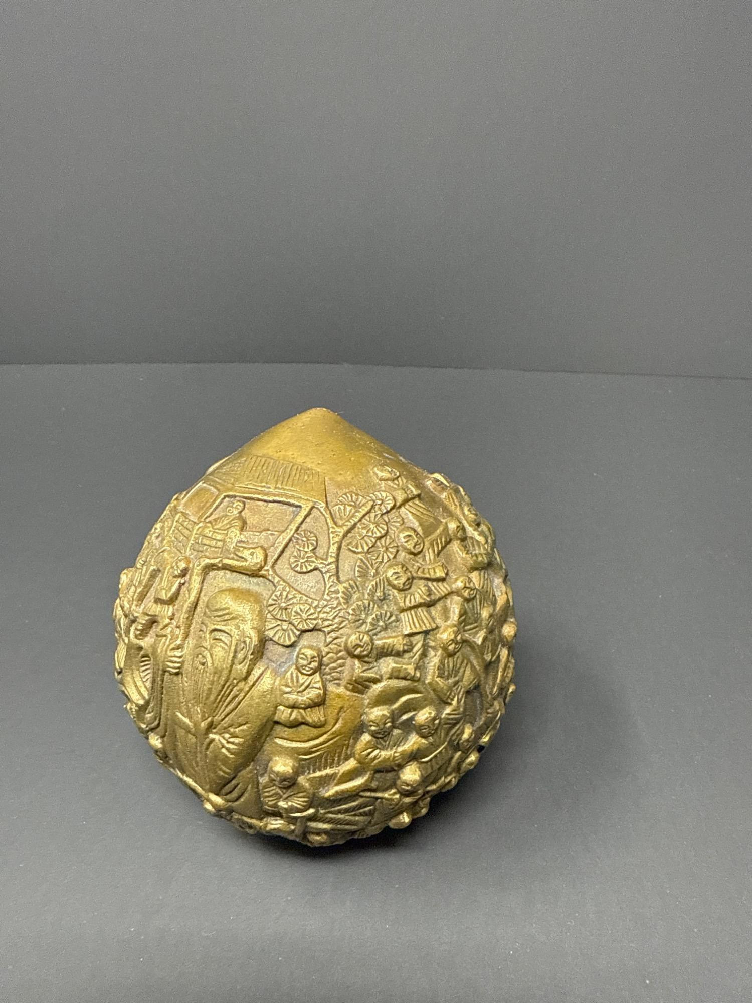 A charming and diverse collection of vintage brass items, including: WWI Trench Art Vase – Repurposed from a 1916 artillery shell casing, featuring beautifully hand-hammered details. Measuring 10.5” H x 5.5” W Solid Brass Grocer’s Weight – Heavy 5.5" tall and 7lb weight with classic handled design. Marked “Warranted / Staffs” on base. Bronze Buddha Paperweight – Ornately detailed with raised relief figures and cultural motifs. Measuring 3.5” diameter. Decorative Brass Kettle – A whimsical piece adorned with a jester/clown head and ribbon collar. Sits on four small wheels and features engraved Asian characters on the body (symbolizing “longevity” and “prosperity”). Topped with an intricate lattice-like dish as a headpiece. Measuring 10” H x 18” W Bonus Items – Includes an oversized vintage key and additional small brass accents.