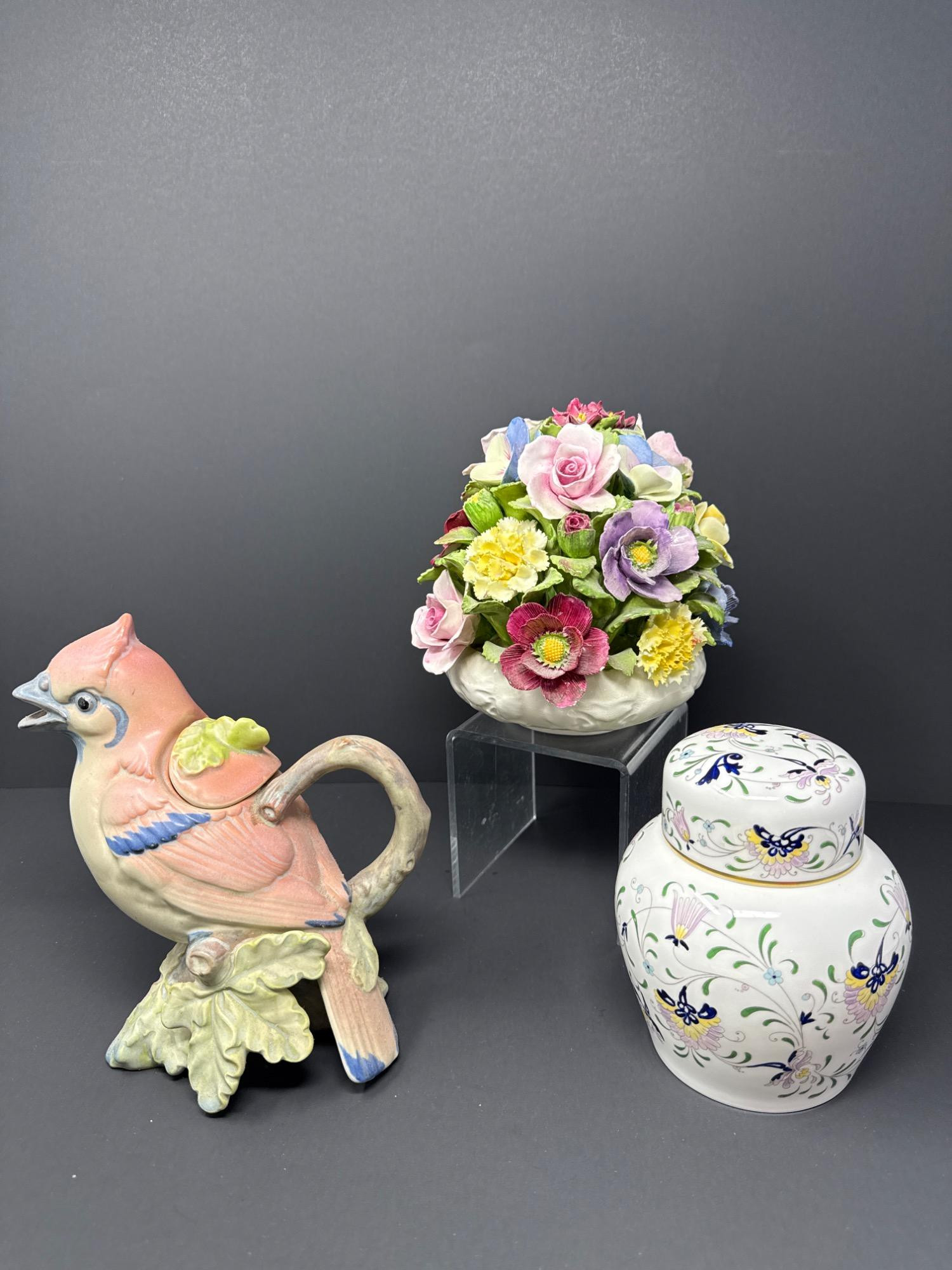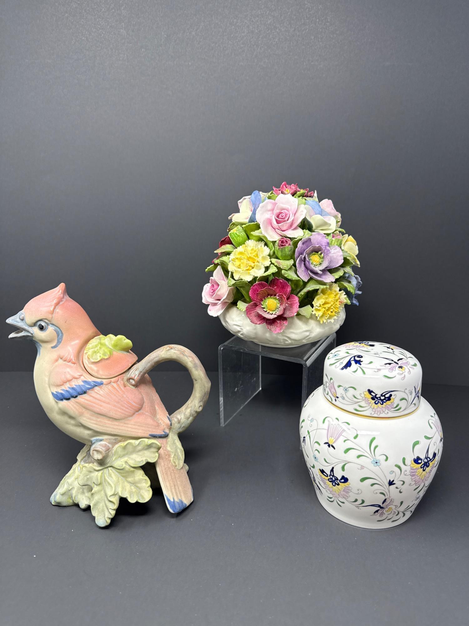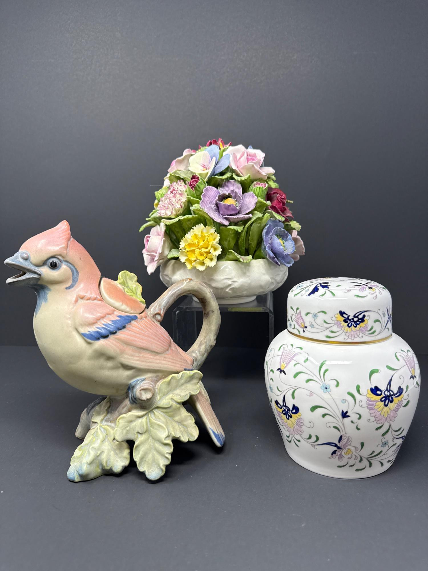 Bring timeless English elegance to your collection with this exquisite 3-piece ceramic set, featuring: Aynsley Floral Bouquet (6.5" H x 6" W) Coalport Ginger Jar (5.5" H x 4" W) Bird Figural Pitcher (7.5" H x 4" W)