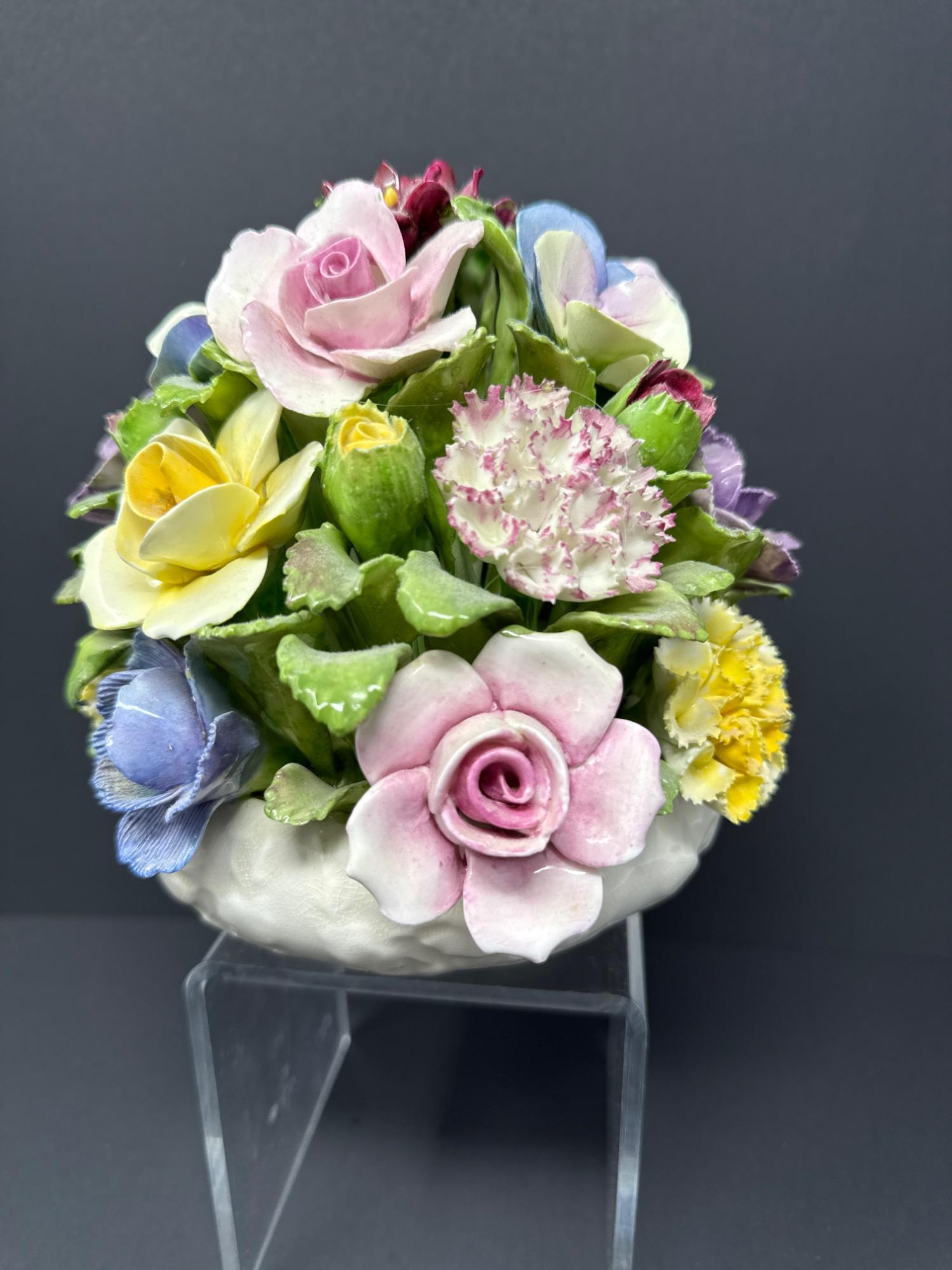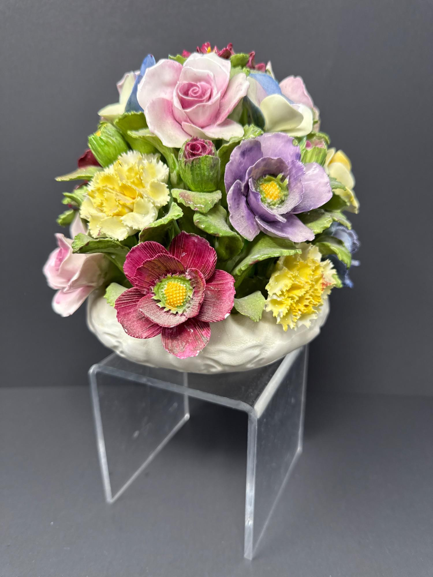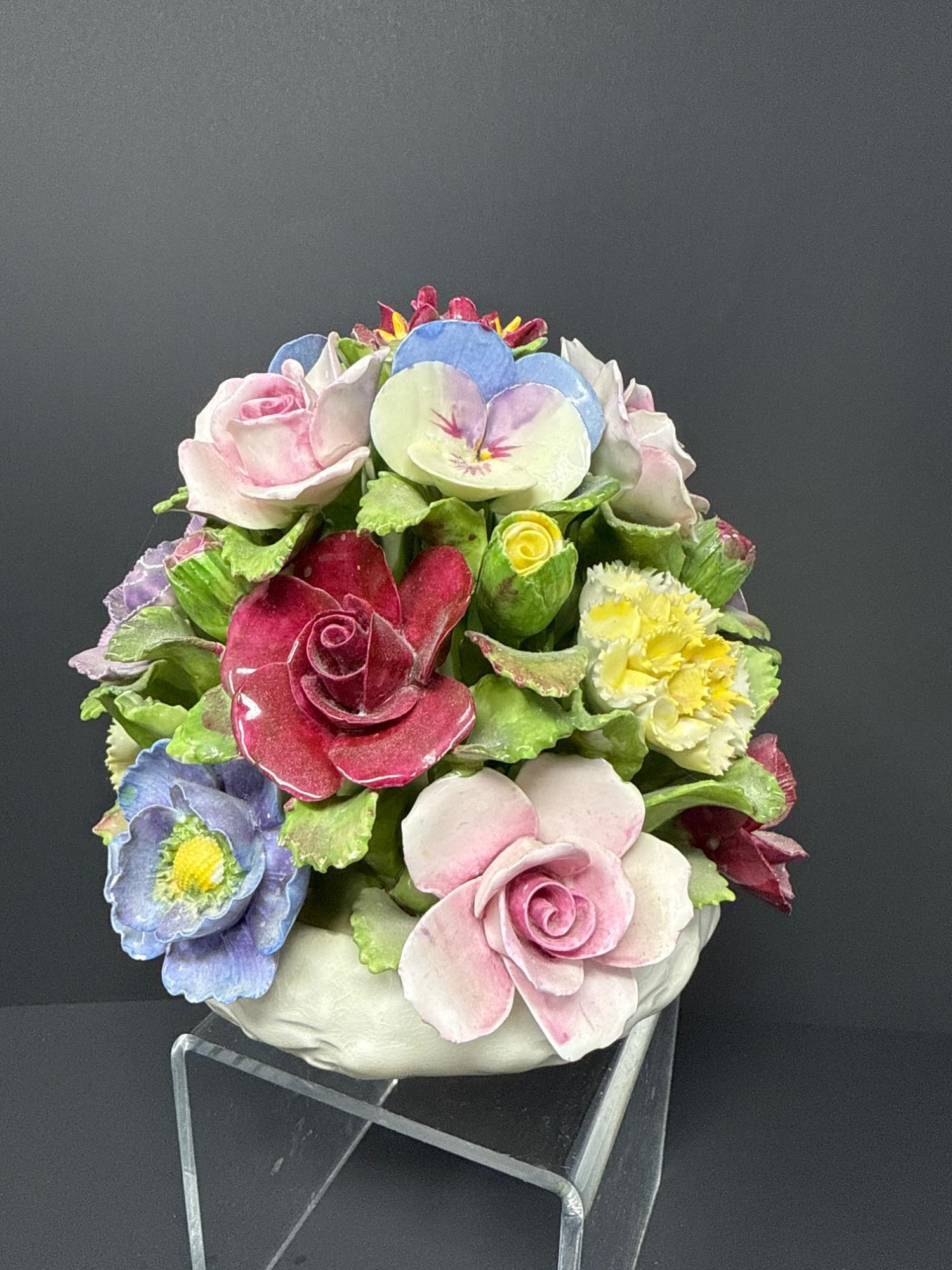 Hand-modeled and hand-painted fine bone china, this vibrant floral arrangement bursts with lifelike roses, pansies, and carnations in a domed bouquet. Marked Aynsley England, established 1775.