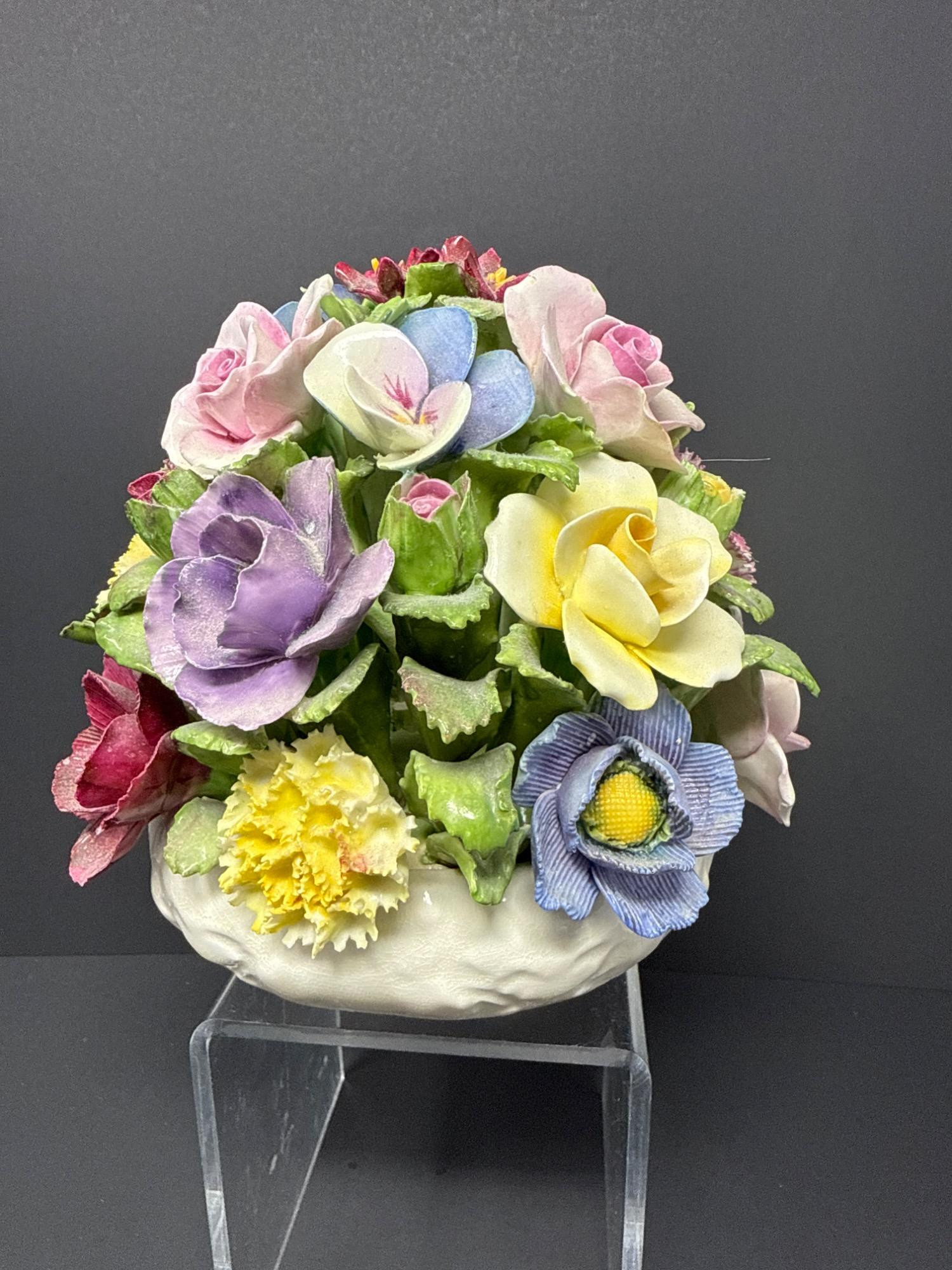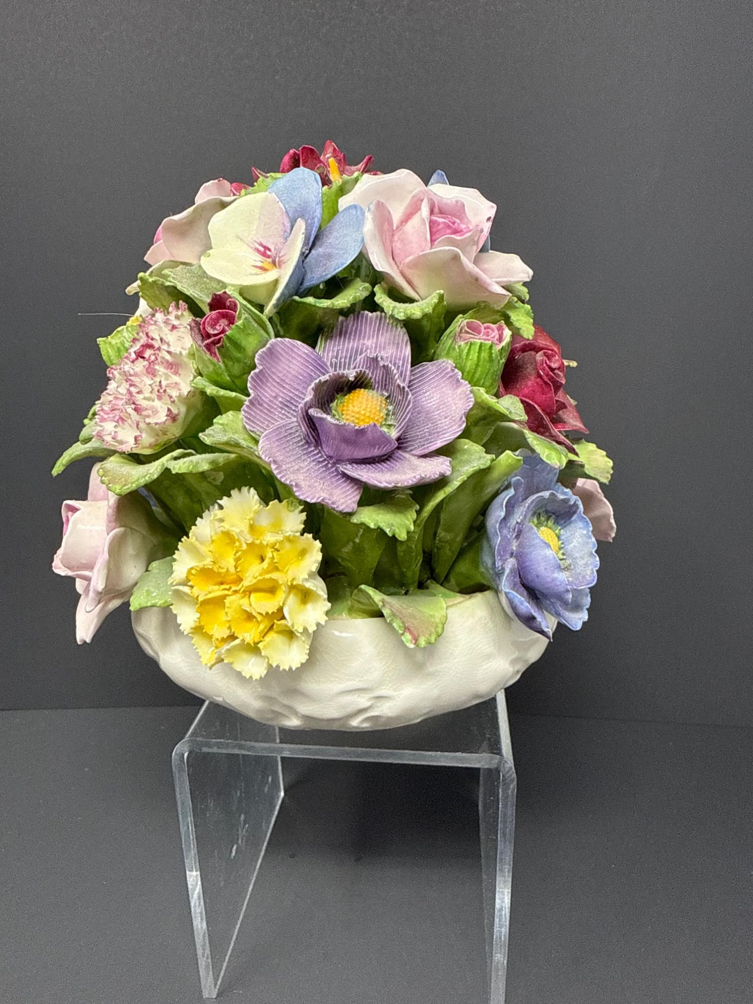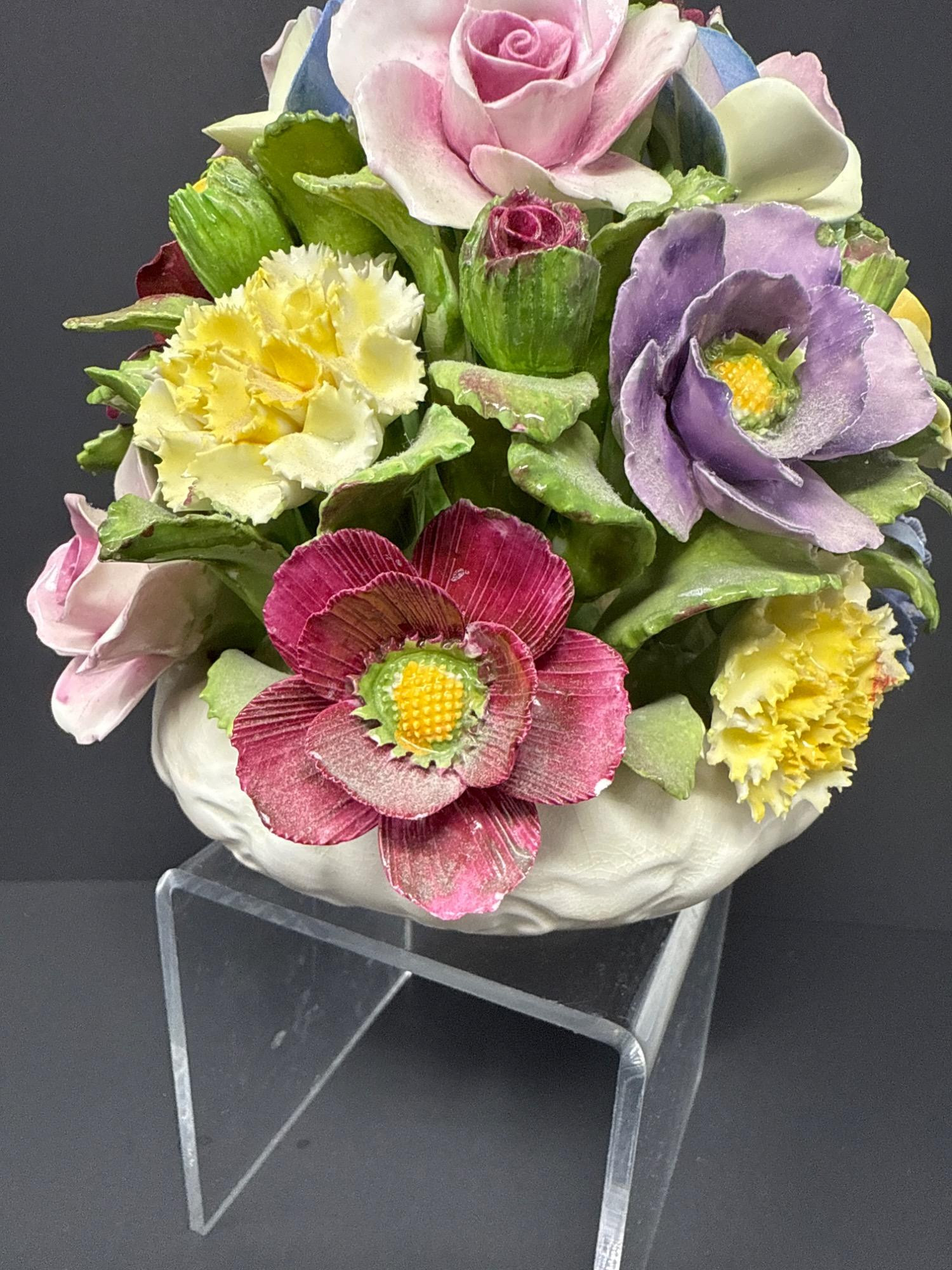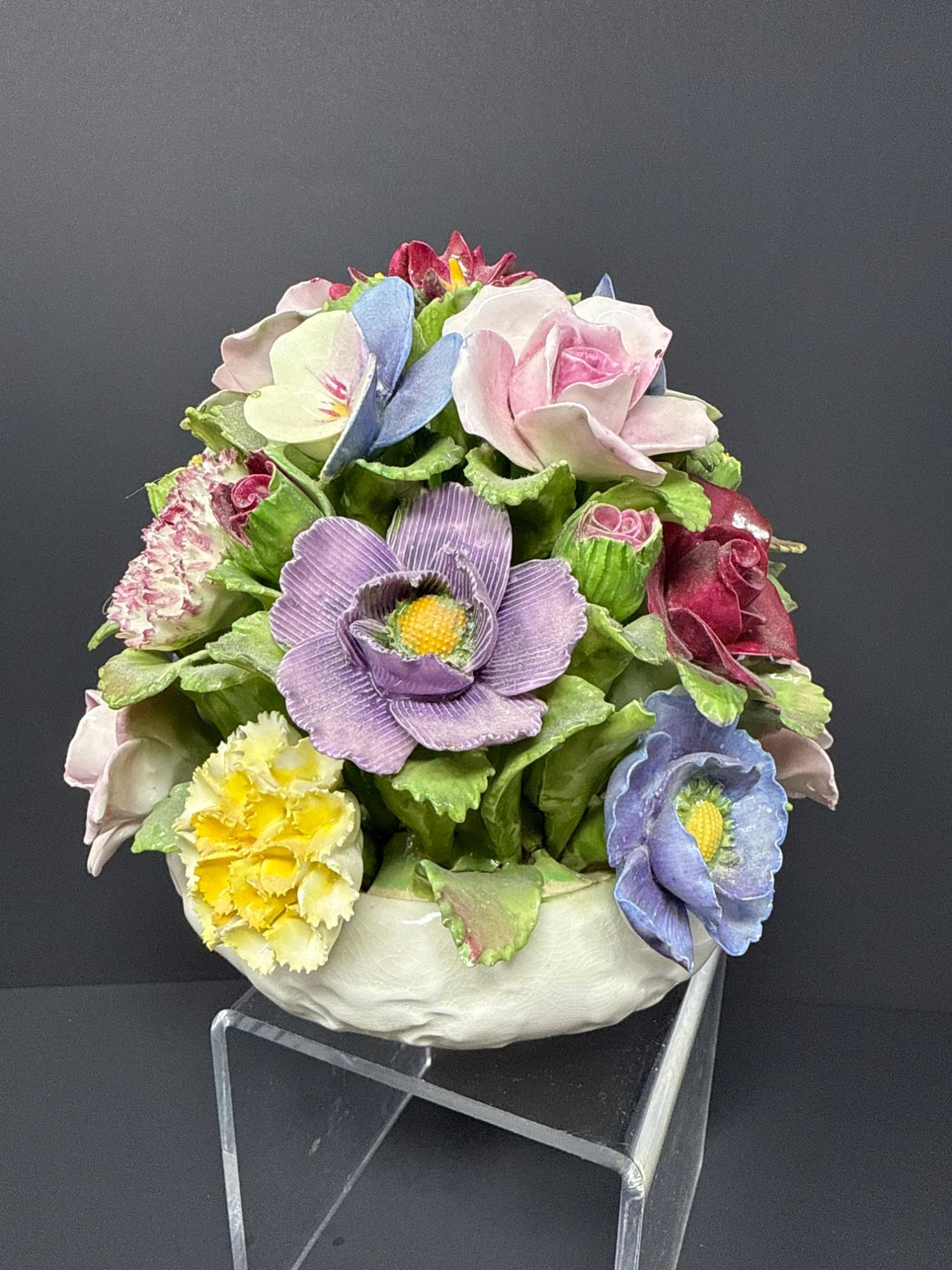 Hand-modeled and hand-painted fine bone china, this vibrant floral arrangement bursts with lifelike roses, pansies, and carnations in a domed bouquet. Marked Aynsley England, established 1775.