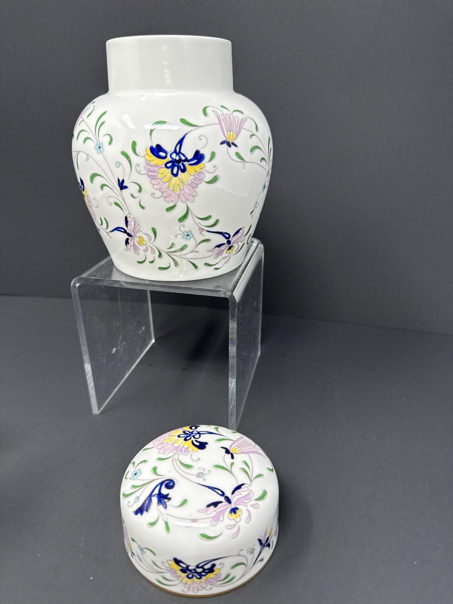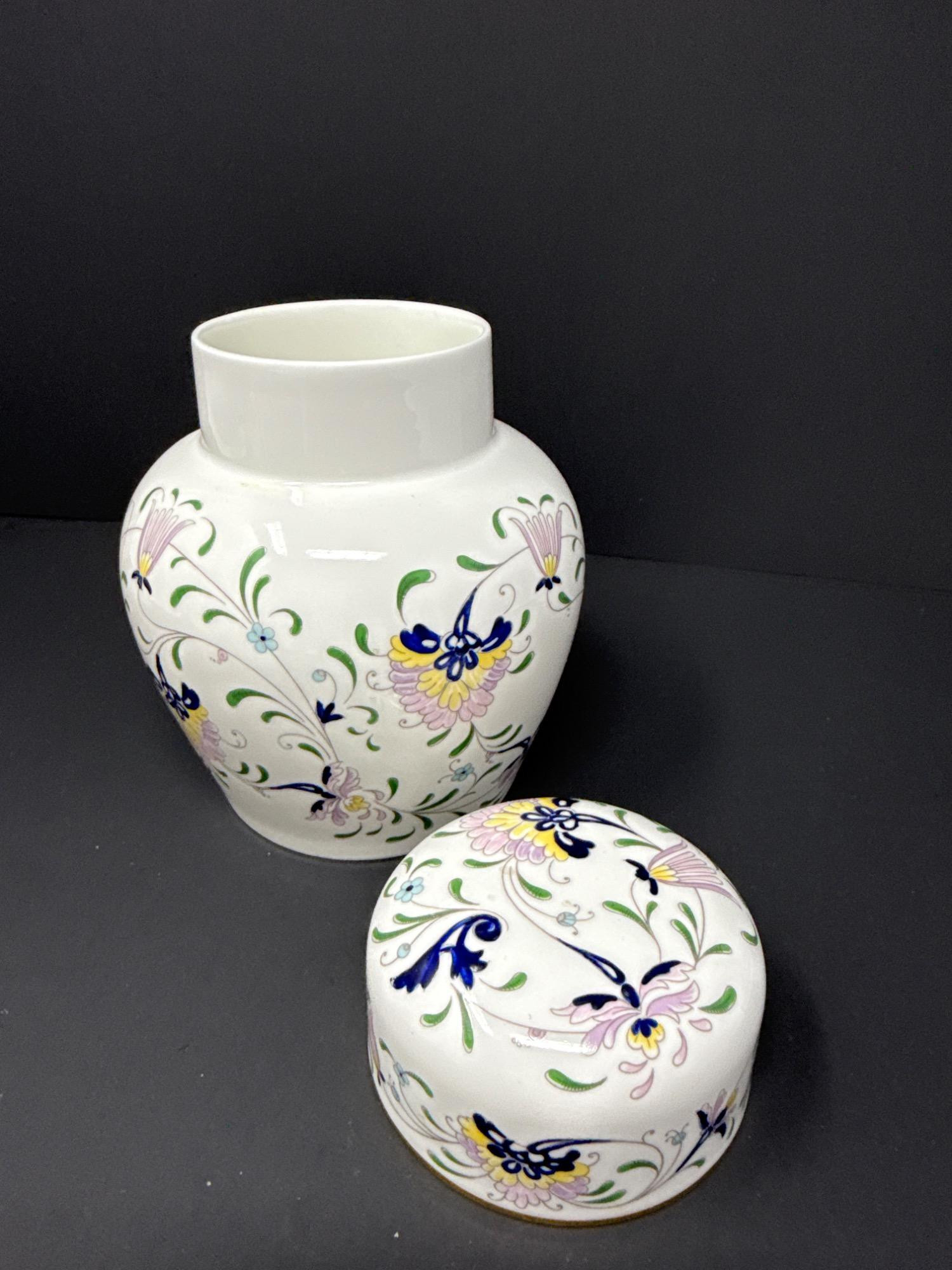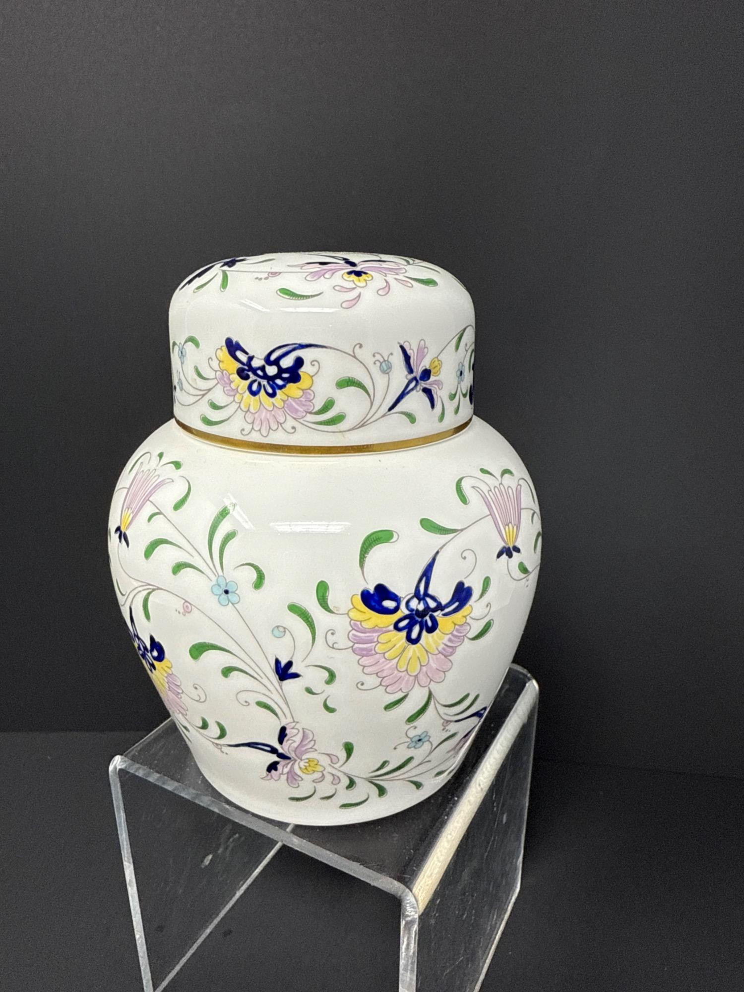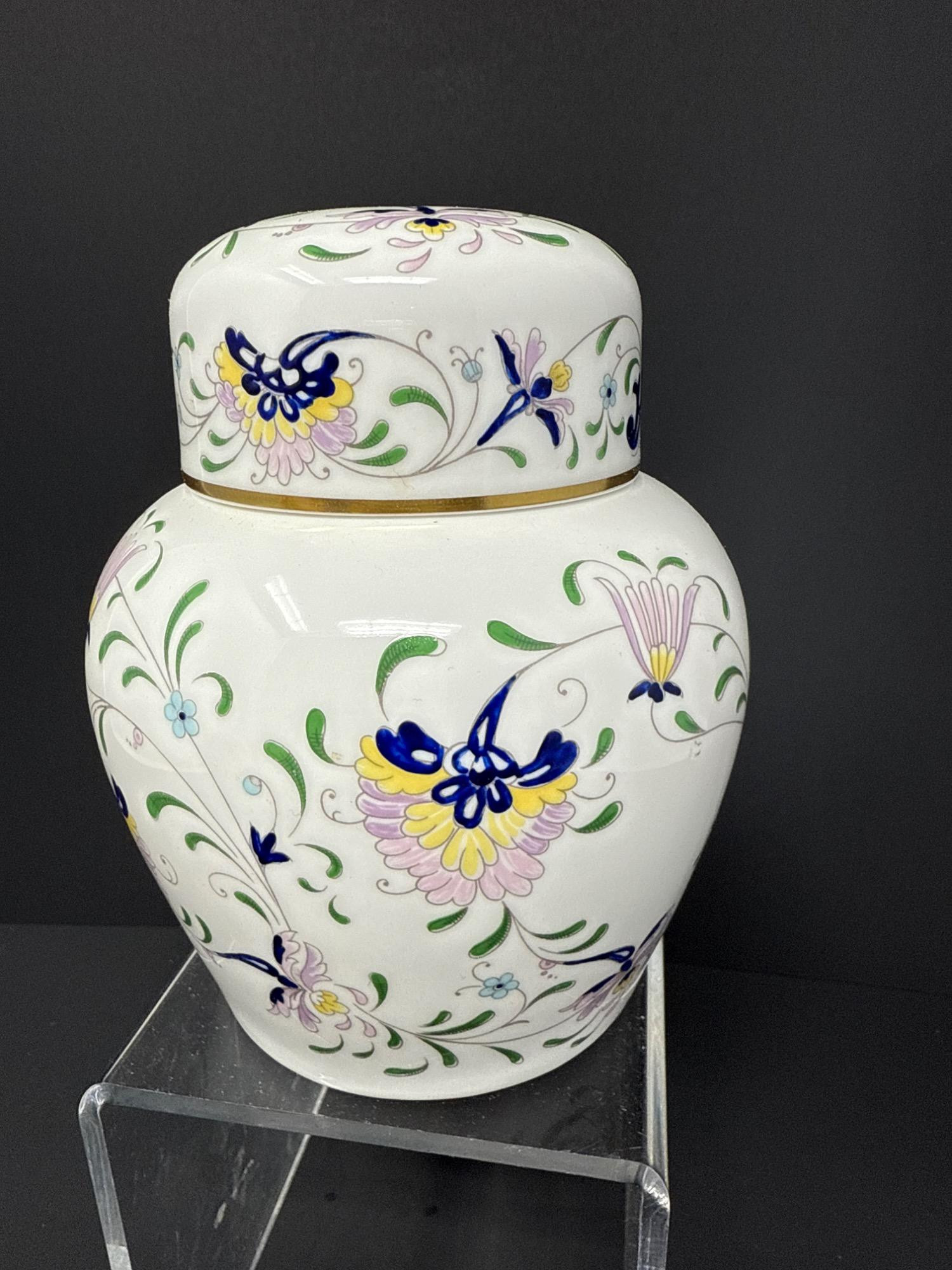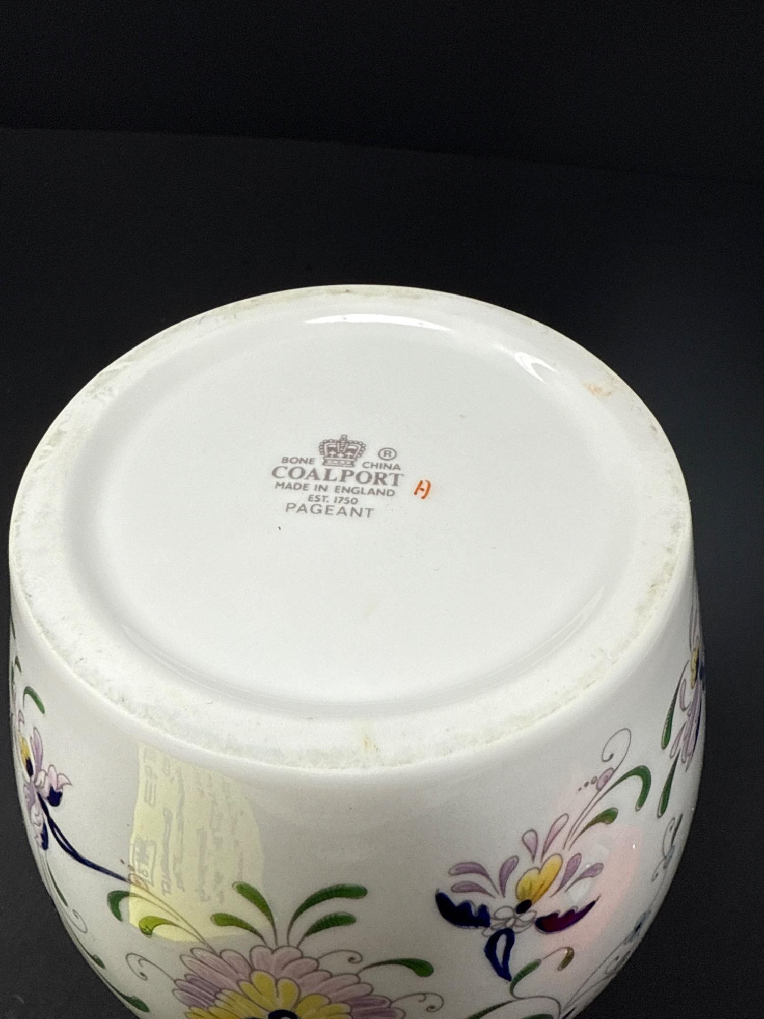 A stunning bone china ginger jar from the Coalport "Pageant" line, made in England. Decorated with delicate floral and butterfly motifs in soft pastels with gold trim. Base is stamped with hallmark.