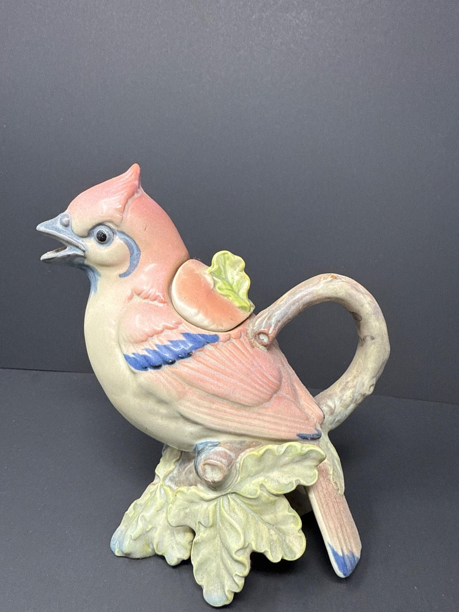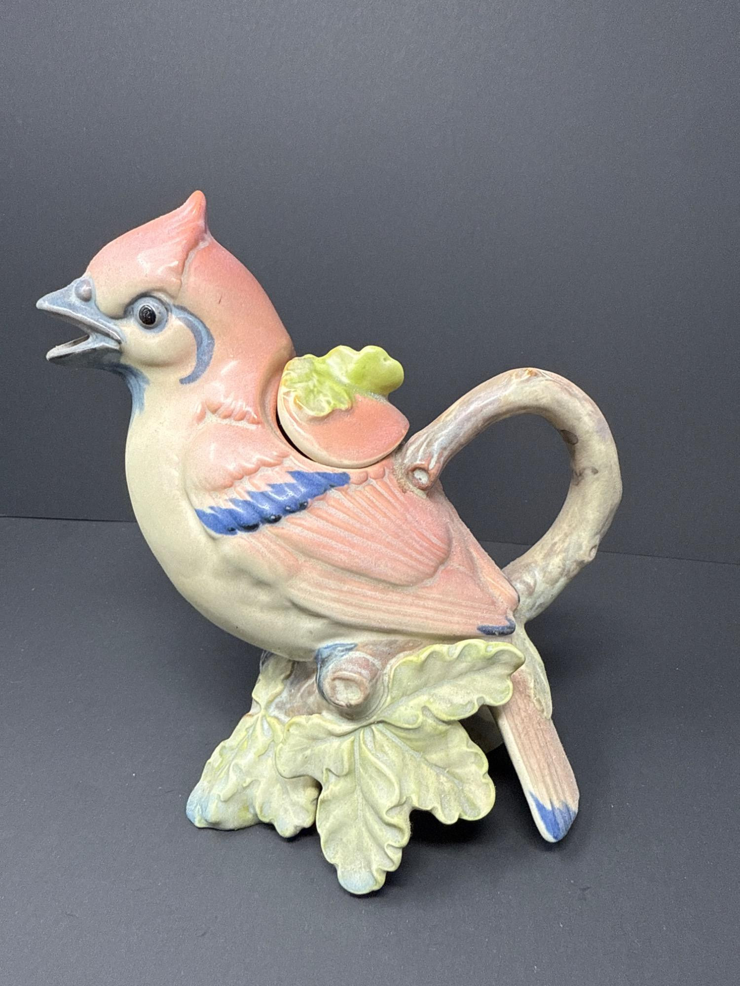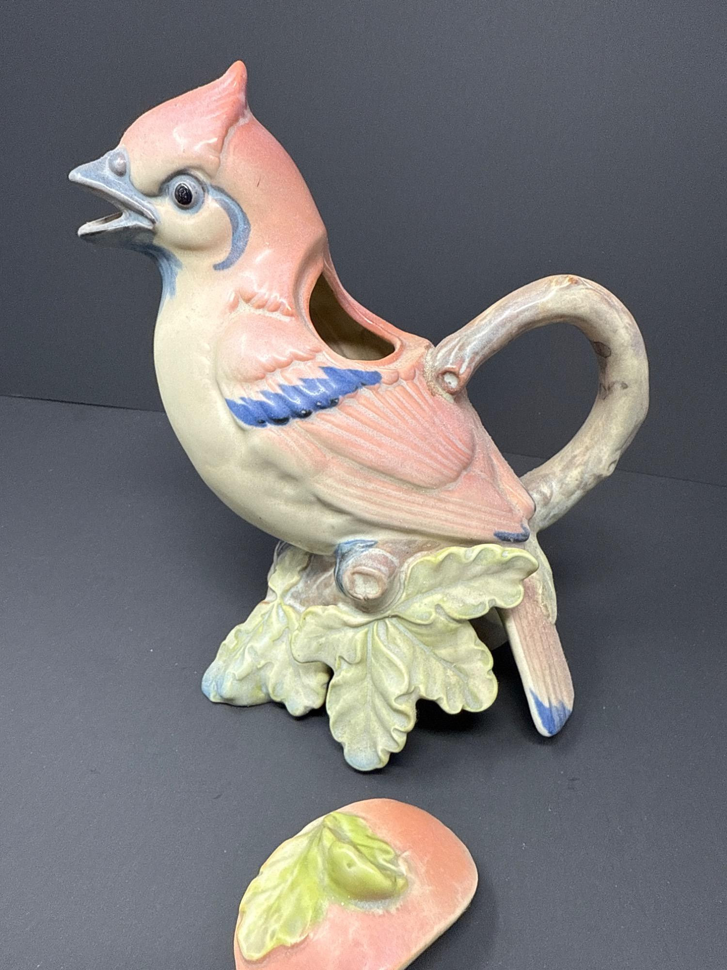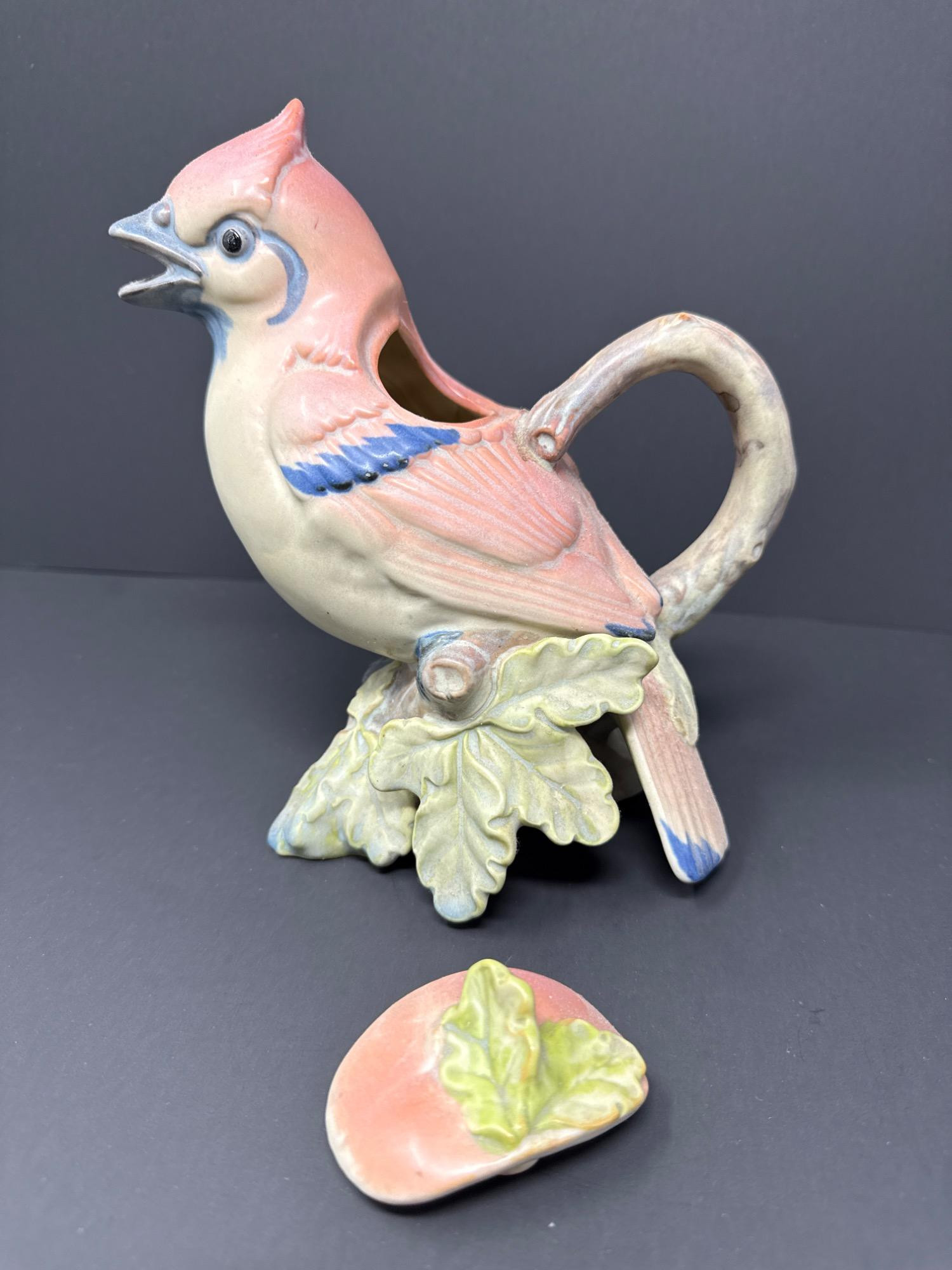A whimsically detailed ceramic pitcher shaped like a pink and blue bird perched on oak leaves. Includes matching lid. Unmarked but full of charm and character.