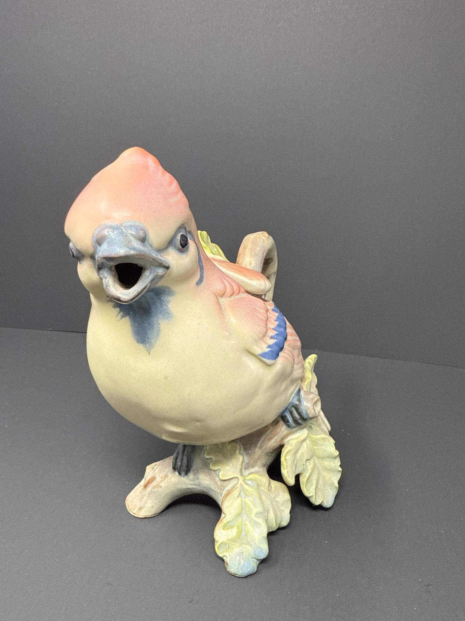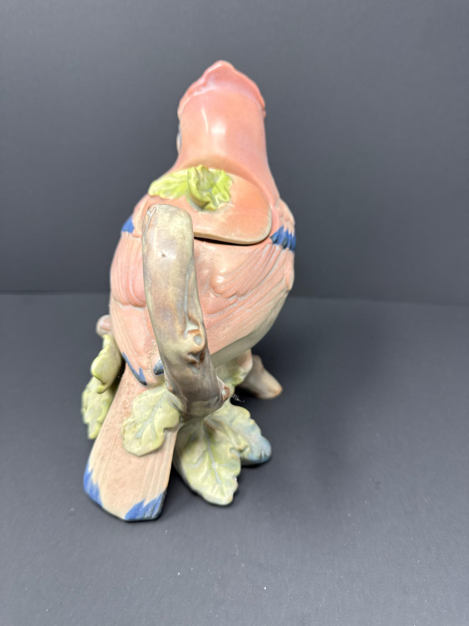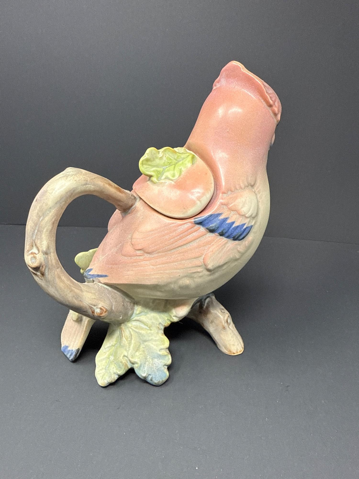 A whimsically detailed ceramic pitcher shaped like a pink and blue bird perched on oak leaves. Includes matching lid. Unmarked but full of charm and character.