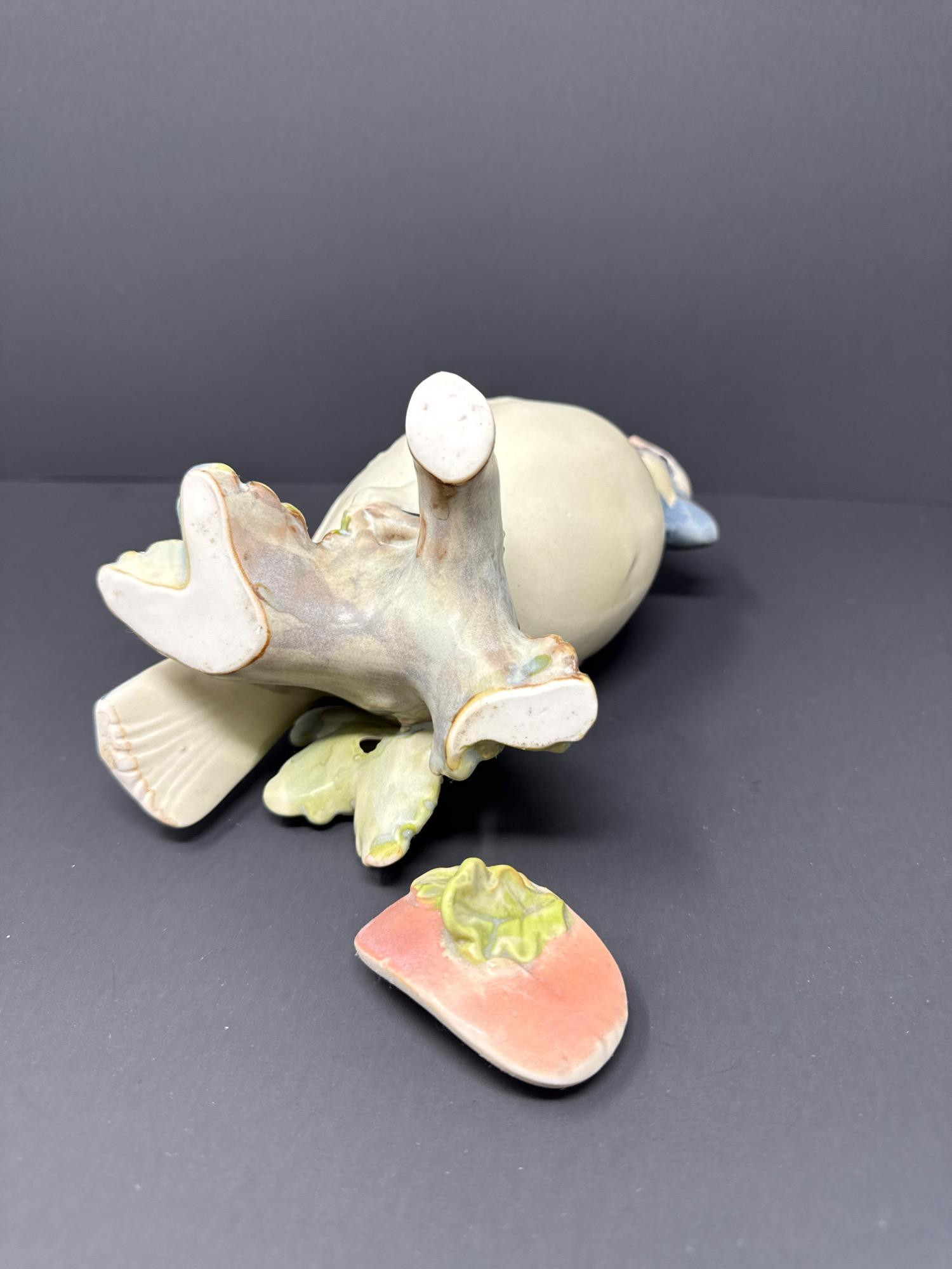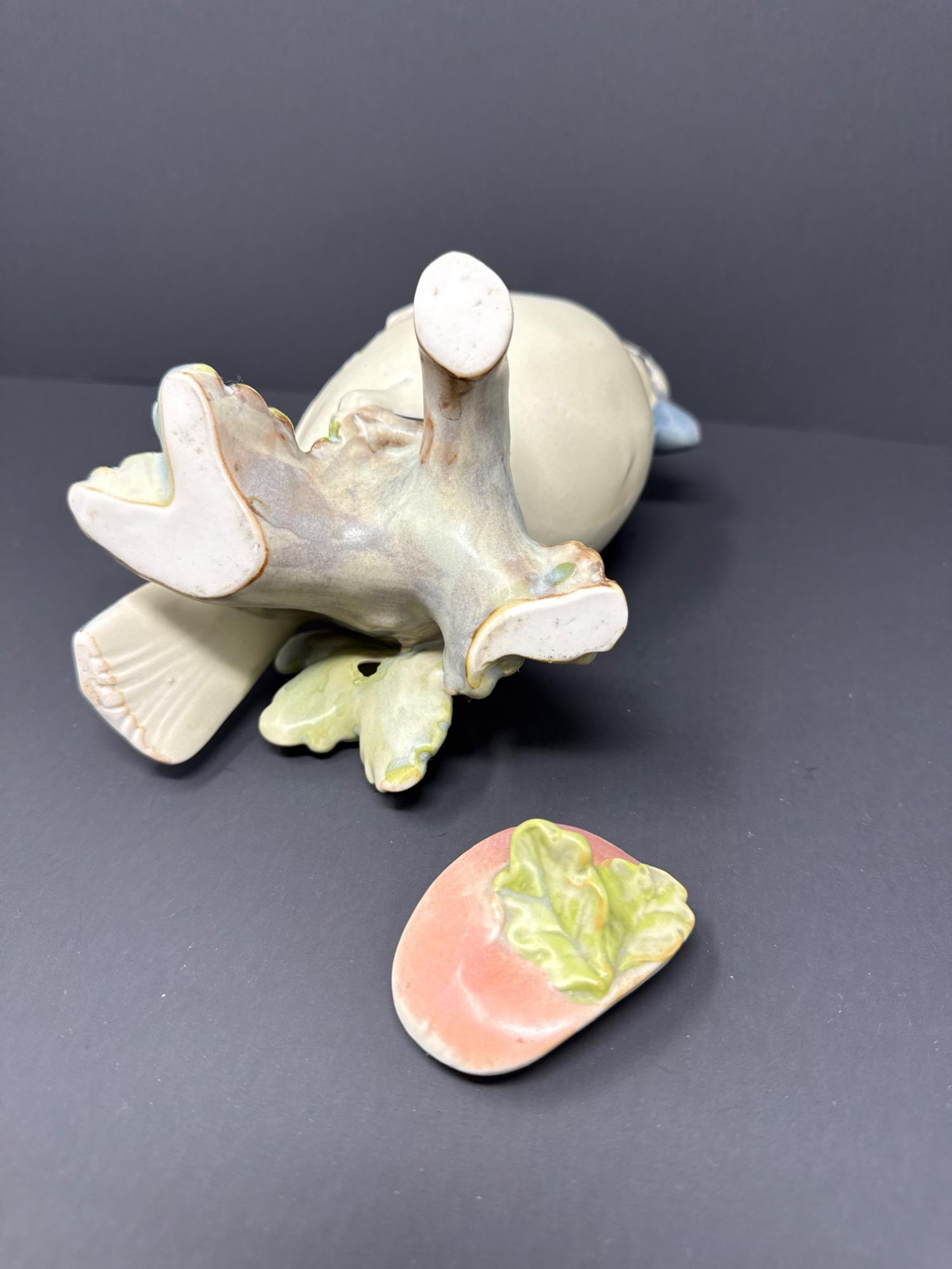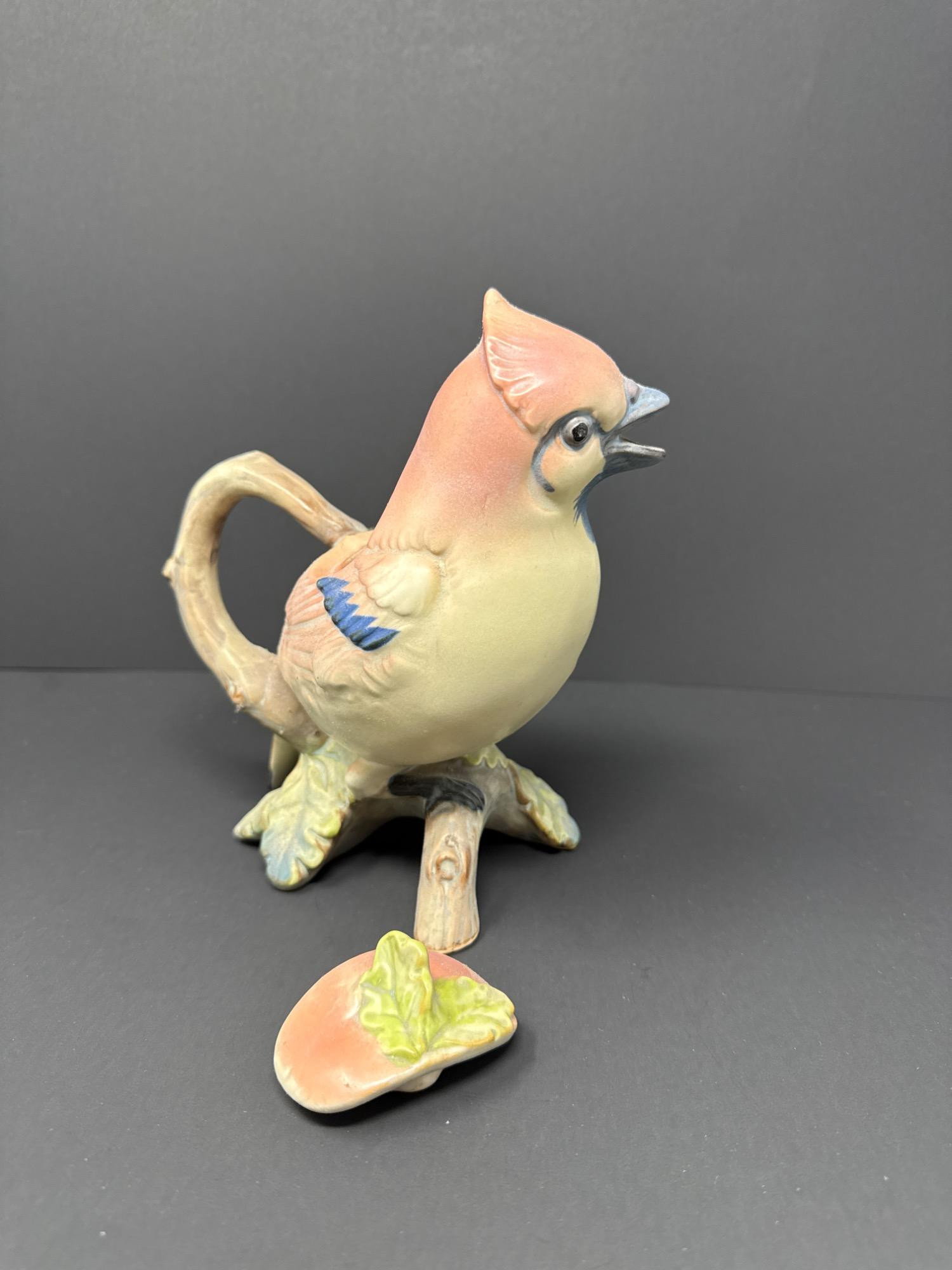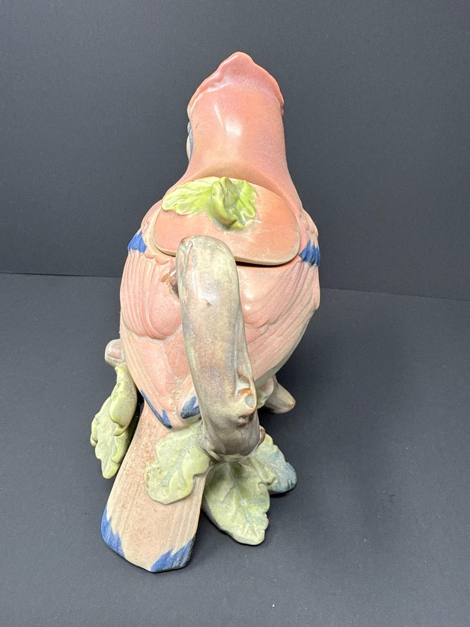 A whimsically detailed ceramic pitcher shaped like a pink and blue bird perched on oak leaves. Includes matching lid. Unmarked but full of charm and character.