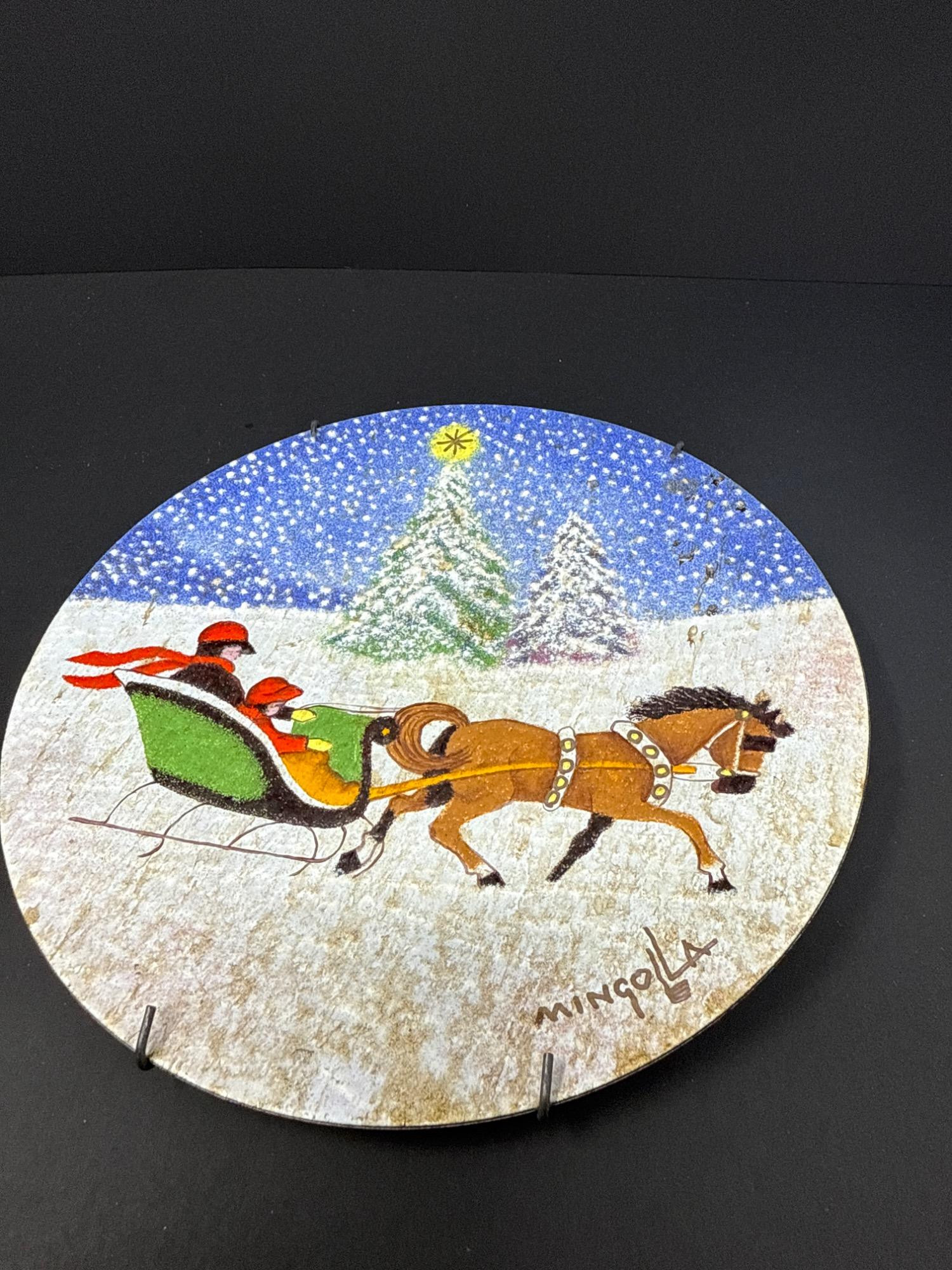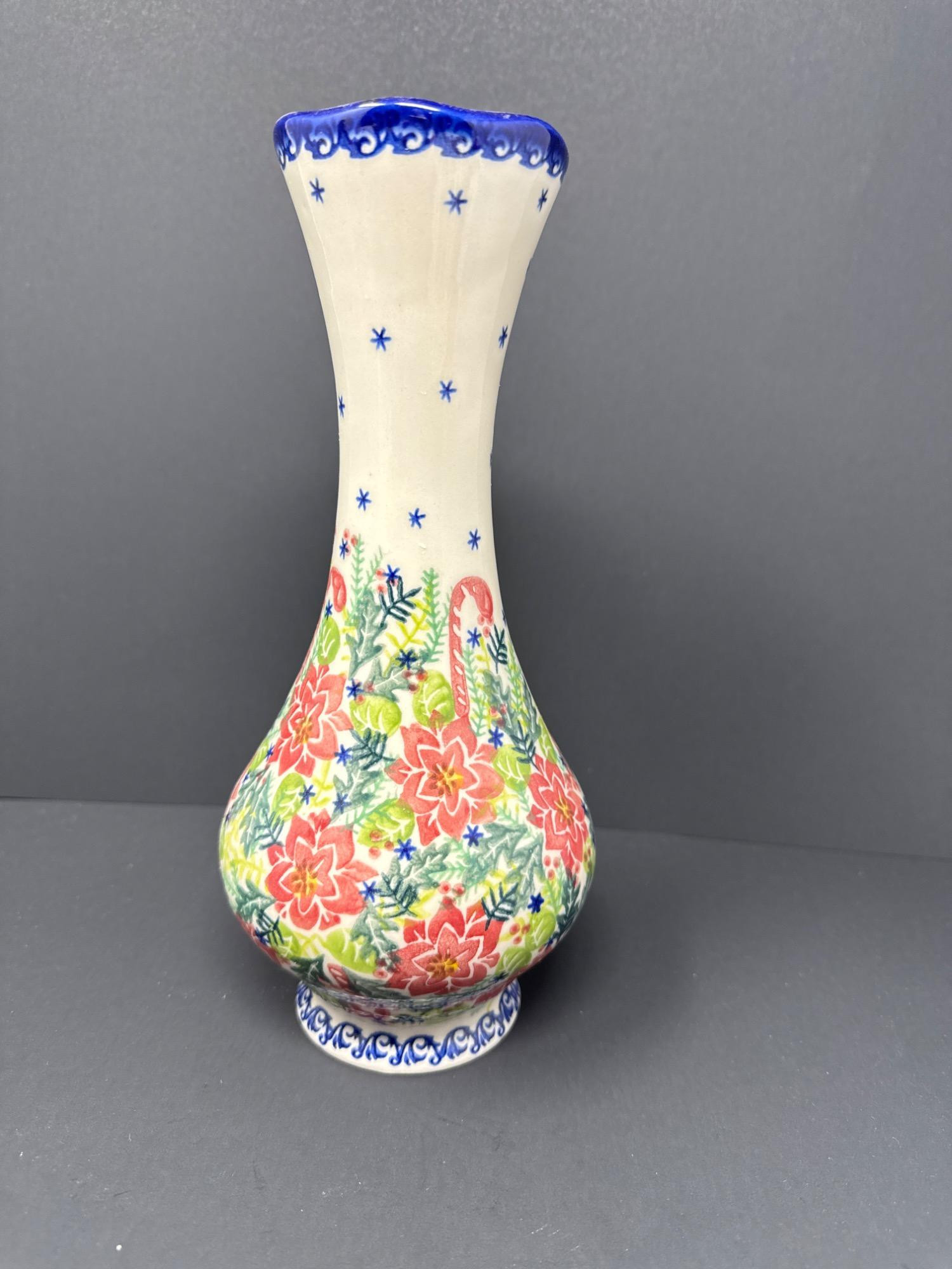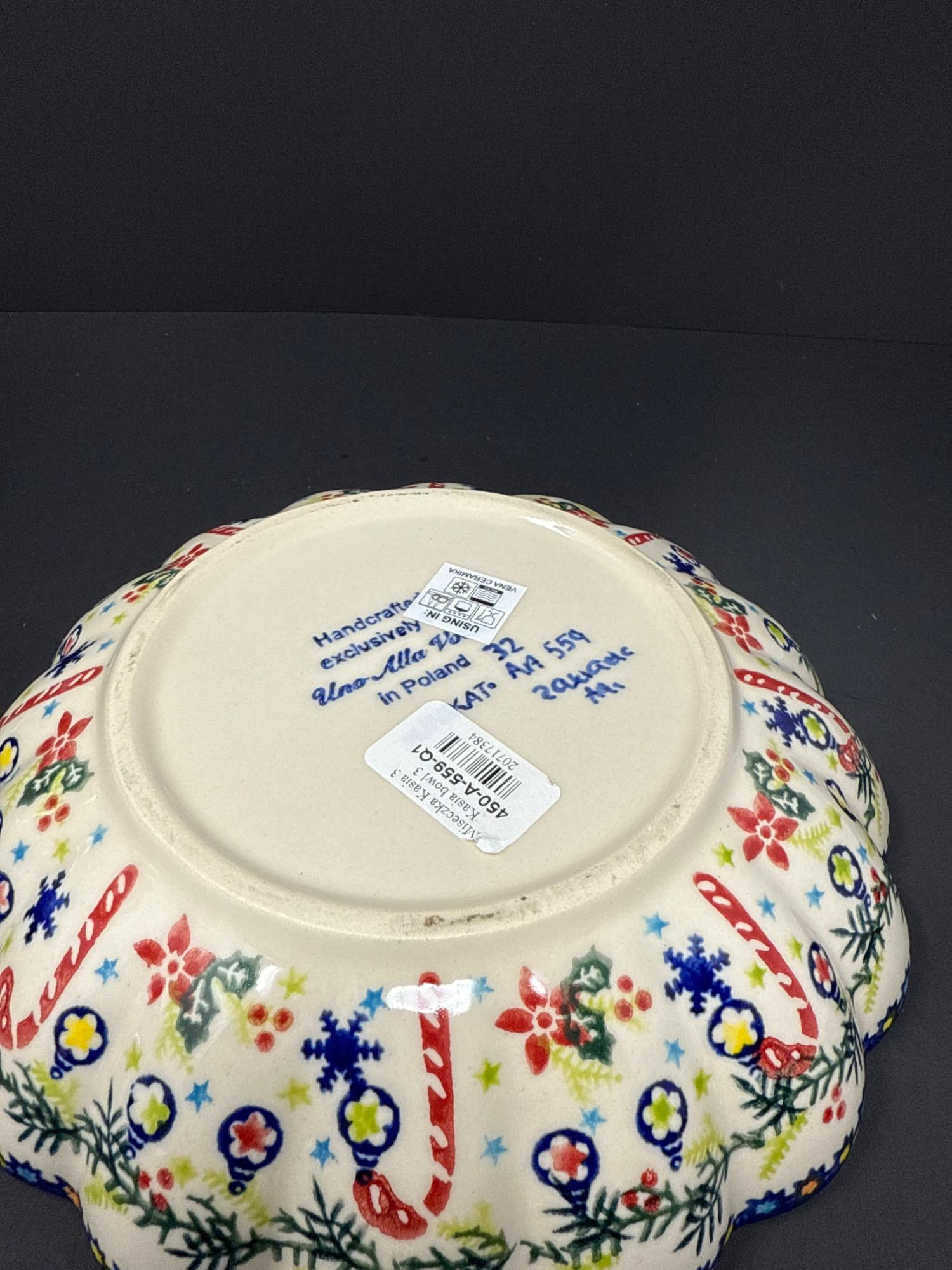 Celebrate the season with this beautifully curated 4-piece holiday decor set, featuring hand-painted Polish pottery and a limited edition enamel plate by American artist Dominic John Mingolla. Each item is bursting with festive charm, artistic detail, and collectible appeal. SET INCLUDES: Polish Pottery Christmas Tree Figurine – "Choinka duża 2" Size: 12" tall x 6" wide Handmade in Poland Decorated with classic holiday motifs: candy canes, snowflakes, ornaments, and stars Stamped “Hand Made in Poland” on the base Artist signature and production mark present Vena Ceramika Floral Holiday Vase Size: 10" tall x 4" wide Features festive poinsettias, candy canes, evergreens, and star accents Stamped “Vena Ceramika, Poland” Scalloped Bowl – Polish Pottery by Uno Alla Volta Size: 8" diameter x 2" tall Features a central red cardinal pair surrounded by candy canes, florals, and holiday motifs Scalloped edge with rich cobalt blue trim Stamped: “Handcrafted exclusively for Uno Alla Volta in Poland” Pattern: AT 559 – Signed with artist Enamel Collector Plate – “Dashing Thru the Snow” Size: 8" diameter By enamel artist Dominic John Mingolla Part of the 1978 “Four Seasons” series Signed "Mingolla" on the front Includes original metal hanger for wall display