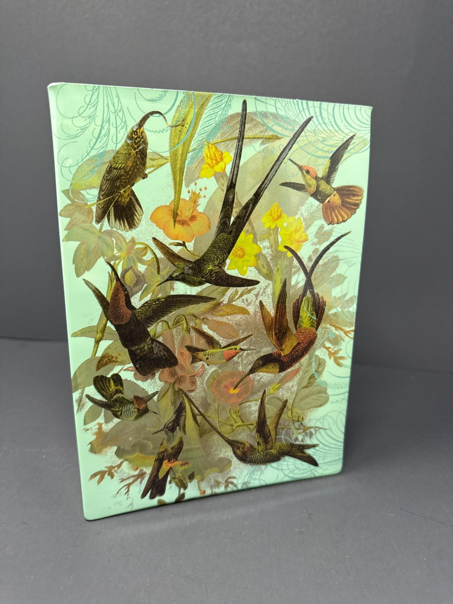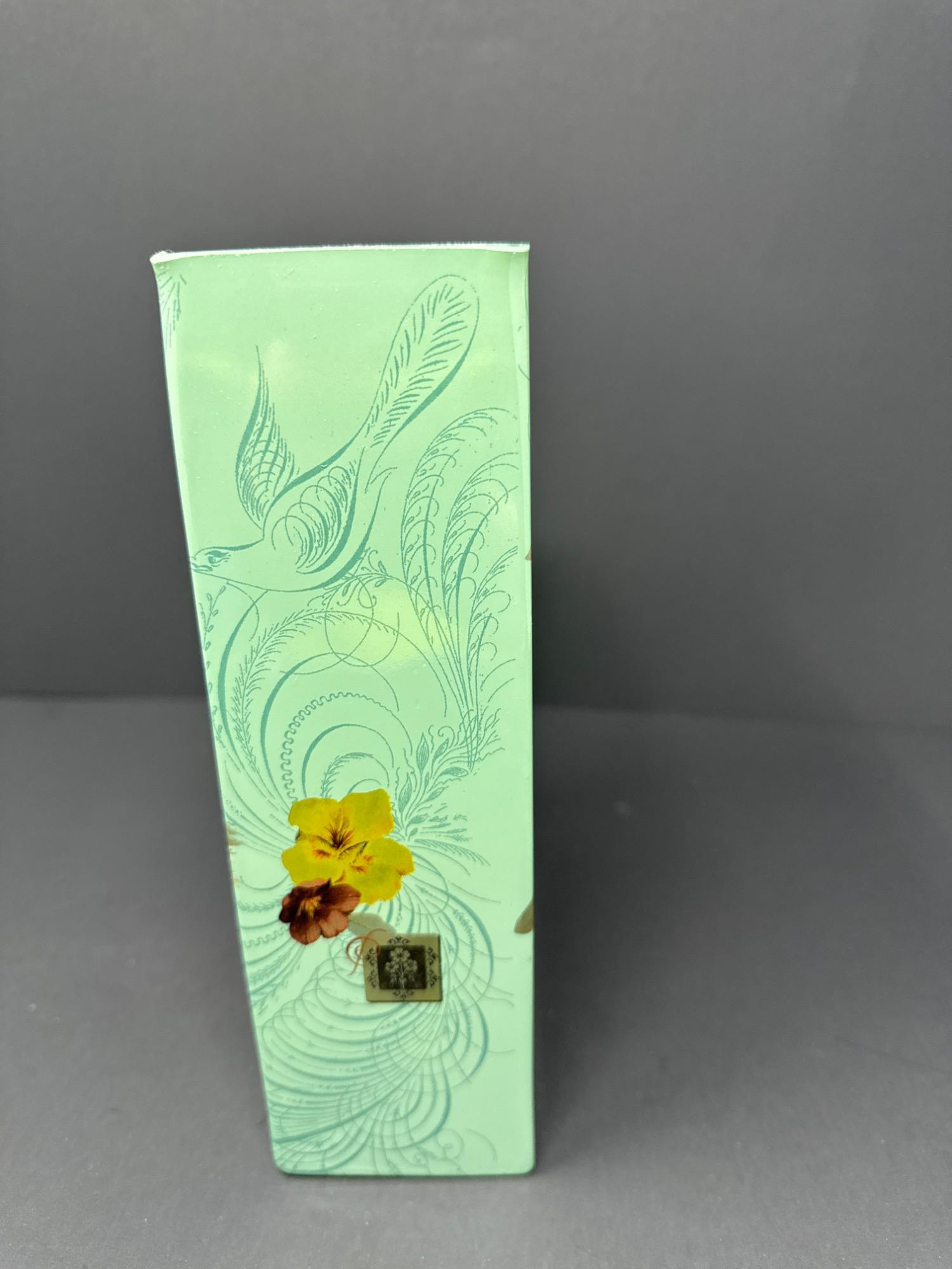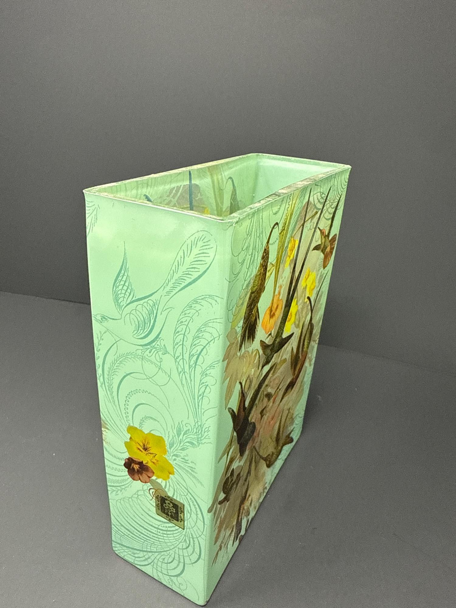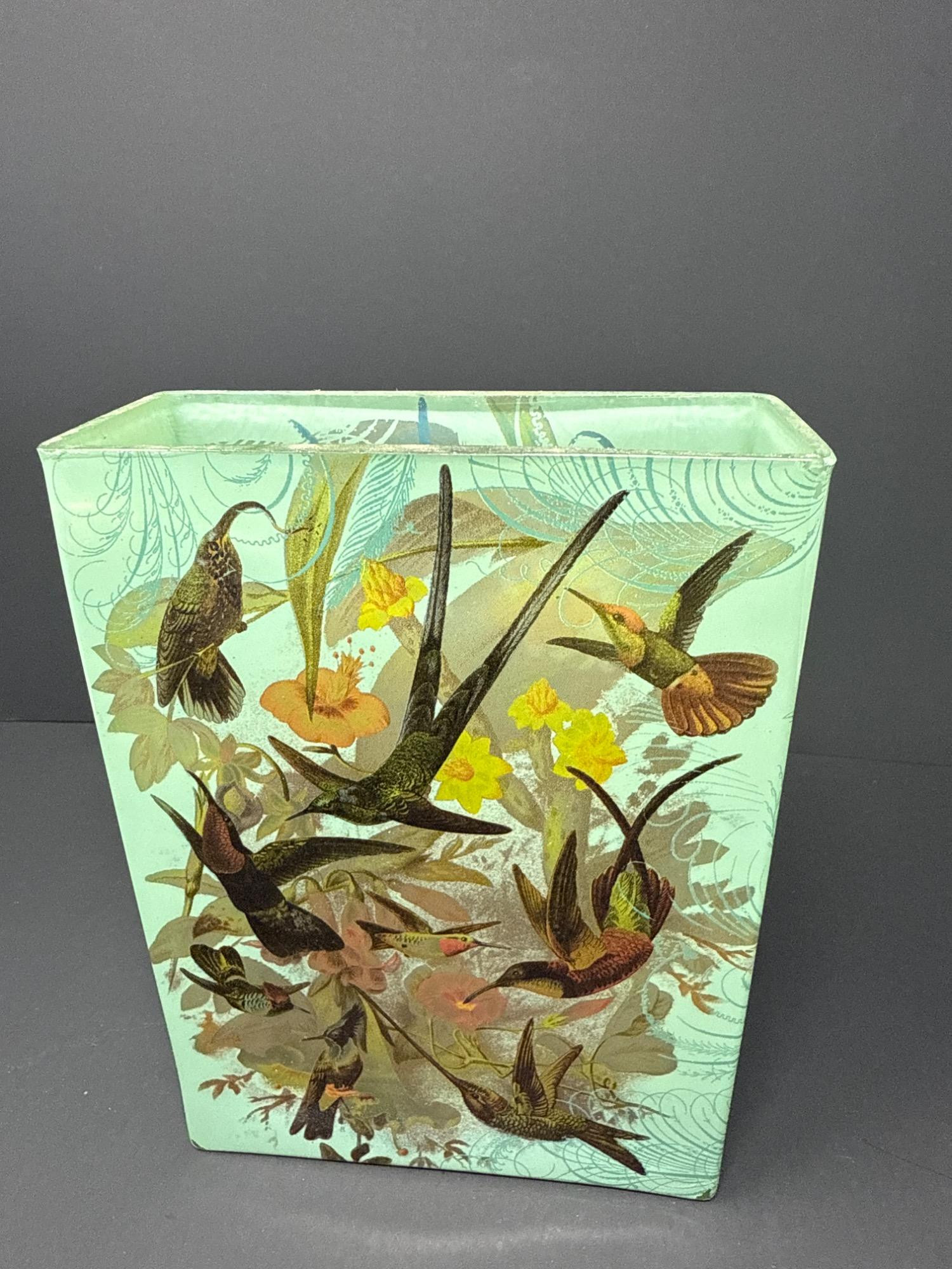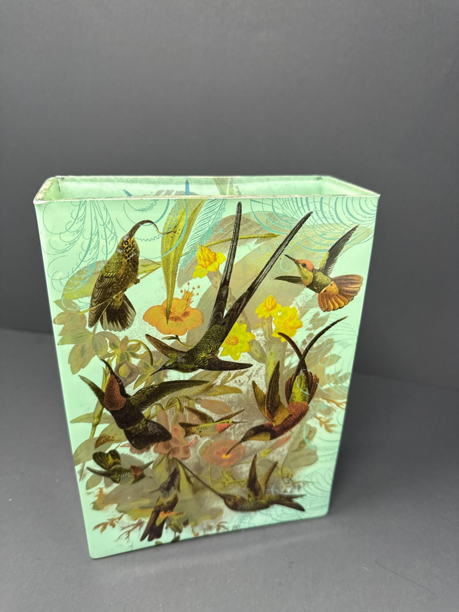 This elegant rectangular glass vase from Fringe Studio features a vibrant and whimsical design of hummingbirds in flight surrounded by colorful flowers. The soft mint green background is adorned with intricate linework, adding depth and sophistication to the overall aesthetic. Features: Beautiful nature-inspired artwork Vintage-style botanical and bird illustrations Size: 8 inches tall x 6 inches wide Original Fringe Studio sticker still attached