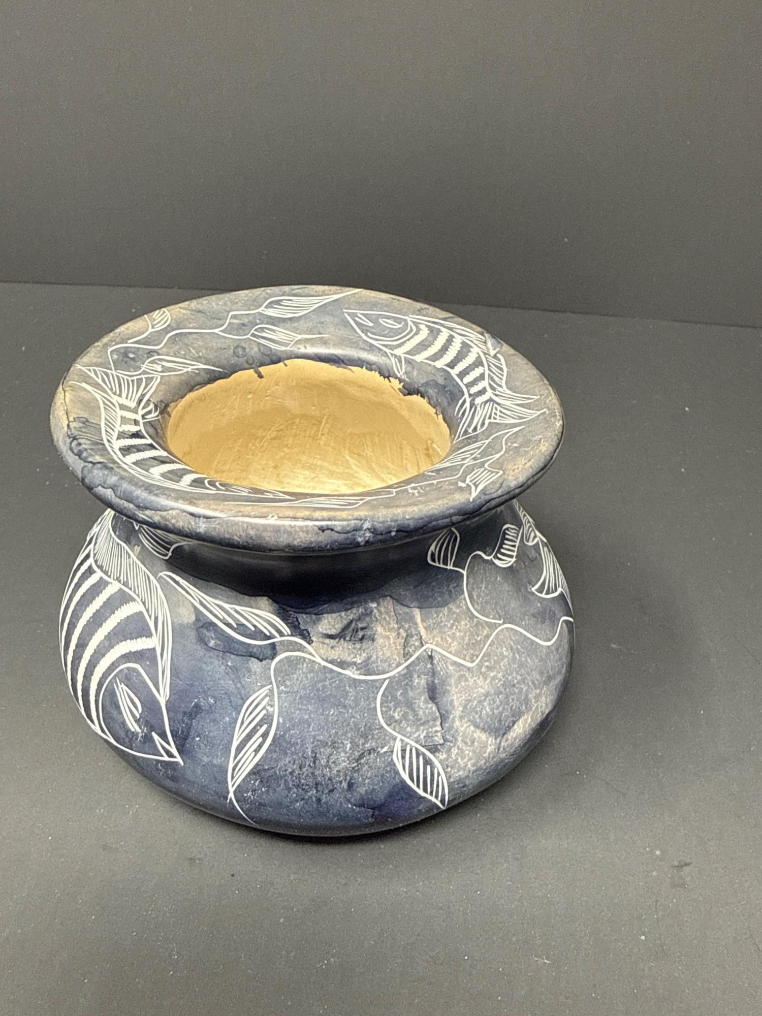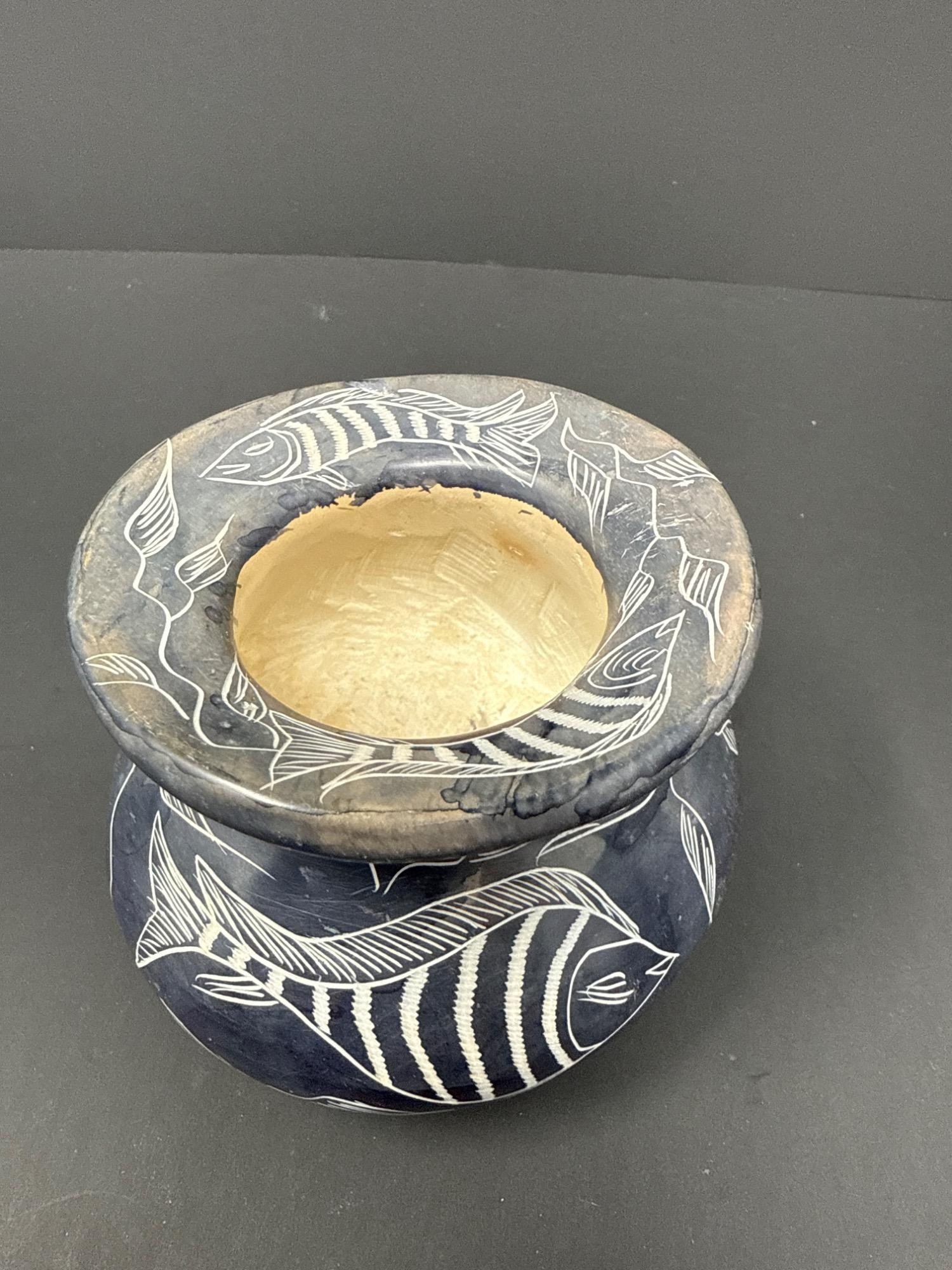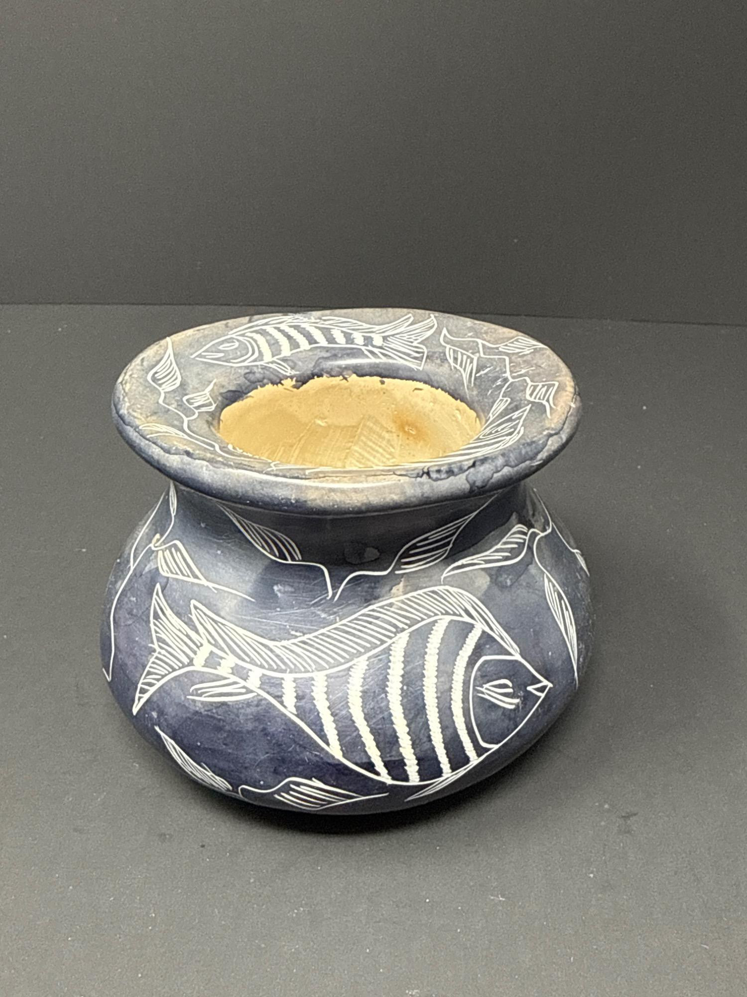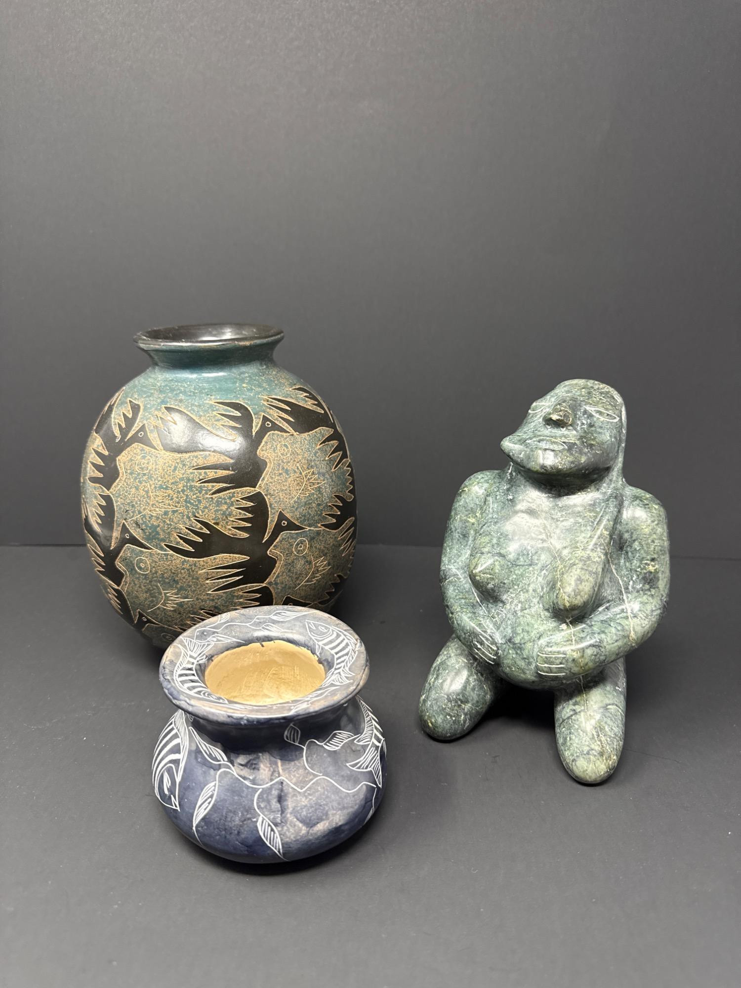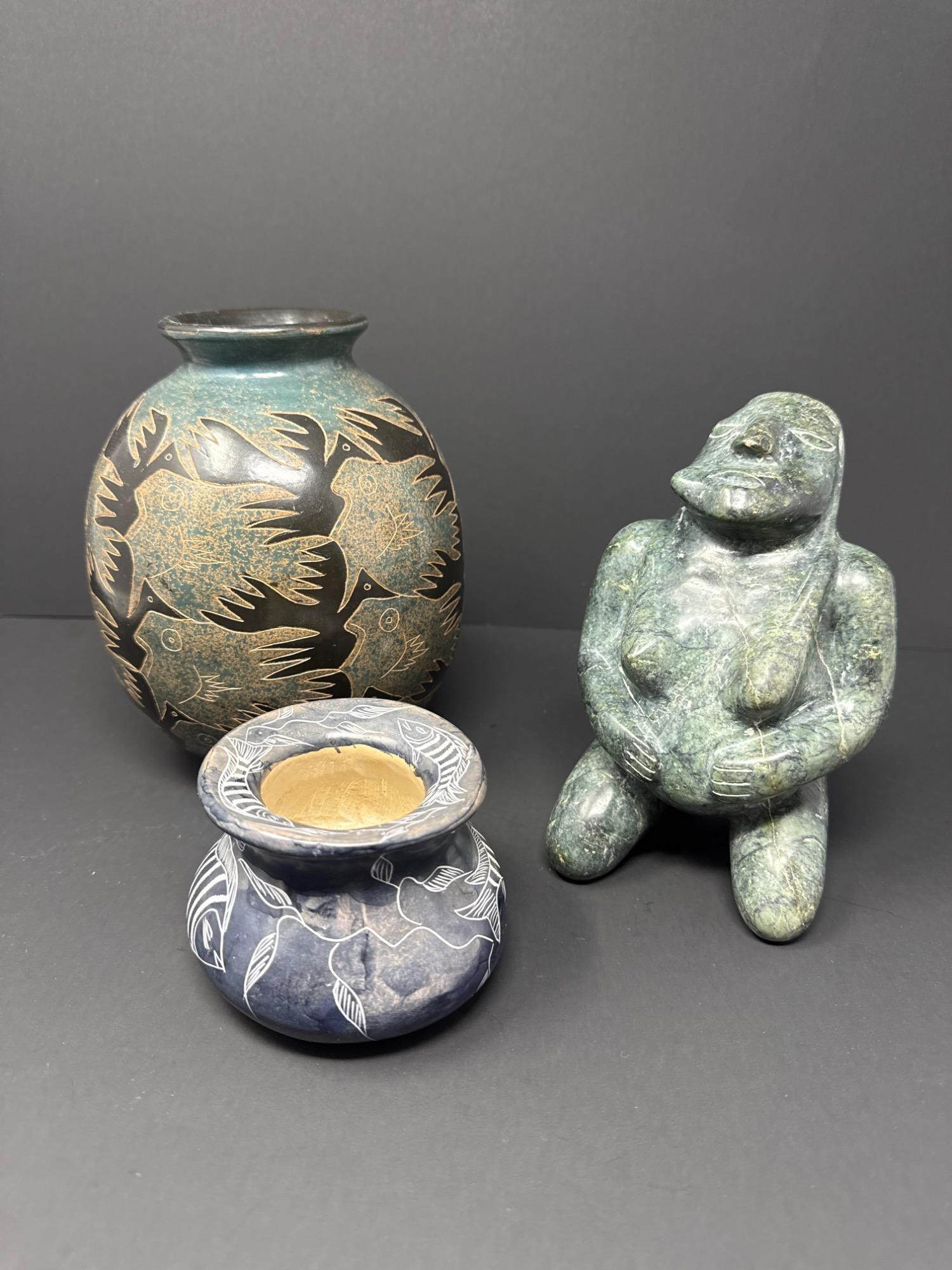 This striking 3-piece artisan collection features handcrafted pottery and stonework from Nicaragua and beyond—perfect for collectors of folk art, sculpture, and signed ceramics. Bladimir Norori Signed Pottery Vase (Nicaragua) Measures approx. 7.5" tall x 5" wide Features a stylized fish motif, reminiscent of M.C. Escher’s geometric style Created by renowned Nicaraguan artist Bladimir Norori (signed on base) Beautiful teal and black sgraffito finish with etched detail Hand-Carved Soapstone Sculpture Stands approx. 9" tall x 4" wide Green soapstone with natural veining Depicts a seated, stylized human figure with serene expression Solid and polished, with primitive elegance Small Blue Pottery Vase with Fish Motif Measures approx. 3" tall x 3" wide Deep cobalt blue with white etched designs of fish and vines Bulbous form with wide flared rim Unmarked but clearly handmade