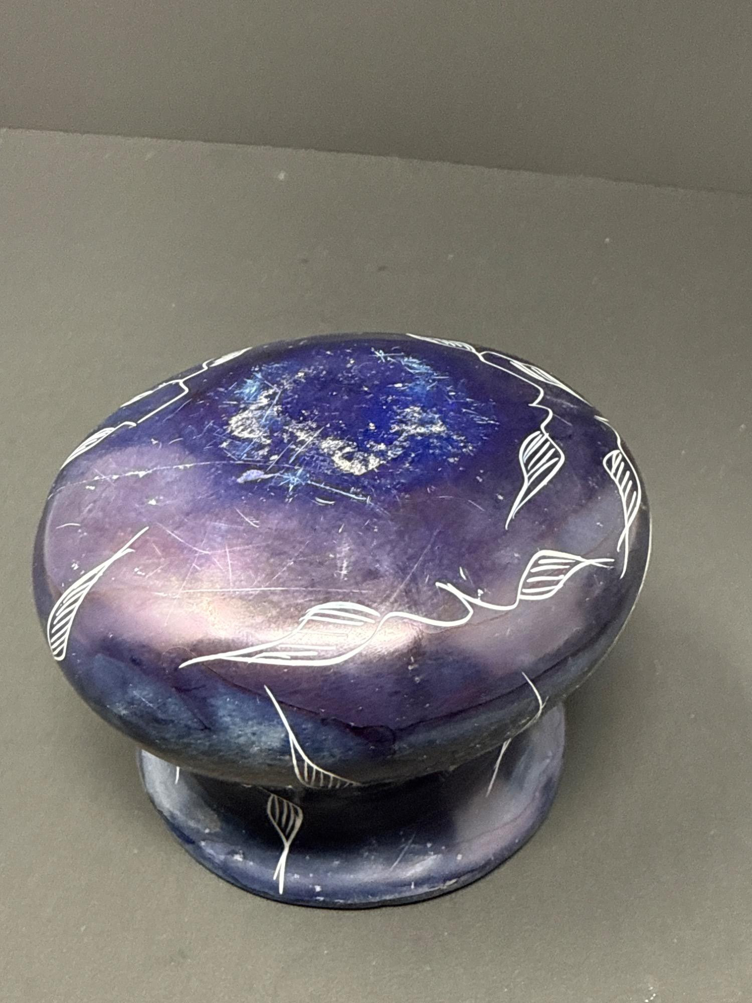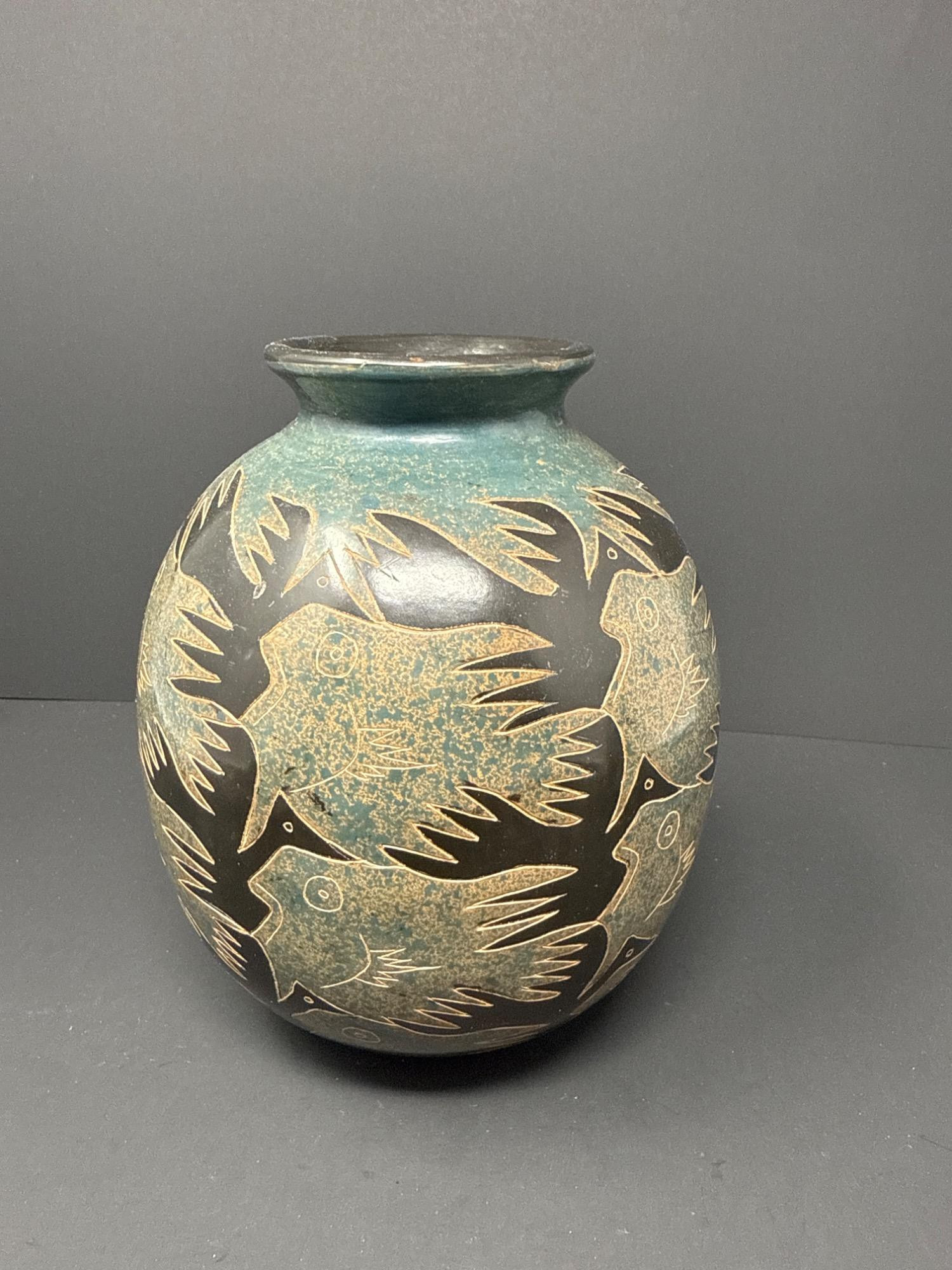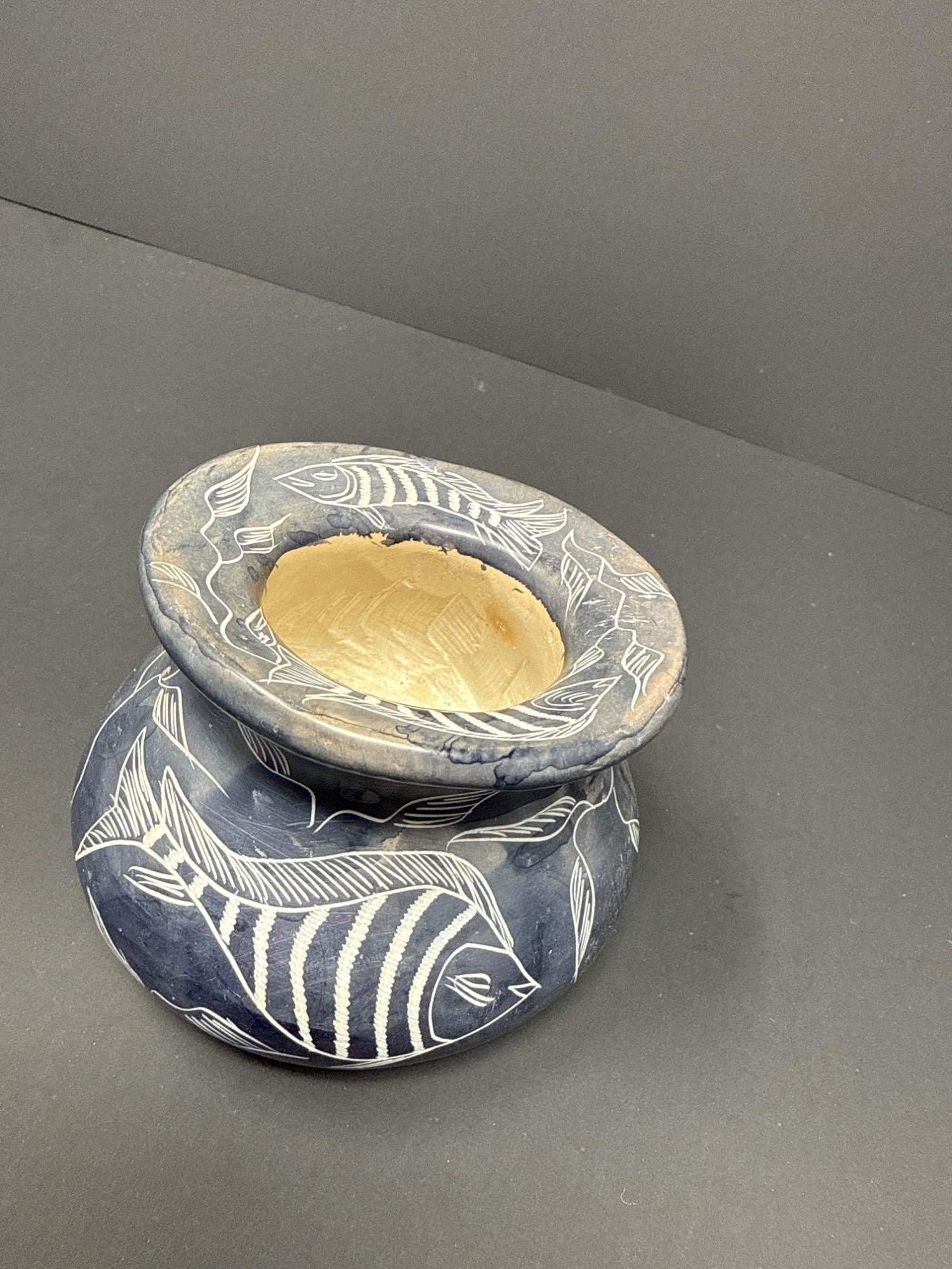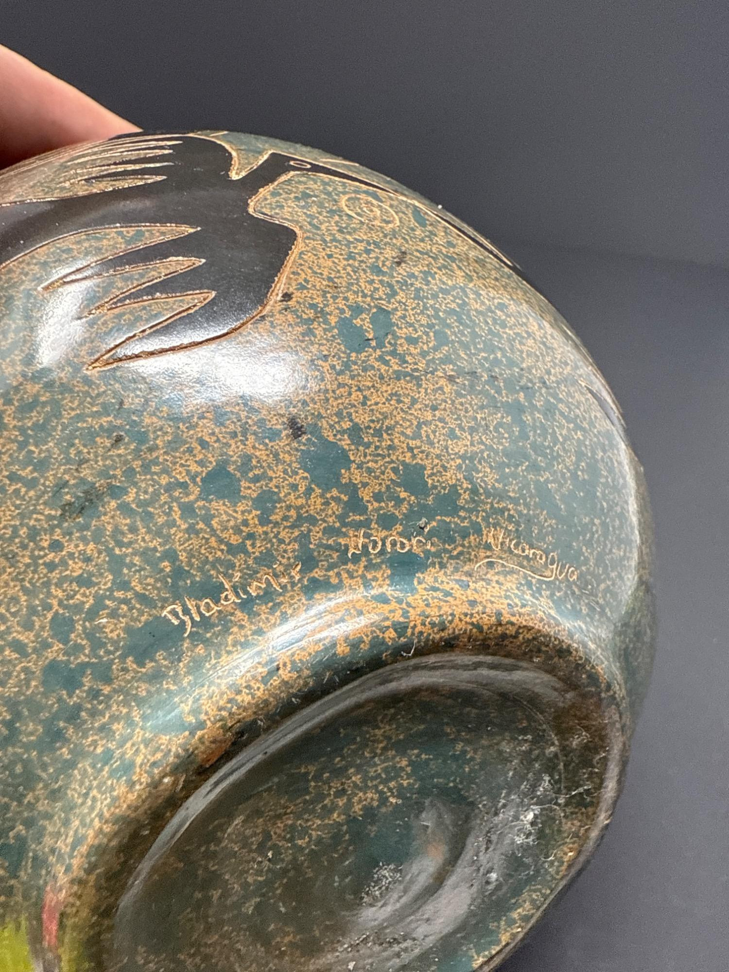 This striking 3-piece artisan collection features handcrafted pottery and stonework from Nicaragua and beyond—perfect for collectors of folk art, sculpture, and signed ceramics. Bladimir Norori Signed Pottery Vase (Nicaragua) Measures approx. 7.5" tall x 5" wide Features a stylized fish motif, reminiscent of M.C. Escher’s geometric style Created by renowned Nicaraguan artist Bladimir Norori (signed on base) Beautiful teal and black sgraffito finish with etched detail Hand-Carved Soapstone Sculpture Stands approx. 9" tall x 4" wide Green soapstone with natural veining Depicts a seated, stylized human figure with serene expression Solid and polished, with primitive elegance Small Blue Pottery Vase with Fish Motif Measures approx. 3" tall x 3" wide Deep cobalt blue with white etched designs of fish and vines Bulbous form with wide flared rim Unmarked but clearly handmade