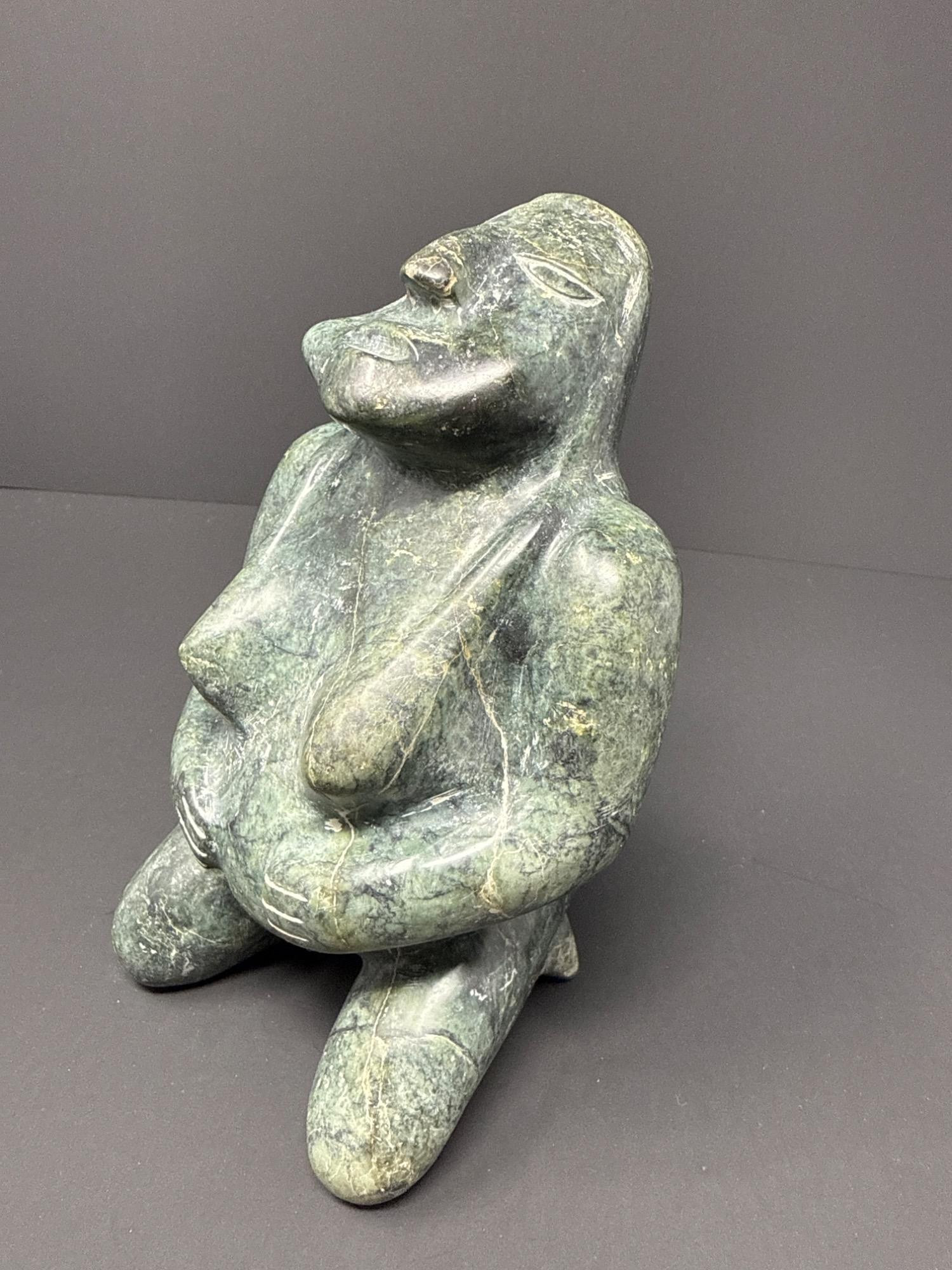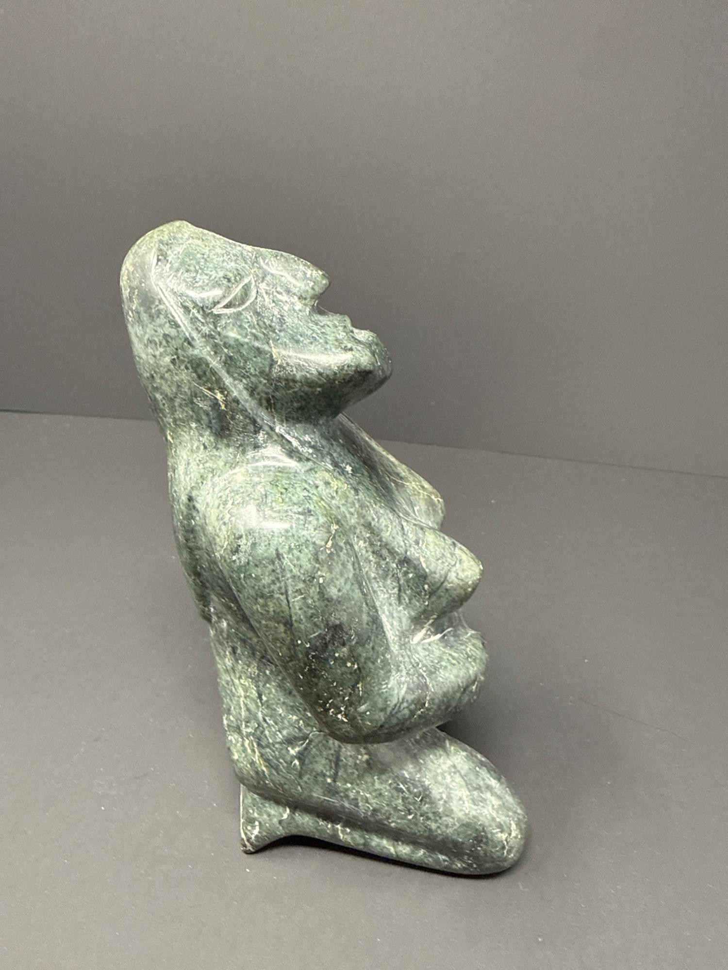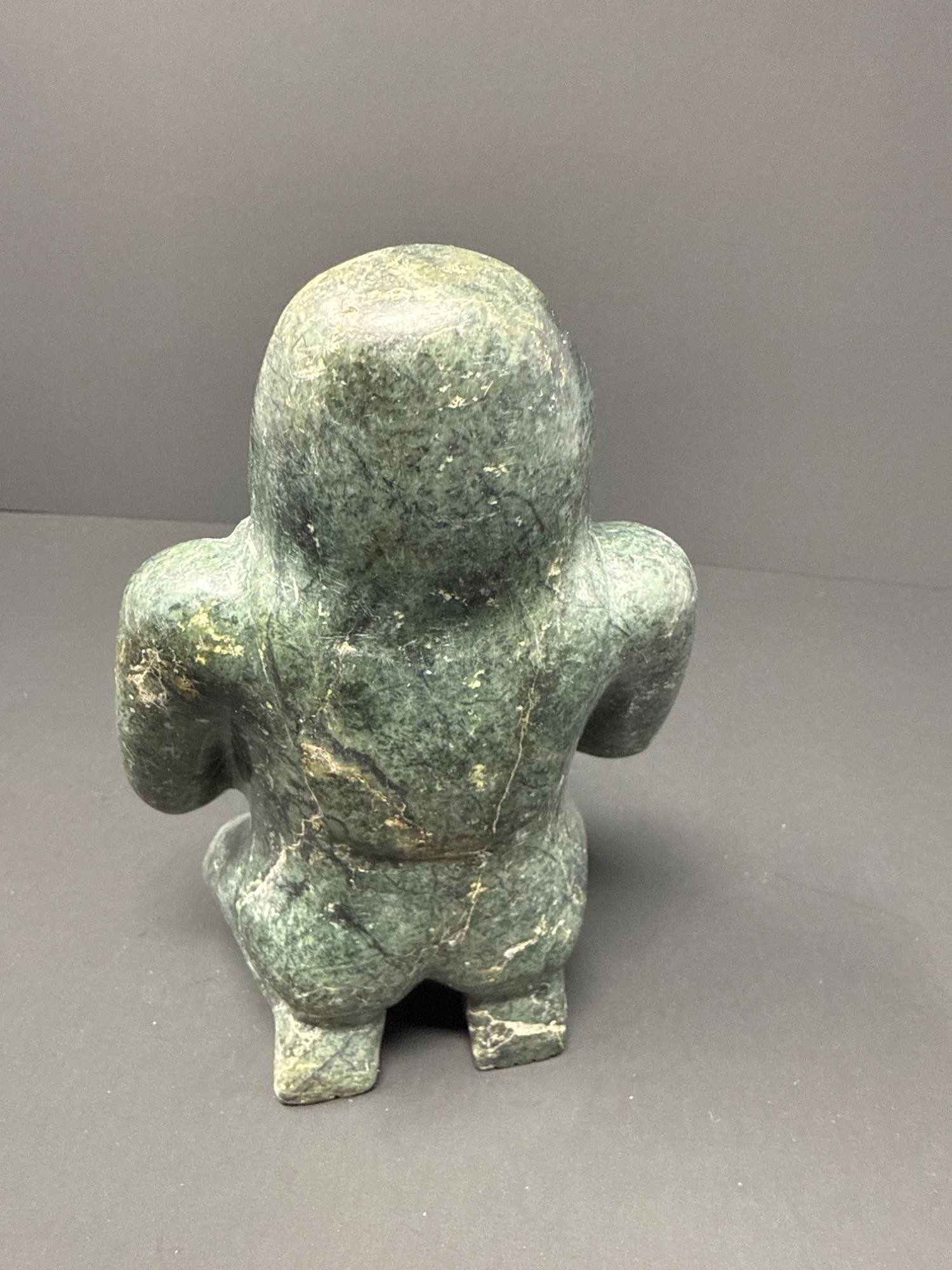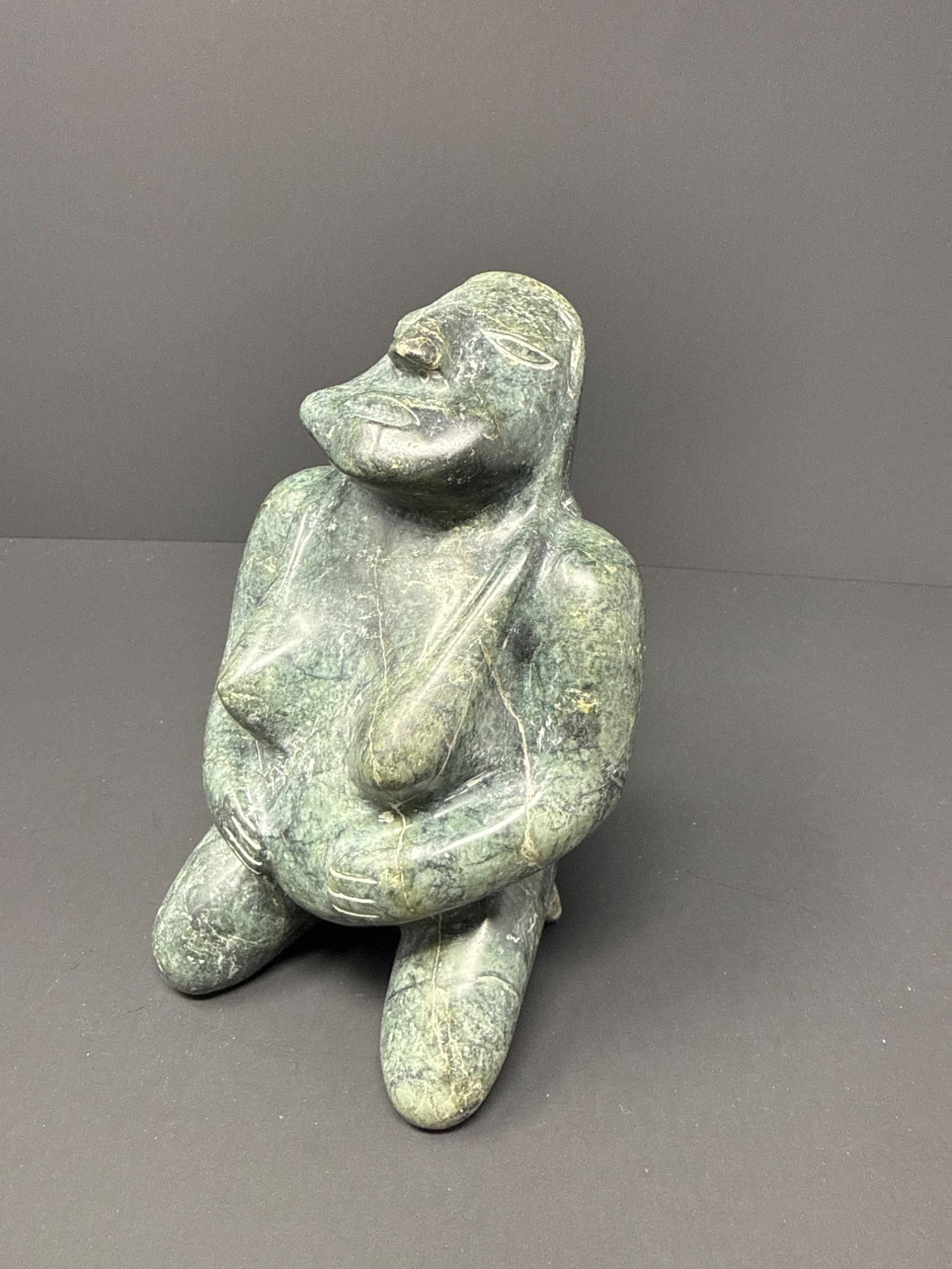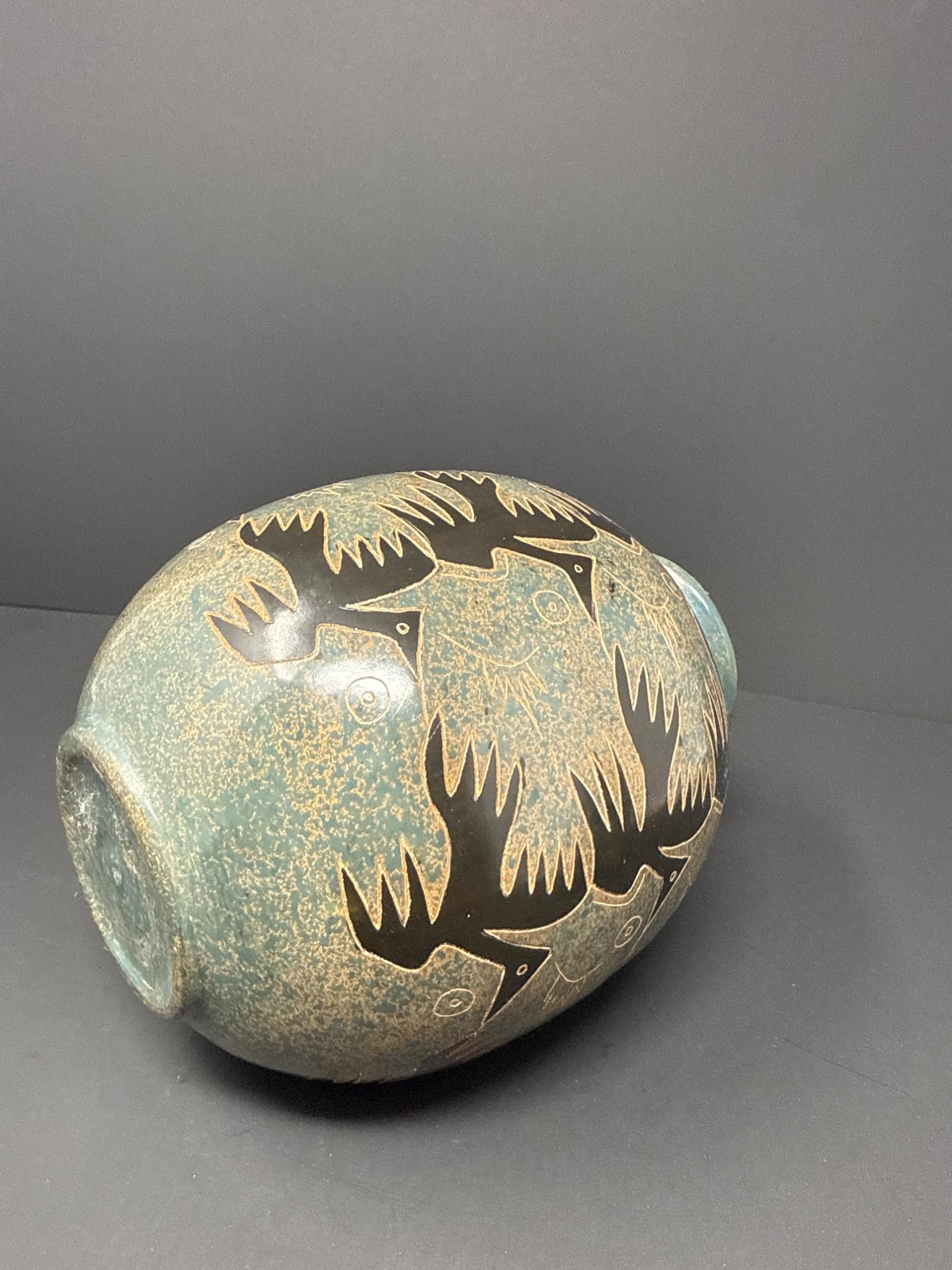 This striking 3-piece artisan collection features handcrafted pottery and stonework from Nicaragua and beyond—perfect for collectors of folk art, sculpture, and signed ceramics. Bladimir Norori Signed Pottery Vase (Nicaragua) Measures approx. 7.5" tall x 5" wide Features a stylized fish motif, reminiscent of M.C. Escher’s geometric style Created by renowned Nicaraguan artist Bladimir Norori (signed on base) Beautiful teal and black sgraffito finish with etched detail Hand-Carved Soapstone Sculpture Stands approx. 9" tall x 4" wide Green soapstone with natural veining Depicts a seated, stylized human figure with serene expression Solid and polished, with primitive elegance Small Blue Pottery Vase with Fish Motif Measures approx. 3" tall x 3" wide Deep cobalt blue with white etched designs of fish and vines Bulbous form with wide flared rim Unmarked but clearly handmade