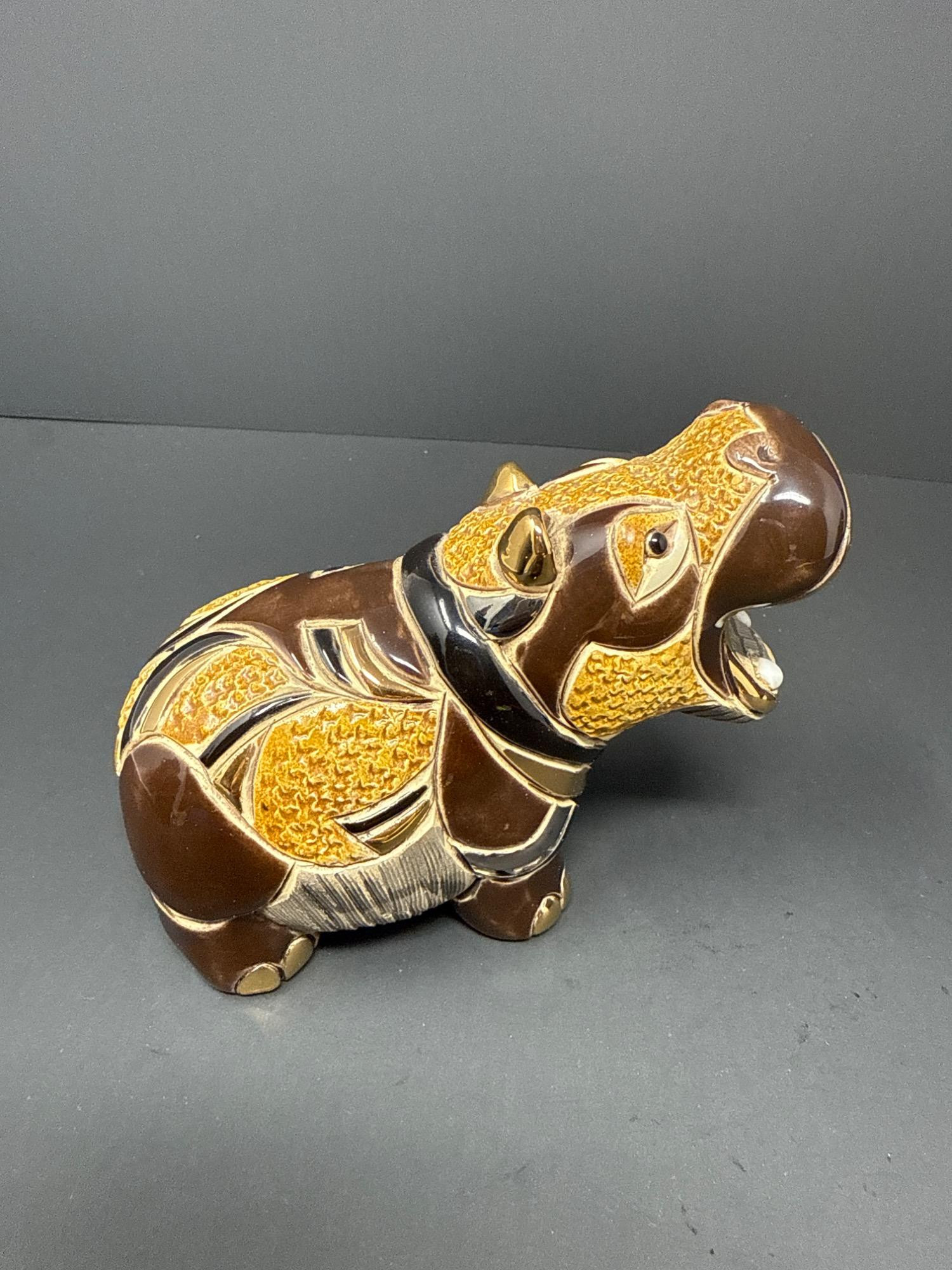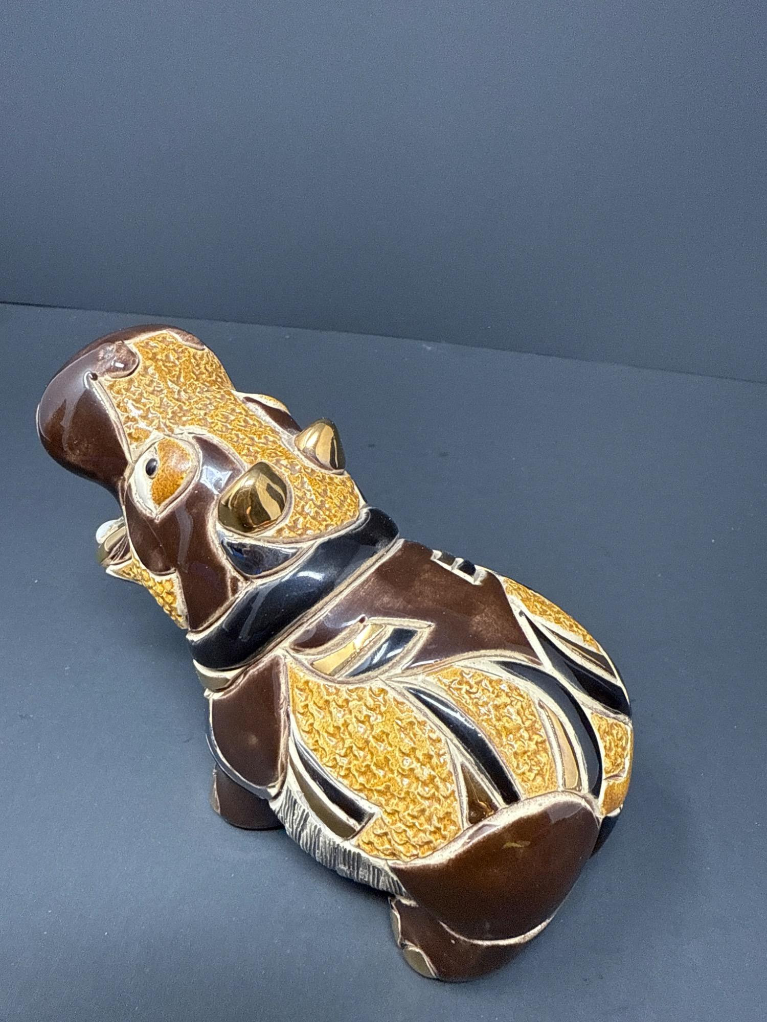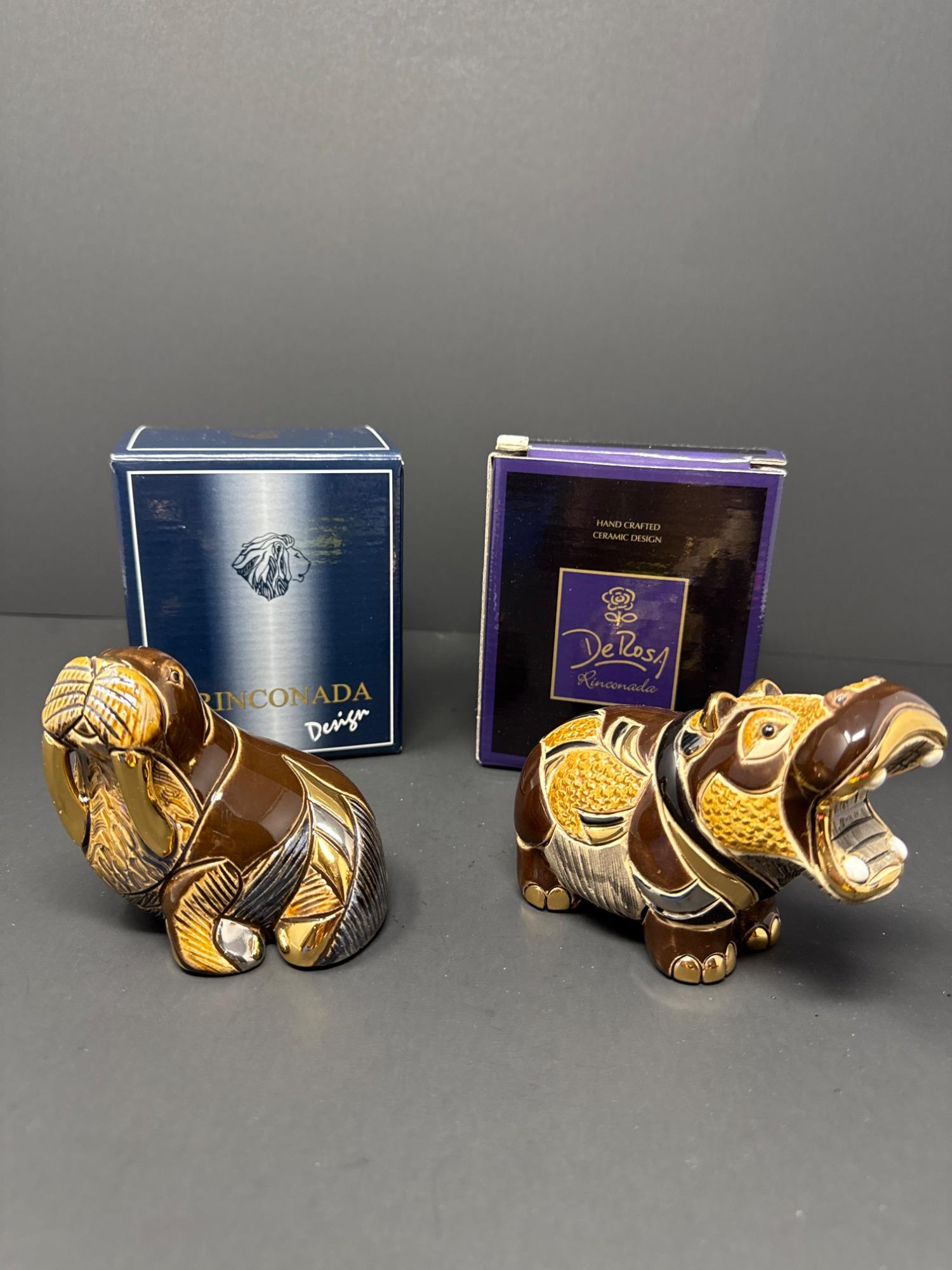 A beautifully crafted pair of ceramic animal figurines from the renowned Rinconada DeRosa Designs of Uruguay. Each piece is richly detailed and accented with gold and platinum for a stunning finish. Set Includes: 1 Rinconada Walrus Figurine Model Number: 779 With original Rinconada box 1 DeRosa Hippo Figurine Model Number: 719 With original DeRosa box Features: Hand-carved and hand-painted ceramic Gold and platinum accents Rich, earthy tones with intricate texturing Protective felt bases Made in Uruguay