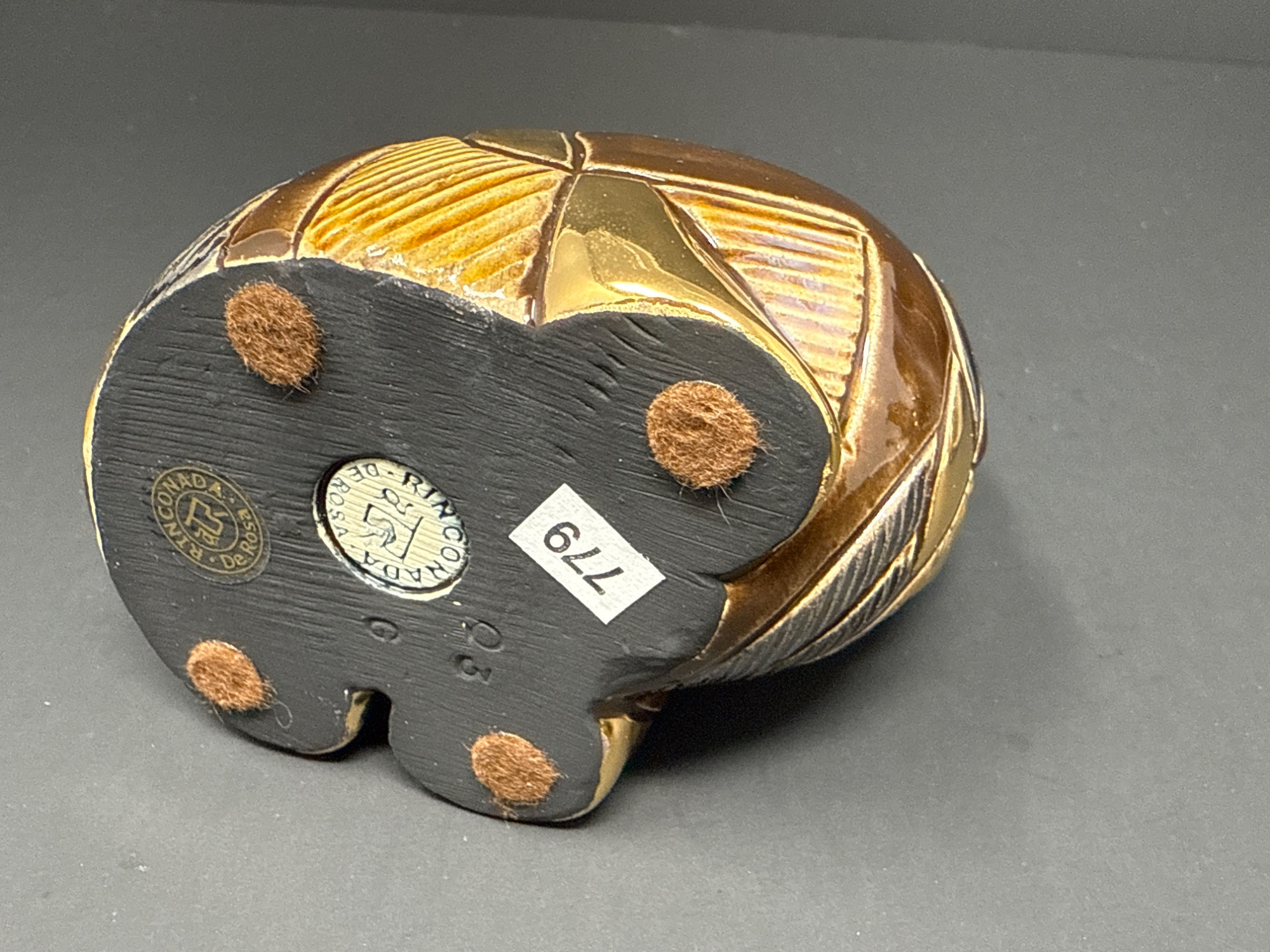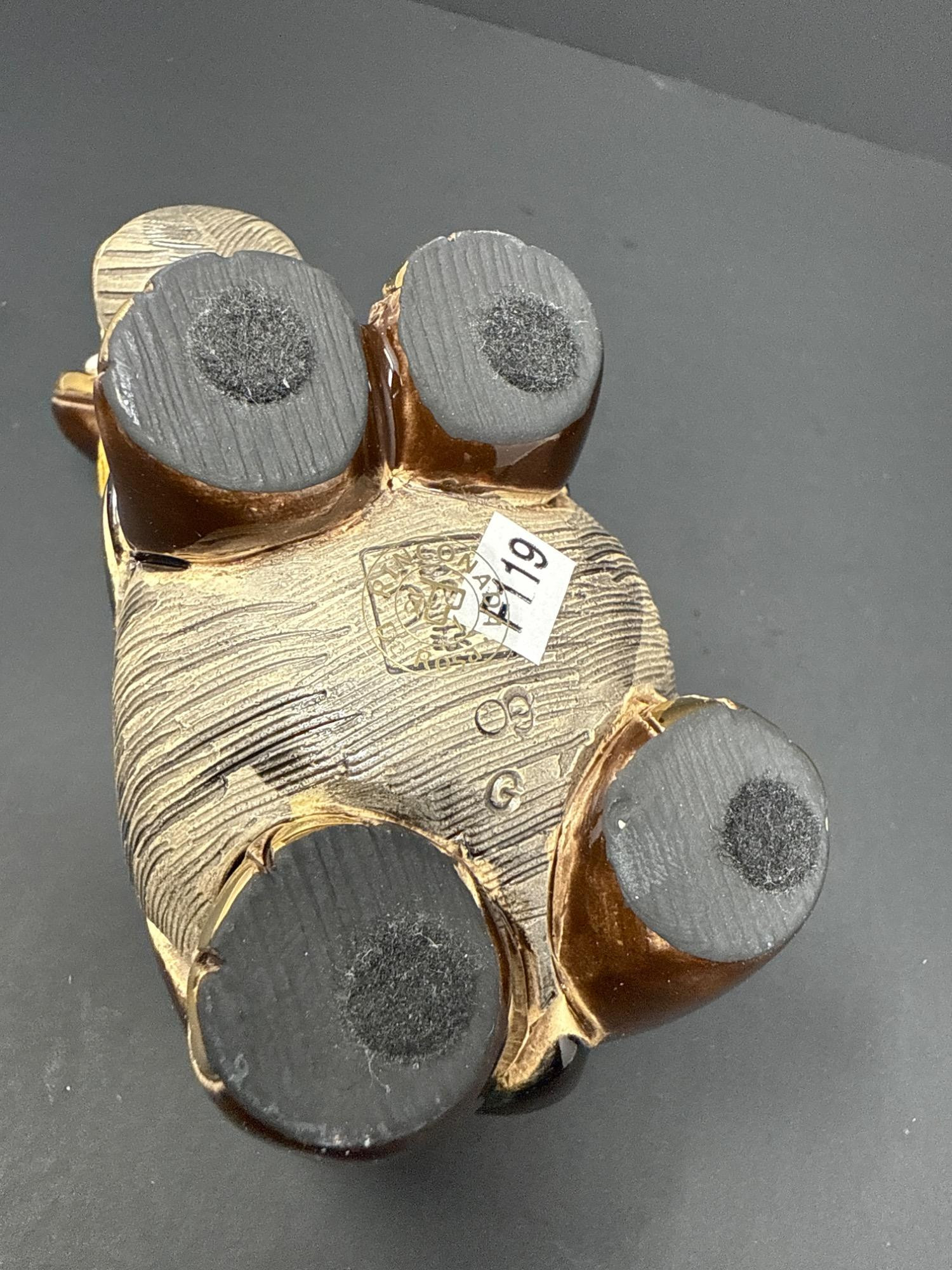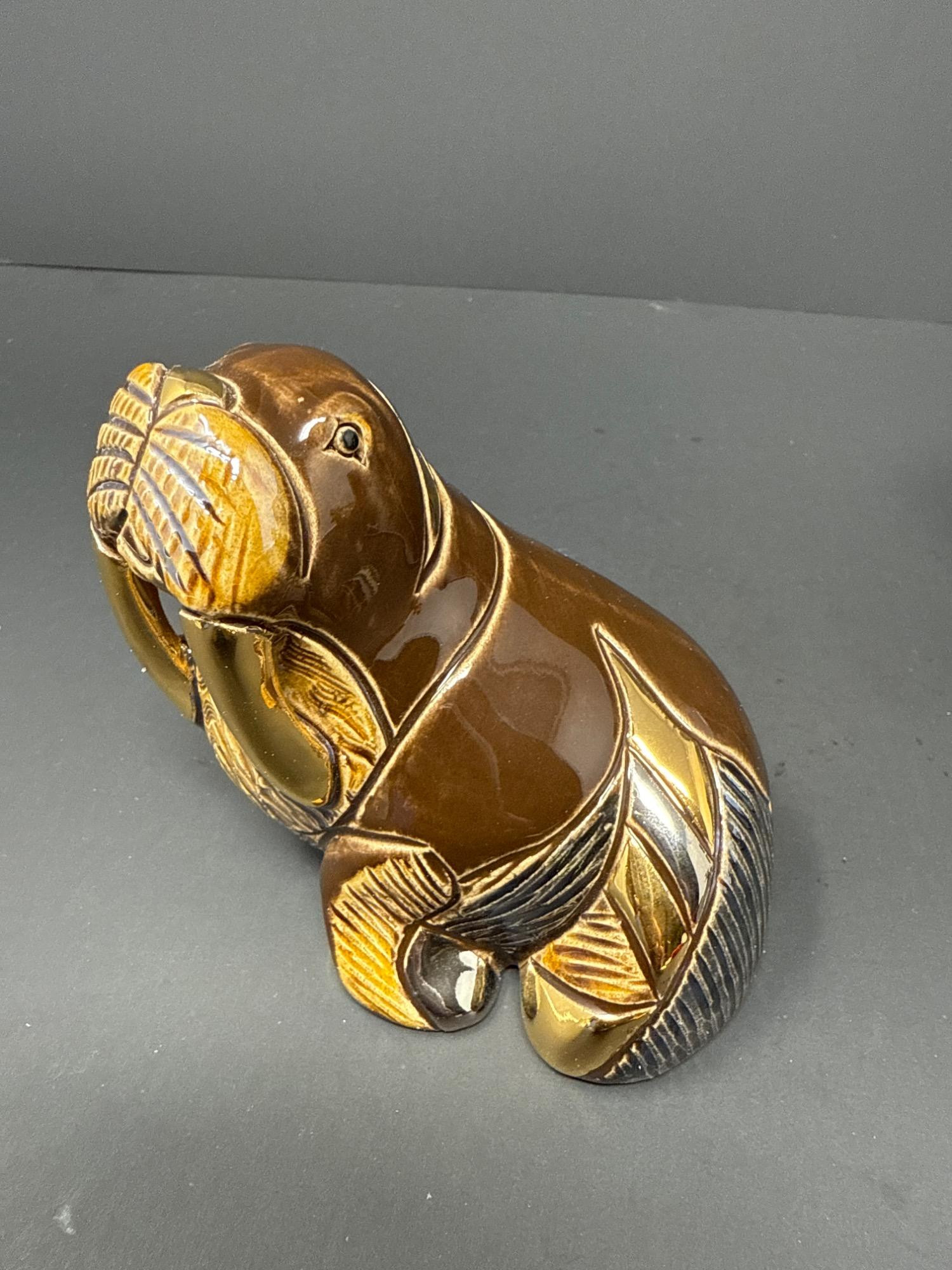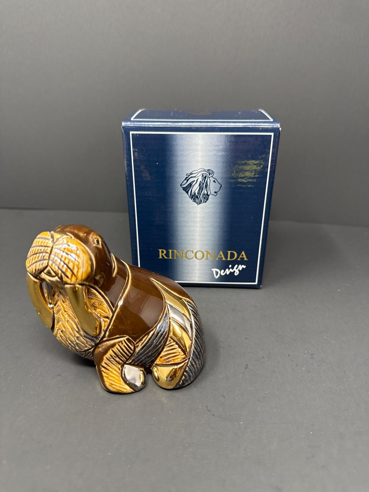 A beautifully crafted pair of ceramic animal figurines from the renowned Rinconada DeRosa Designs of Uruguay. Each piece is richly detailed and accented with gold and platinum for a stunning finish. Set Includes: 1 Rinconada Walrus Figurine Model Number: 779 With original Rinconada box 1 DeRosa Hippo Figurine Model Number: 719 With original DeRosa box Features: Hand-carved and hand-painted ceramic Gold and platinum accents Rich, earthy tones with intricate texturing Protective felt bases Made in Uruguay