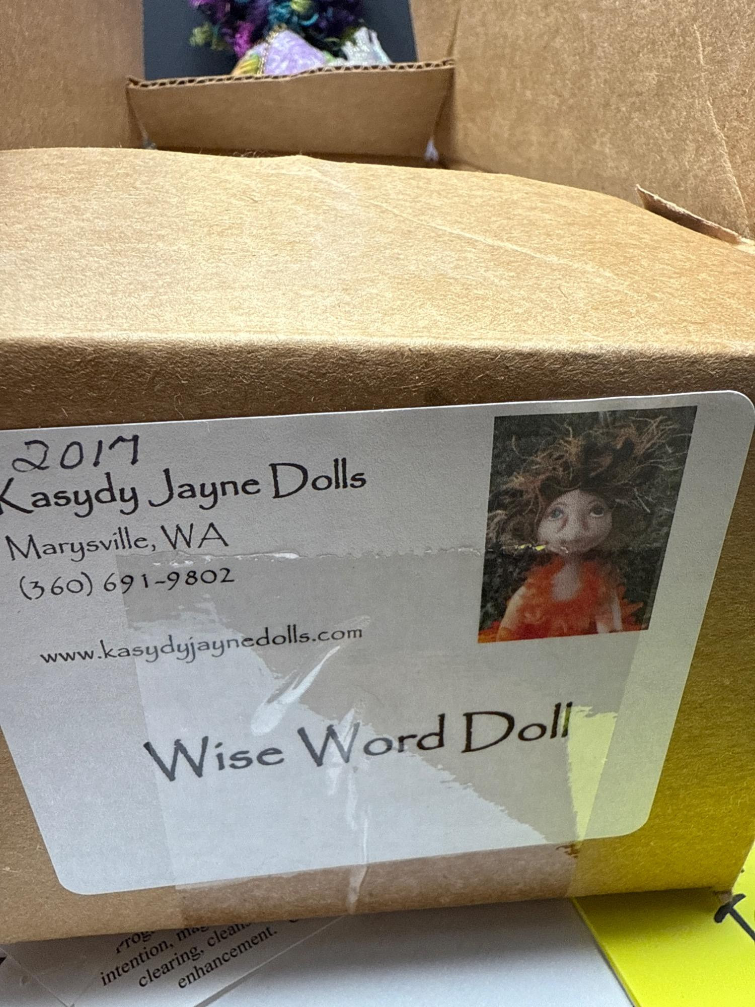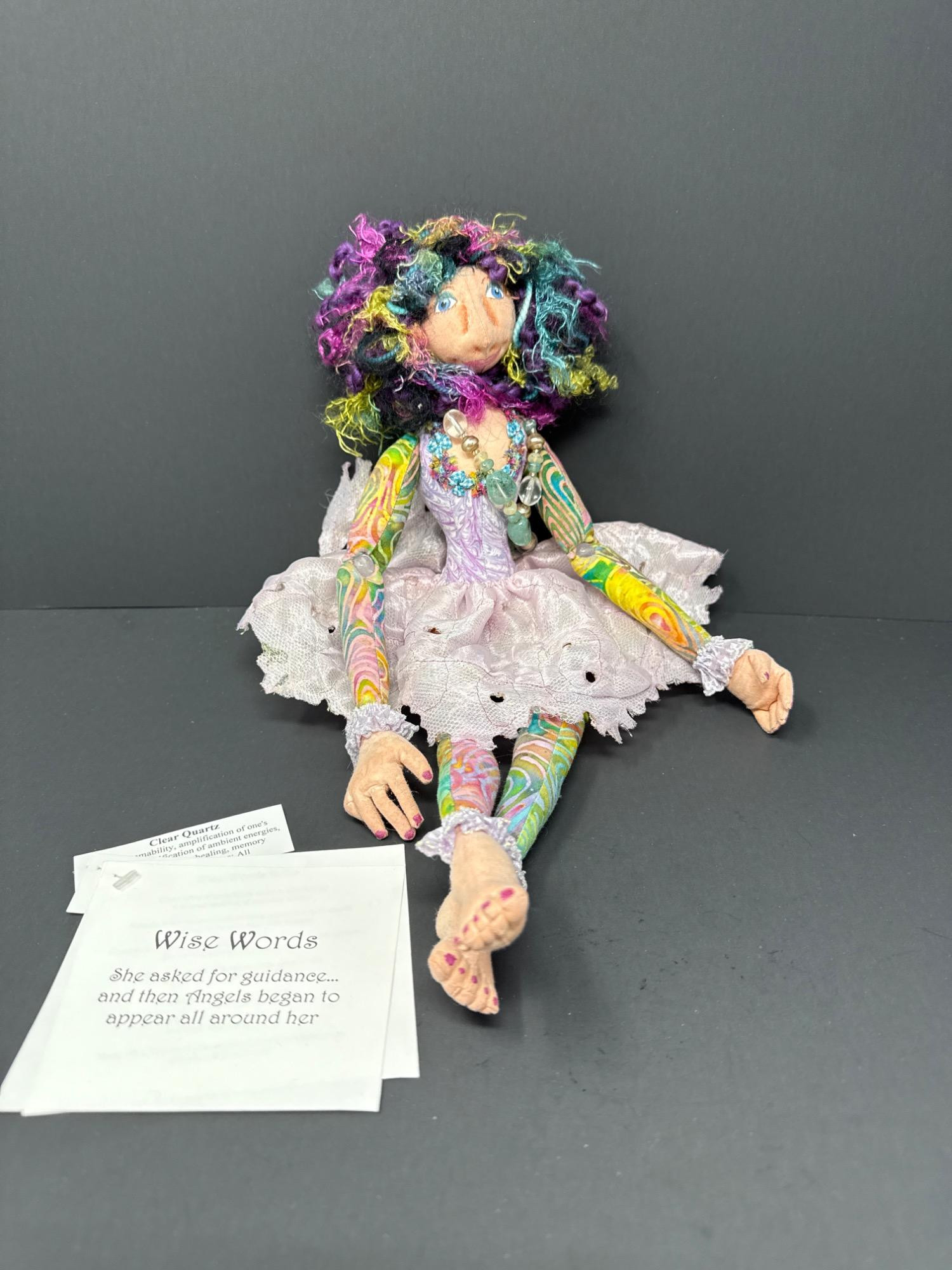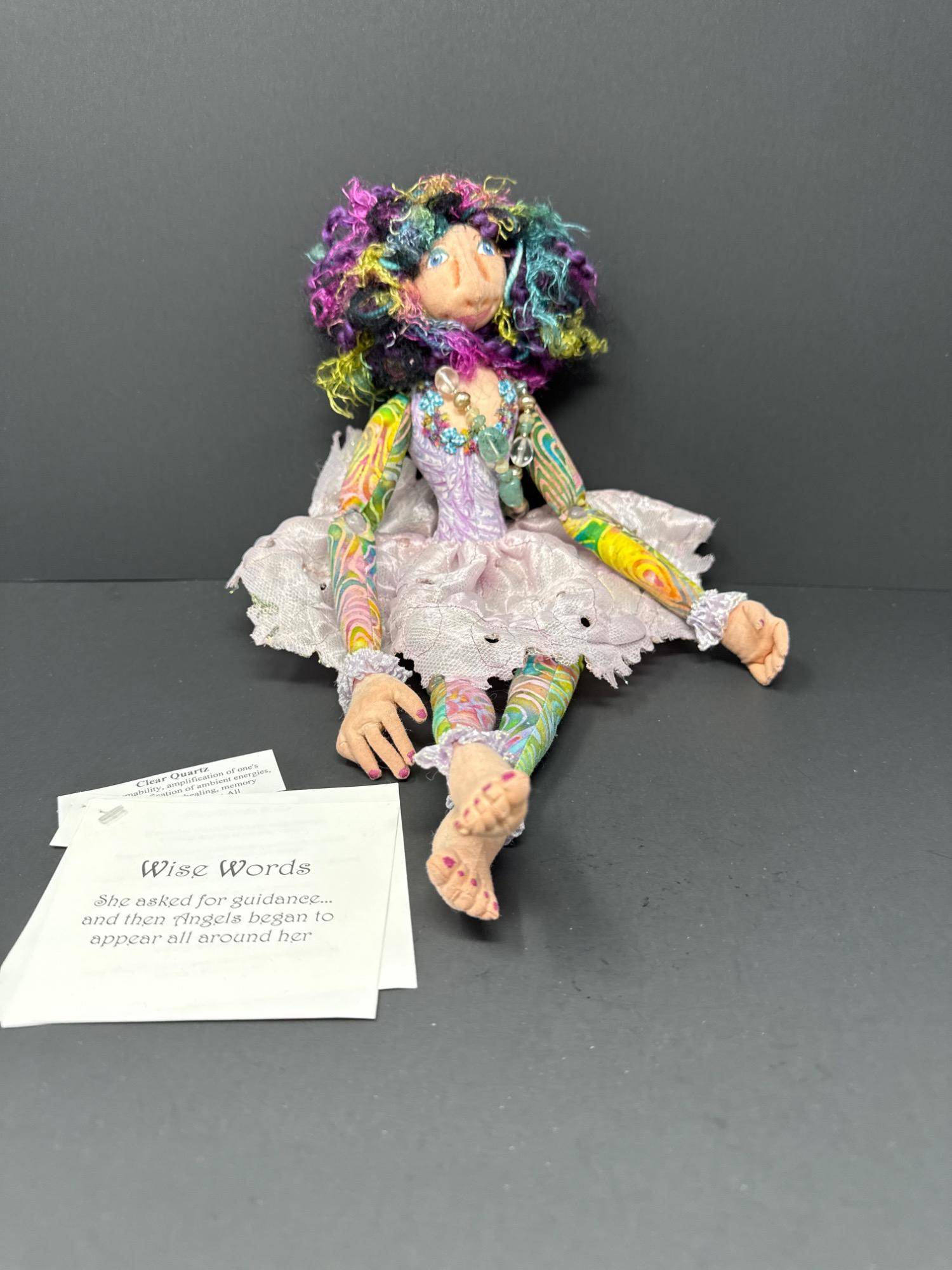 Bring home the magic of handmade inspiration with this vibrant 14-inch Wise Words Doll created by Kasydy Jayne Dolls of Marysville, WA. This one-of-a-kind art doll features rainbow curls, a hand-sewn lace dress, crystal adornments, and fully posable limbs covered in beautifully colorful, artistic patterns. Doll Features: Handmade by artist Kasydy Jayne Includes healing crystals: Amethyst and Clear Quartz Embellished with beads and gemstones Soft sculpted face with expressive stitched features Delicate lavender and white layered lace dress Comes with original "Wise Words" quote card: