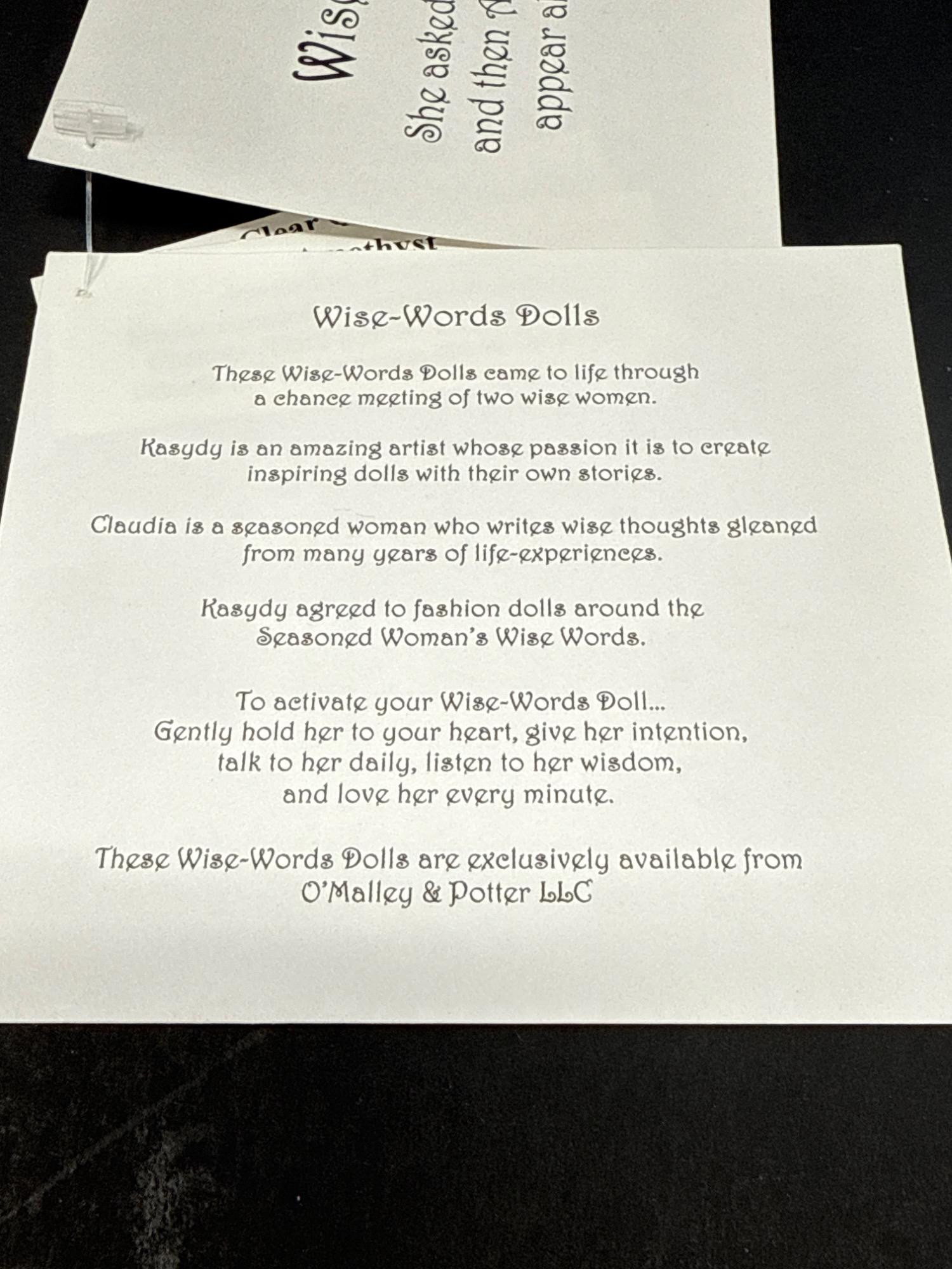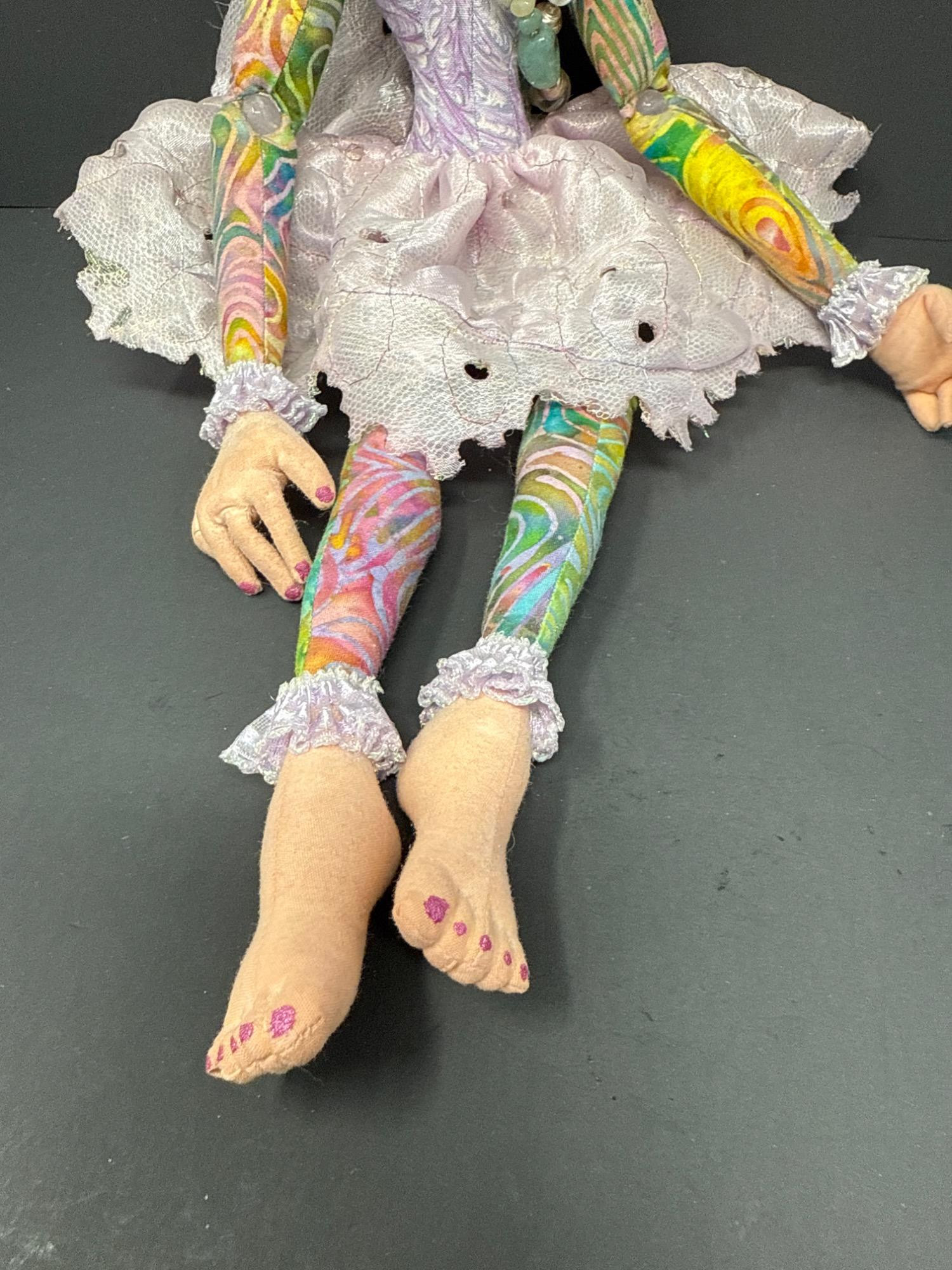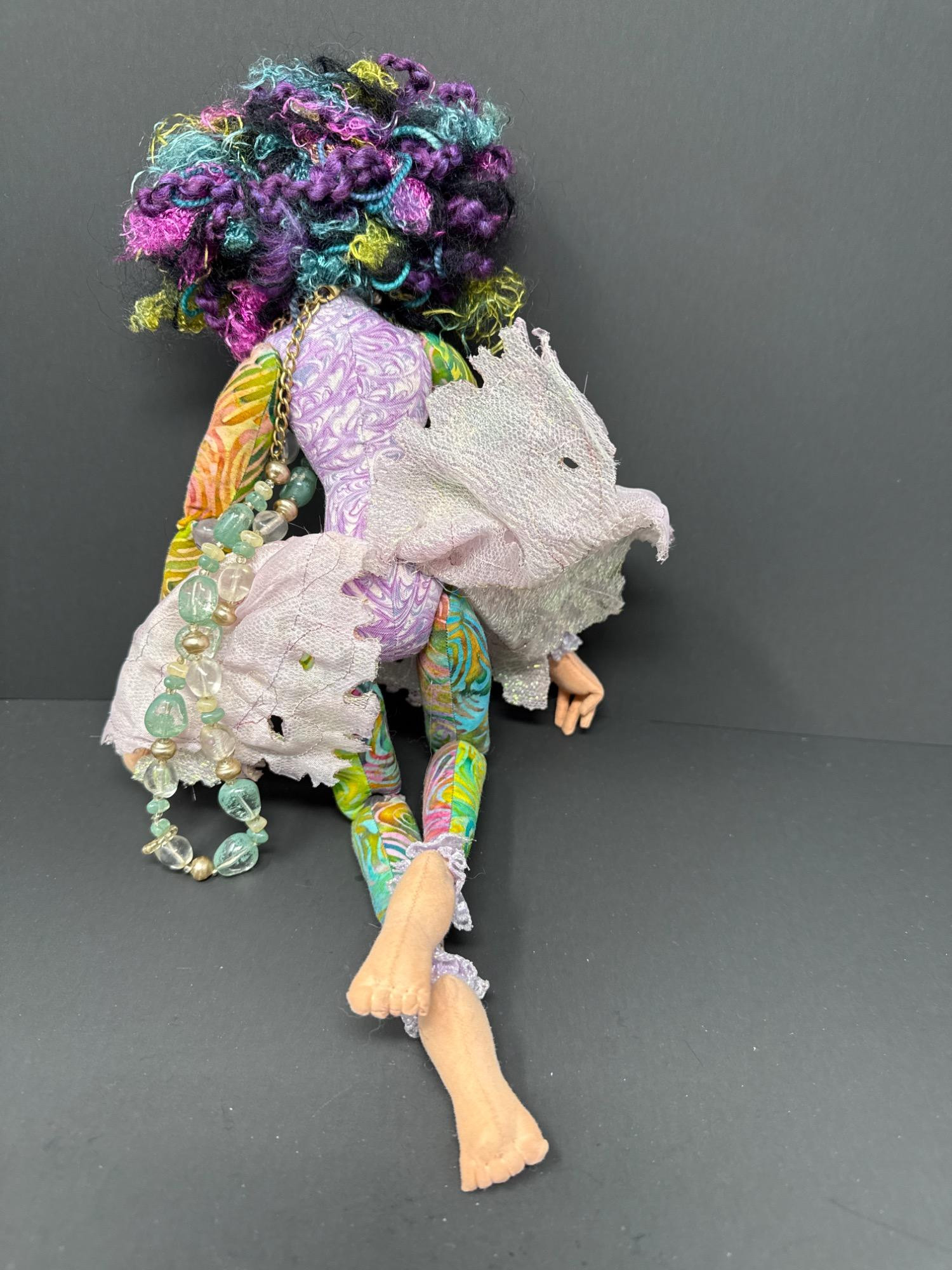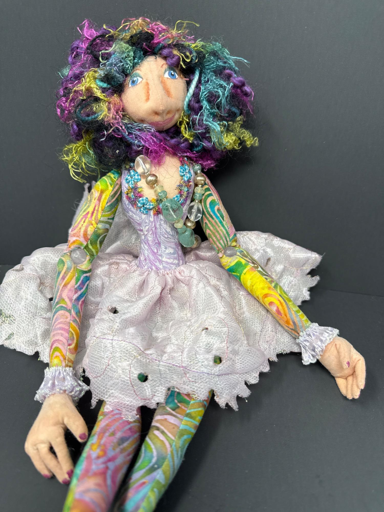 Bring home the magic of handmade inspiration with this vibrant 14-inch Wise Words Doll created by Kasydy Jayne Dolls of Marysville, WA. This one-of-a-kind art doll features rainbow curls, a hand-sewn lace dress, crystal adornments, and fully posable limbs covered in beautifully colorful, artistic patterns. Doll Features: Handmade by artist Kasydy Jayne Includes healing crystals: Amethyst and Clear Quartz Embellished with beads and gemstones Soft sculpted face with expressive stitched features Delicate lavender and white layered lace dress Comes with original "Wise Words" quote card: