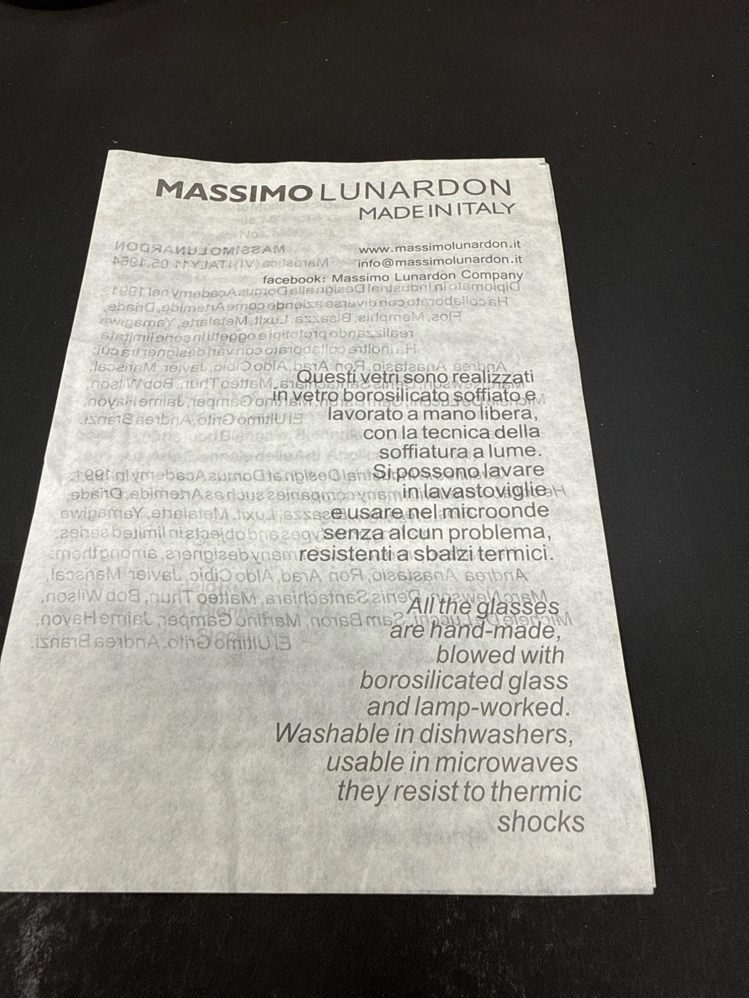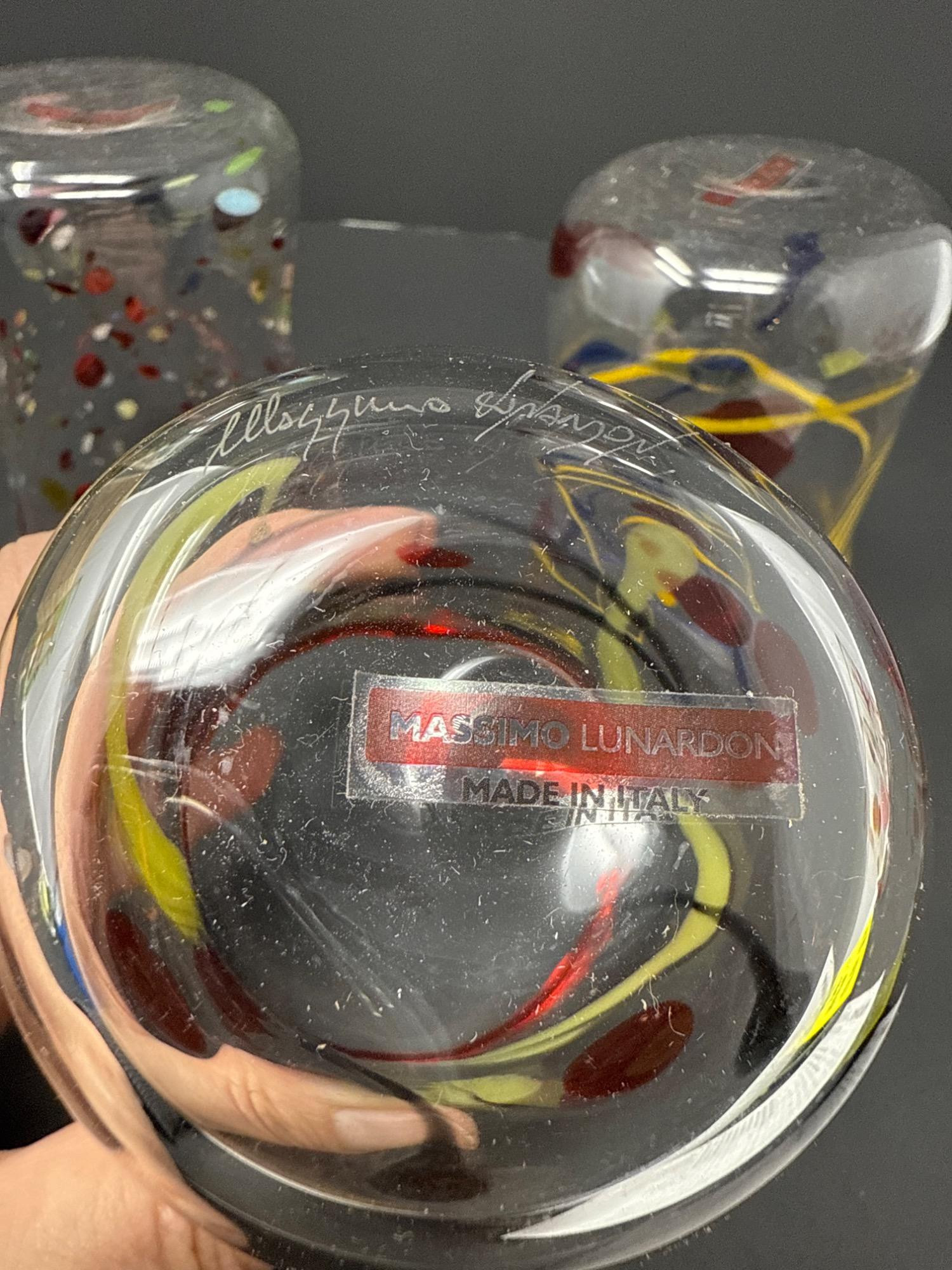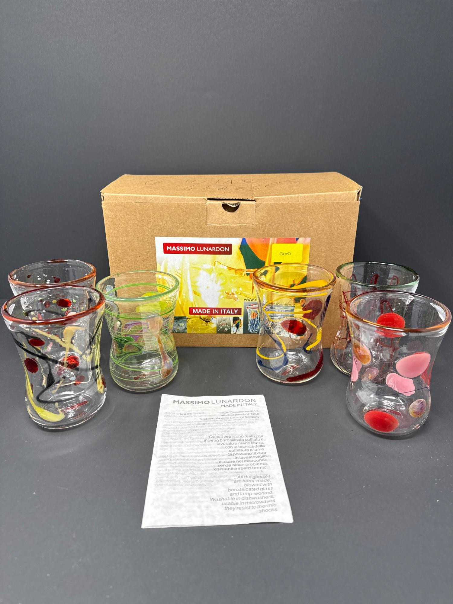 Elevate your glassware collection with this stunning set of six artisan glasses by Massimo Lunardon, handcrafted in Italy. Each piece is individually lamp-worked and made from borosilicate glass, known for its durability and resistance to thermal shock. Set includes: 6 unique glasses Dimensions: Approx. 4.5" Tall x 3.25" Wide Condition: Excellent, appears unused with original box and care insert Features: Dishwasher-safe, microwave-safe, heat-resistant Made in Italy