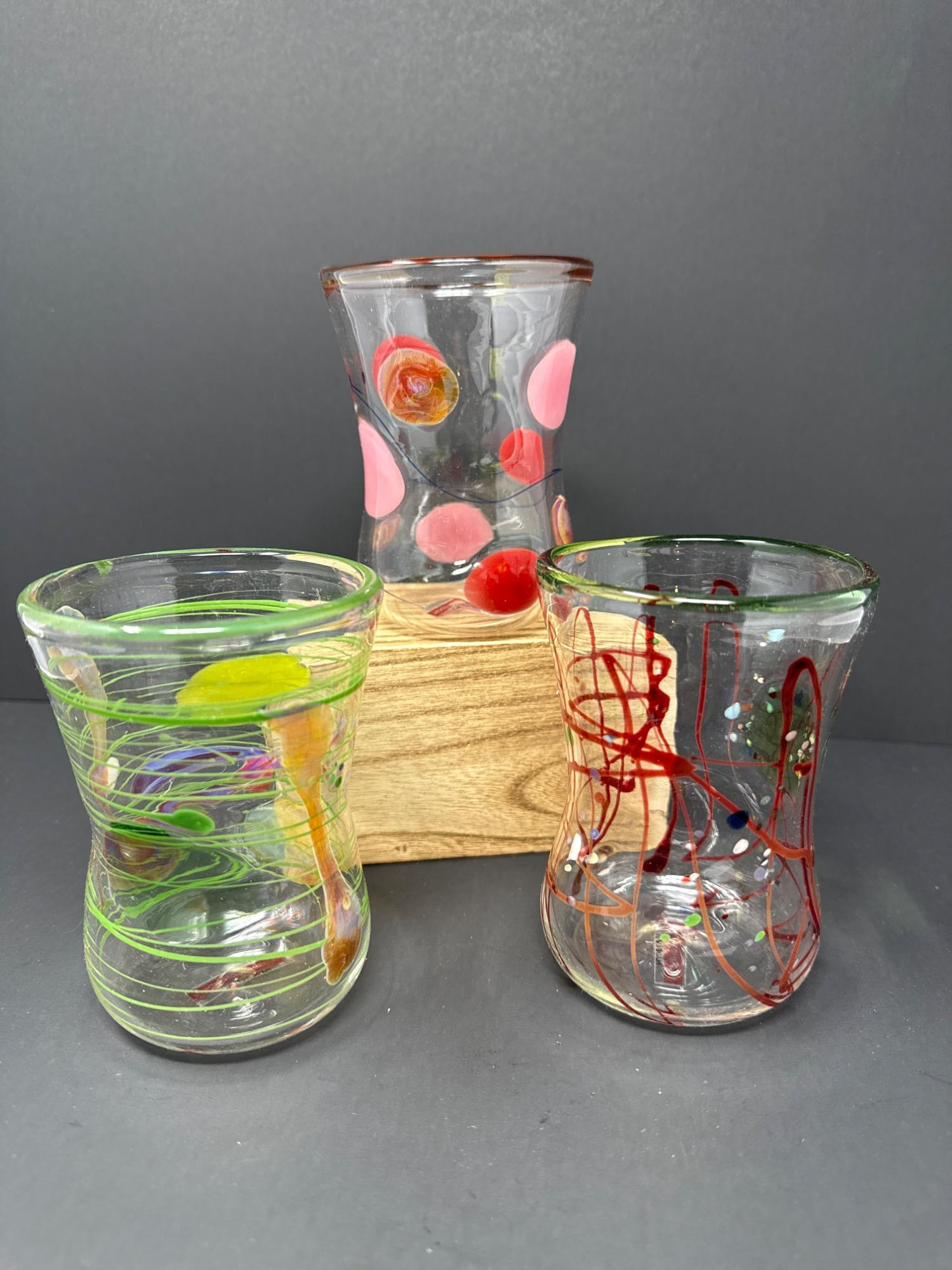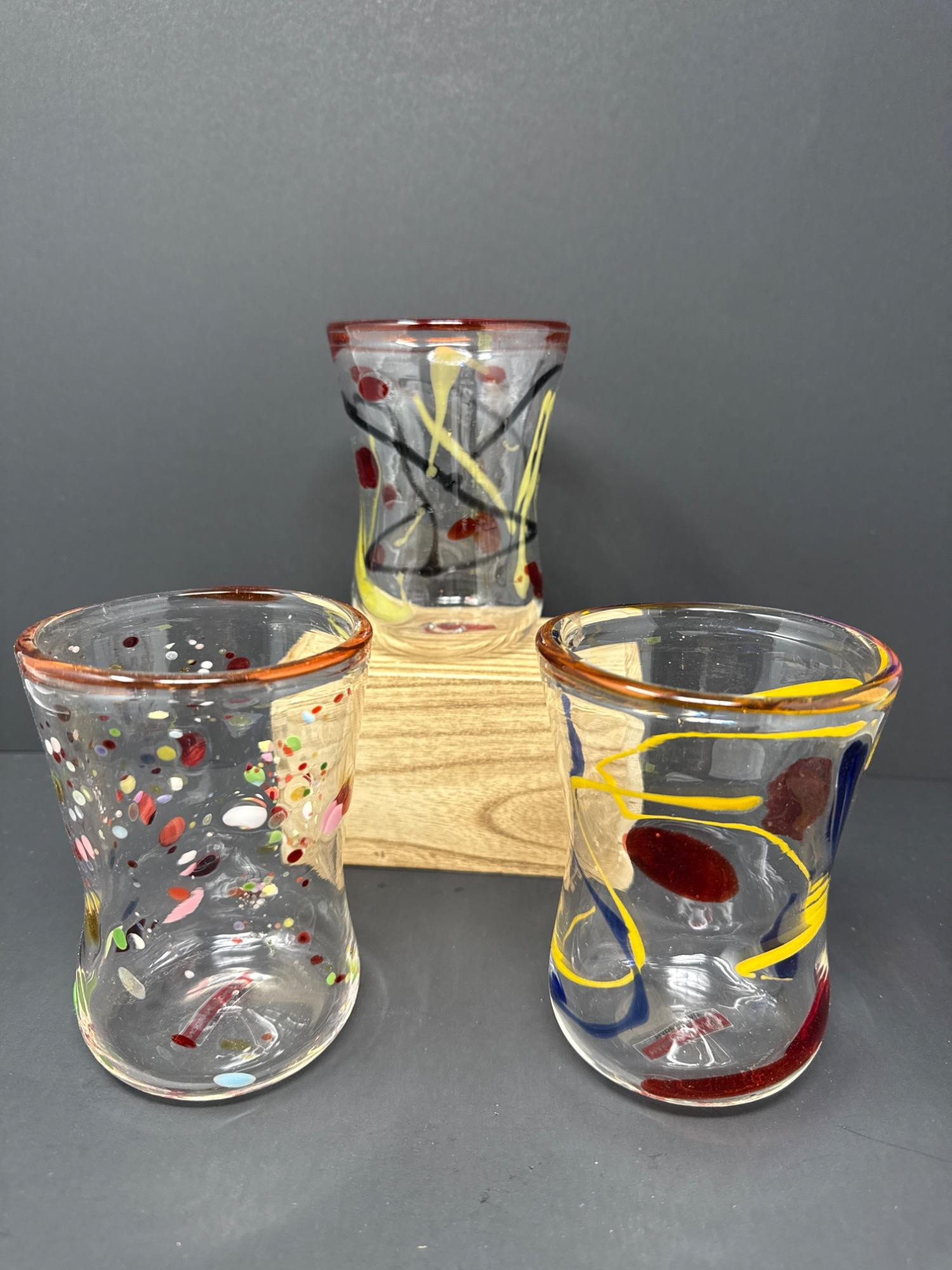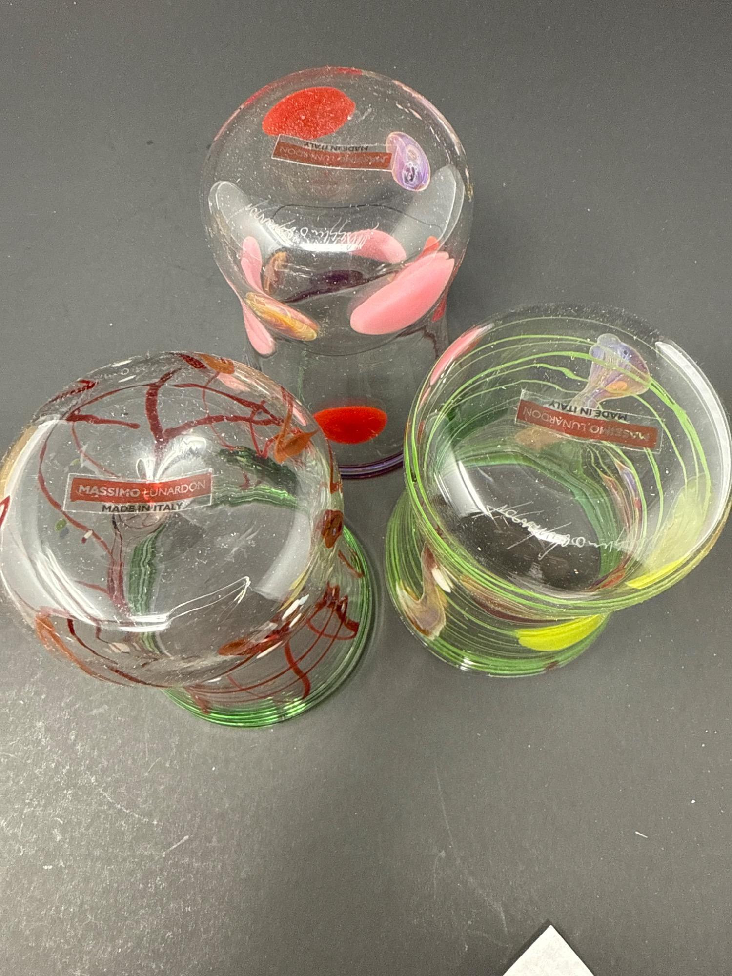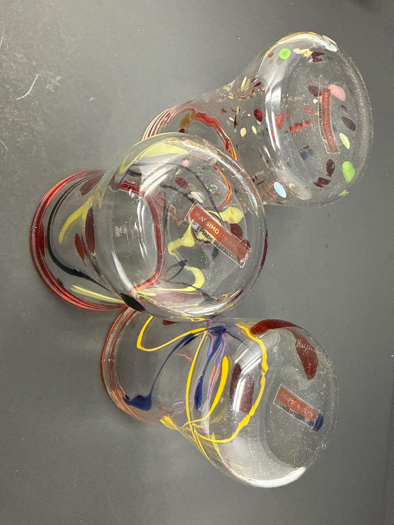 Elevate your glassware collection with this stunning set of six artisan glasses by Massimo Lunardon, handcrafted in Italy. Each piece is individually lamp-worked and made from borosilicate glass, known for its durability and resistance to thermal shock. Set includes: 6 unique glasses Dimensions: Approx. 4.5" Tall x 3.25" Wide Condition: Excellent, appears unused with original box and care insert Features: Dishwasher-safe, microwave-safe, heat-resistant Made in Italy