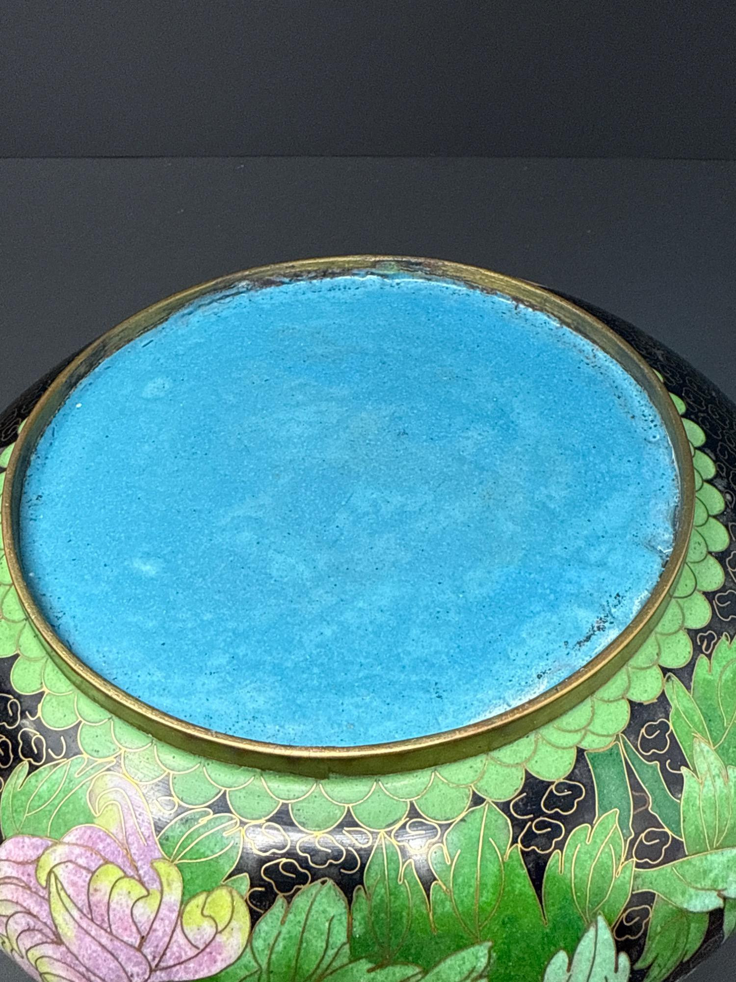 This beautiful antique Chinese cloisonné enamel bowl features intricate hand-applied floral and vine motifs over a rich black enamel background. The vivid shades of pink, green, white, and turquoise are accented by delicate gold outlines and a classic turquoise enamel base – a hallmark of traditional cloisonné craftsmanship. Size: 8 inches wide x 3 inches tall Design: Chrysanthemums and lotus flowers with scrolling cloud pattern Base: Bright turquoise enamel